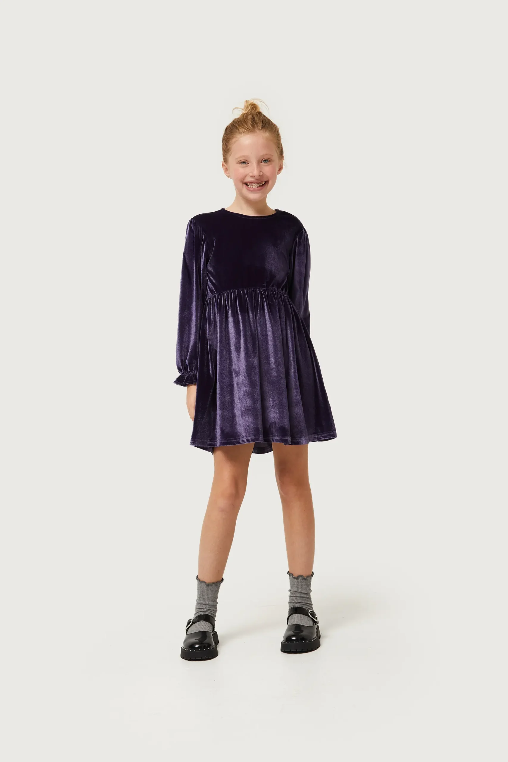 Vestido corto de niña de terciopelo de color morado. Con cuello redondo y manga larga acabada en volante. Modelo con corte en la cintura, La modelo mide 137 cm y lleva la talla 8.