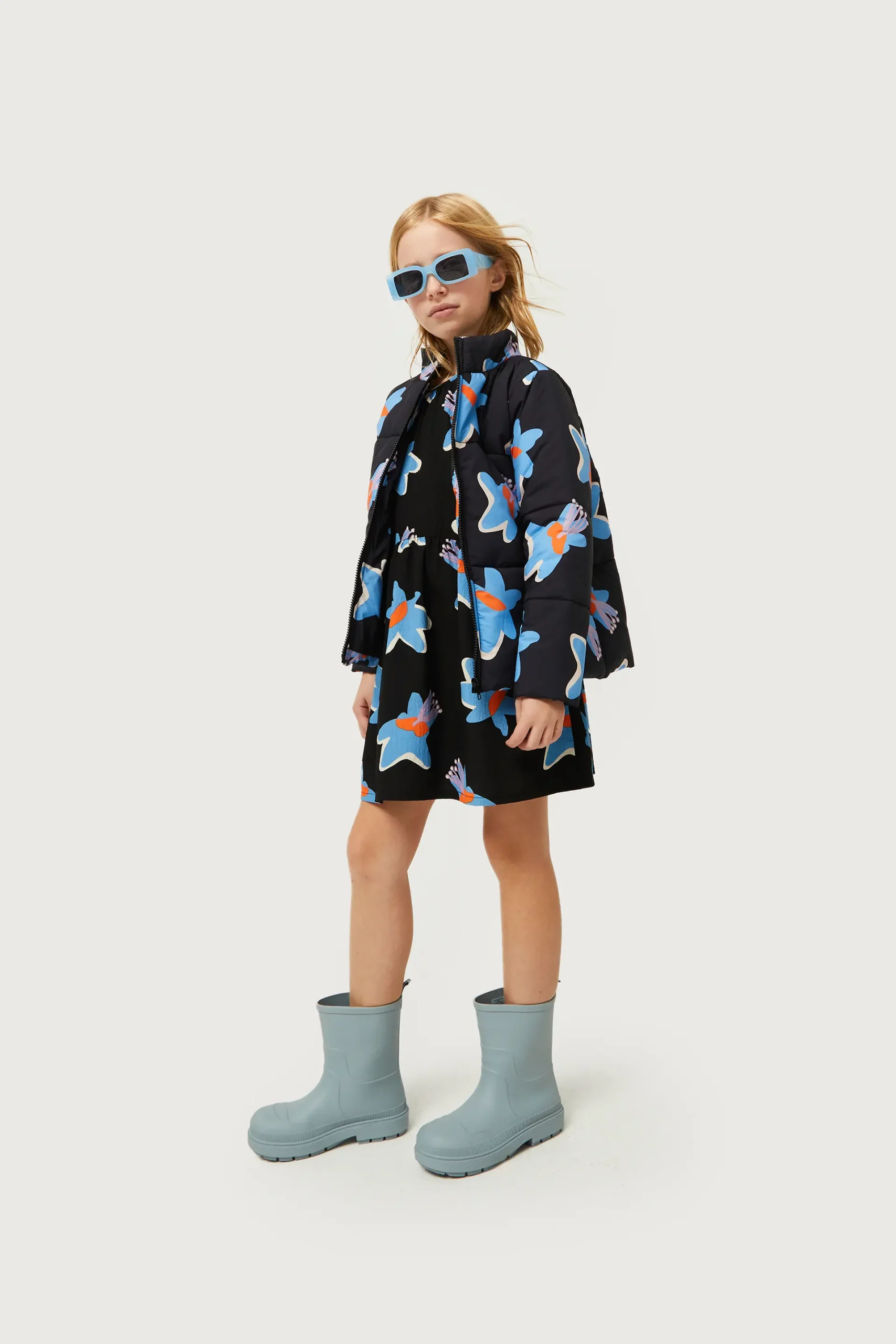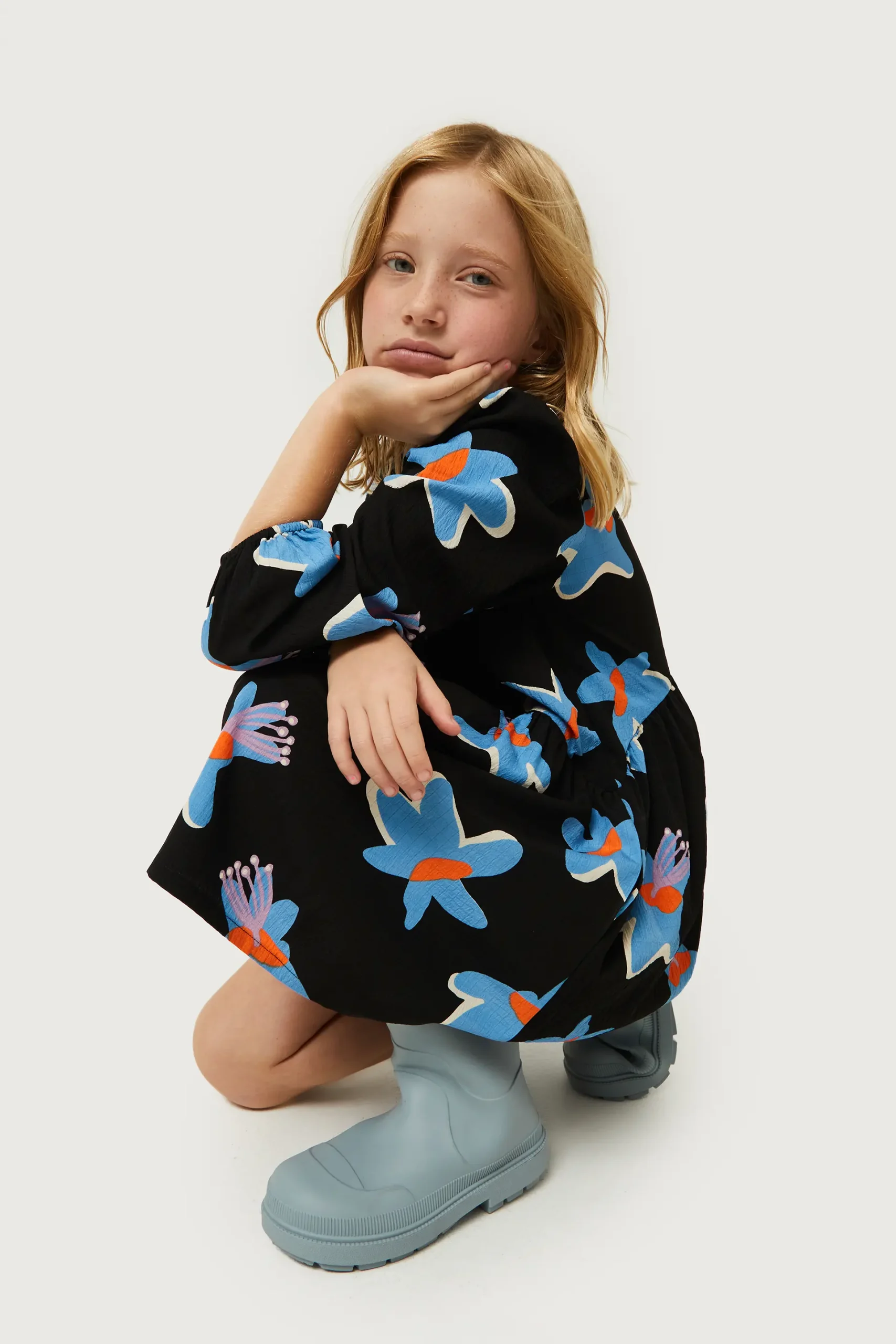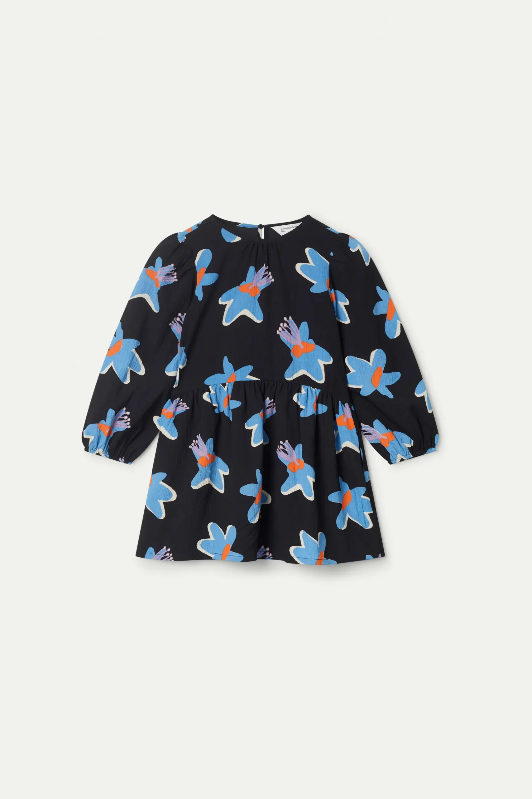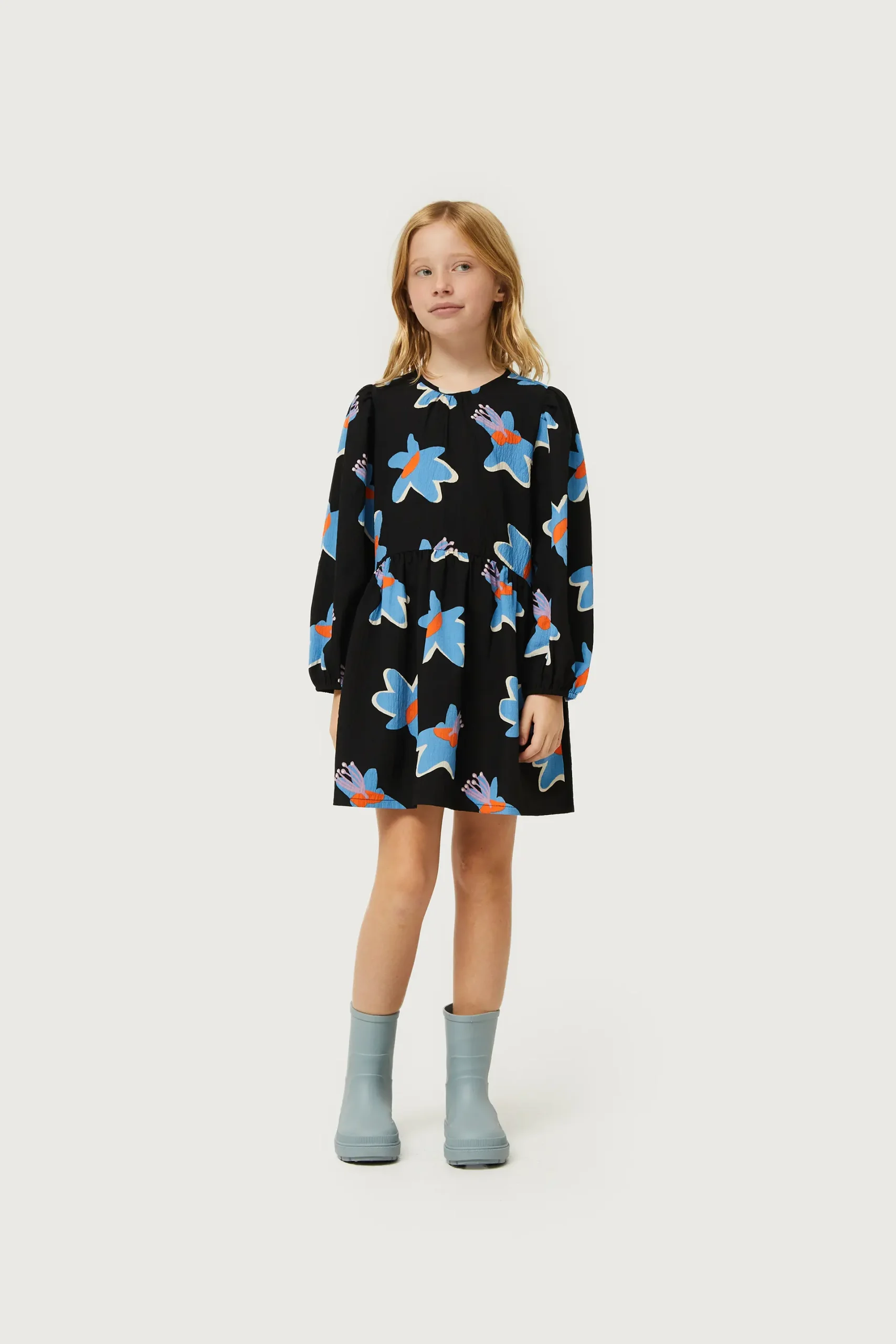 Vestido corto de niña en crepé de color negro con estampado de flores azules y amarillas. Con cuello redondo y manga larga. Modelo con corte en la cintura. Forro interior. La modelo mide 137 cm y lleva la talla 8.