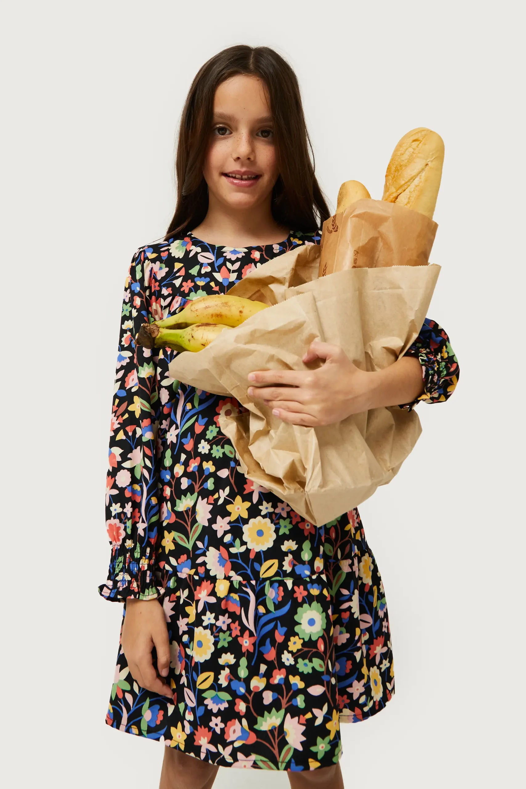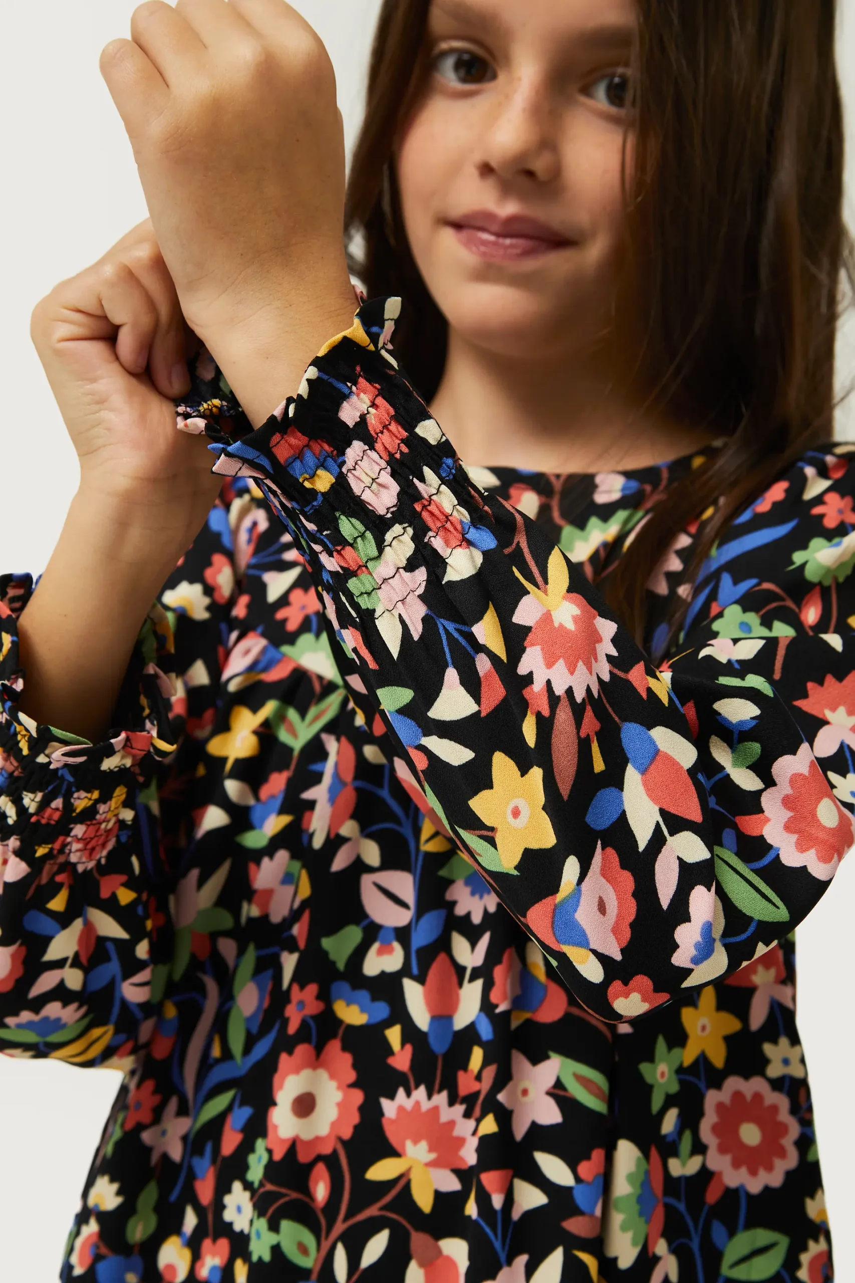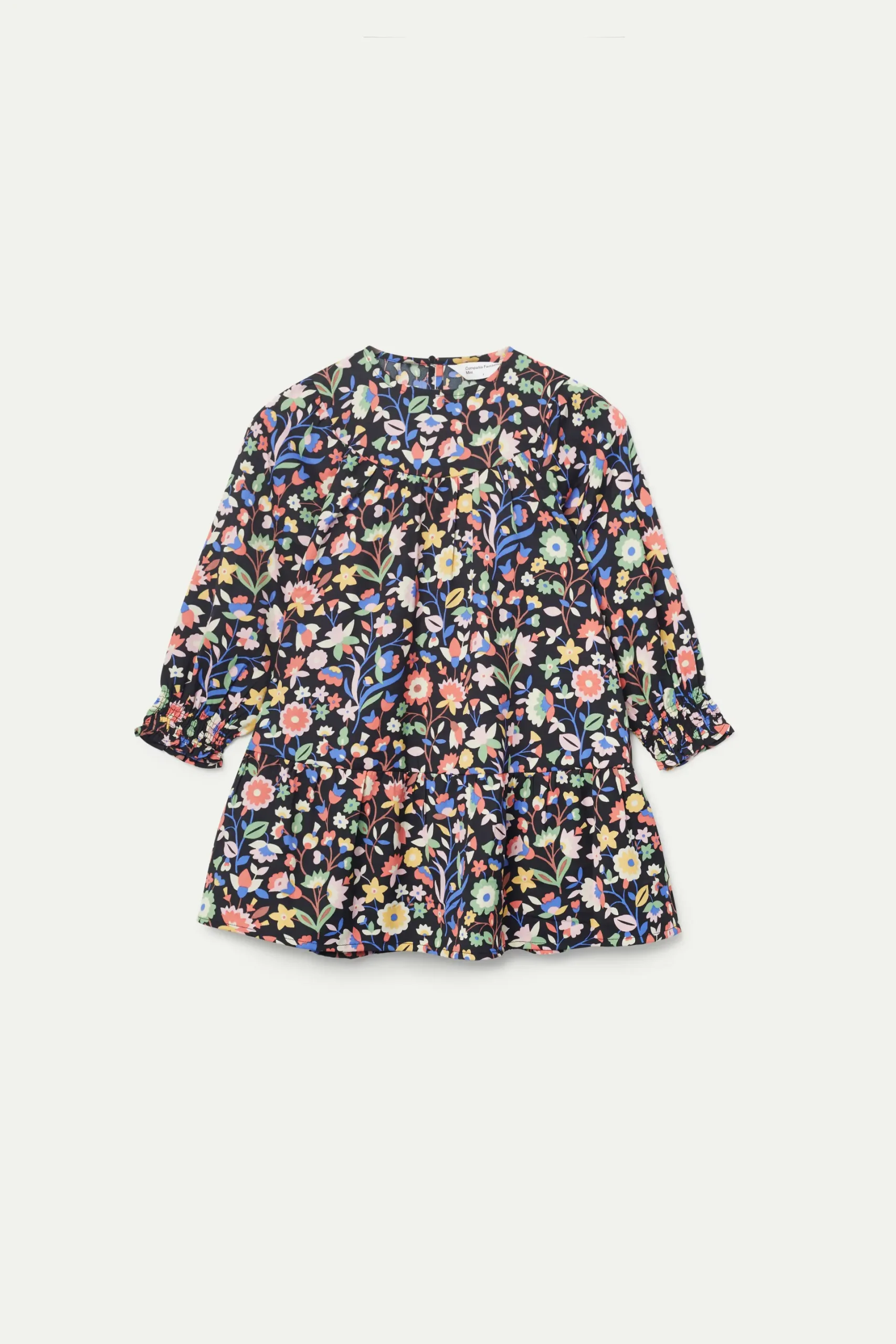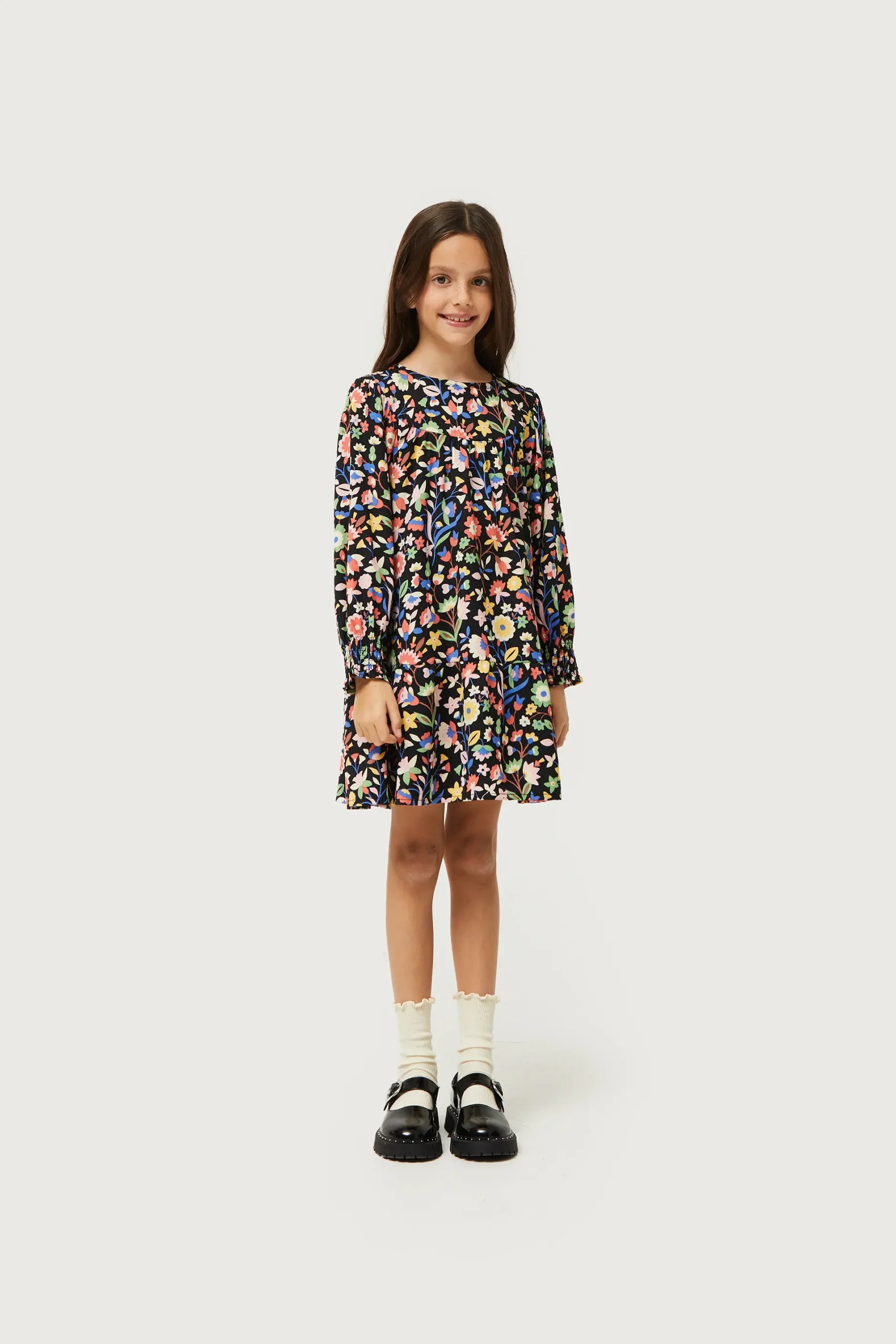 Vestido corto de niña con estampado floral pequeño multicolor. Con cuello redondo y manga larga terminada en puño fruncido. Forro interior. La modelo mide 134 cm y lleva la talla 8.