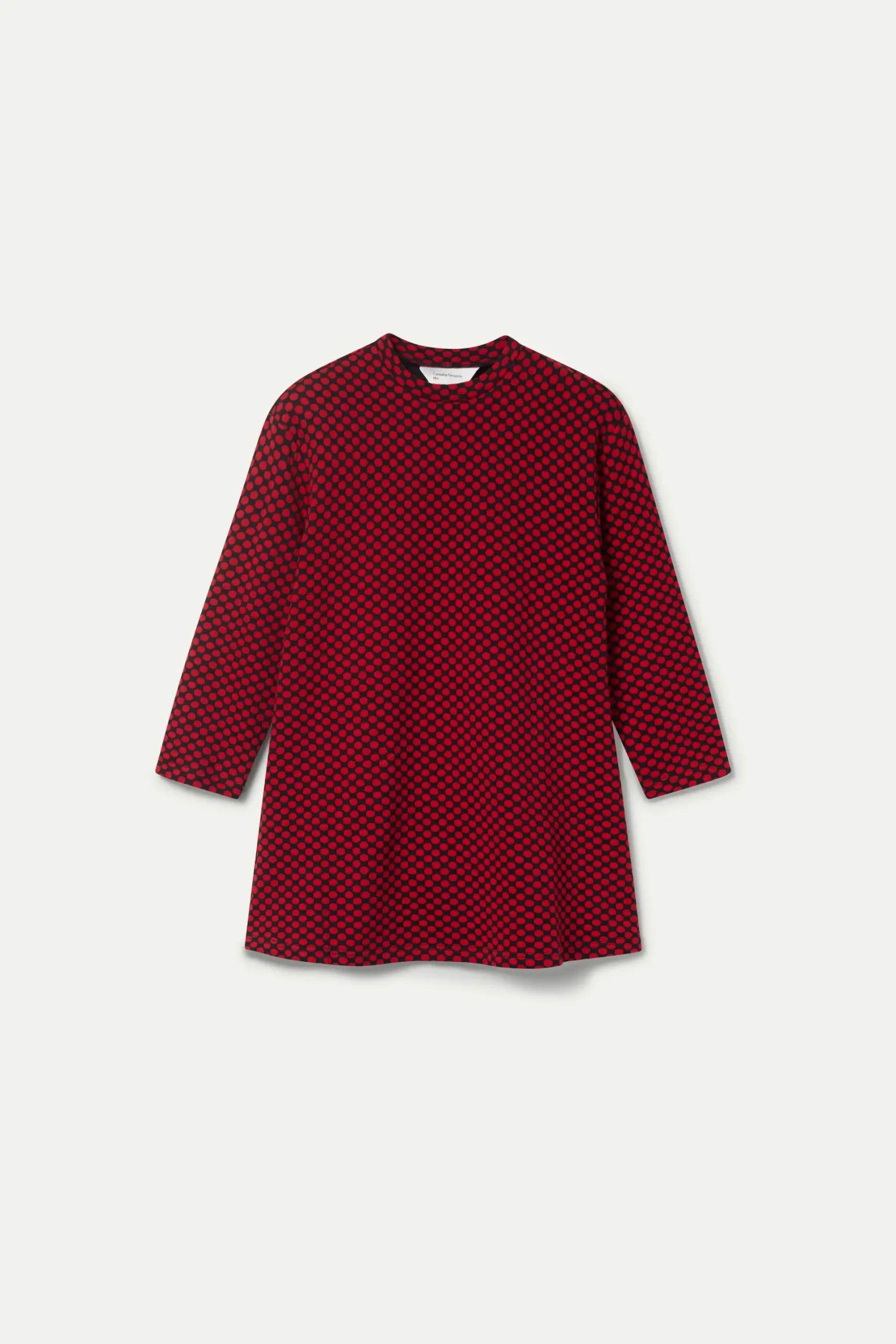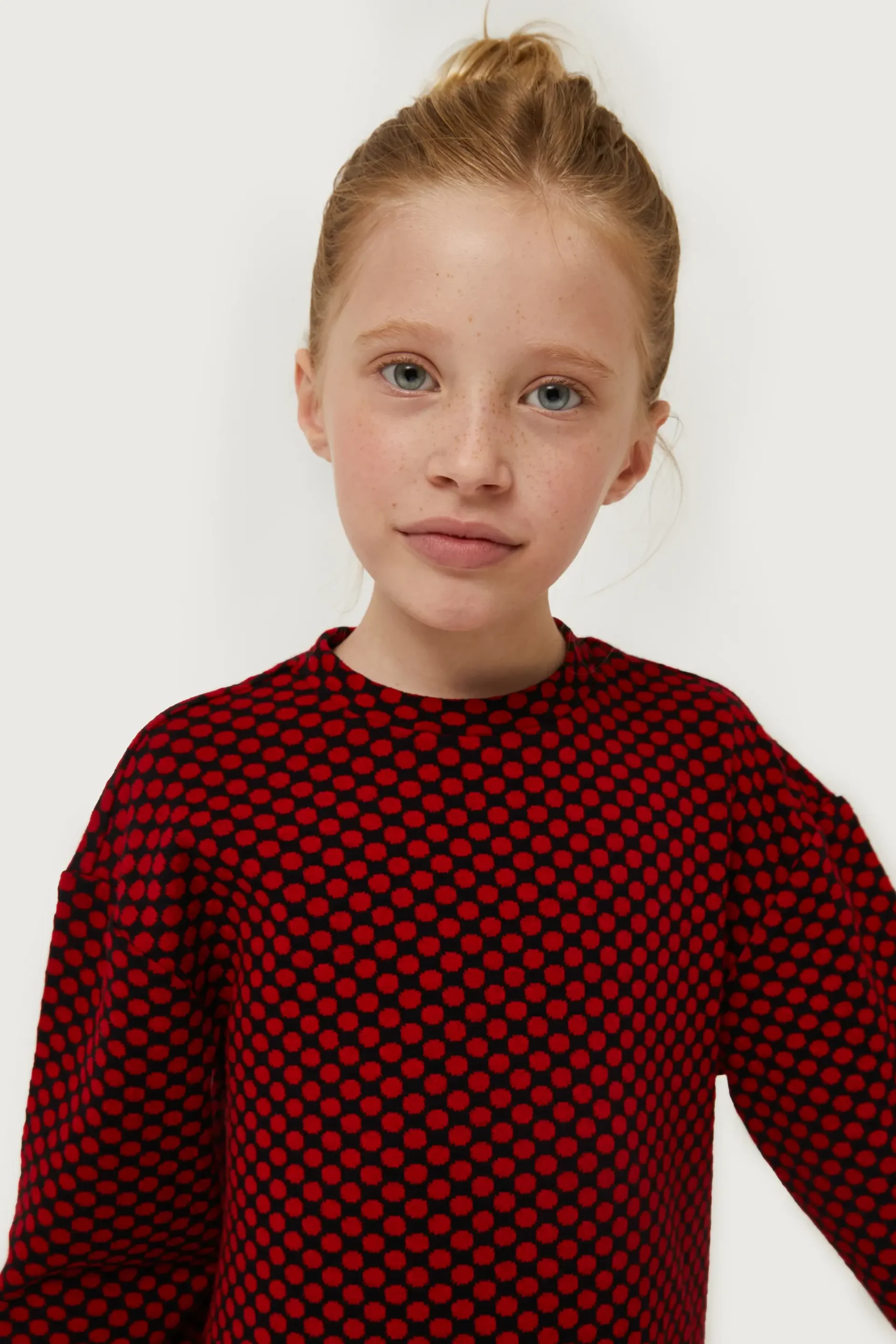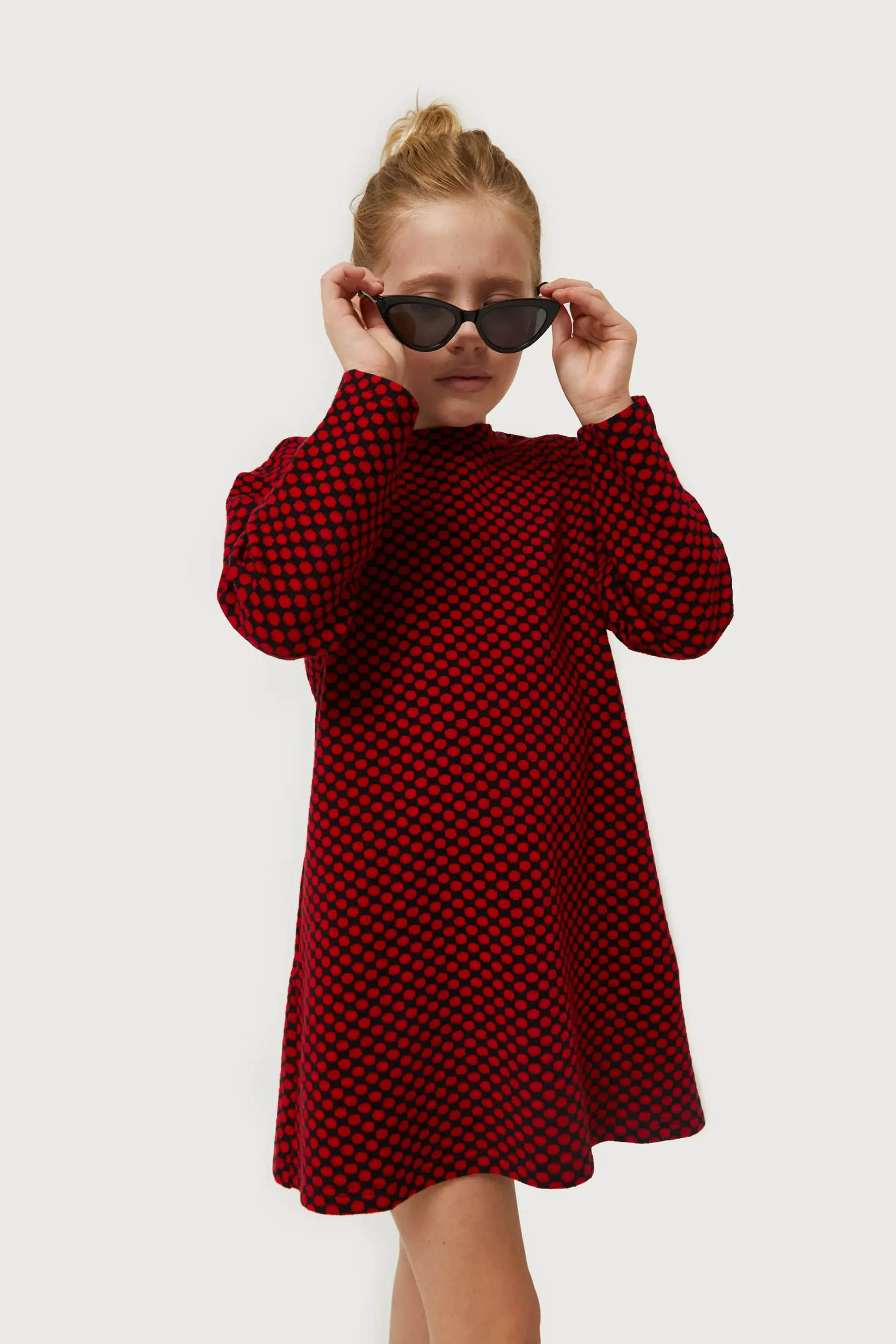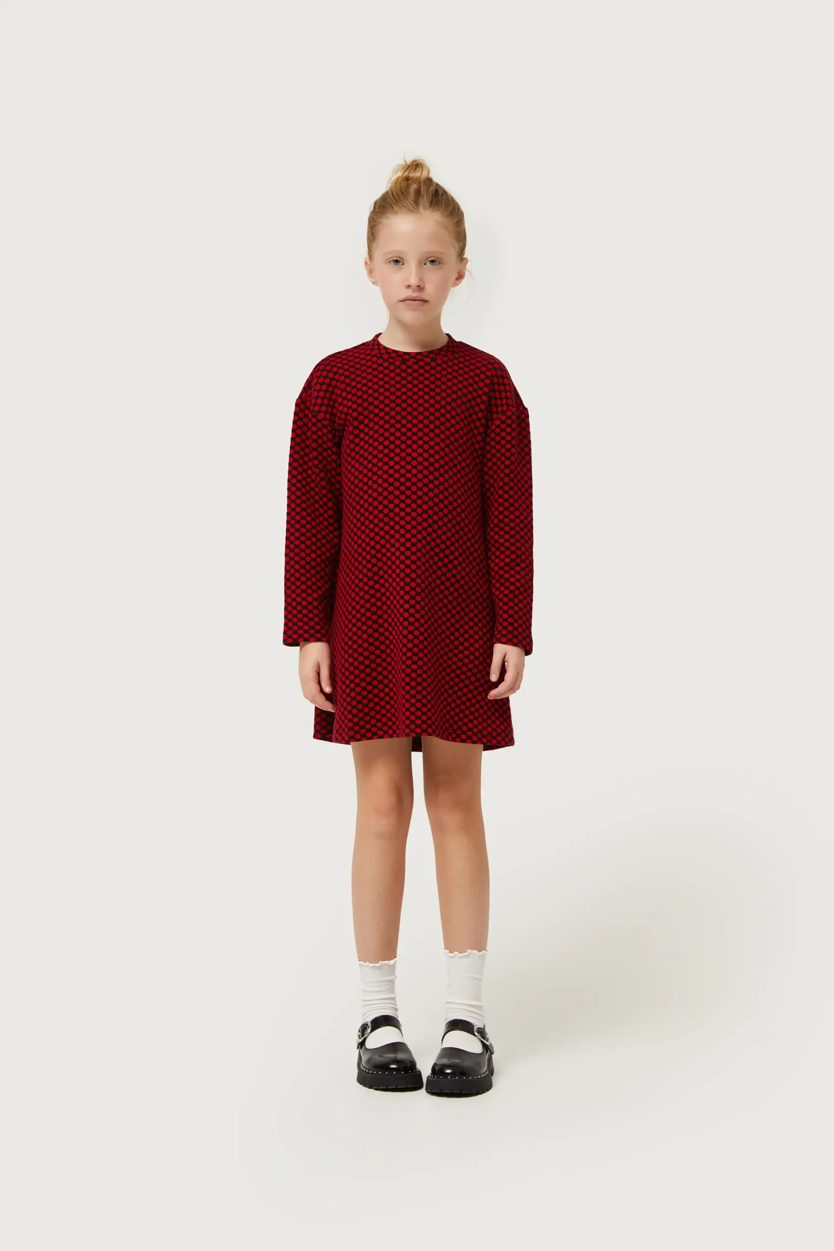 Vestido corto de niña en punto jacquard con fondo negro y estampado de lunares rojos. Con cuello redondo y manga larga. La modelo mide 134 cm y lleva la talla 8.