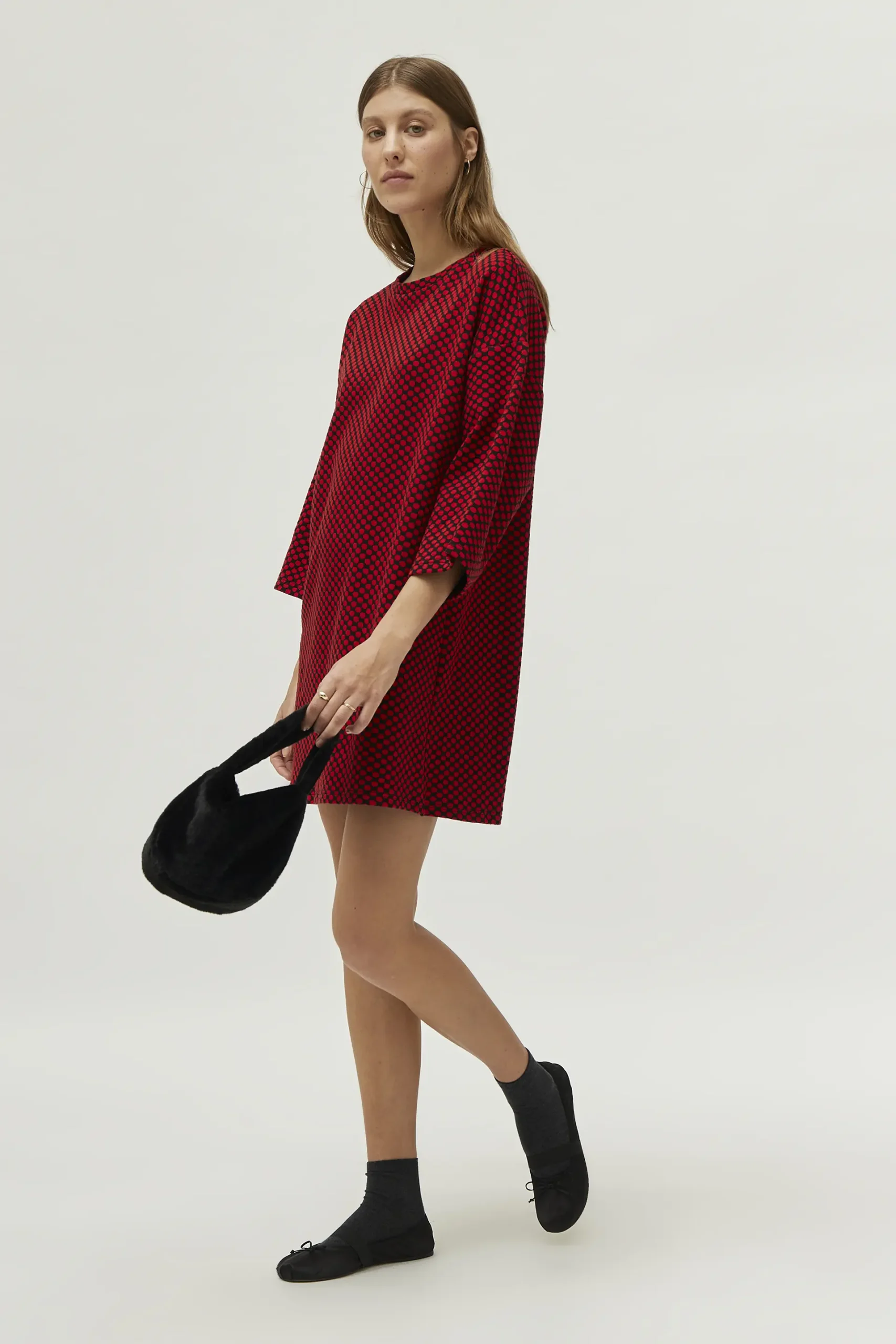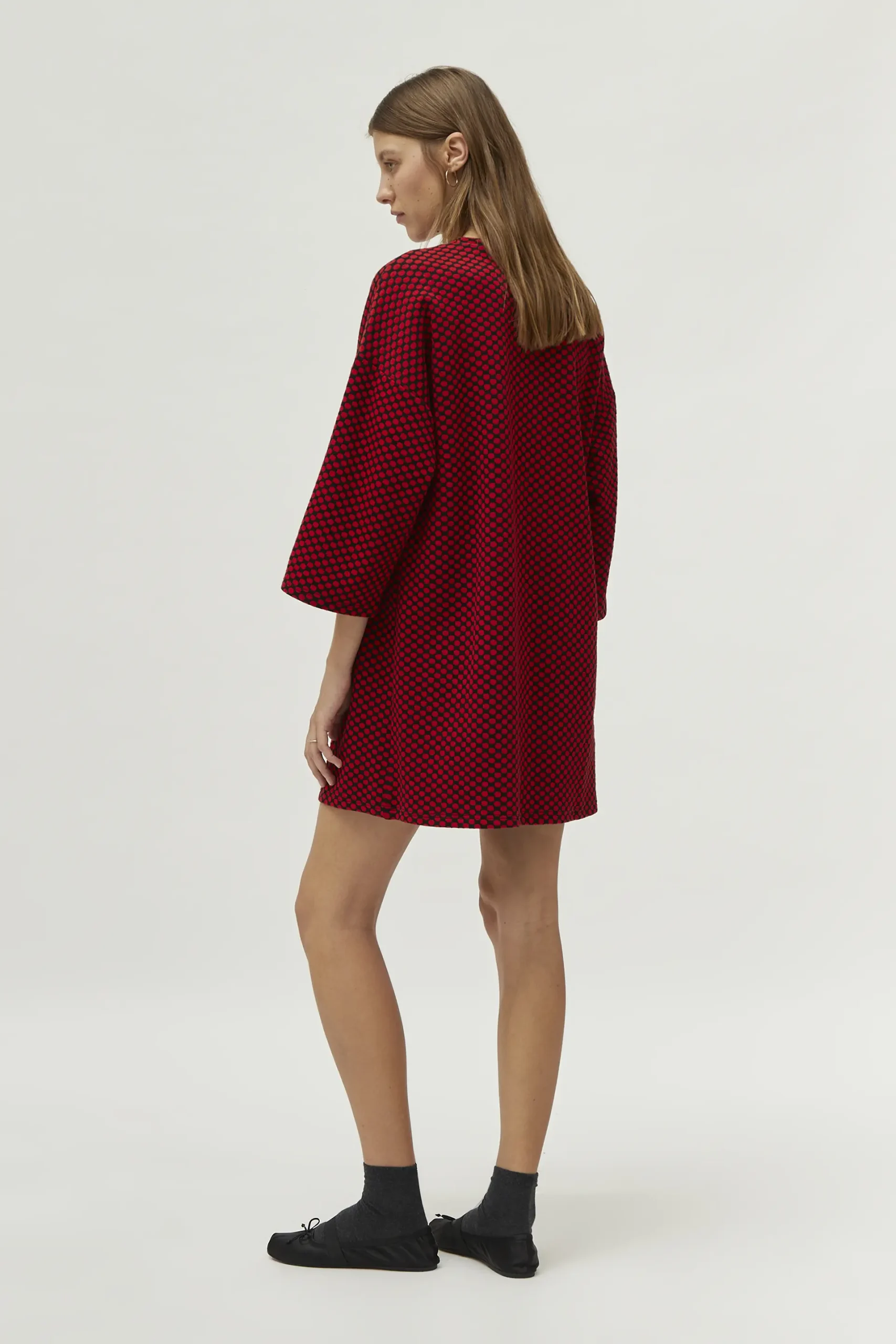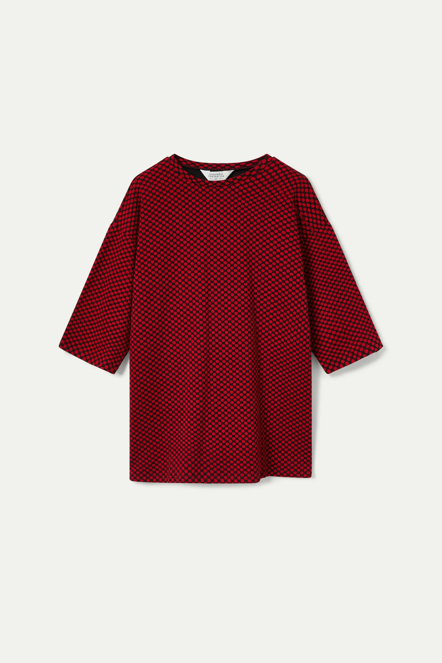 Vestido corto de punto jacquard con fondo negro y estampado de lunares rojos. Con cuello redondo y manga francesa. La modelo mide 177 cm y lleva la talla S.