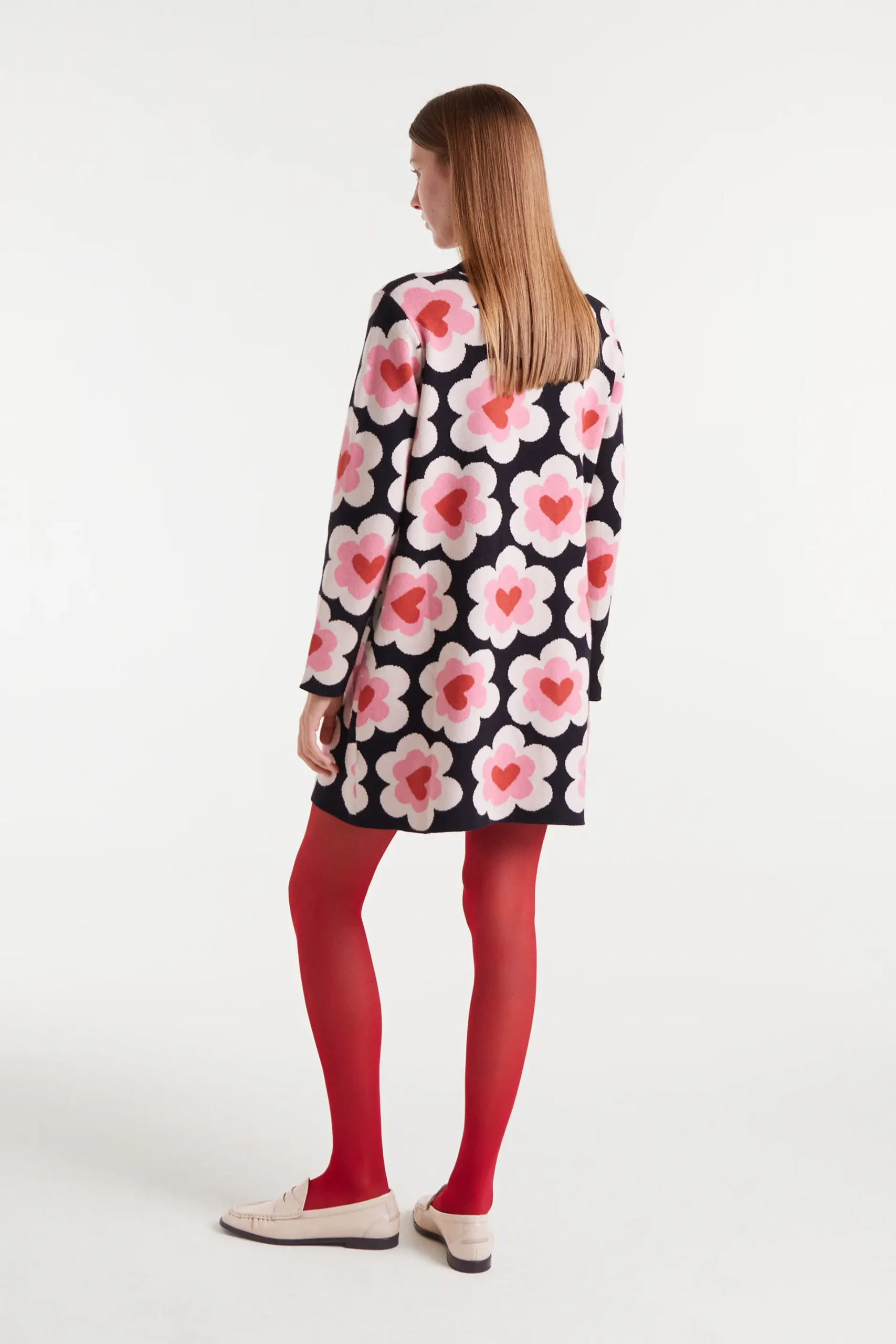 Vestido corto de punto jacquard con estampado SweetHeart. Cuello redondo y manga larga con hombro con ligeramente caído. Detalles con acabados en rib. La modelo mide 177 cm y lleva la talla S.