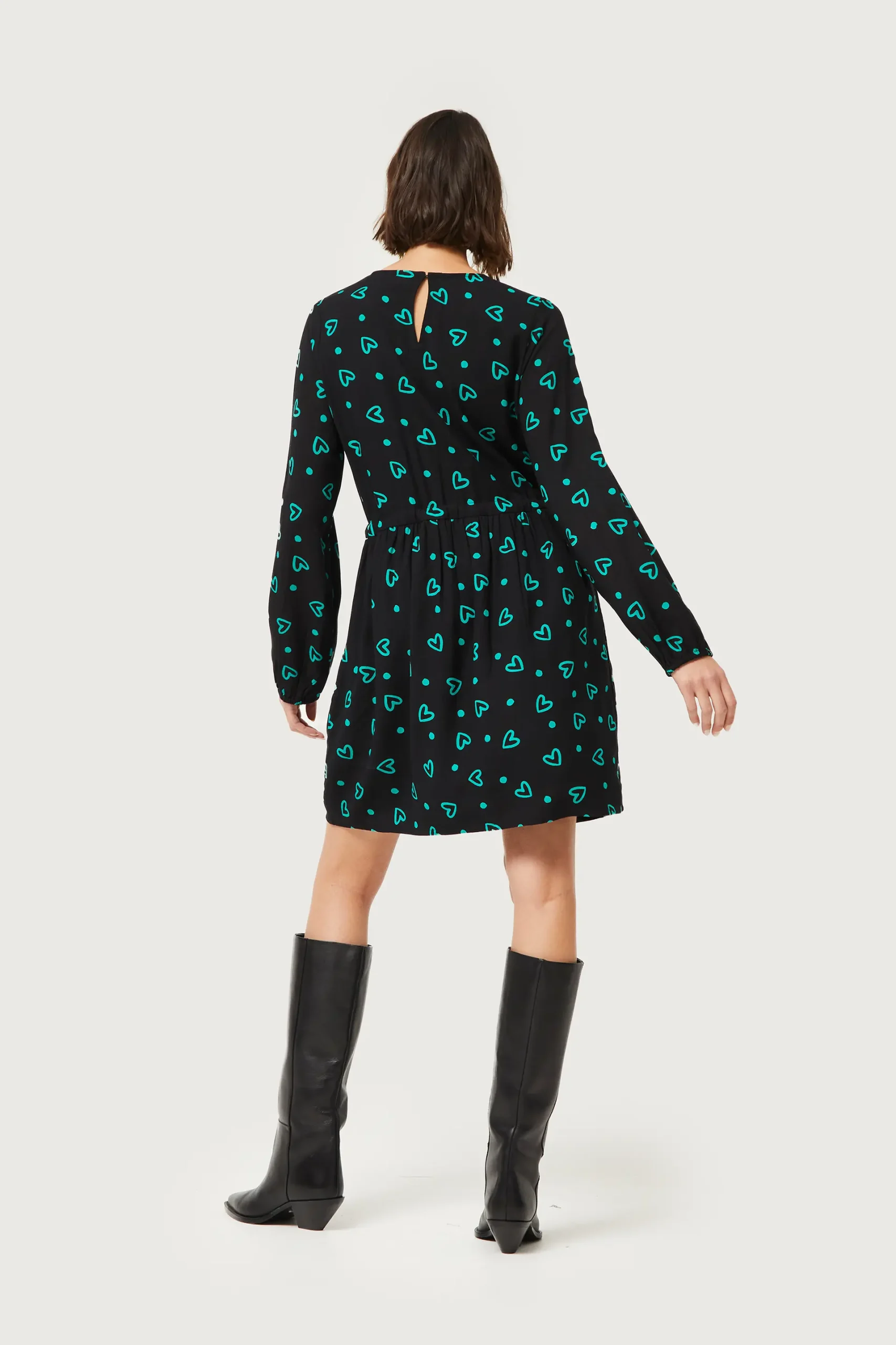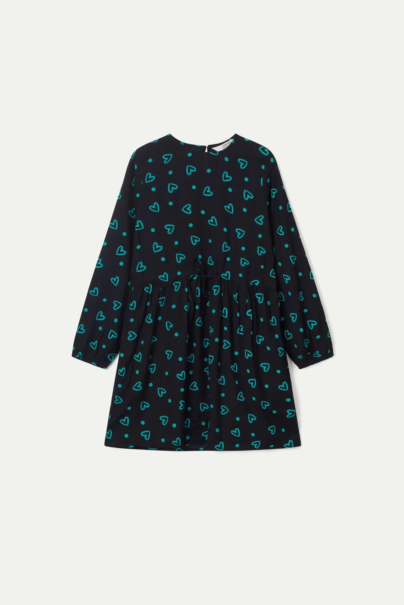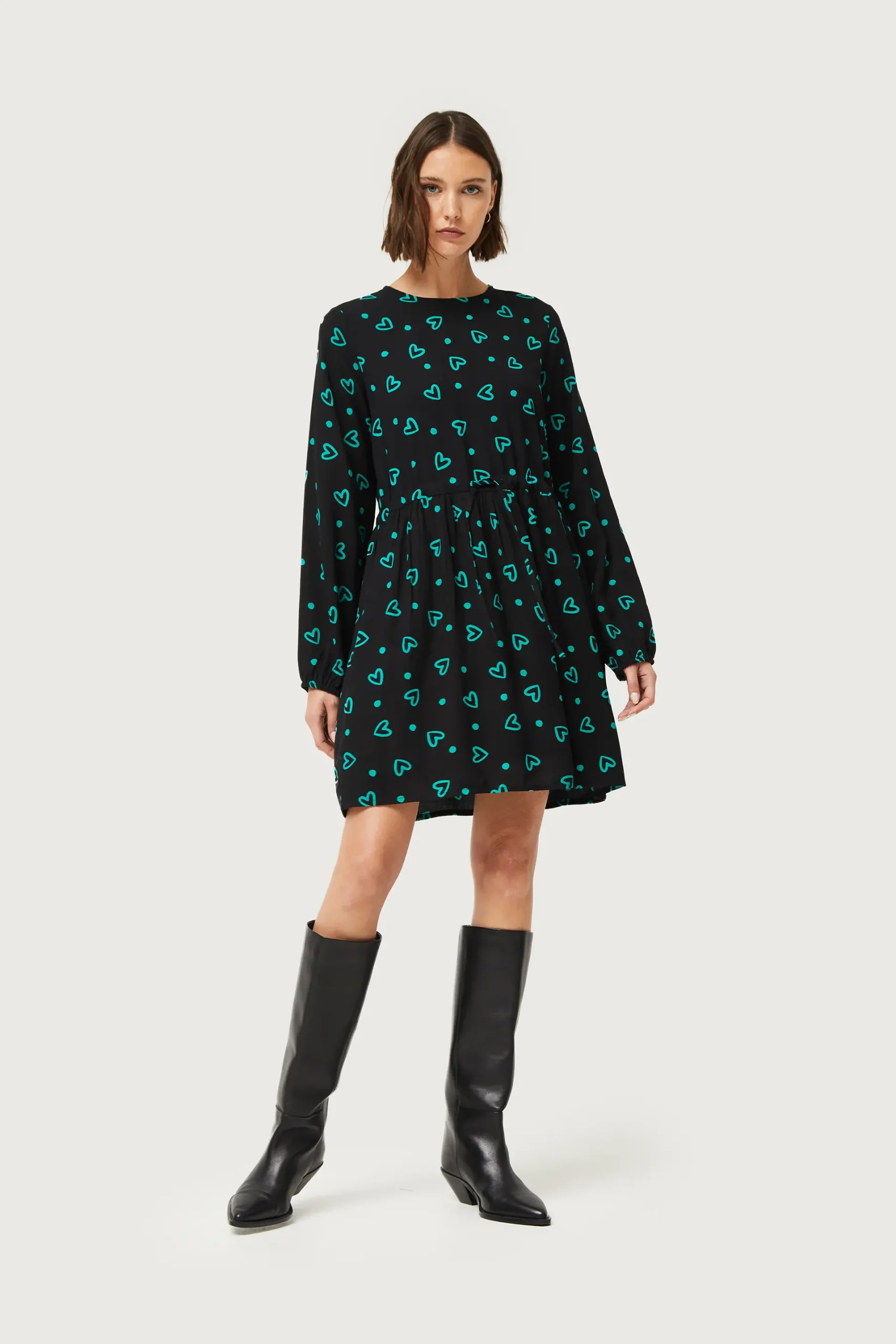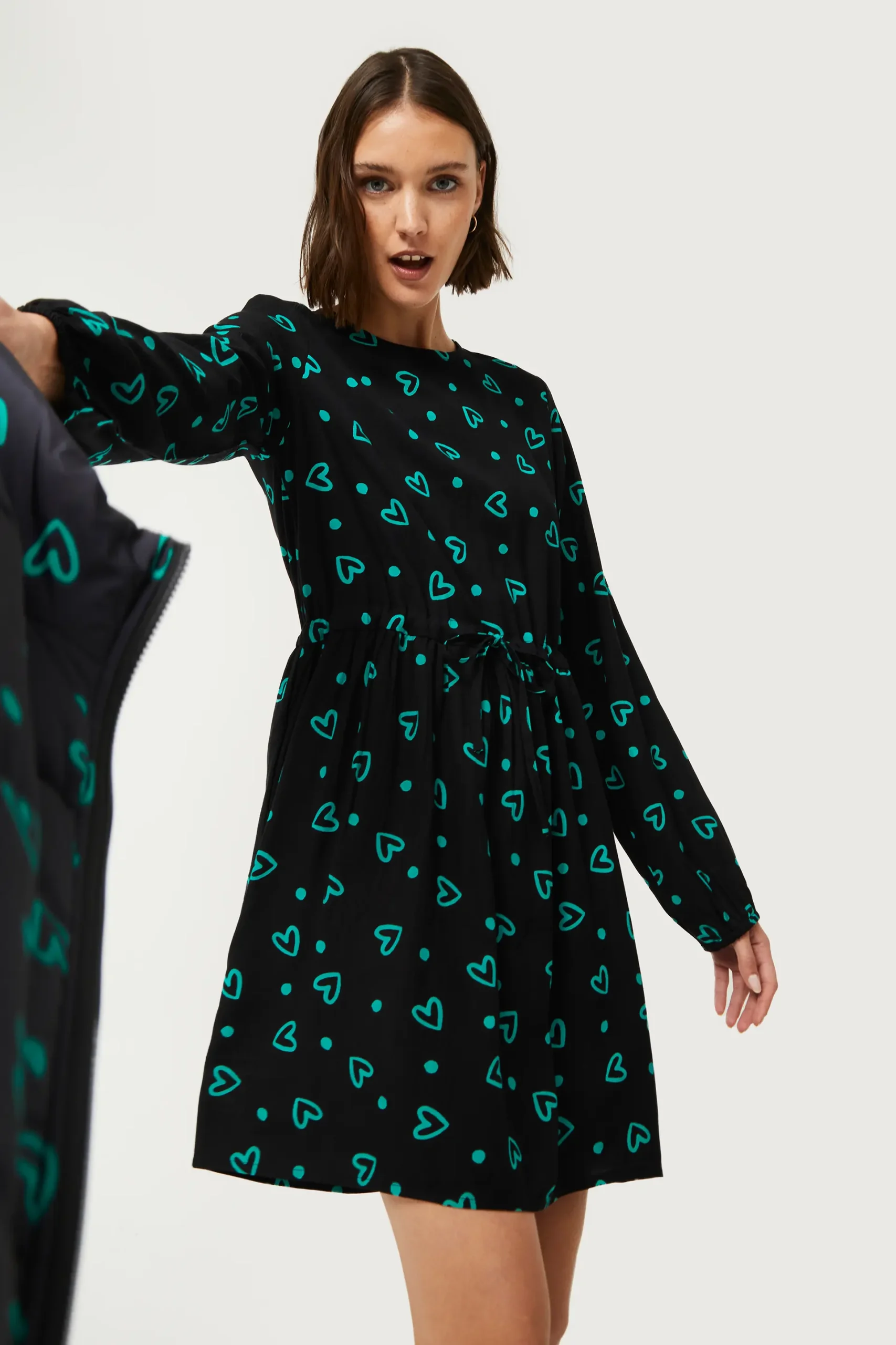 Vestido corto de color negro con estampado de corazones verdes. Con cuello redondo y manga larga. Cierre con botón en la parte posterior. Modelo con cordón ajustable en la cintura. Forro interior. La modelo mide 176 cm y lleva la talla S.