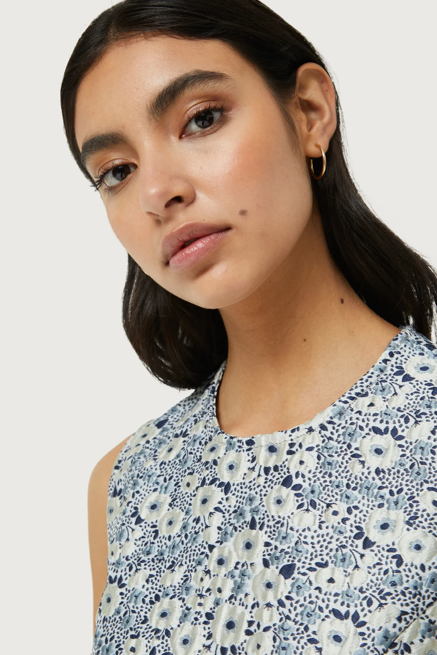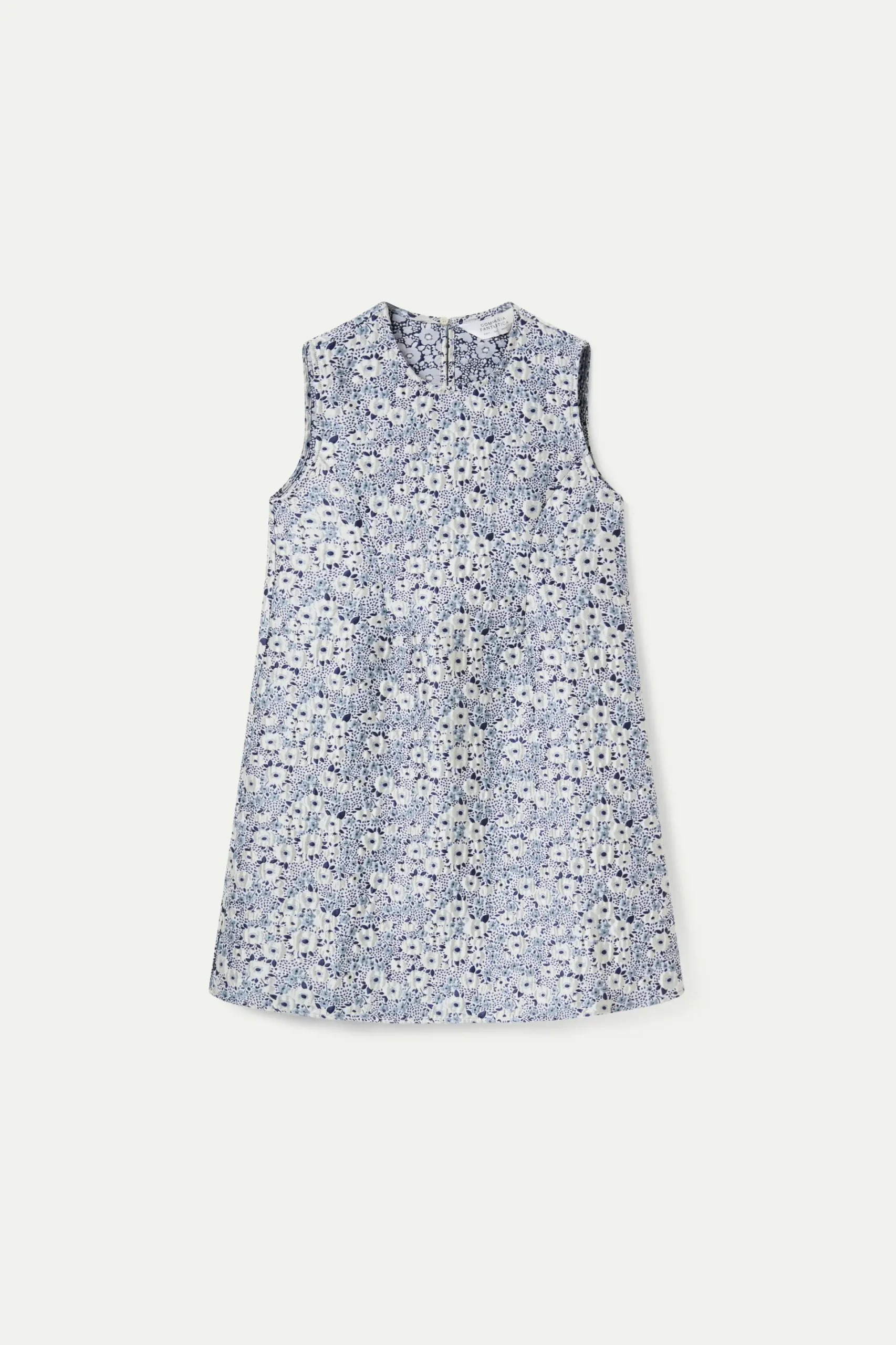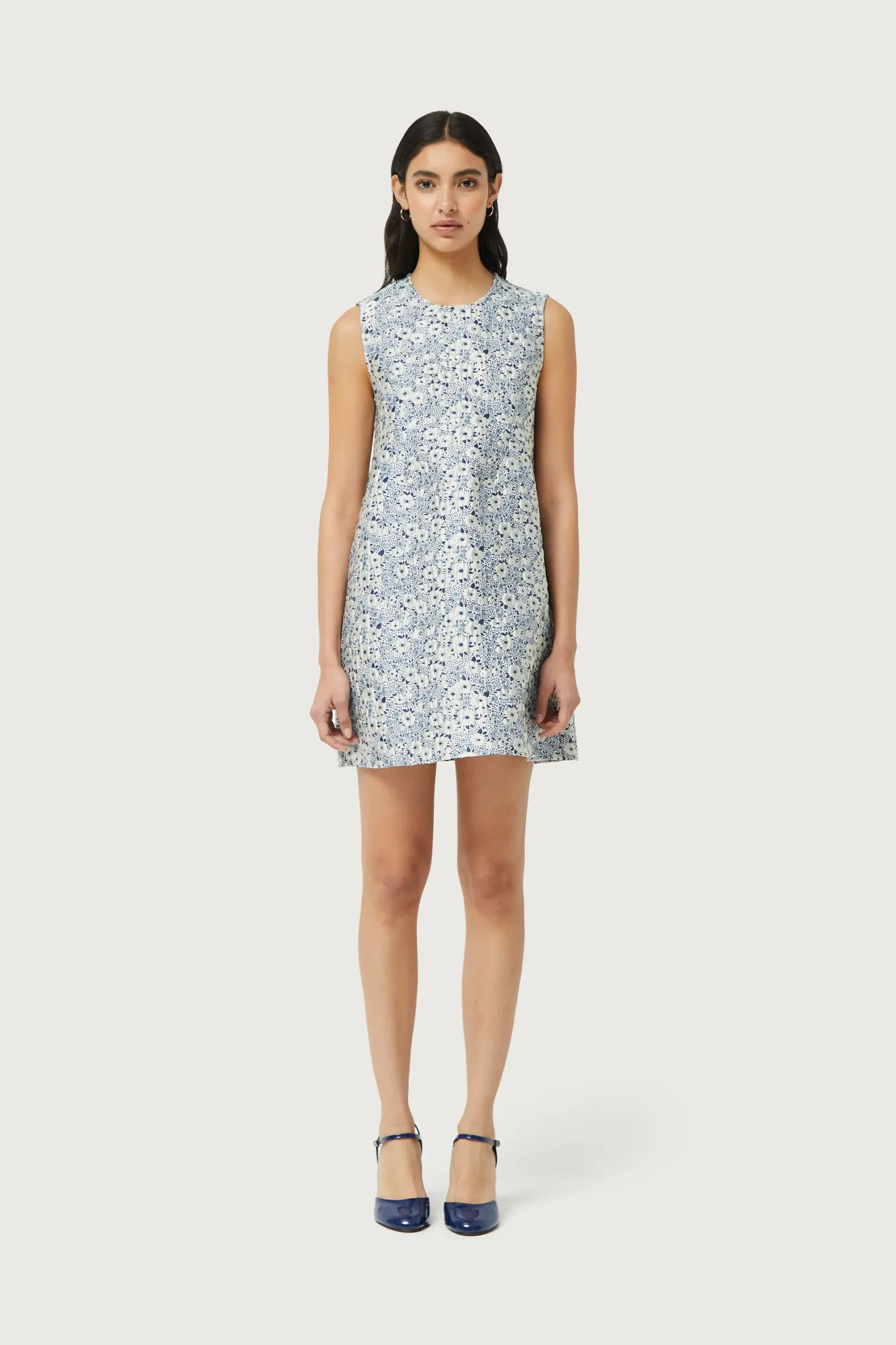 Vestido corto en jacquard con estampado de flores azules y blancas. Con cuello redondo y sin mangas. La modelo mide 176 cm y lleva la talla S.