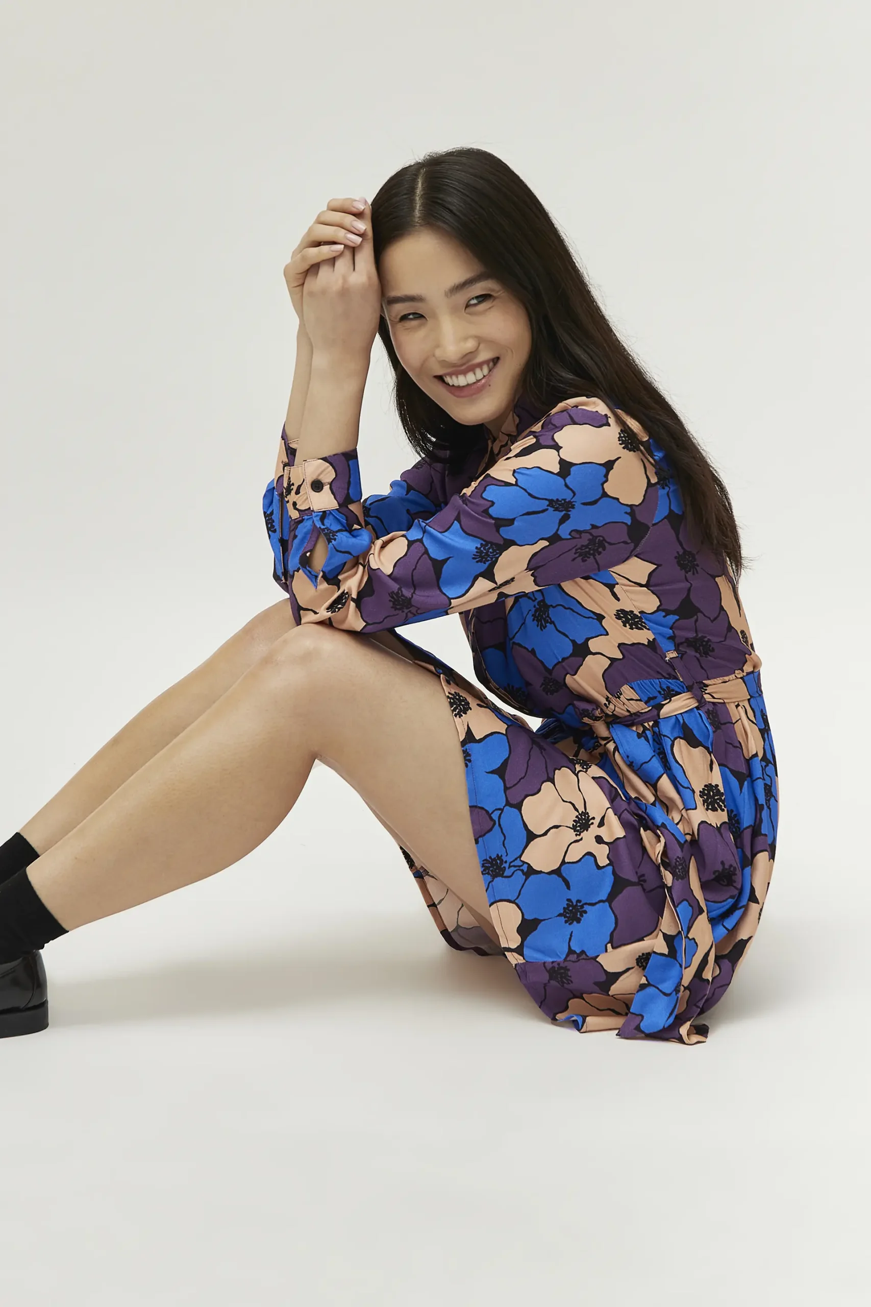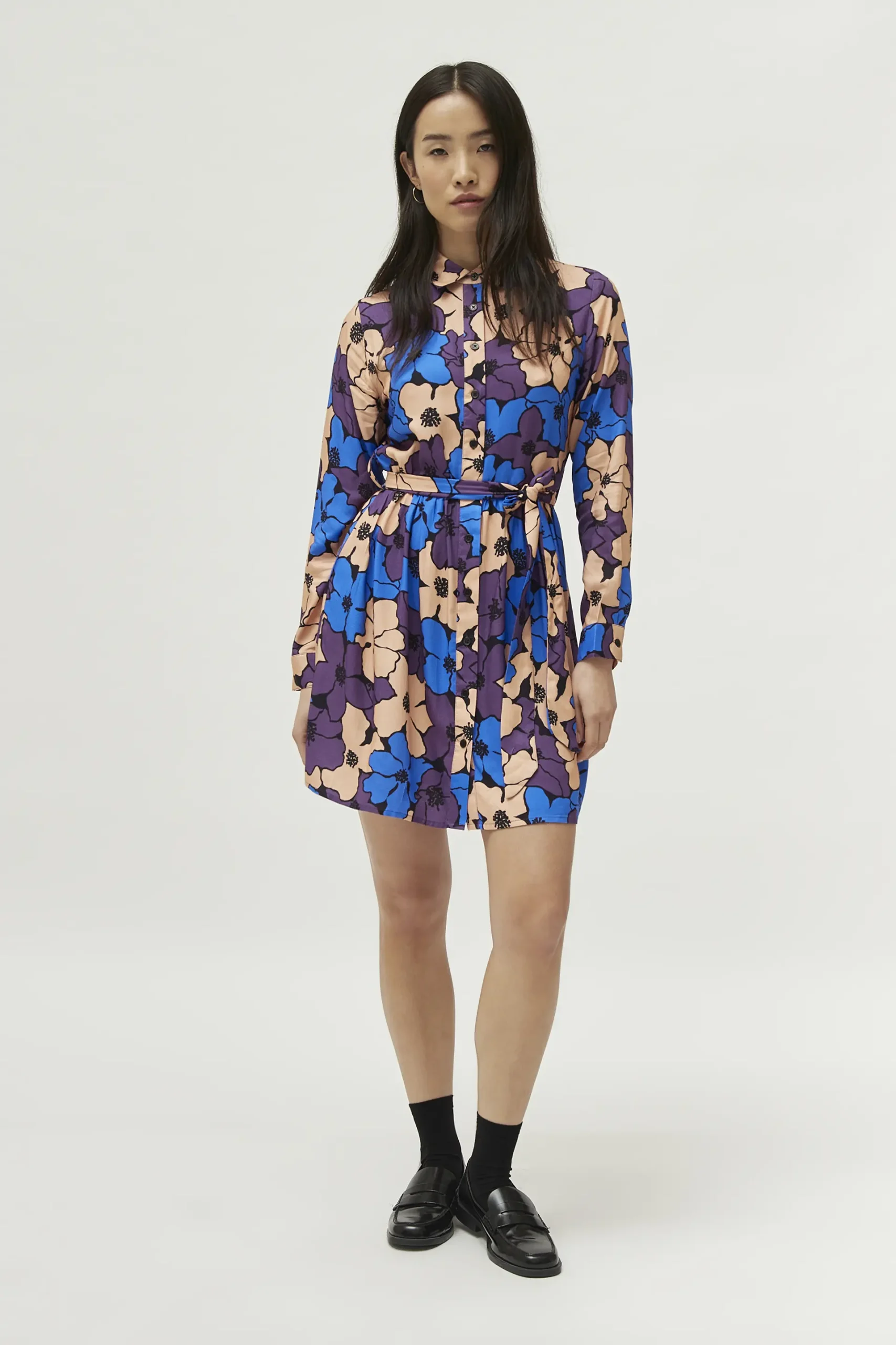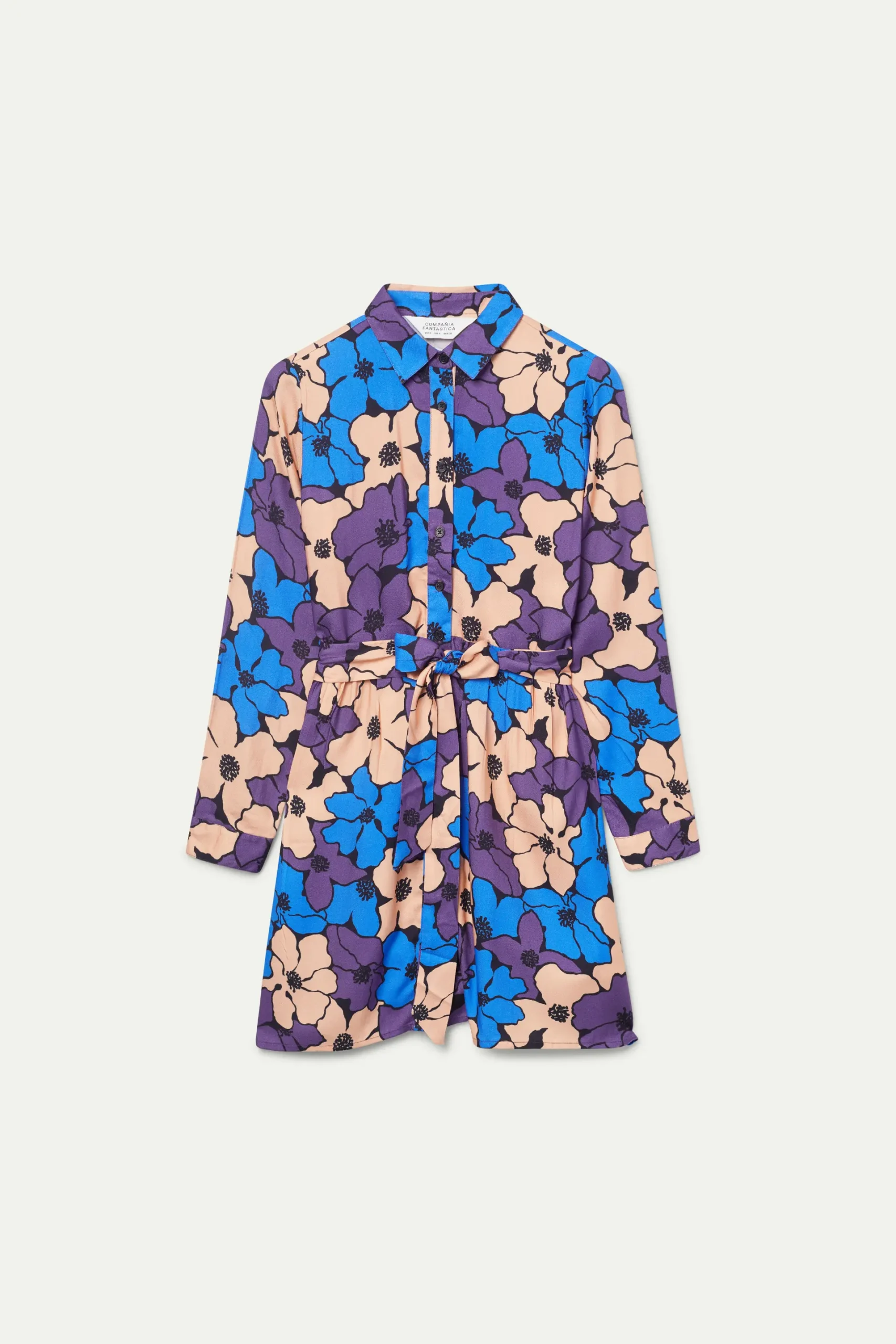 Vestido corto en twill de viscosa con estampado de flores azules, moradas y beige. Con cuello solapa y manga larga. Cierre frontal con botones y cinturón en el mismo tejido. La modelo mide 171 cm y lleva la talla S.