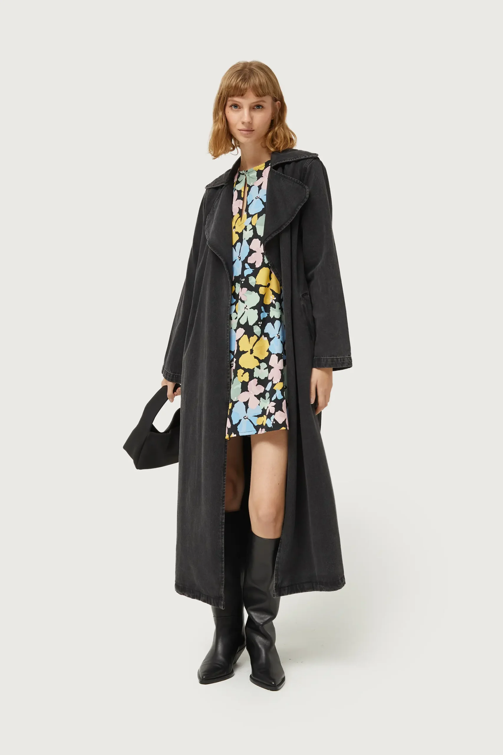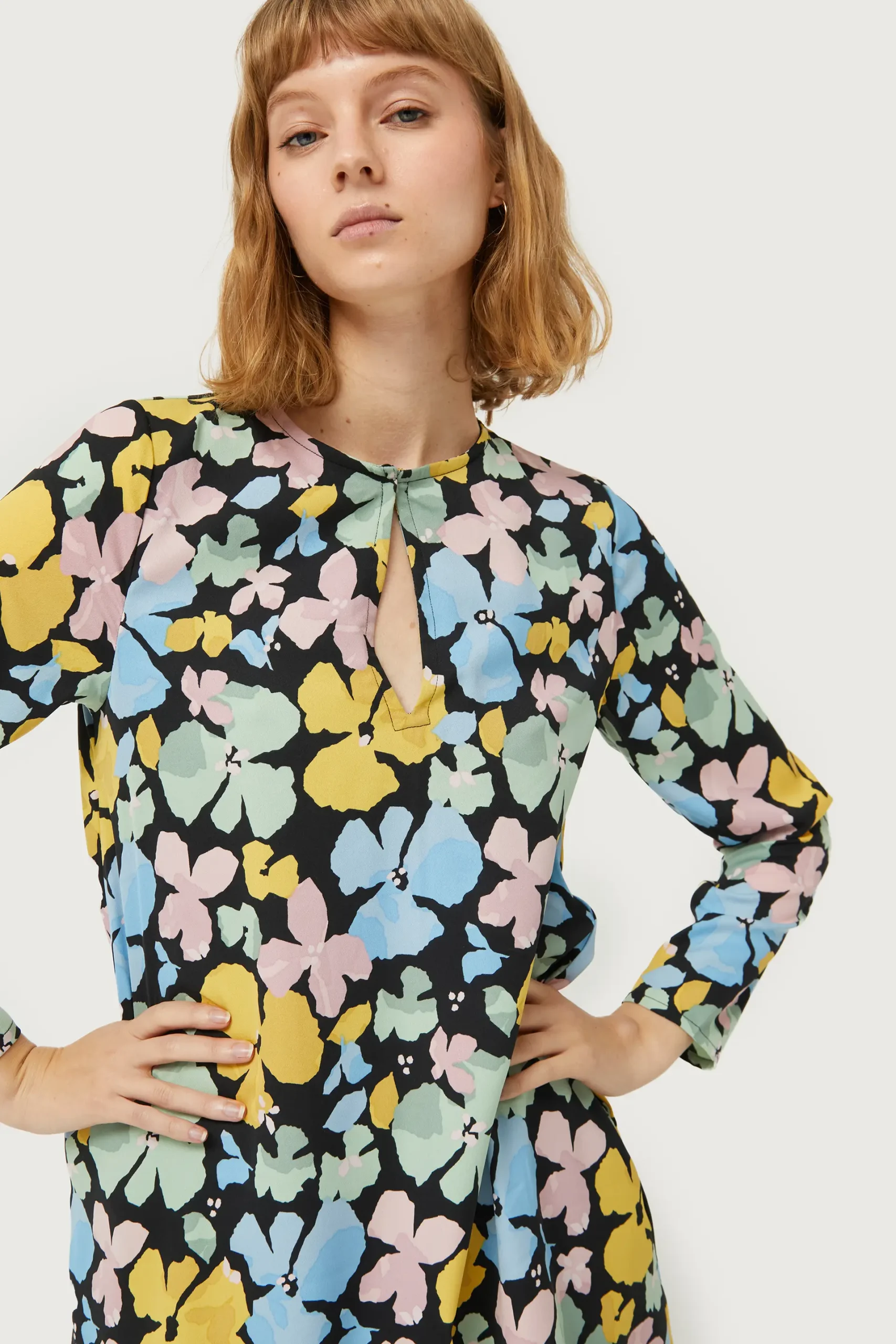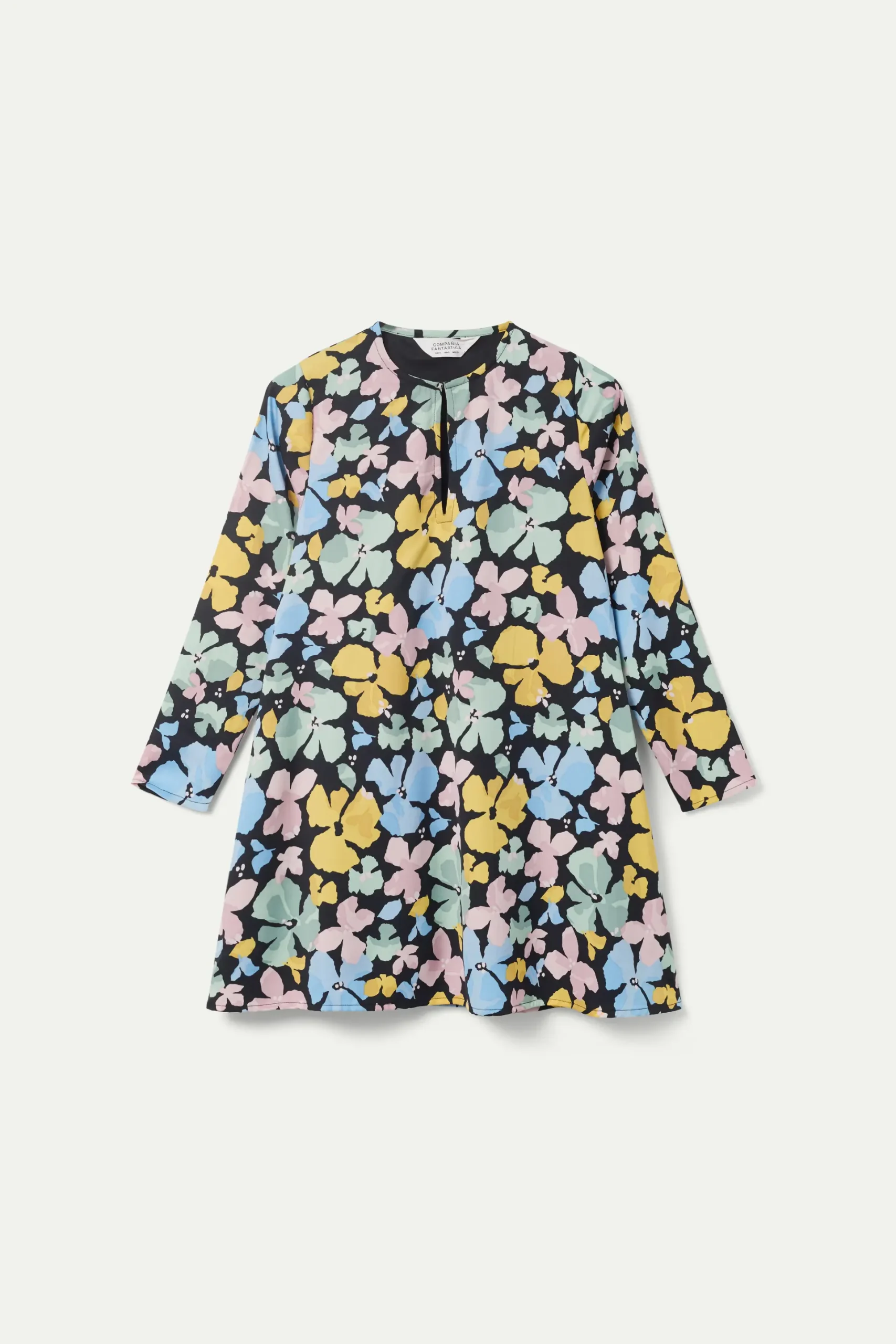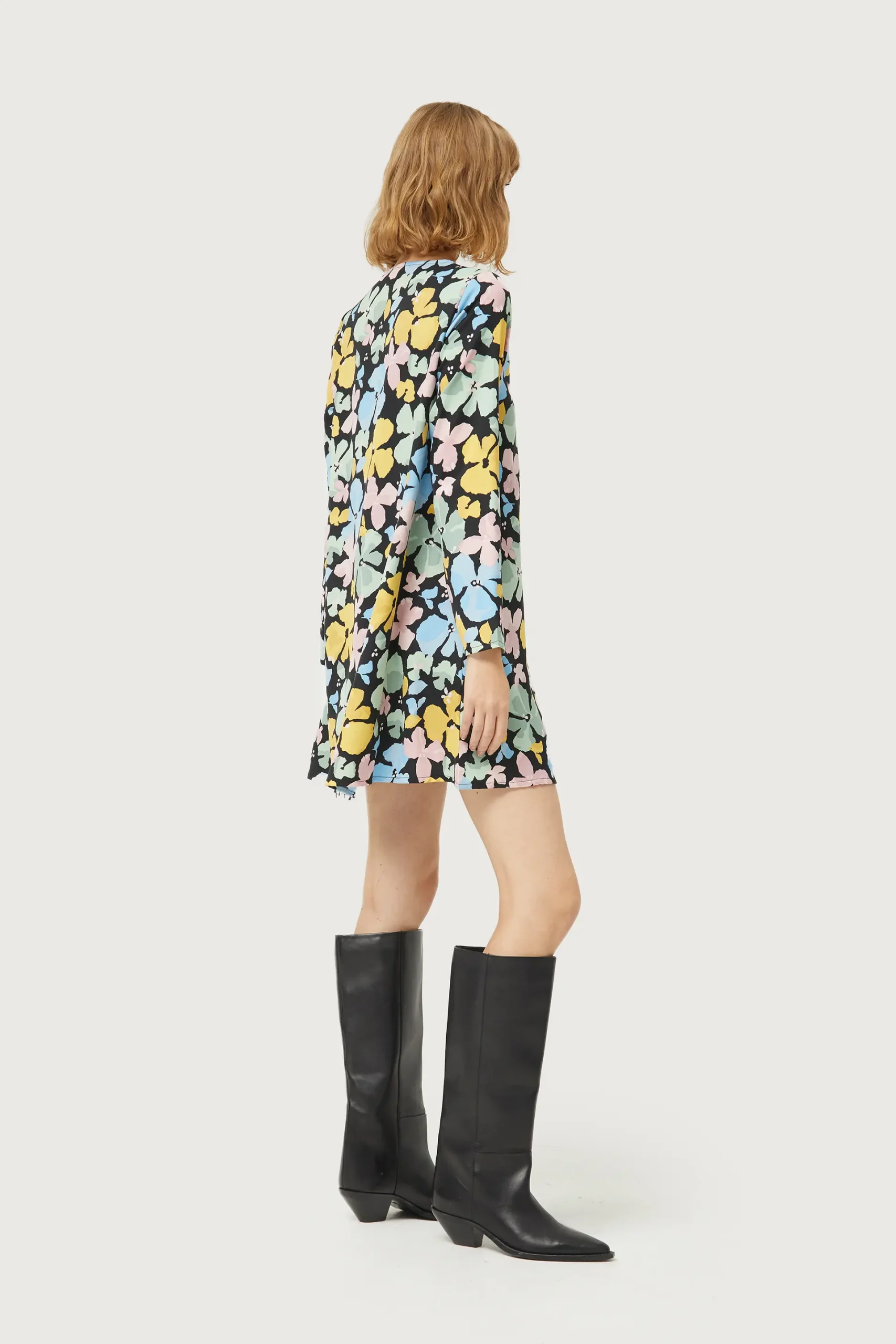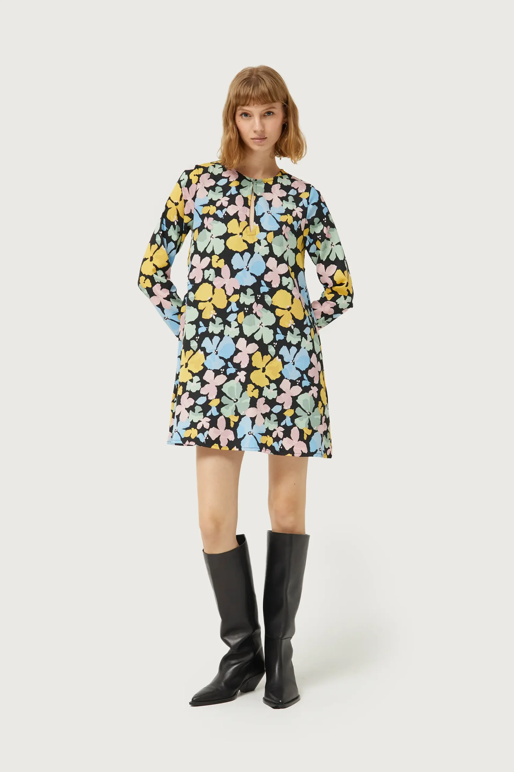 Vestido corto en crepé de color negro con estampado de flores azules, rosas y amarillas. Con cuello redondo y manga larga. Detalle de abertura en el pecho. Forro interior. La modelo mide 177 cm y lleva la talla S.