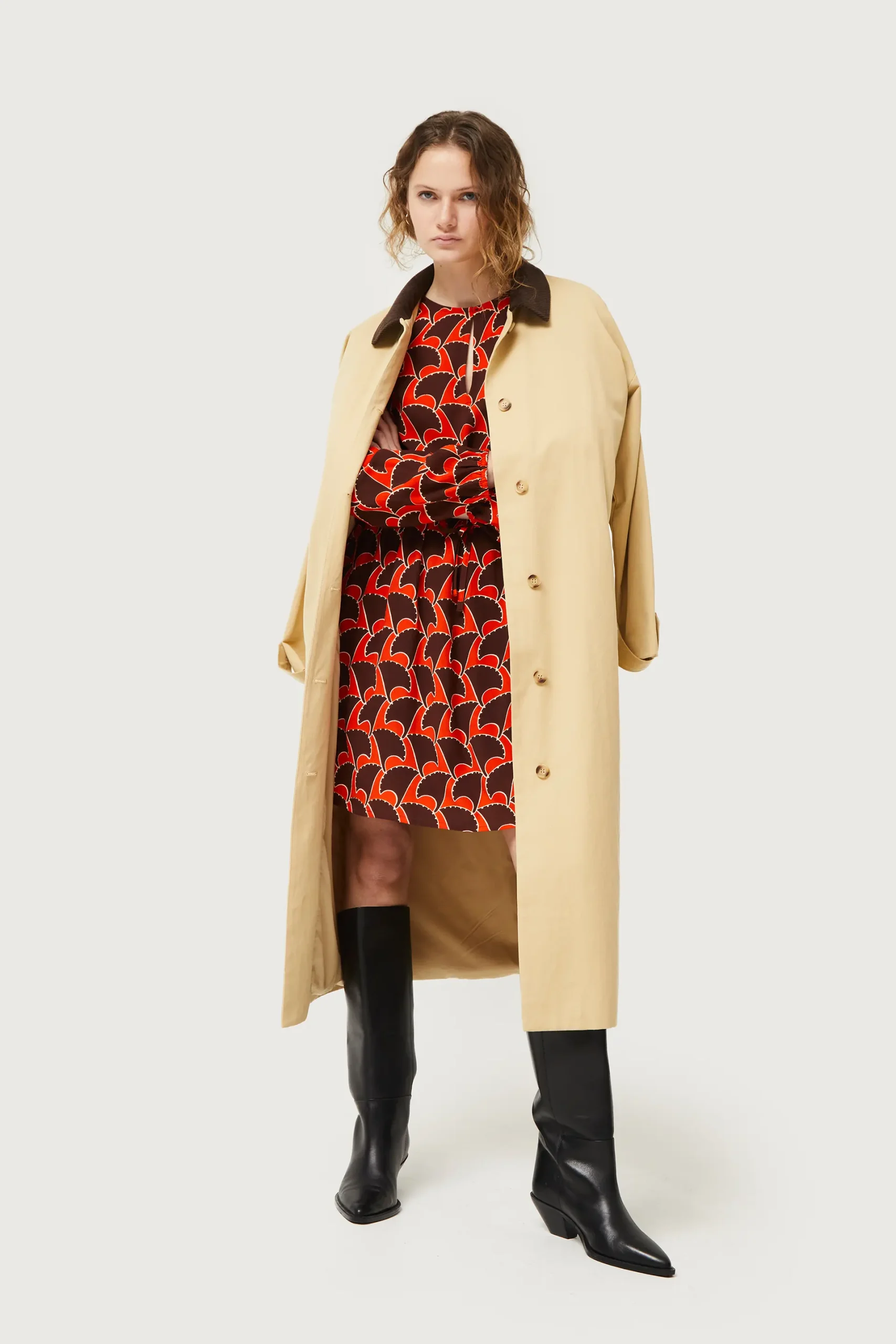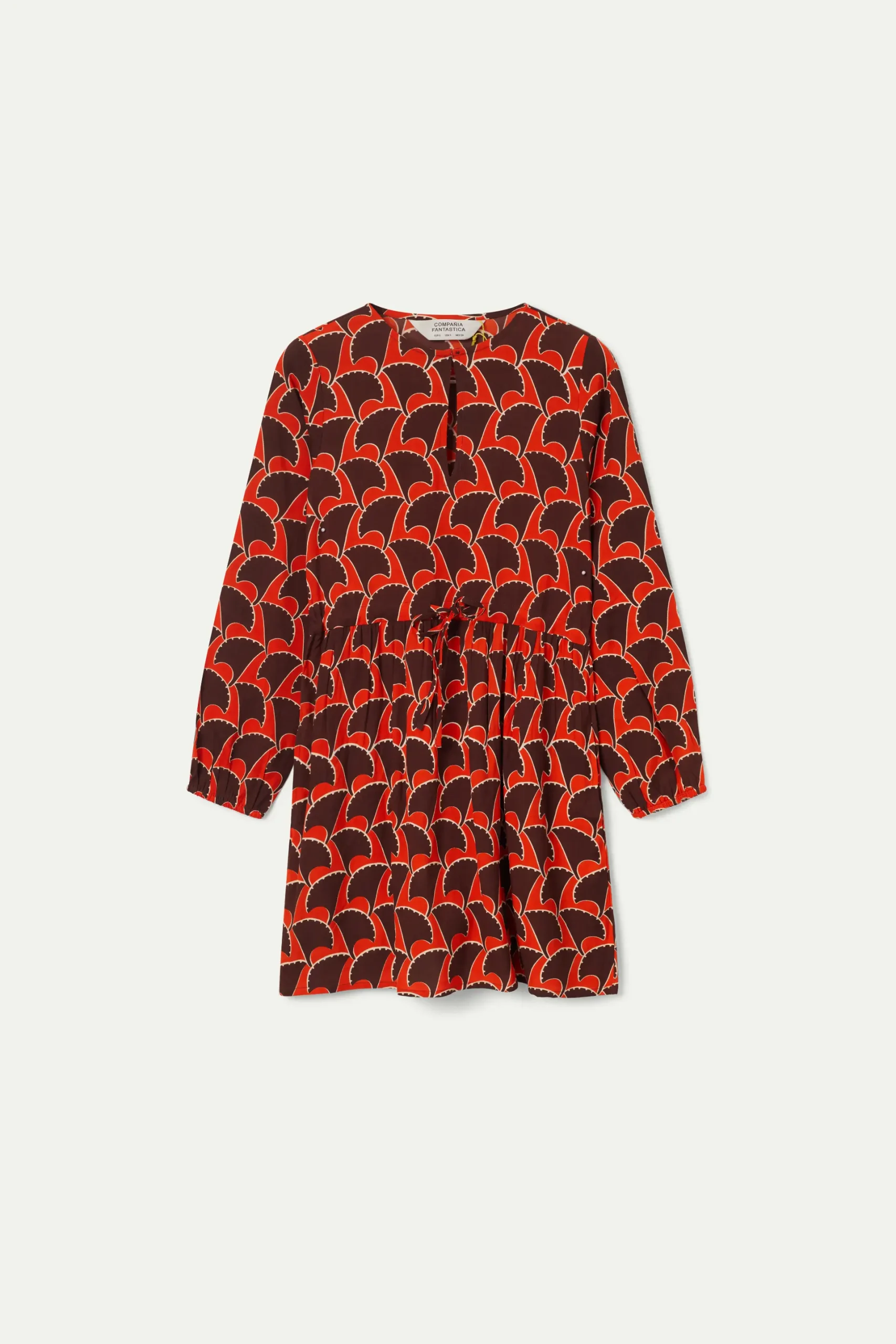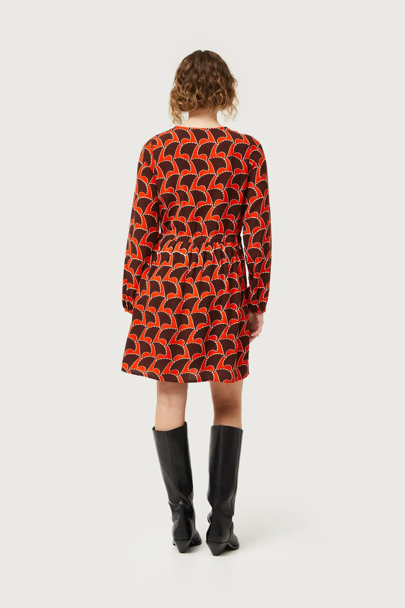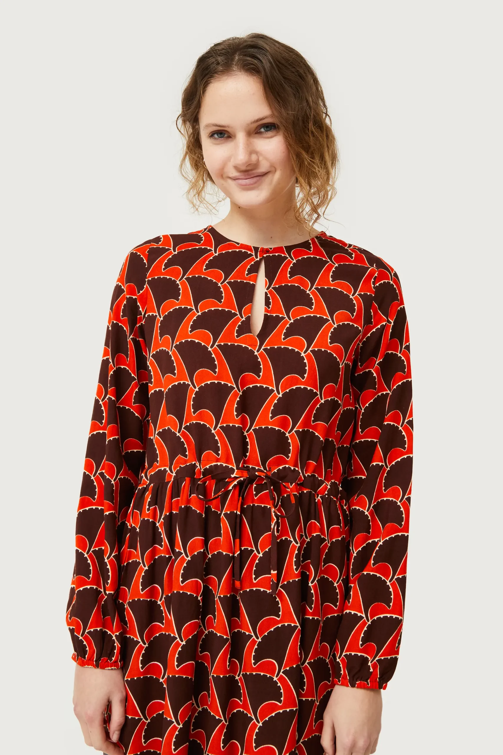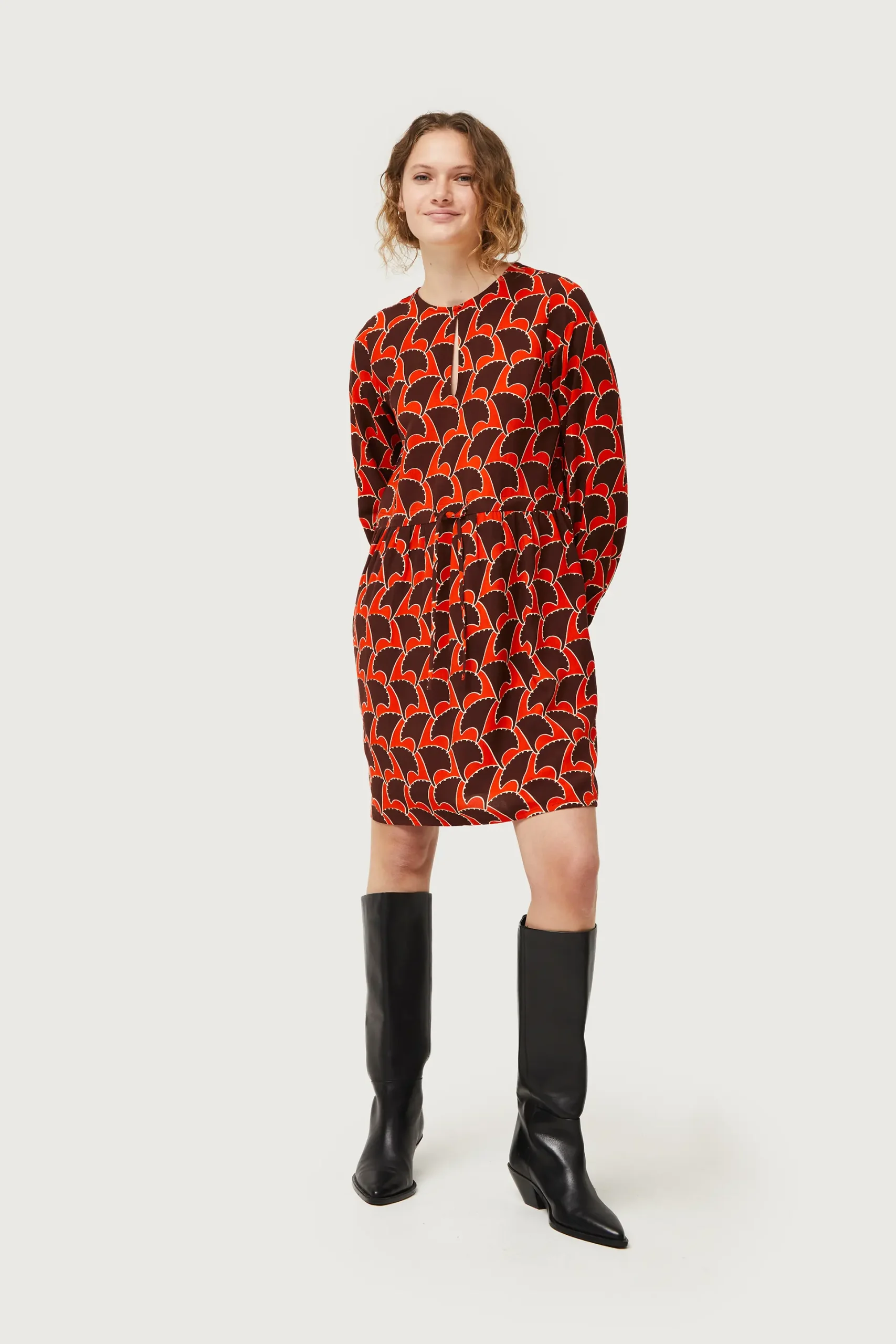 Vestido corto con estampado geométrico de color naranja y marrón. Con cuello redondo y manga larga. Modelo con cordón ajustable en la cintura. Detalle de abertura en el pecho. Forro interior. La modelo mide 175 cm y lleva la talla S.