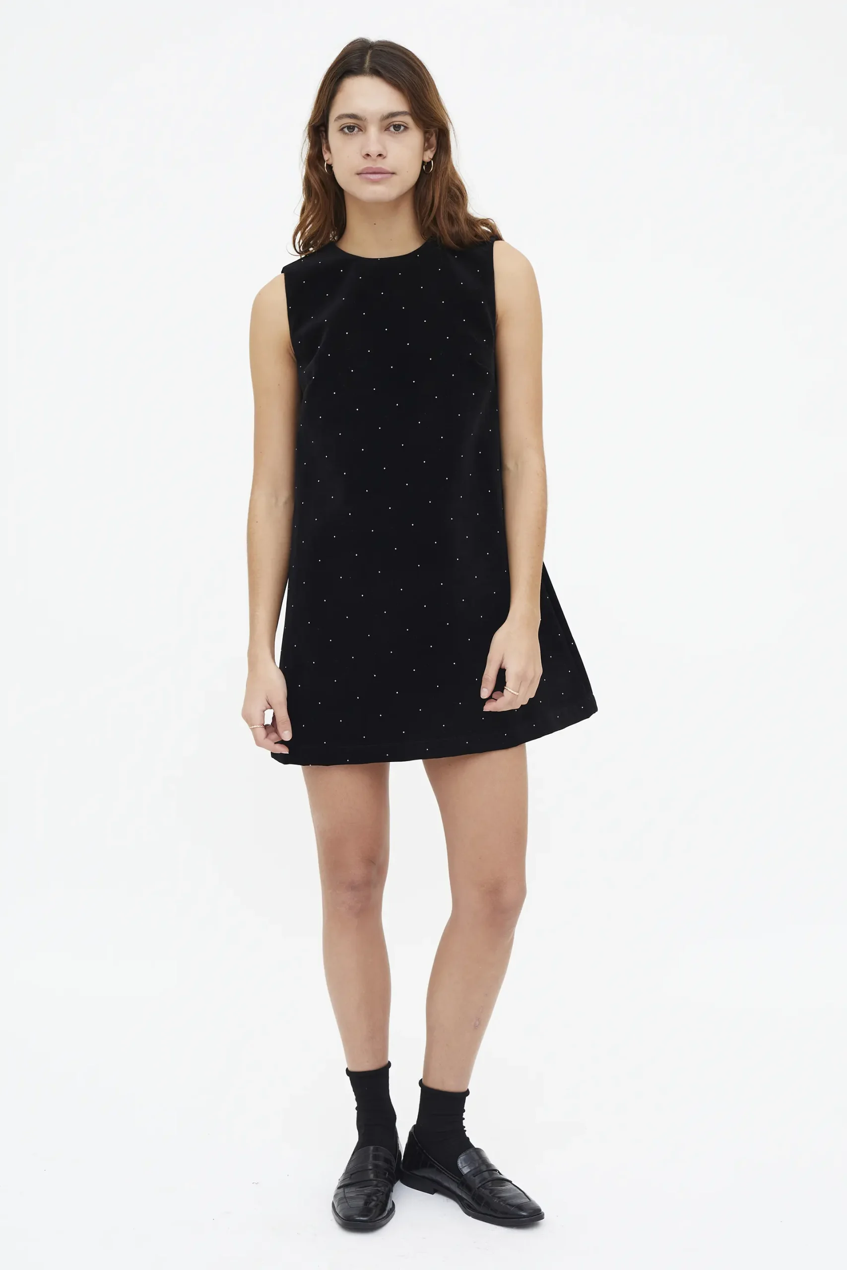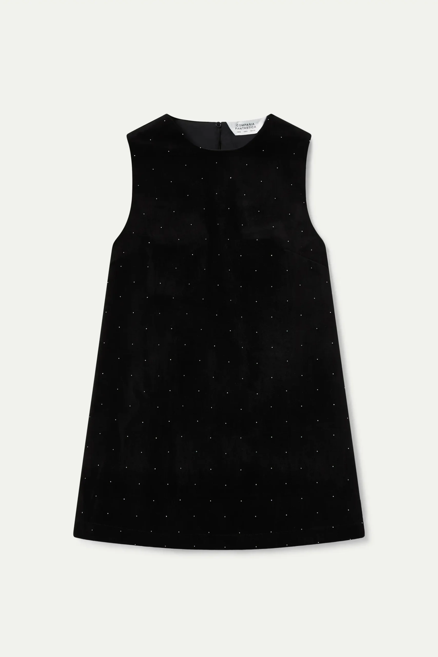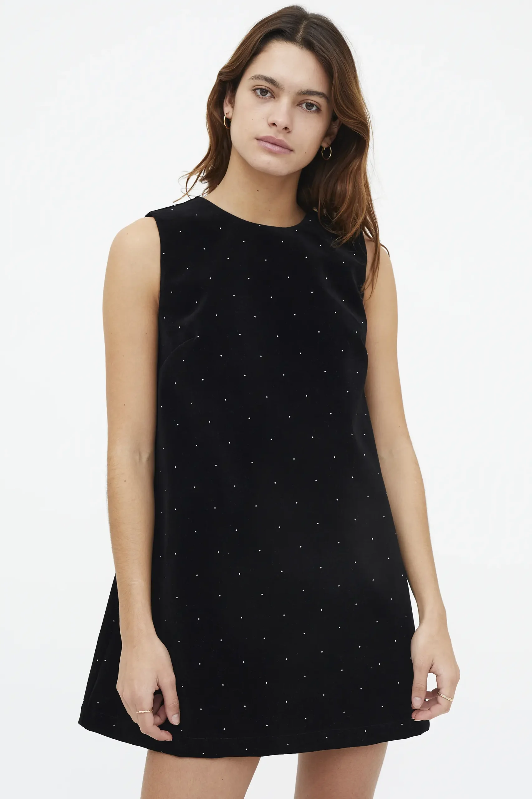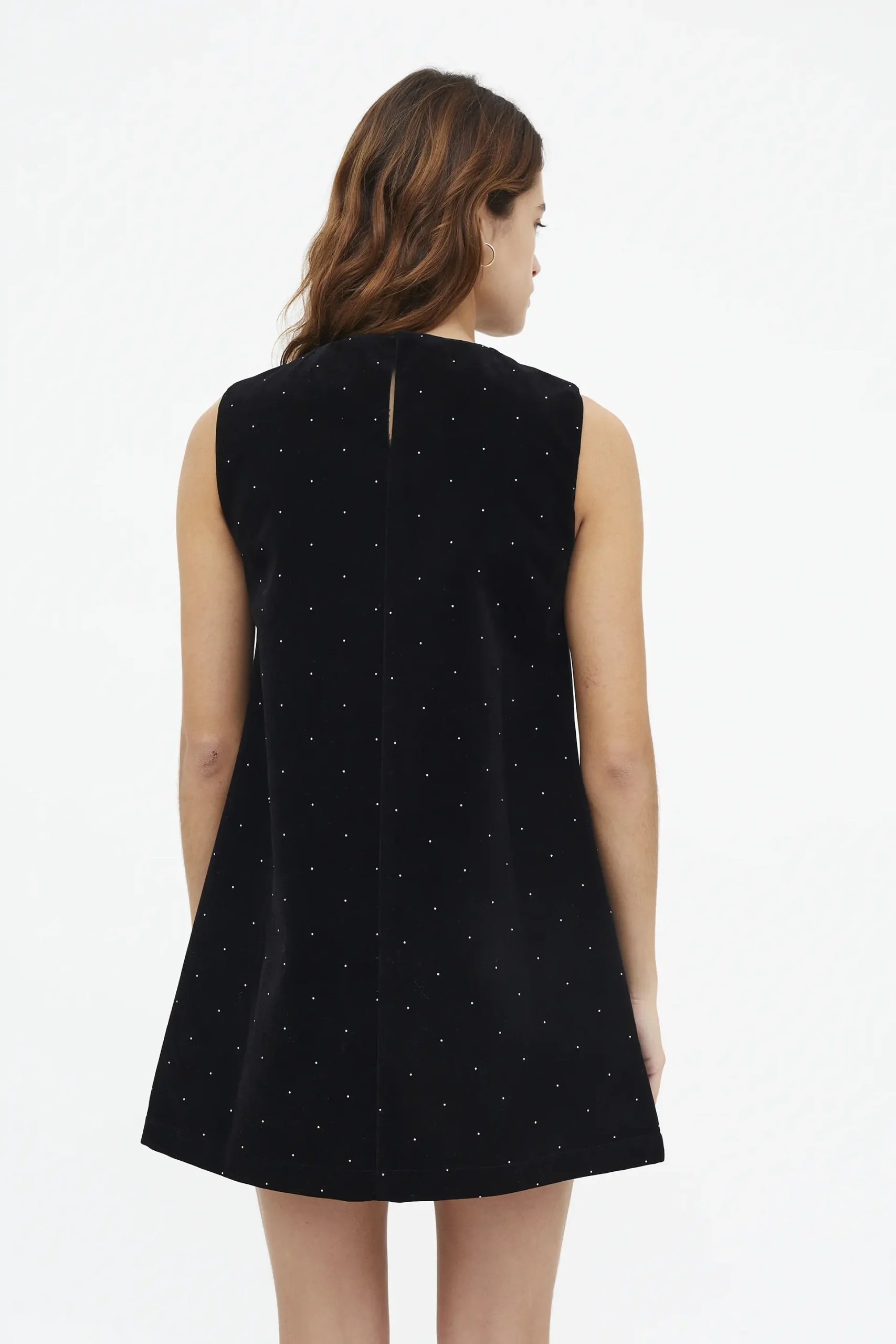 Vestido corto con terciopelo de color negro. Cuello redondo y manga corta. Modelo con apliques en plateado. La modelo mide 177 cm y lleva la talla S.