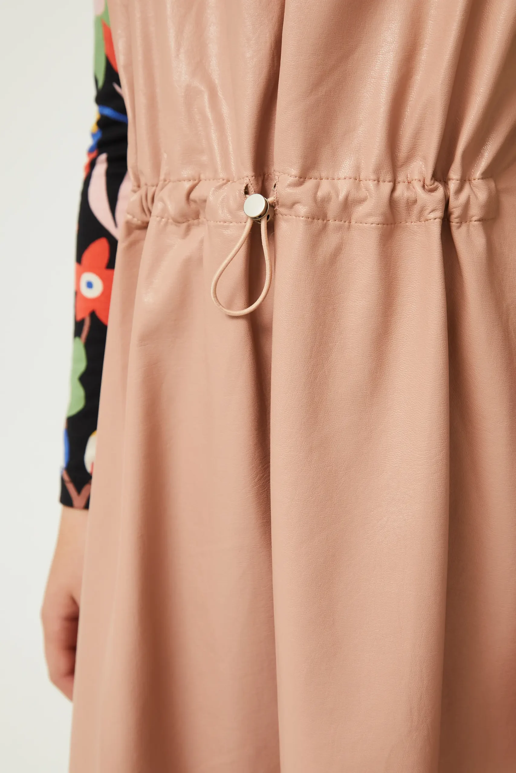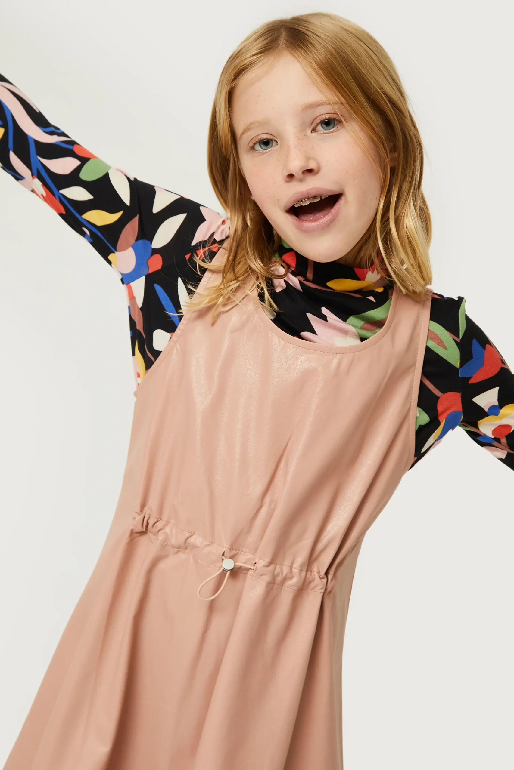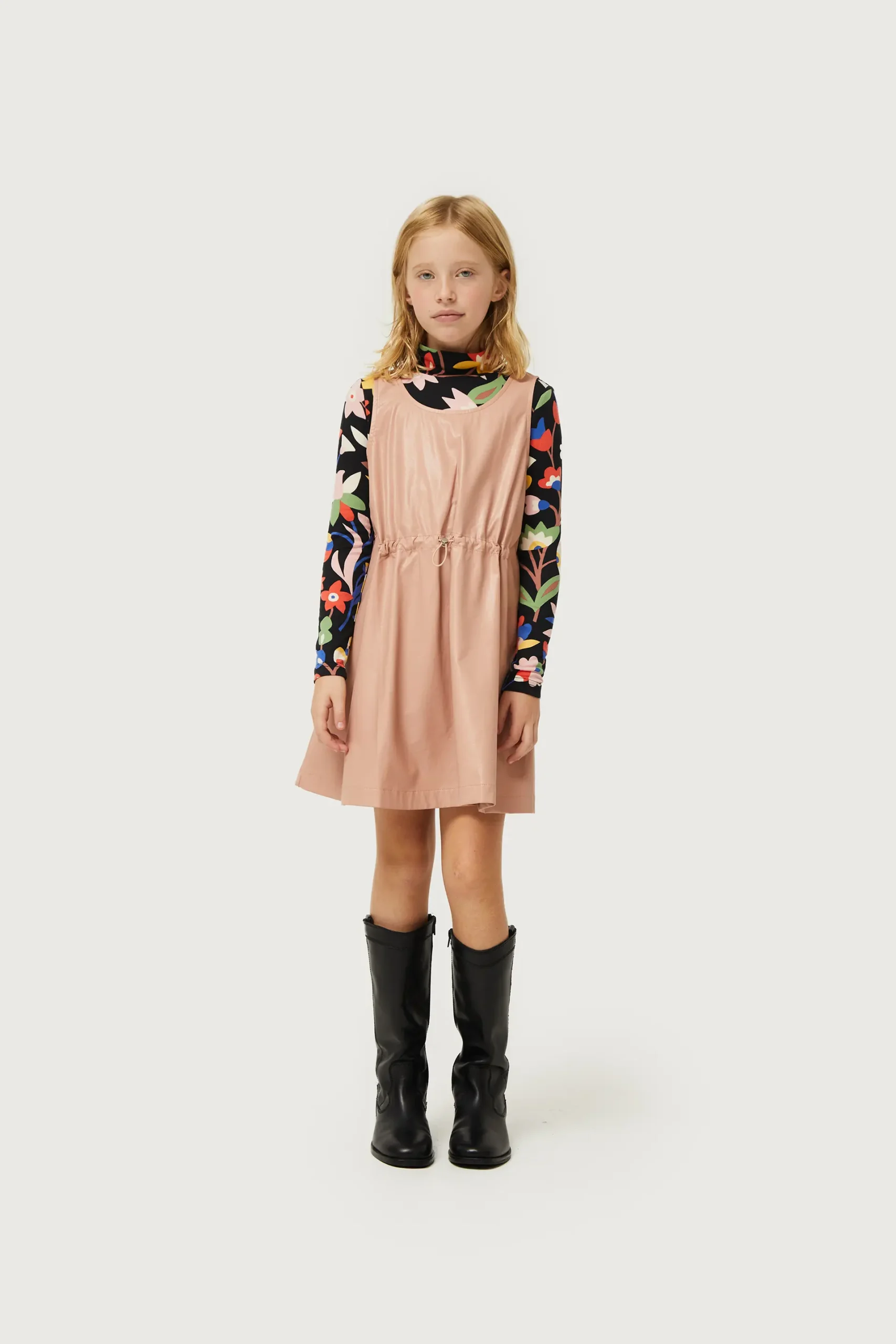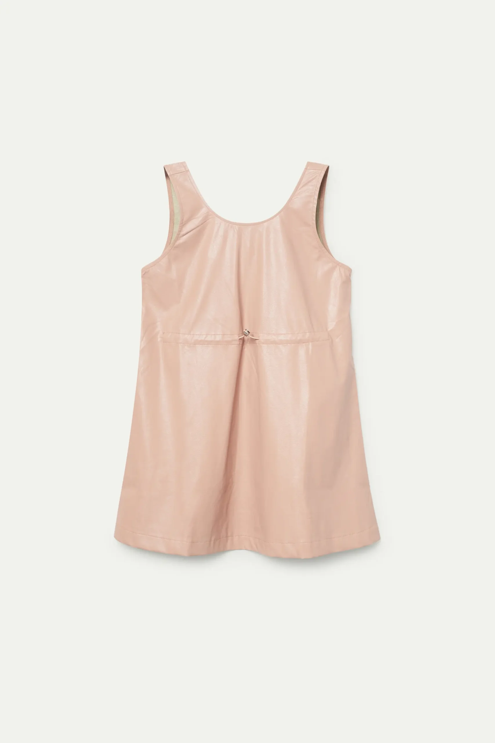 Vestido corto de niña de piel sintética en color rosa. Con cuello redondo y sin mangas. Modelo con cordón ajustable en la cintura. La modelo mide 137 cm y lleva la talla 8.