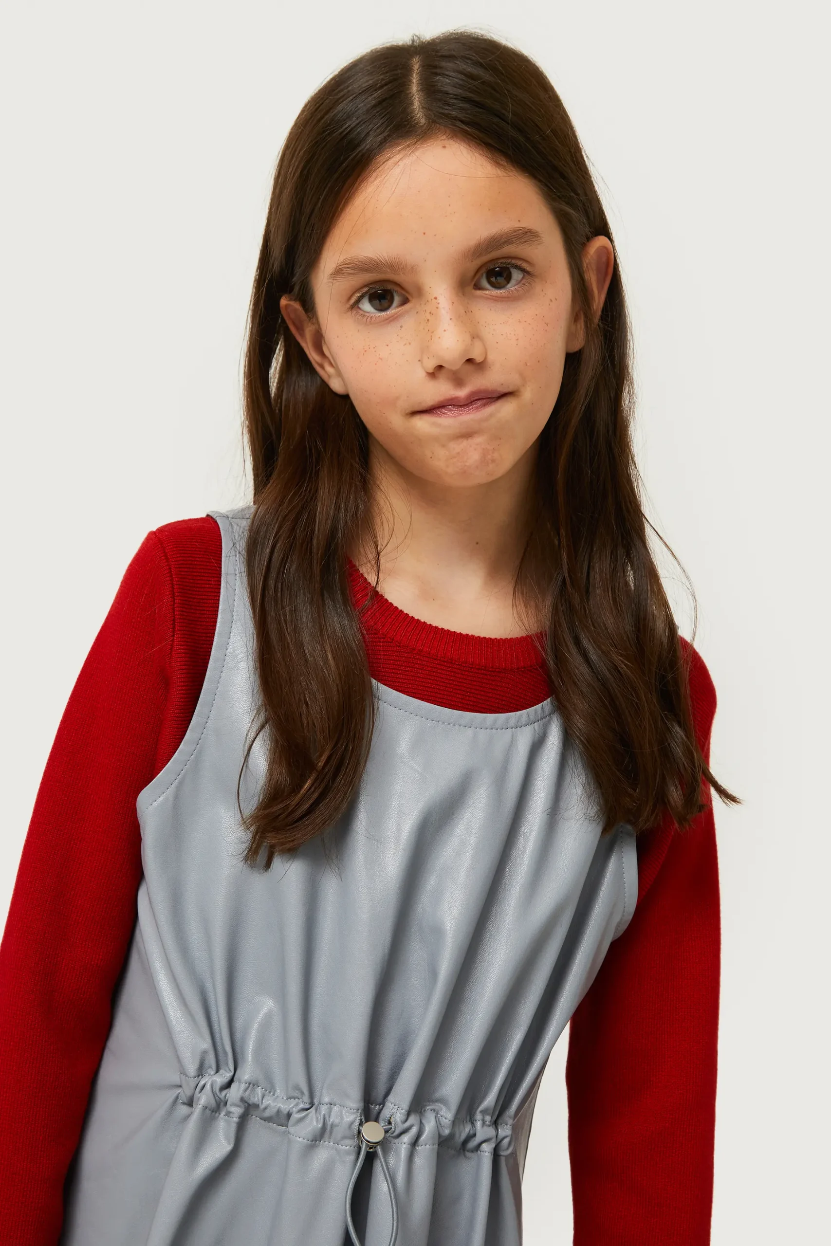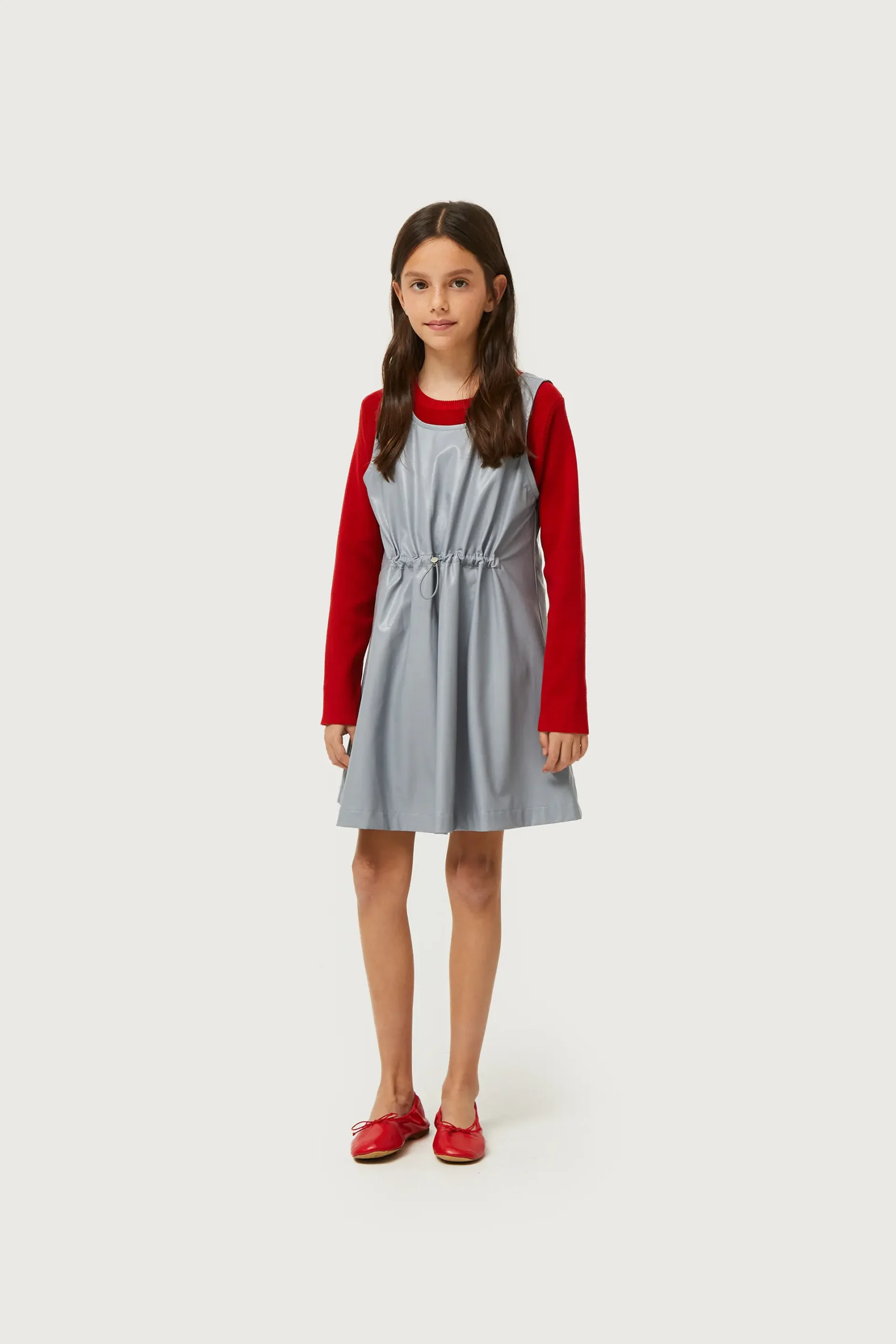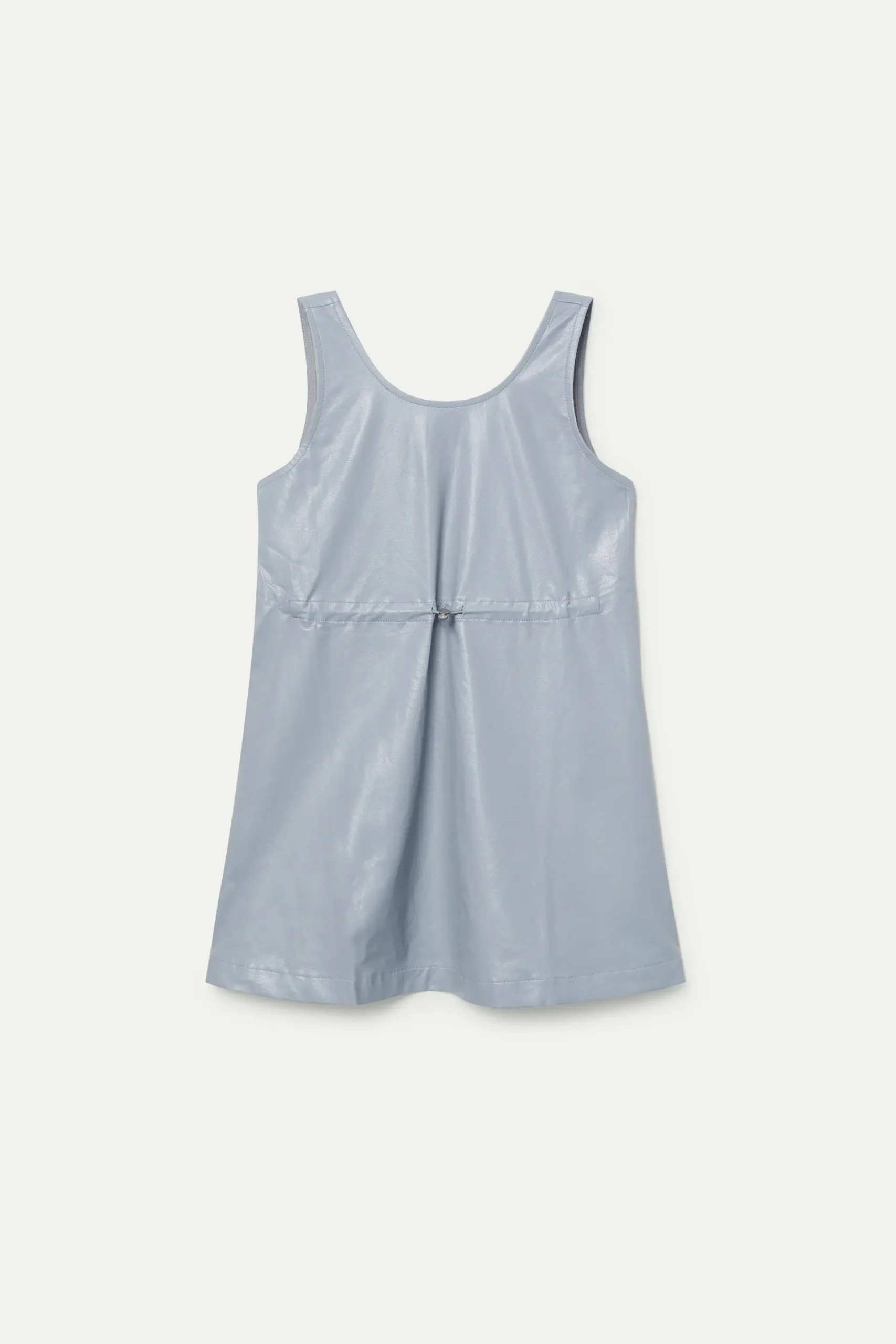 Vestido corto de niña de piel sintética en color gris. Con cuello redondo y sin mangas. Modelo con cordón ajustable en la cintura. La modelo mide 134 cm y lleva la talla 8.