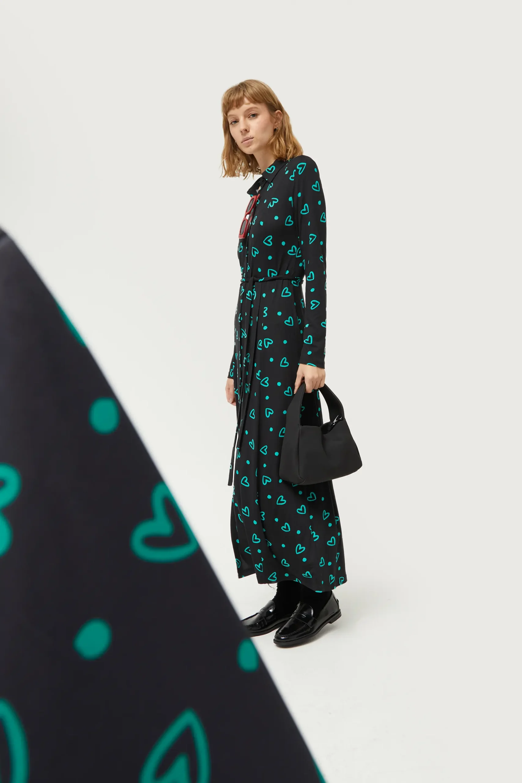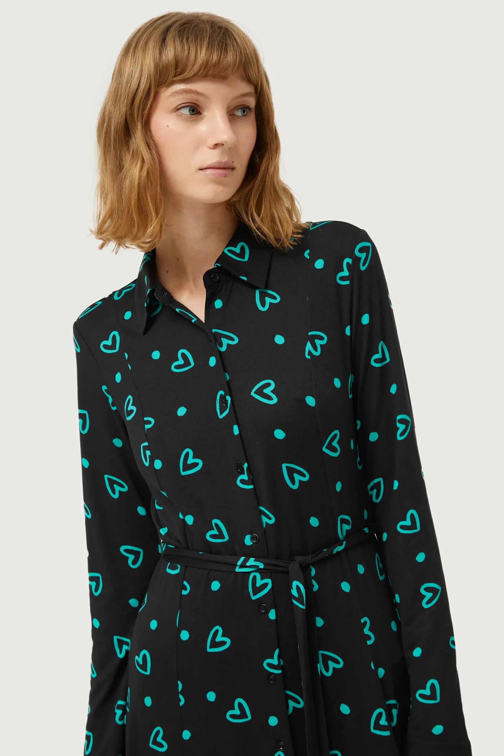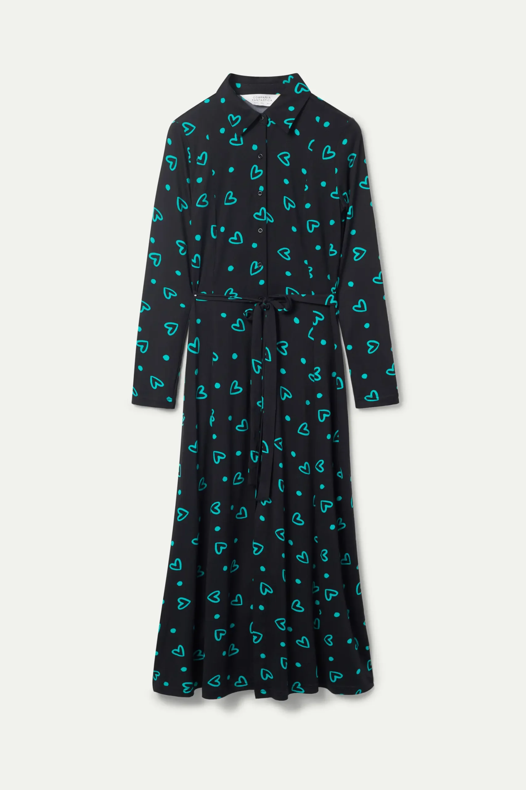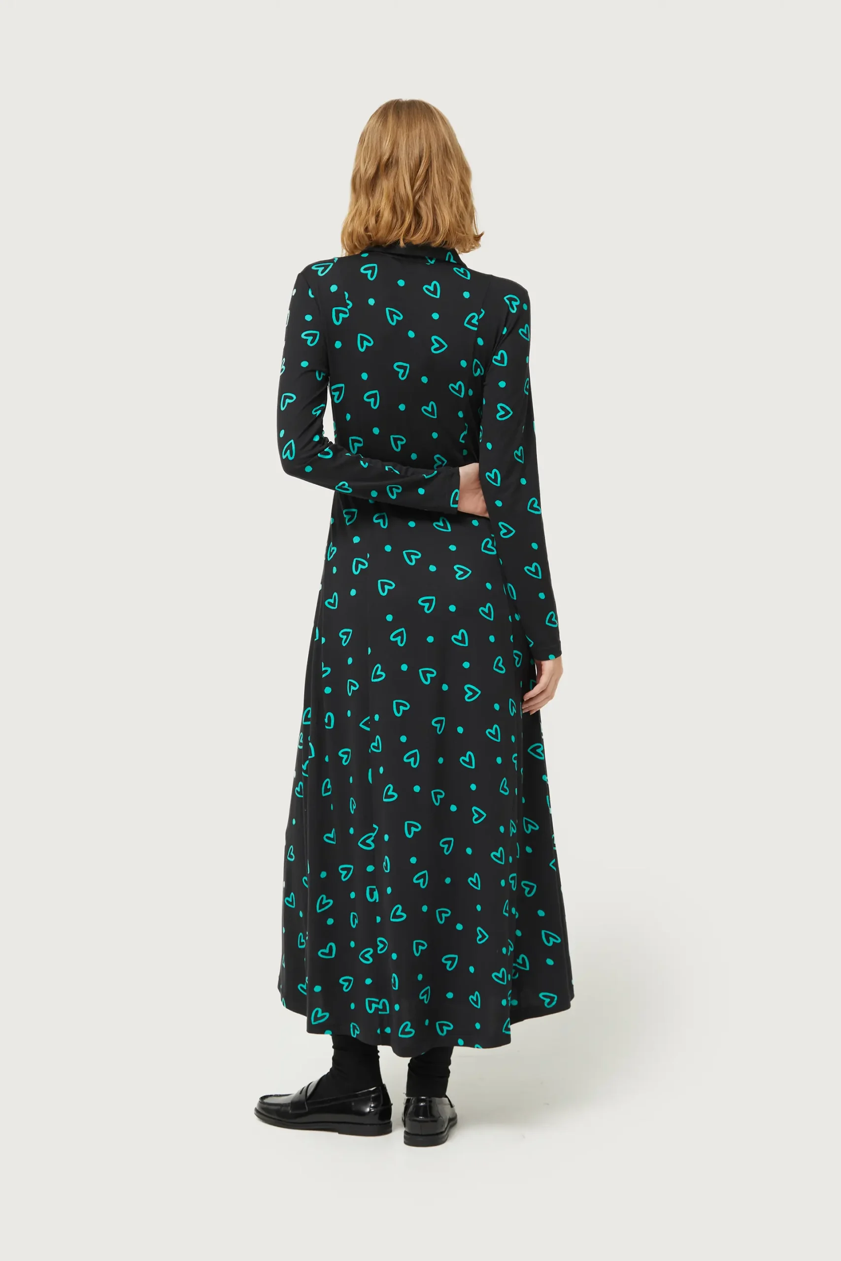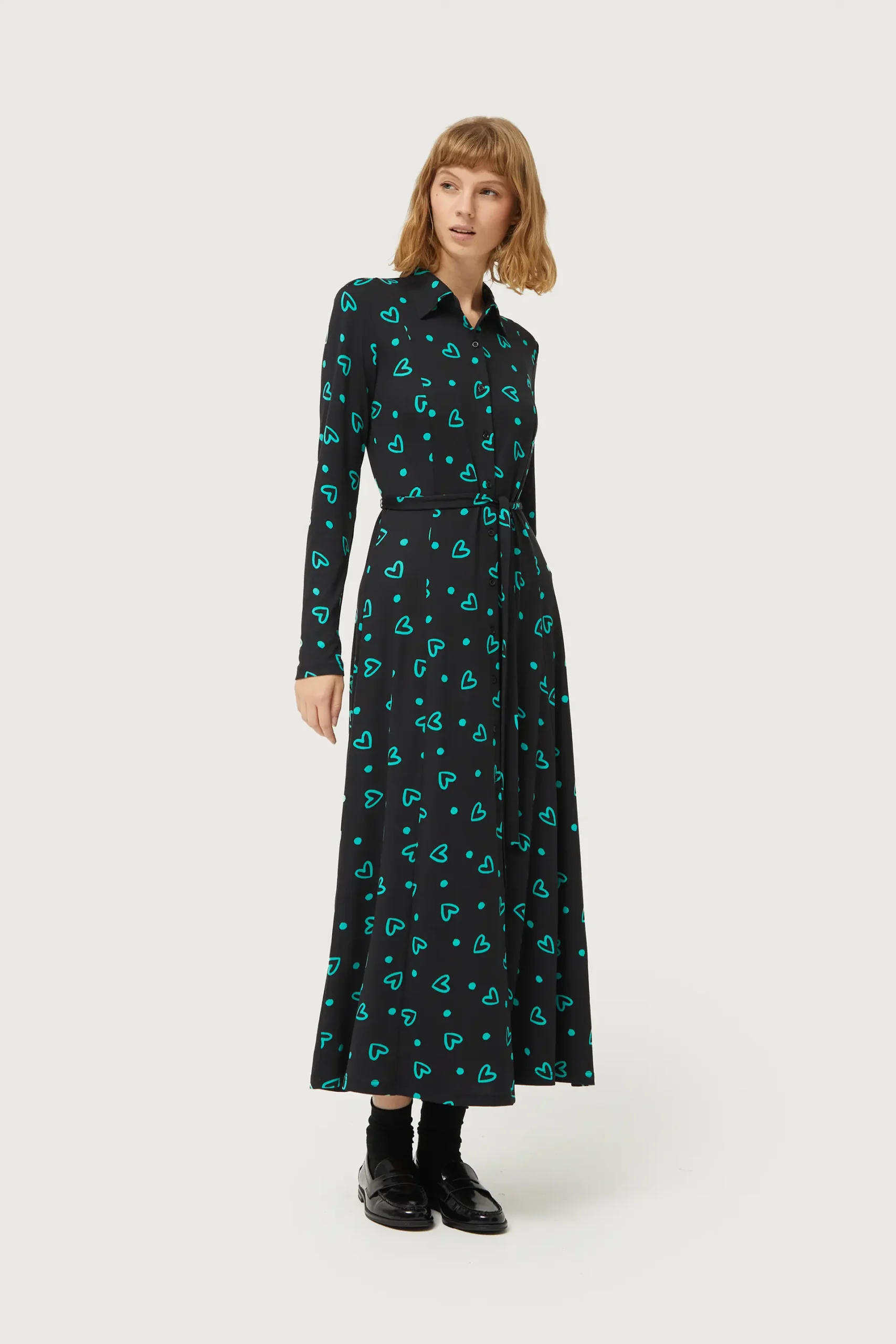 Vestido largo de punto de color negro con estampado de corazones verdes. Con cuello solapa y manga larga. Cierre frontal con botones y cinturón. La modelo mide 177 cm y lleva la talla S.
