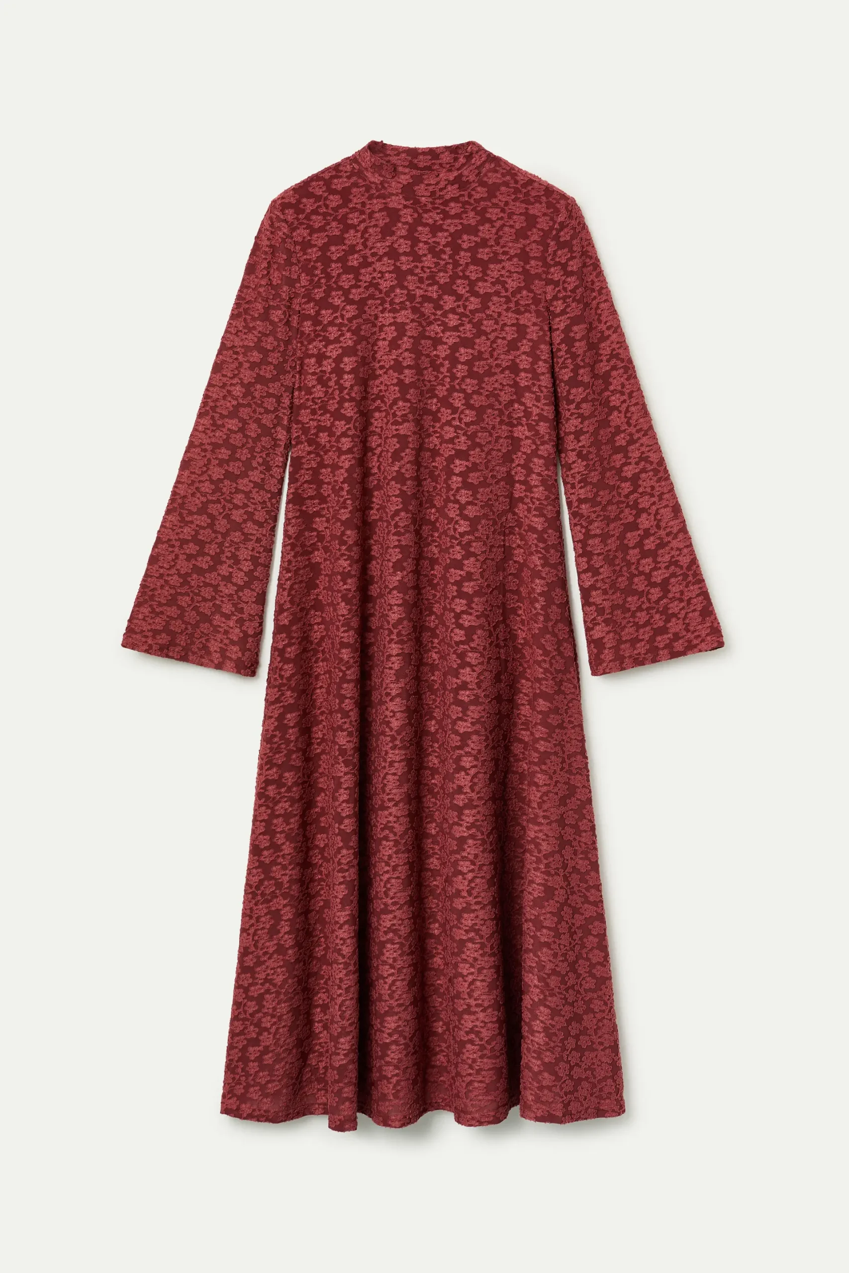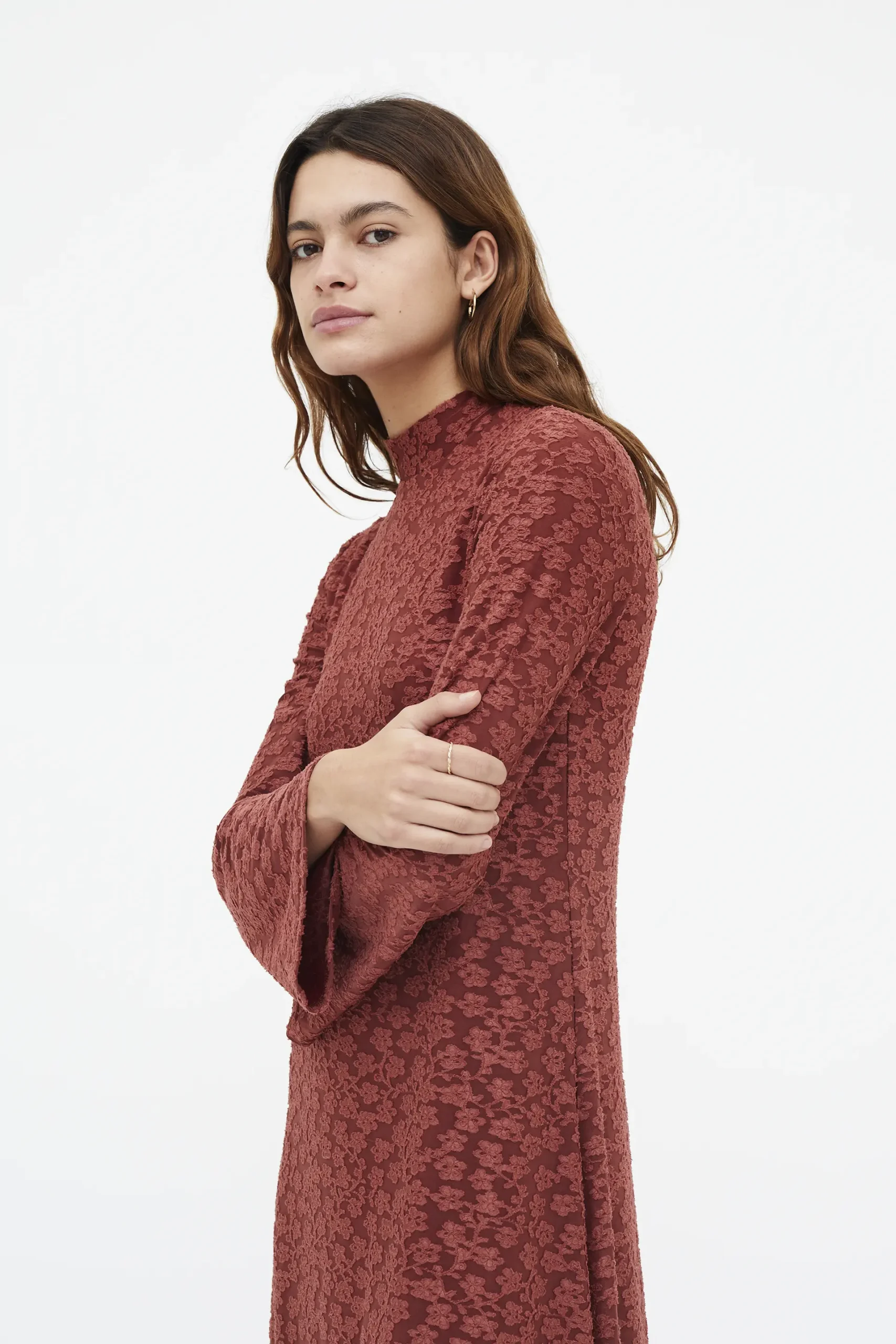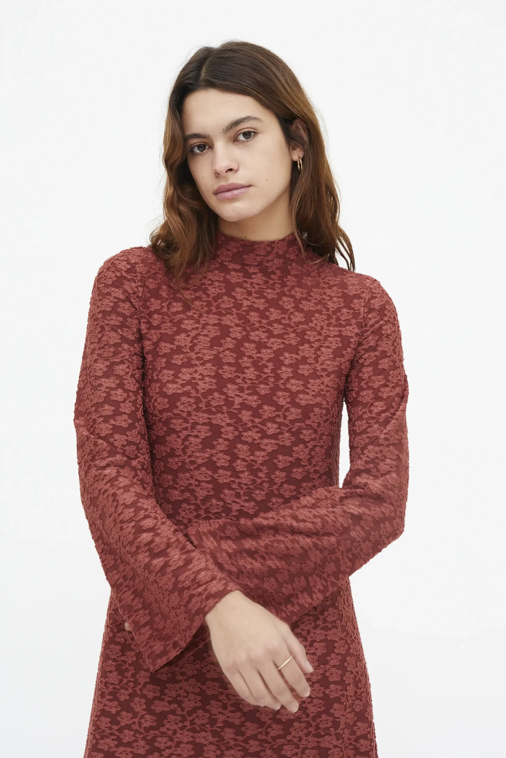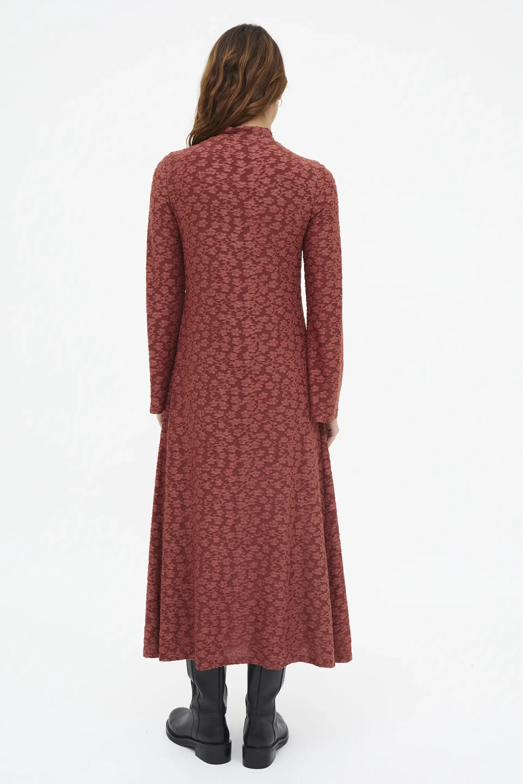 Vestido largo con tejido de punto y encaje de color marrón. Cuello mock y manga larga. Forro interior. La modelo mide 177 cm y lleva la talla S.