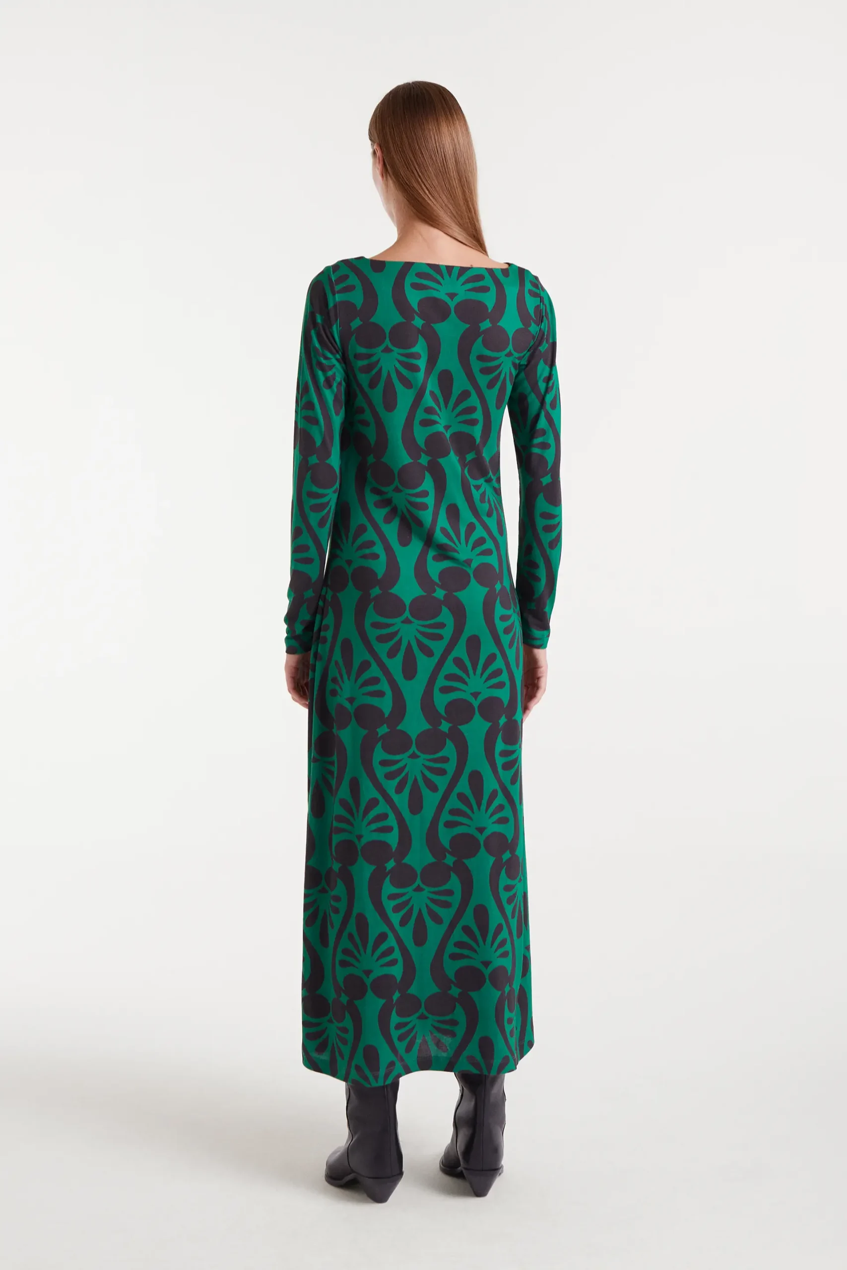 Vestido largo de color verde con estampado Baroque. Con cuello barco y manga larga. La modelo de mide 177 cm y lleva la talla S.