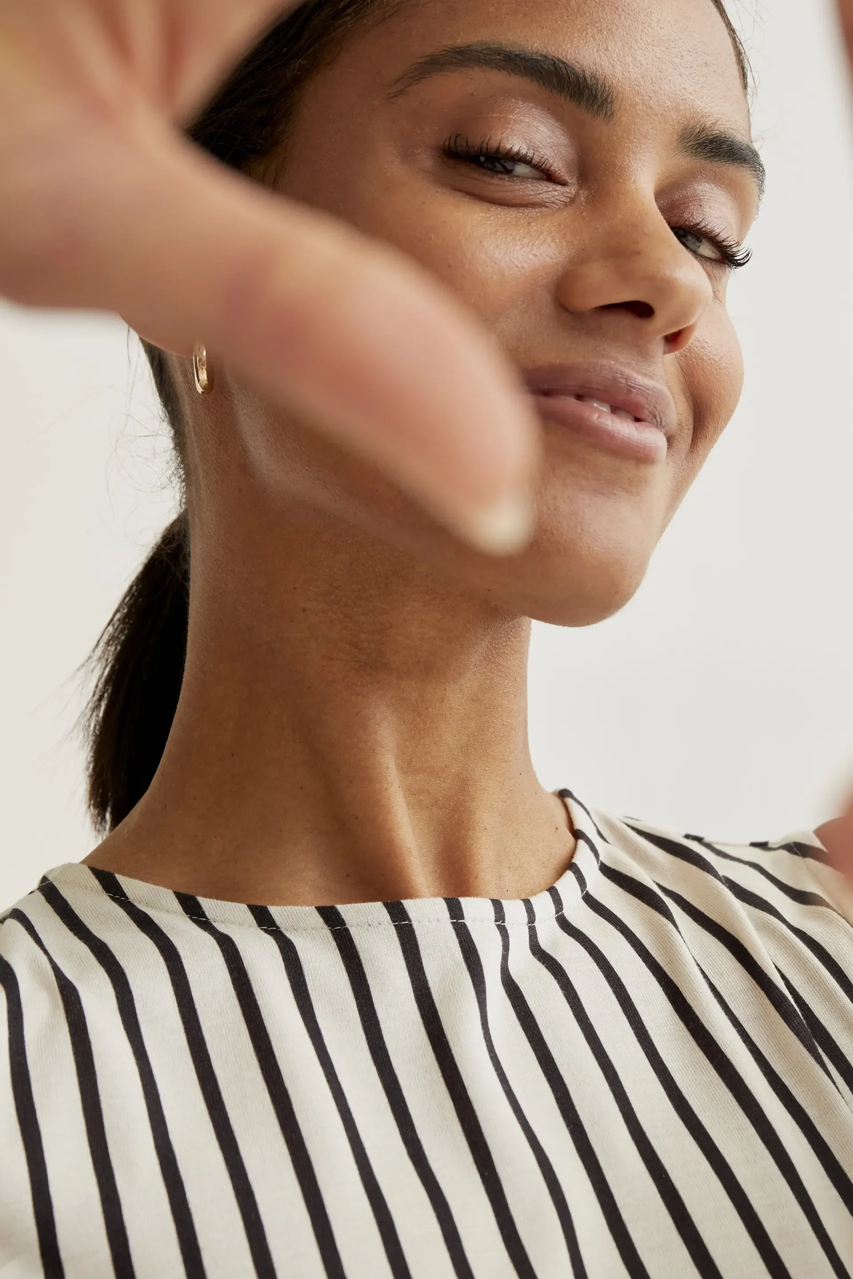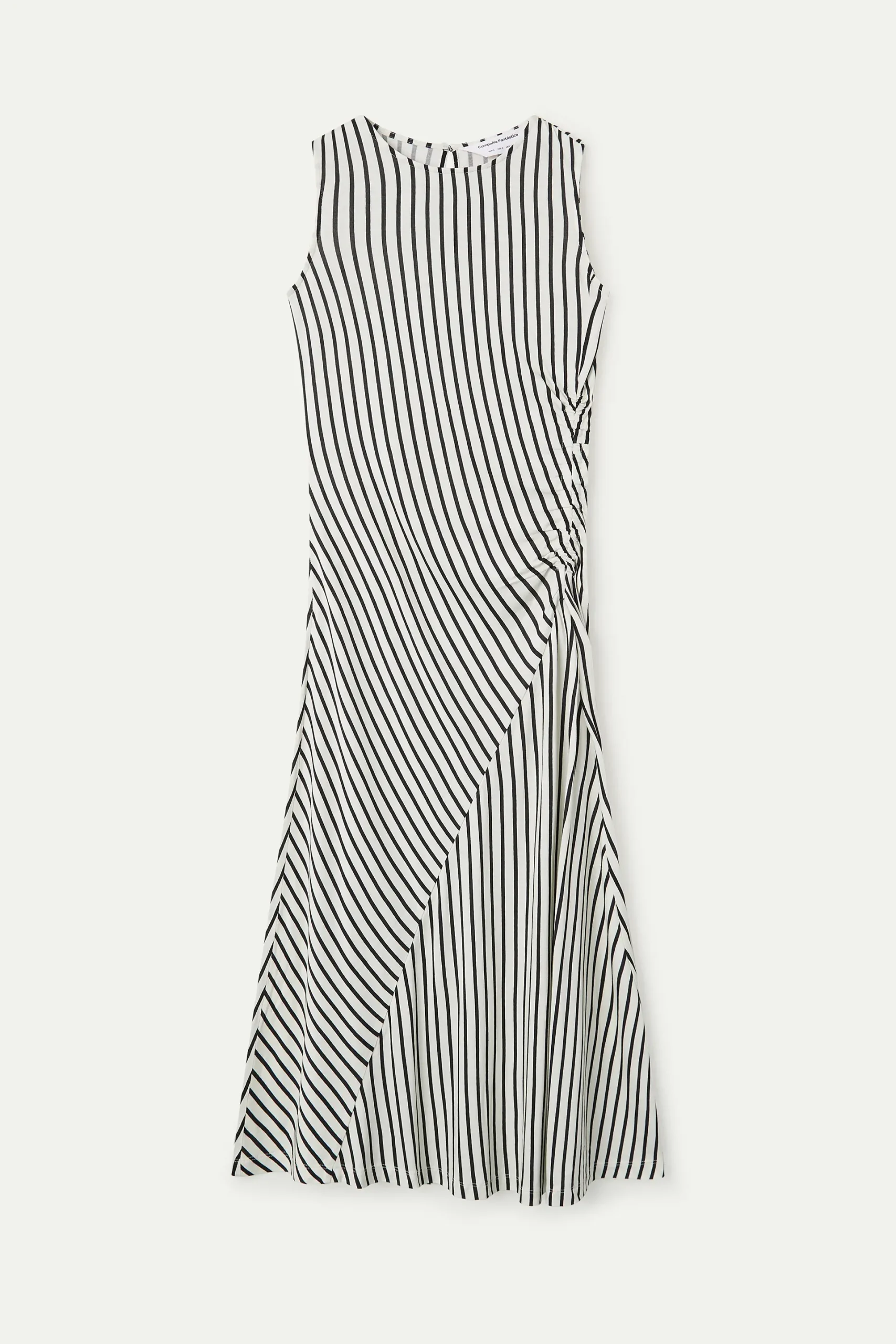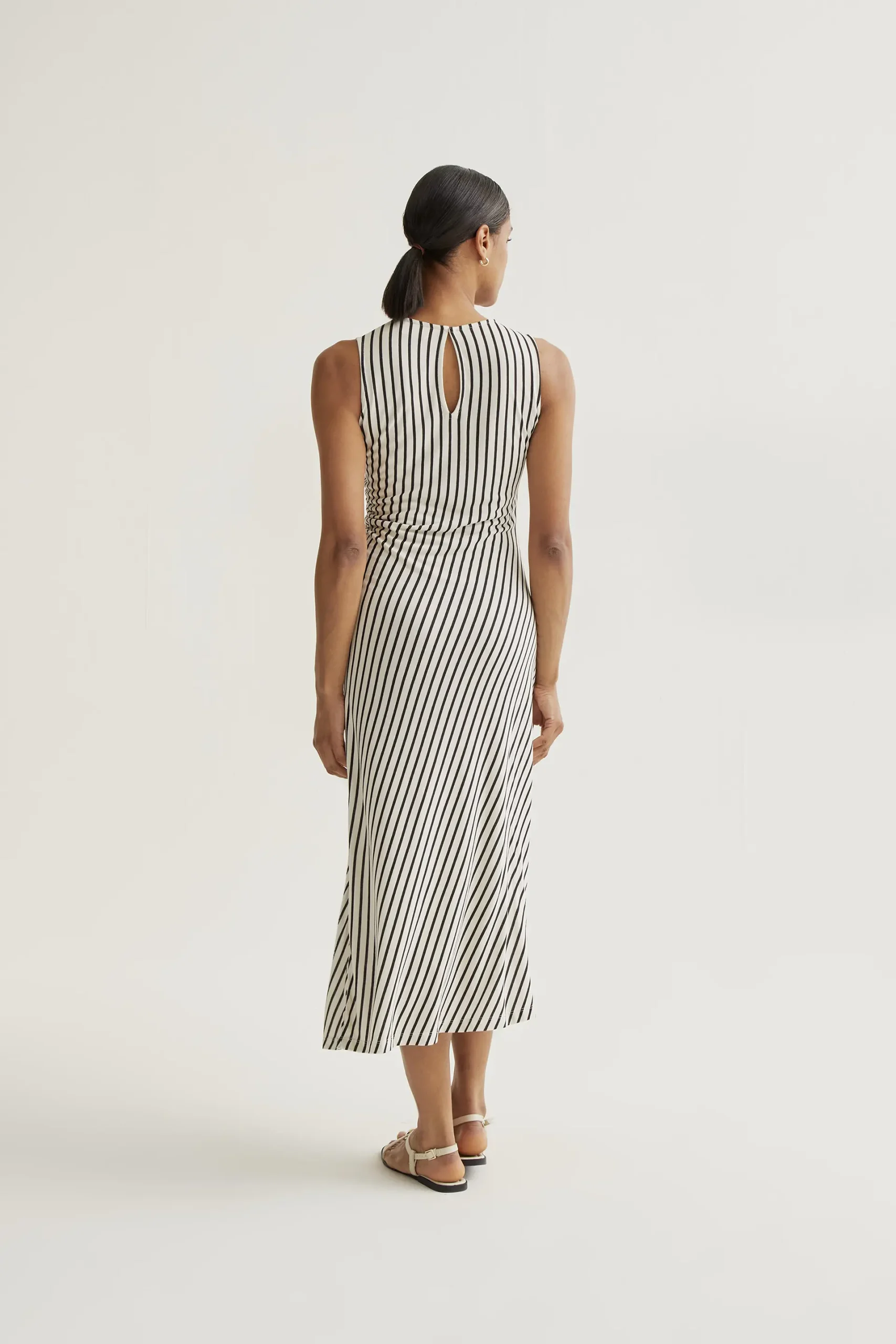 Vestido largo de tejido jersey viscoso con estampado de rayas de color negro. Cuello redondo y sin mangas. Cintura con detalle elástico. Corte amplio. La modelo mide 173 cm y lleva la talla S.
