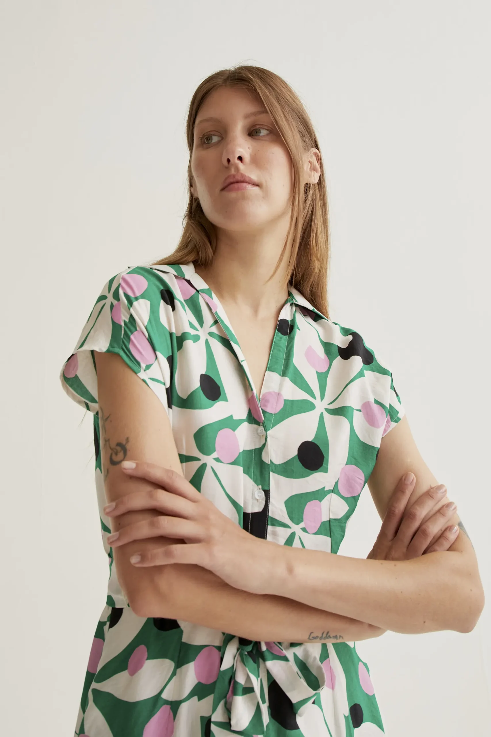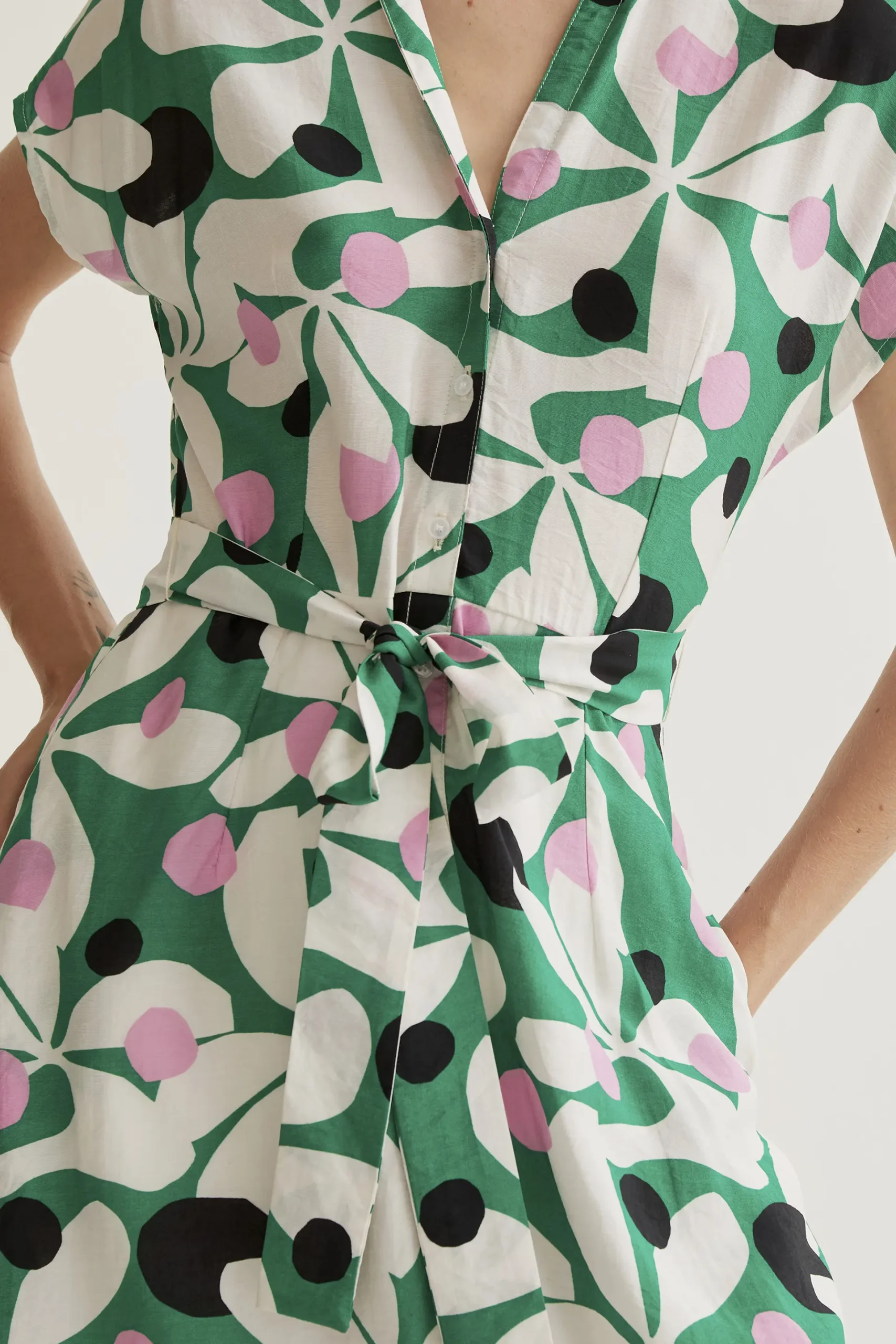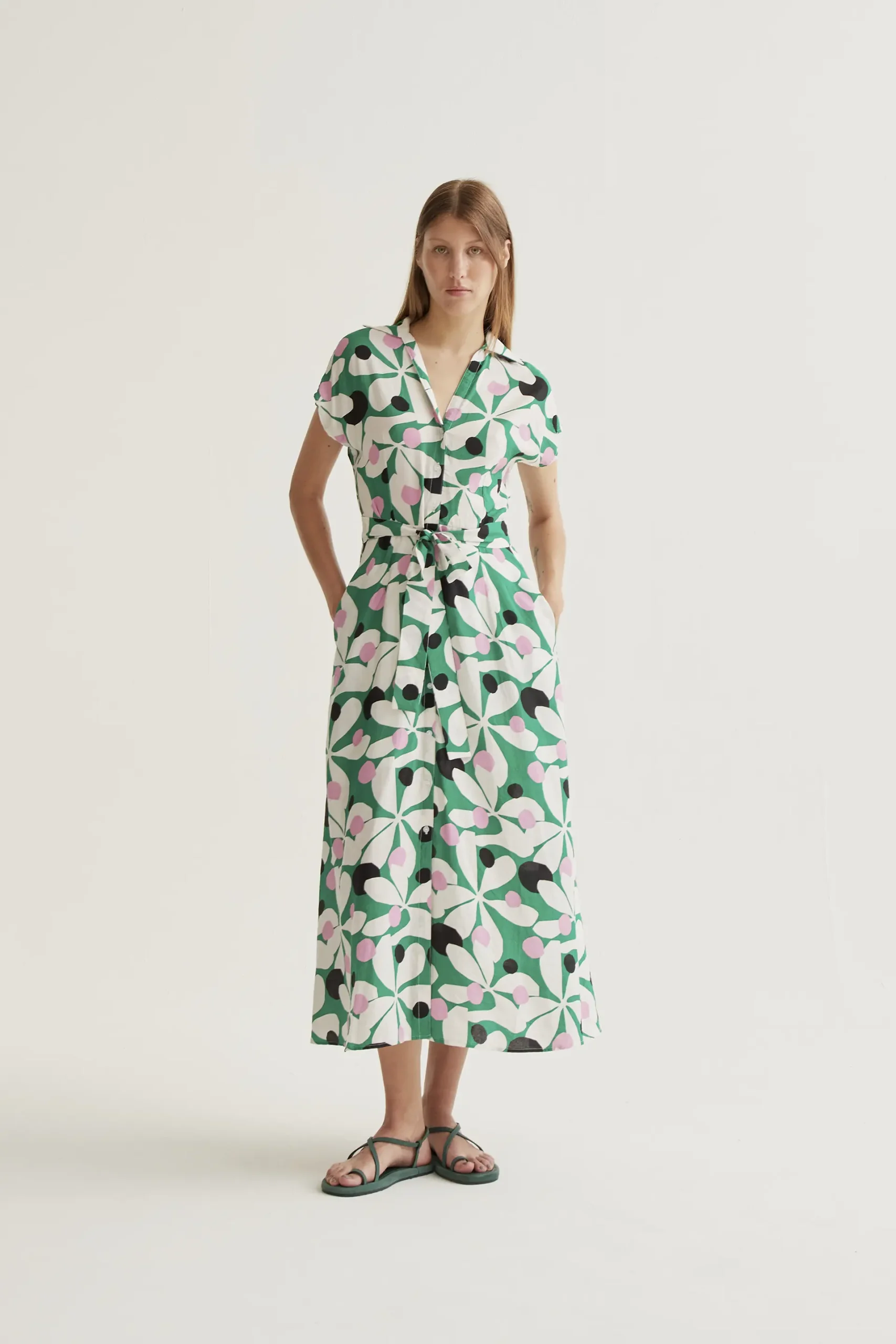 Vestido largo de tejido crepé ligero con estampado hosta. Cuello solapa y escote pico. Manga corta. Cierre frontal con botones blancos. Cintura lazada. Bolsillos laterales.Forro interior. La modelo mide 177 cm y lleva la talla S.
