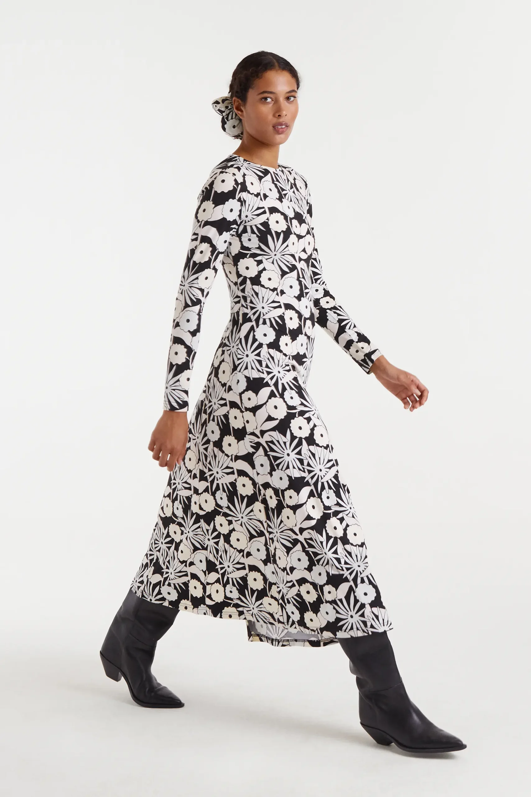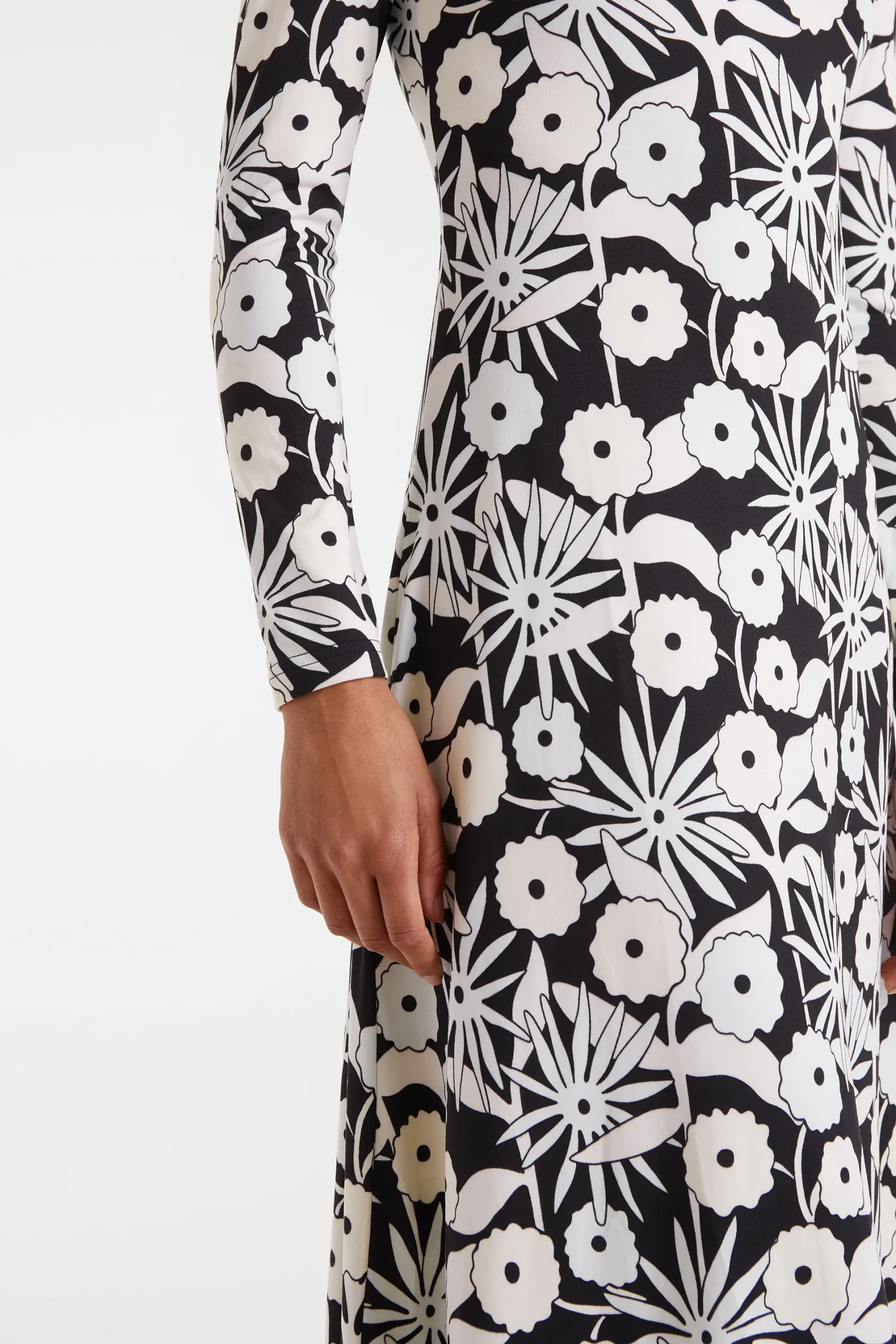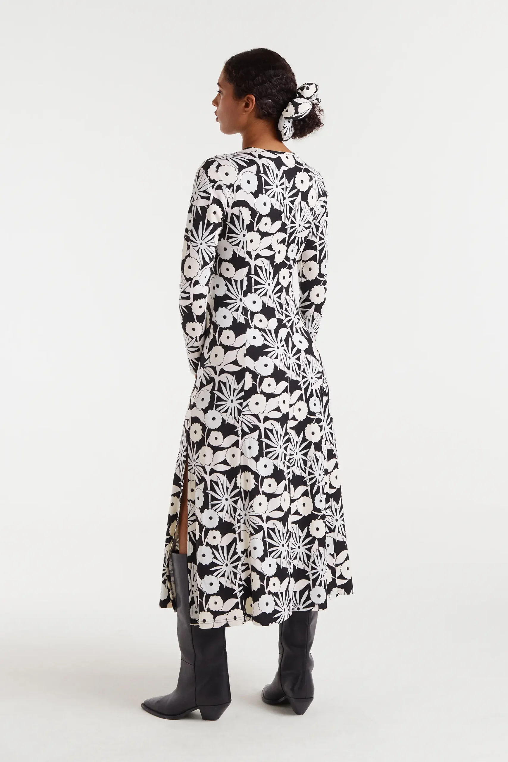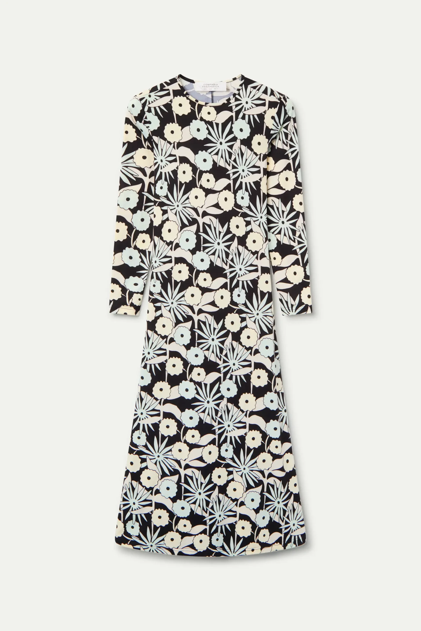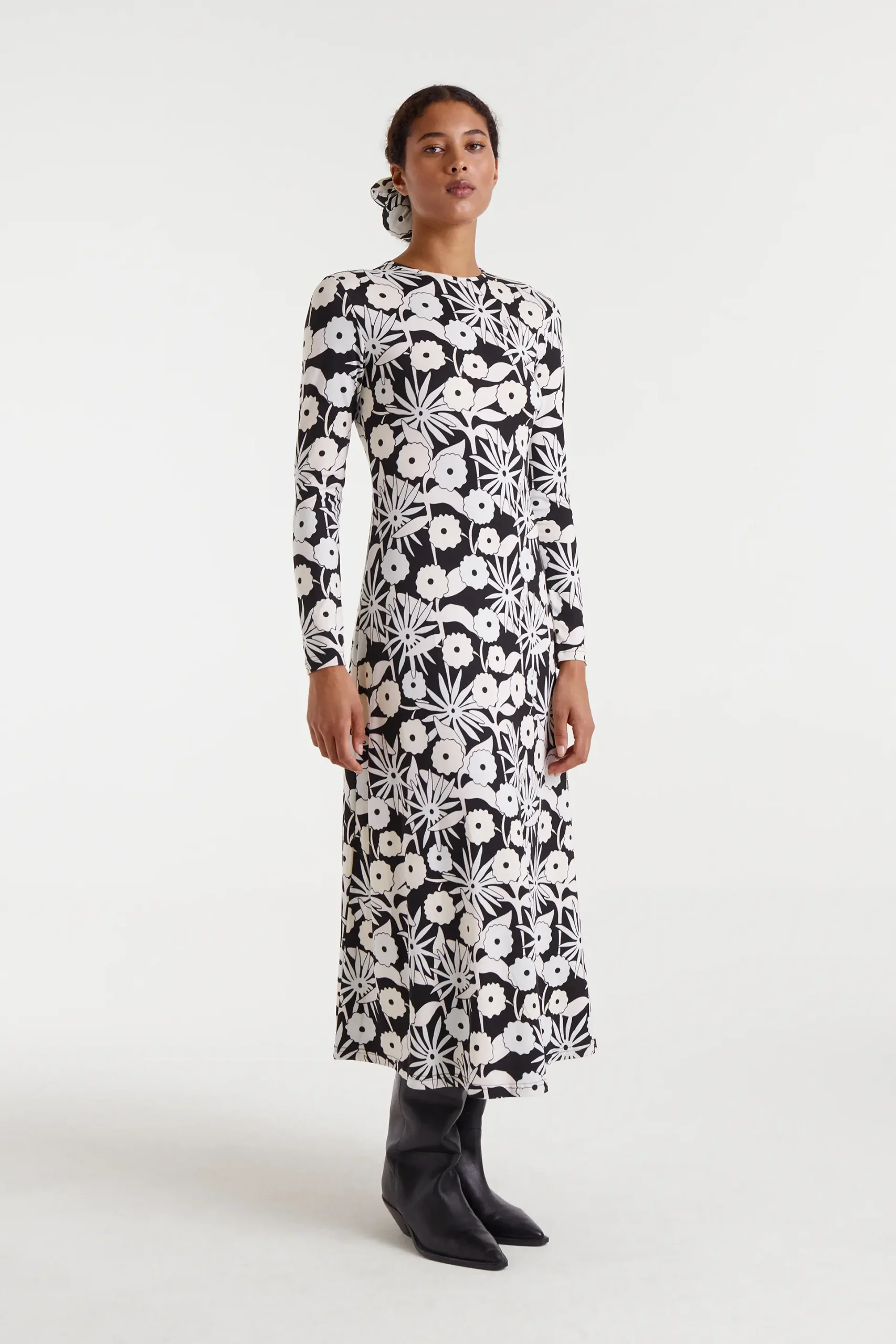 Vestido largo con tejido de punto con estampado Tofu. Con cuello barco y manga larga. La modelo mide 175 cm y lleva la talla S.
