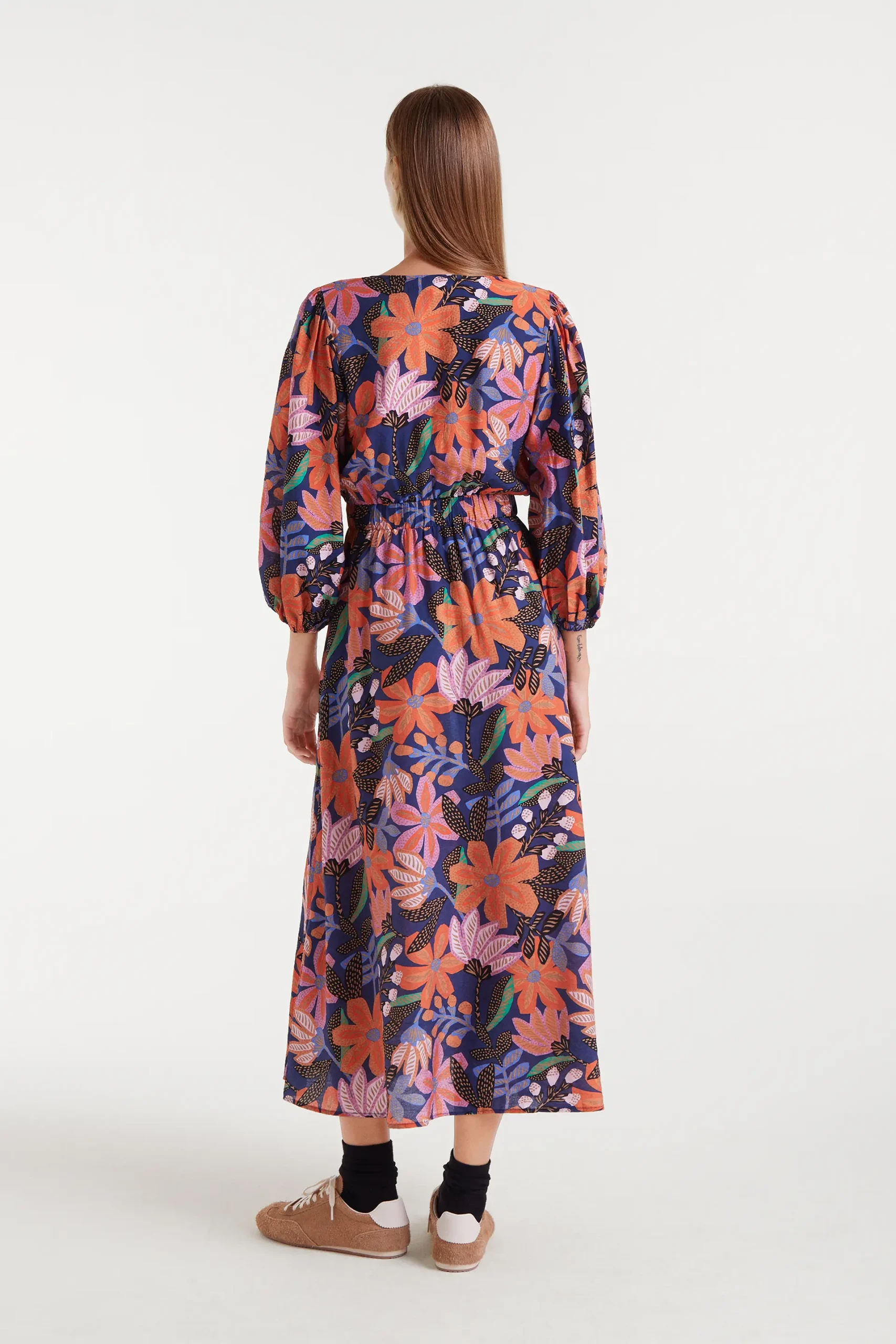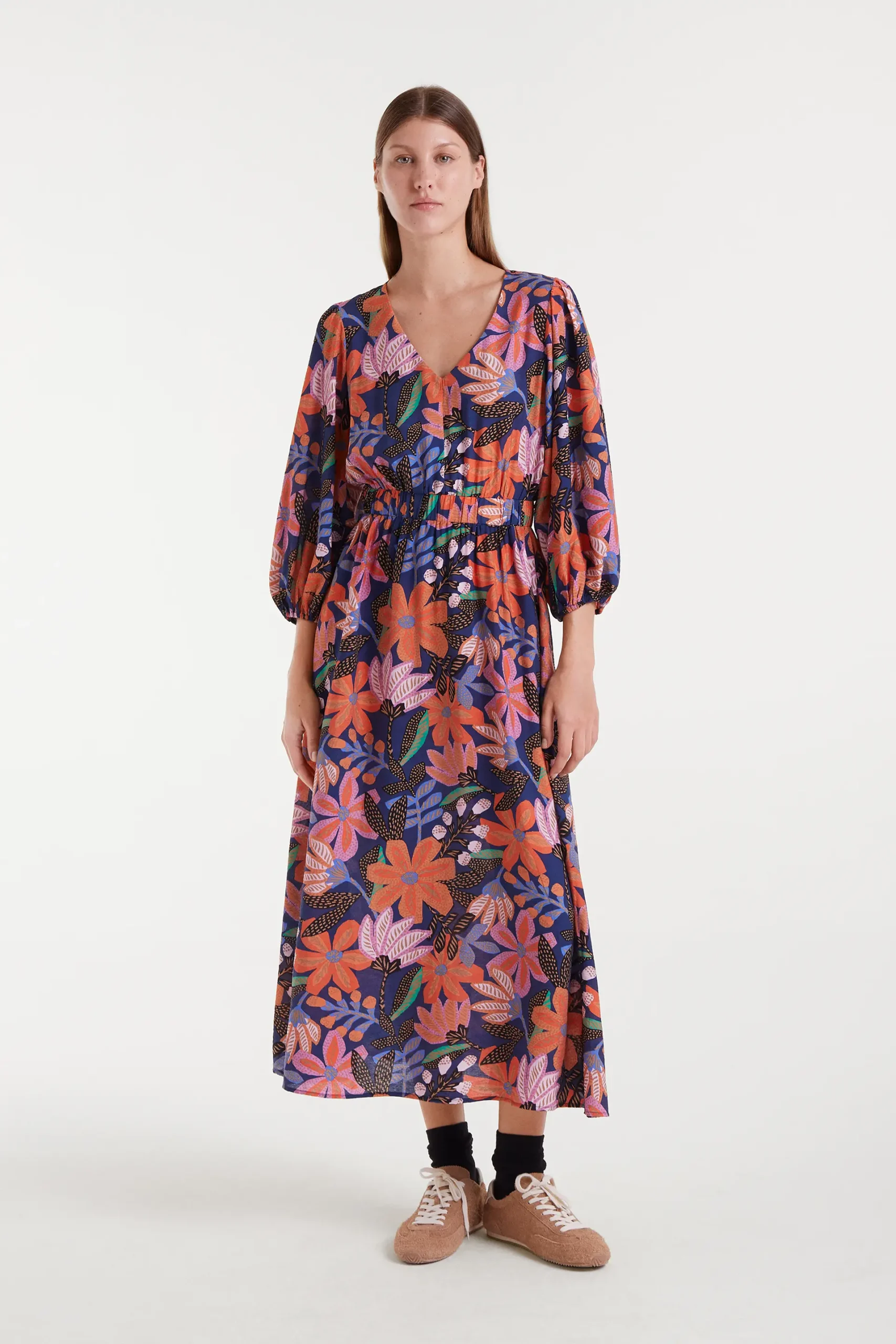 Vestido largo de tejido crepé ligero con estampado Tigerlily. Con cuello escote pico y manga francesa con abertura elástica. Bolsillos laterales. La modelo mide 177 cm y lleva la talla S.