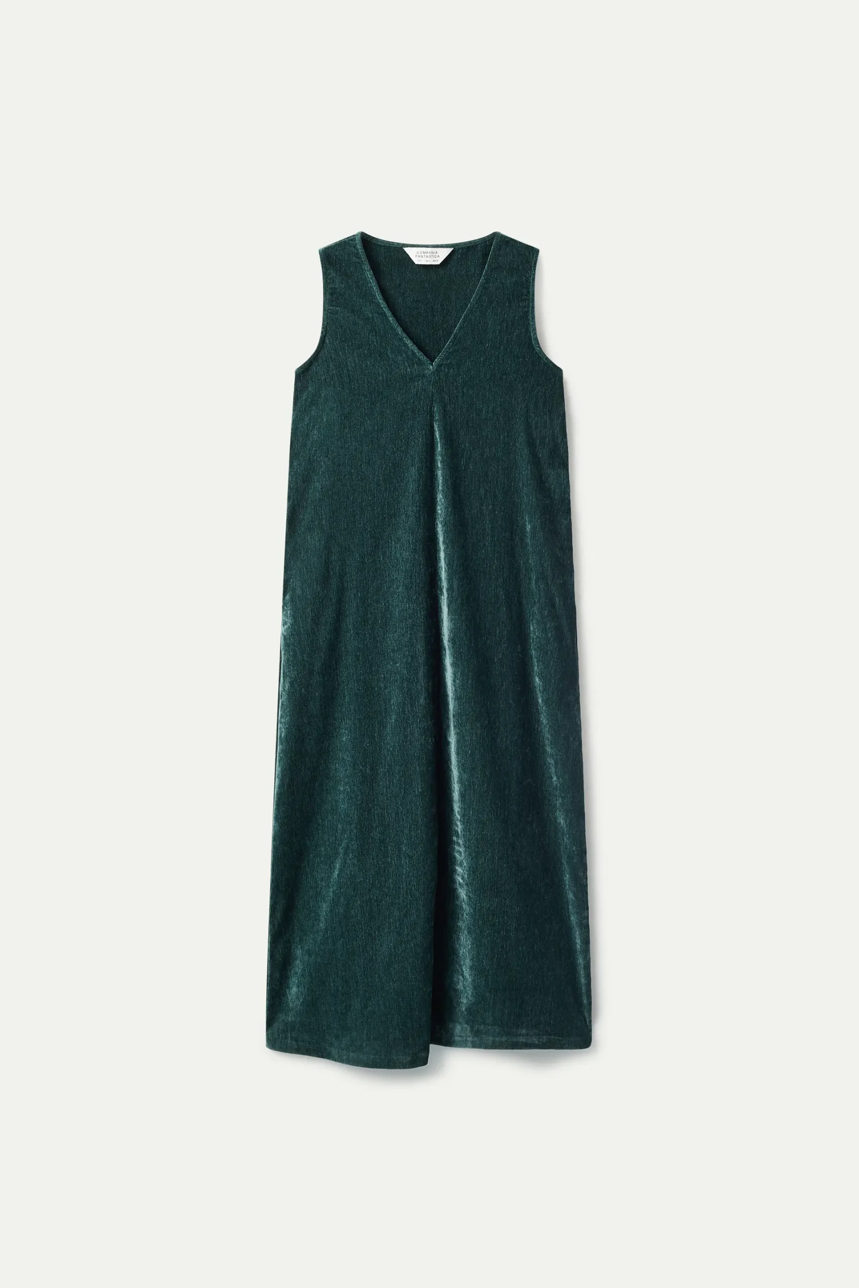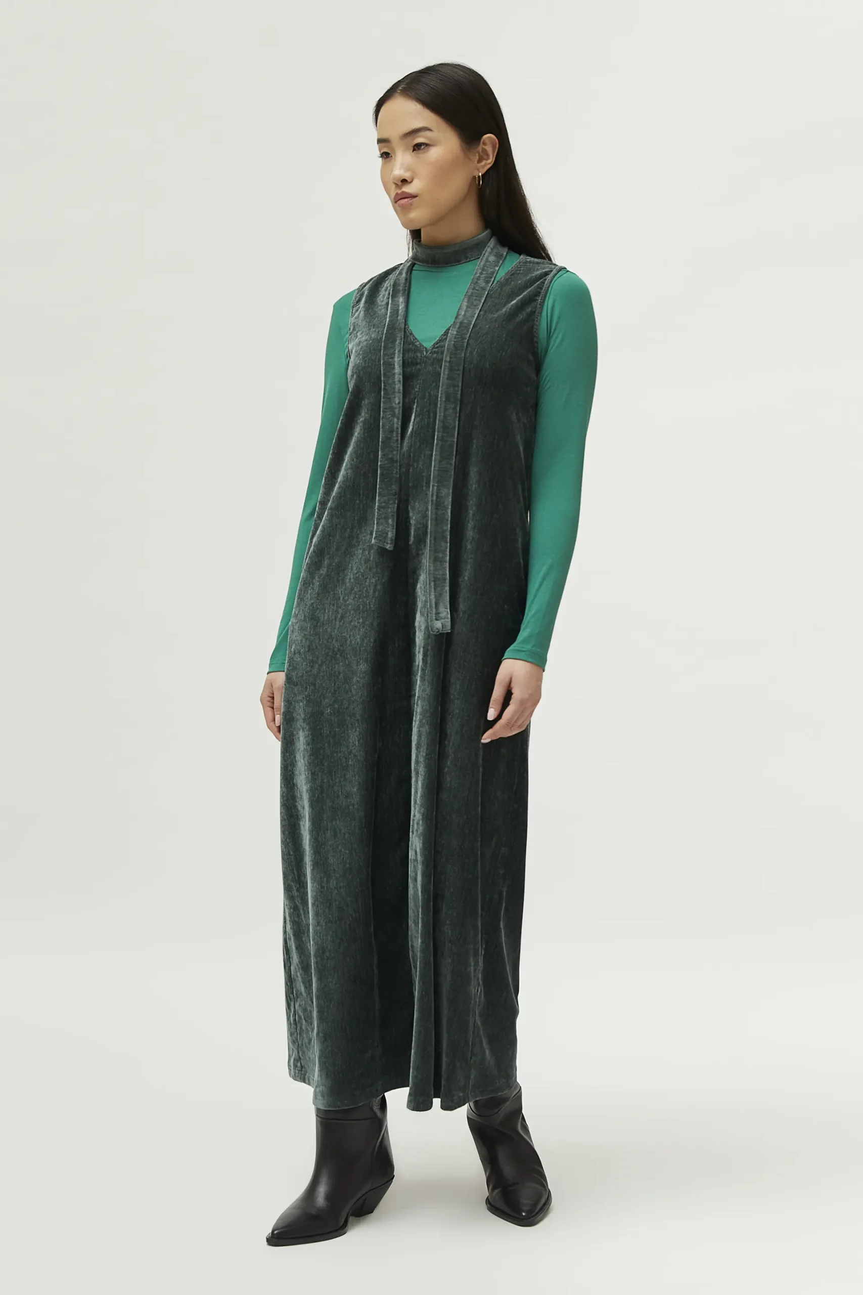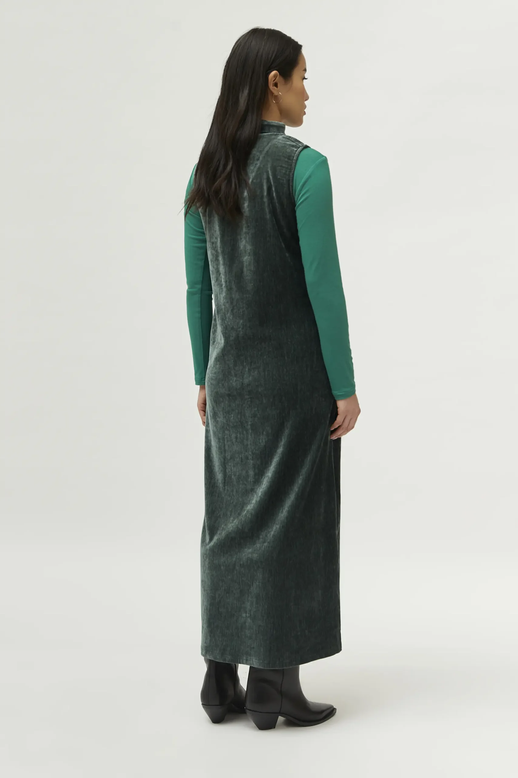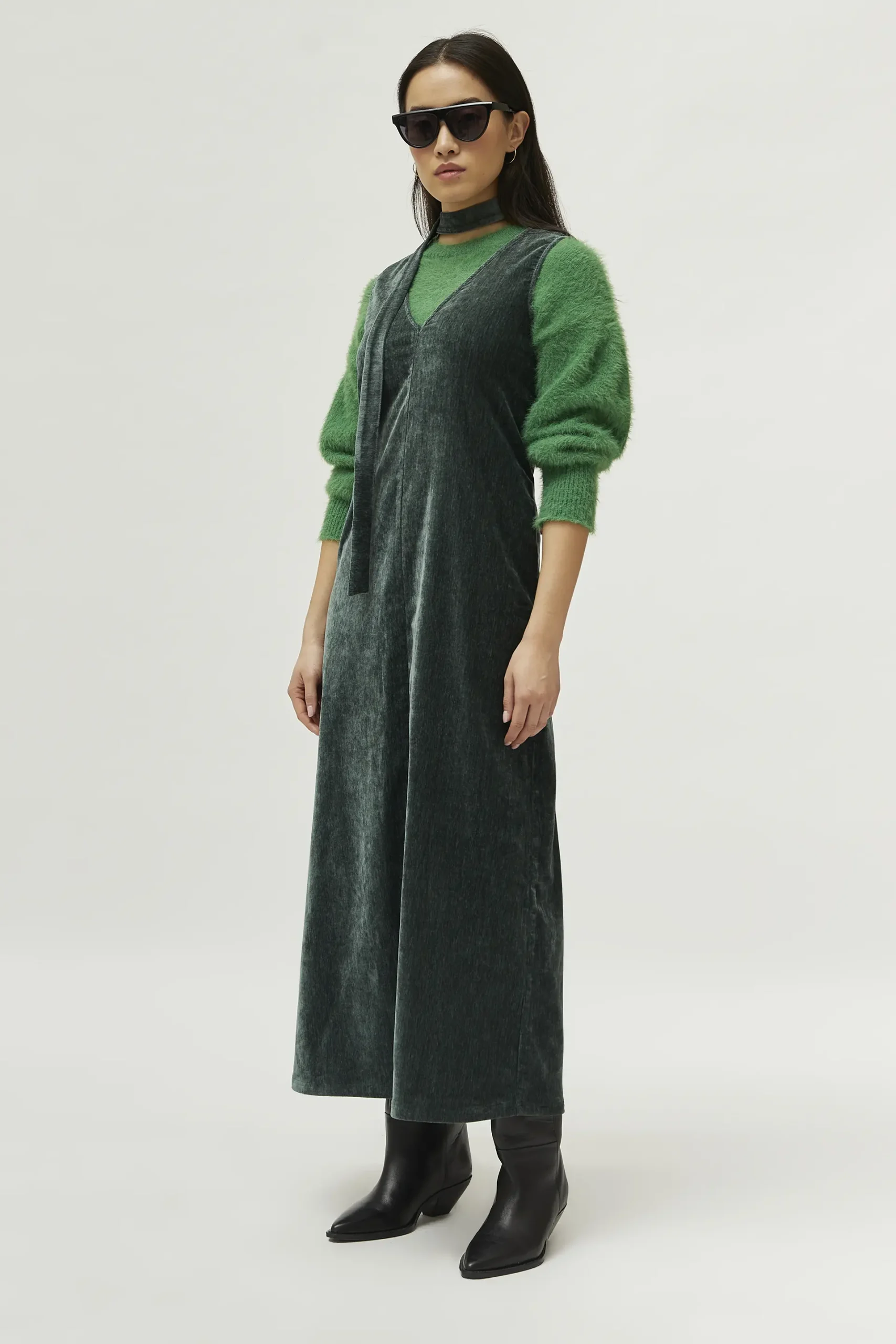 Vestido largo de chenilla de color verde. Con cuello pico y sin mangas. Cinturón en el mismo tejido. La modelo mide 171 cm y lleva la talla S.