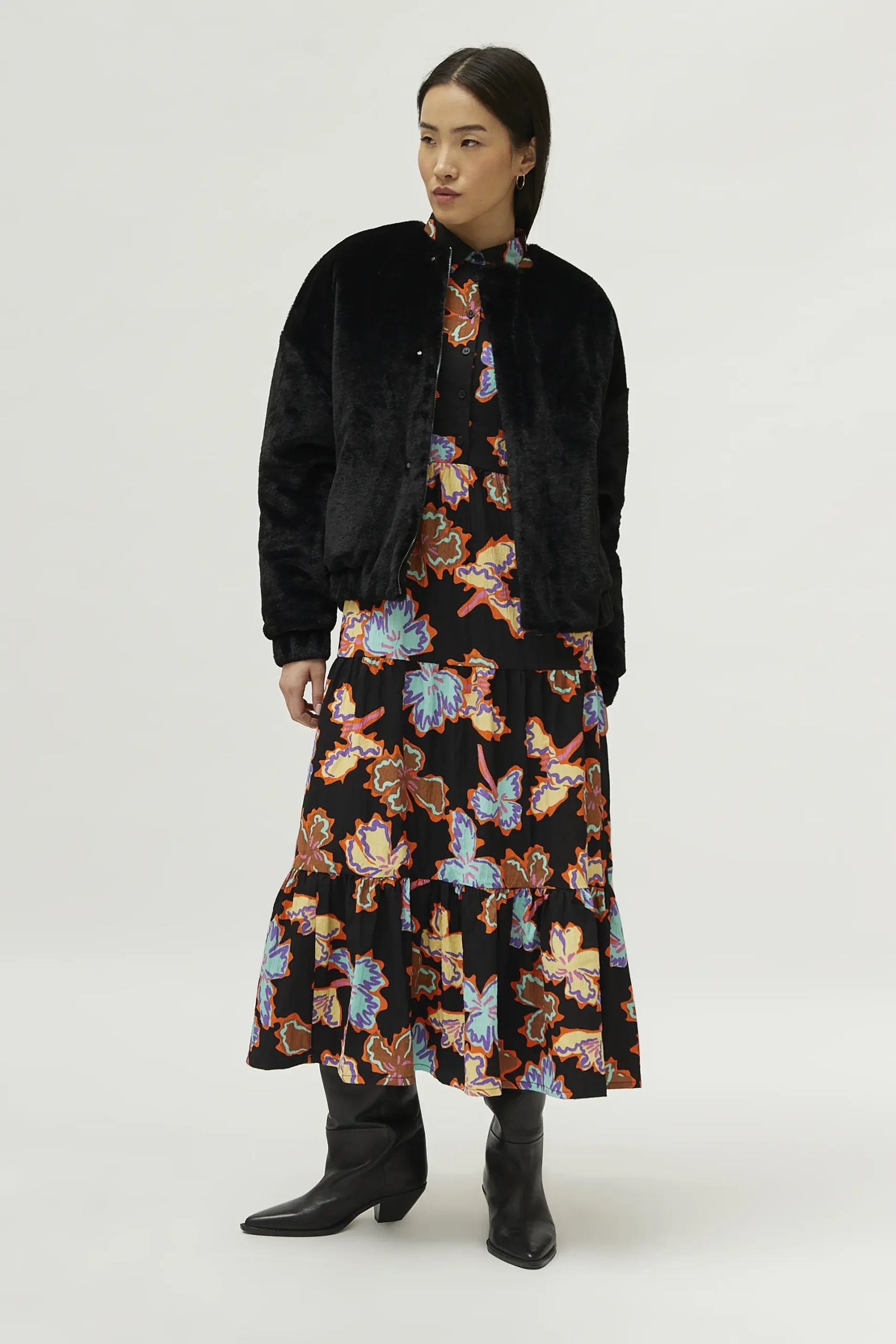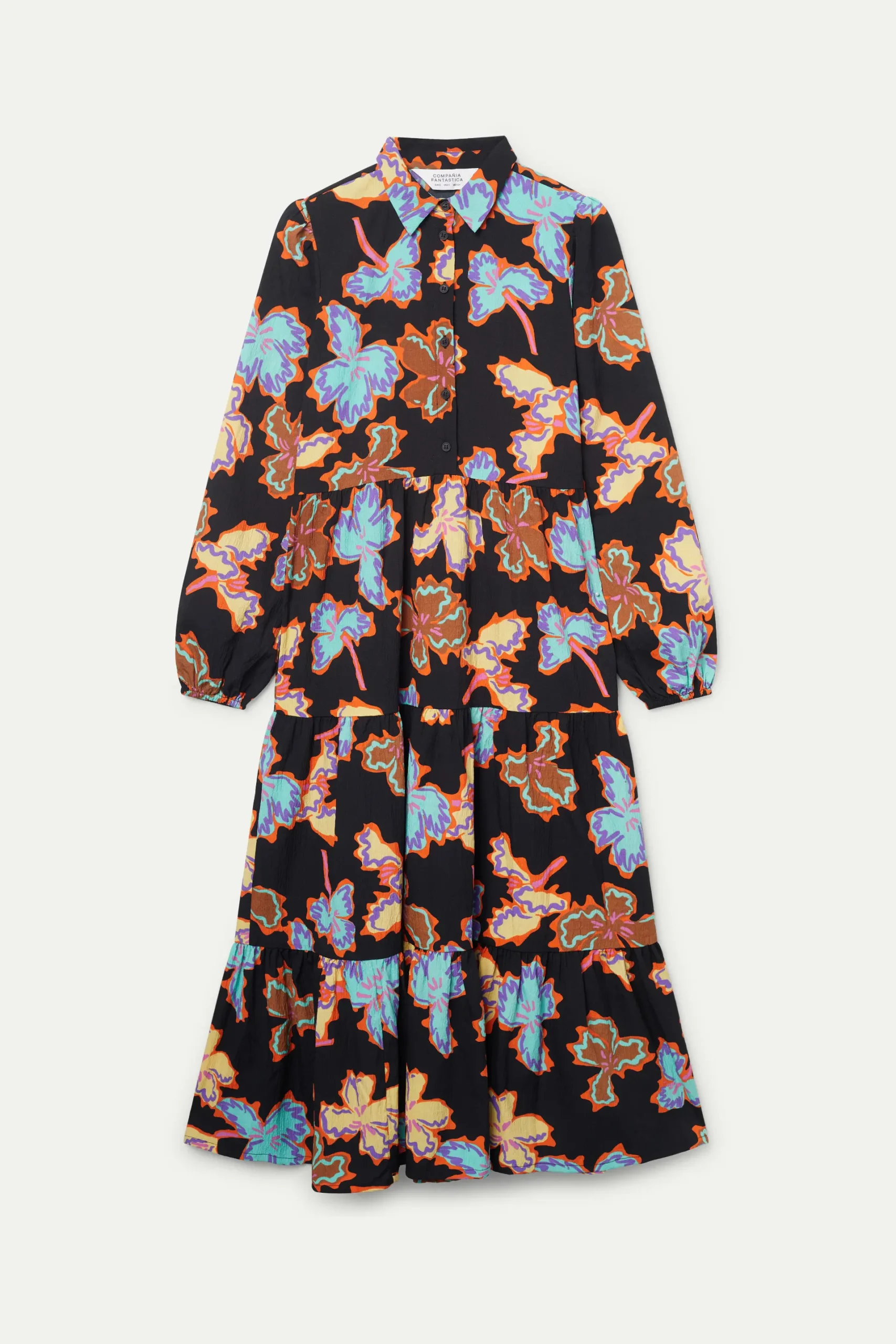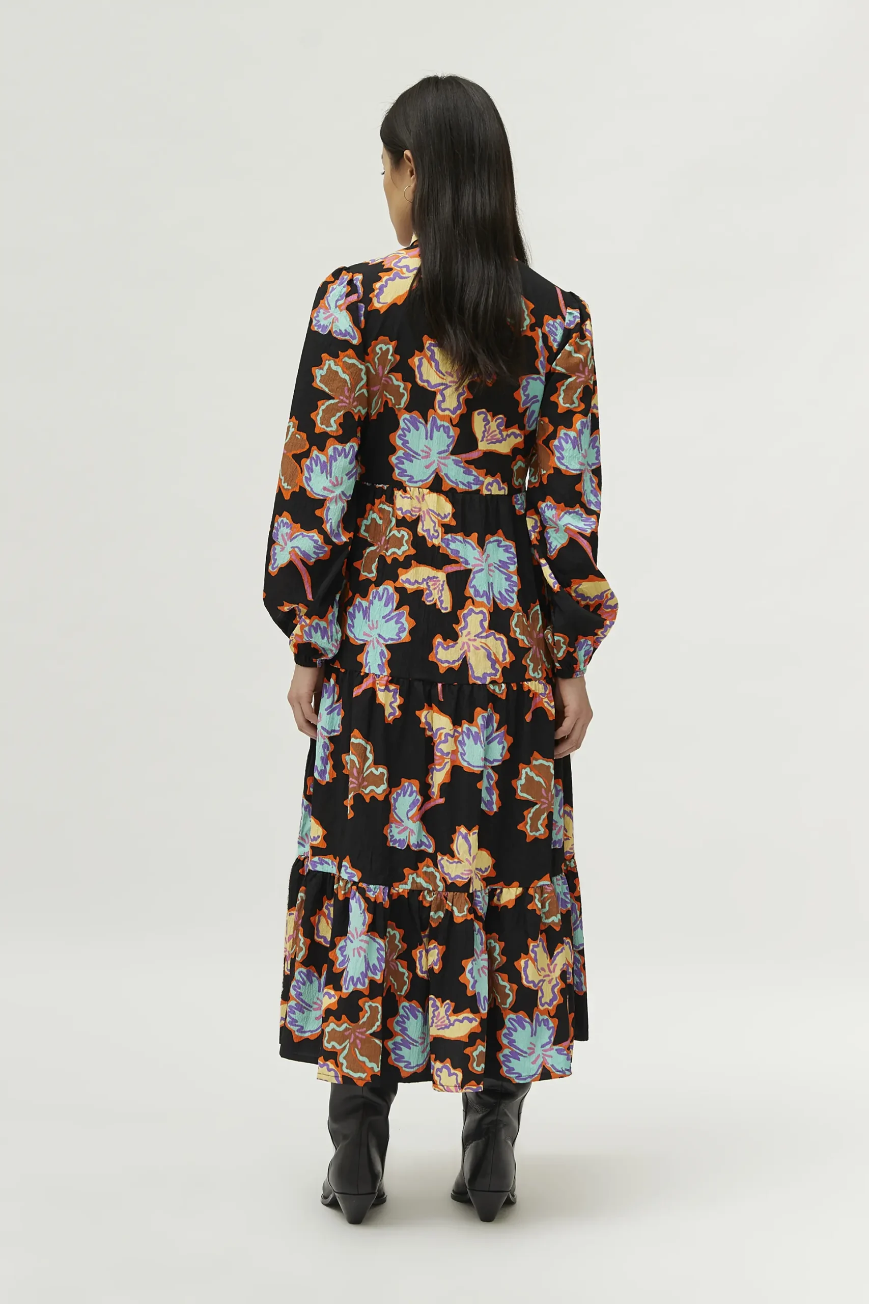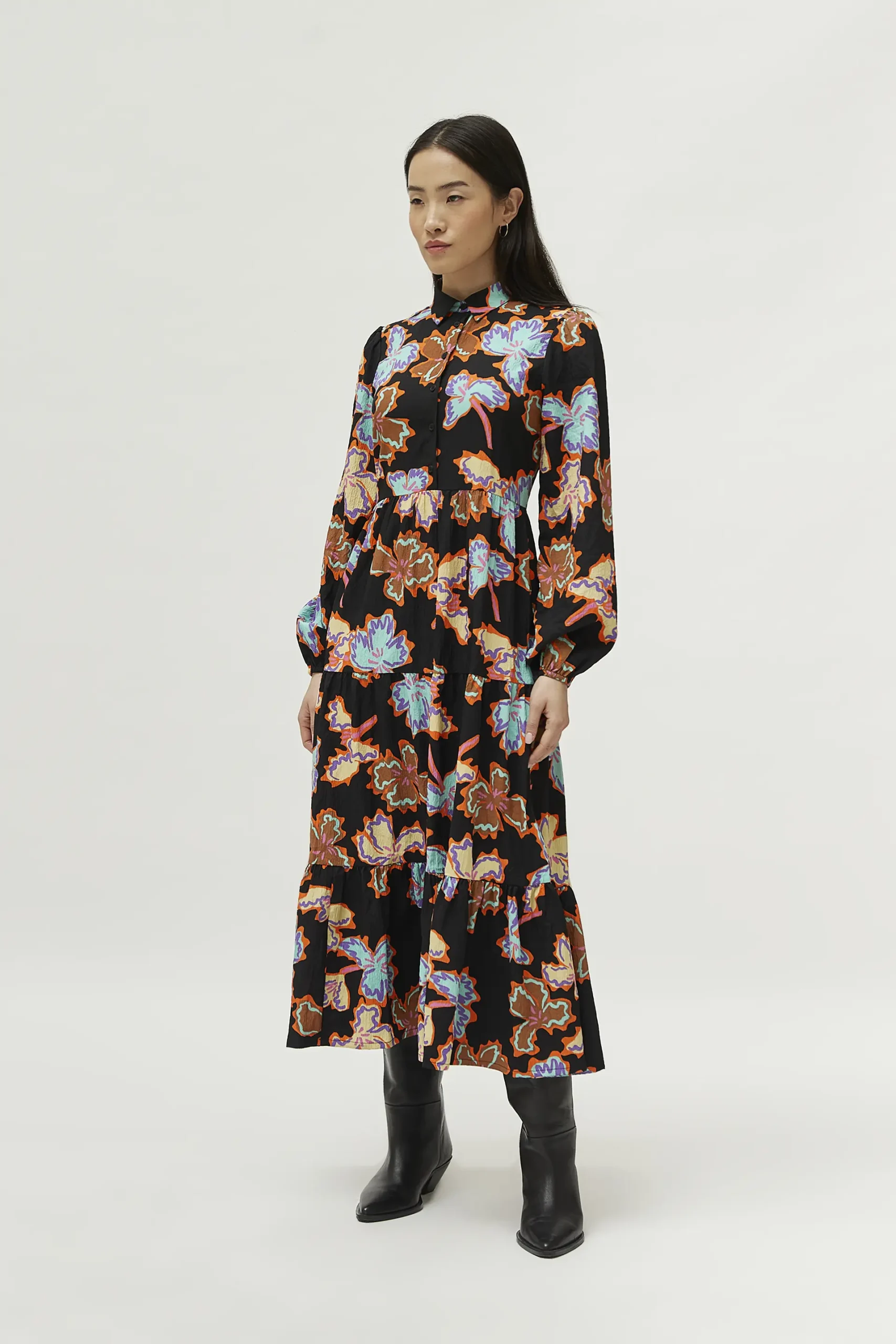 Vestido largo en crepé texturizado de color negro con estampado de flores azules, amarillas y marrones. Con cuello solapa y manga larga. Cierre frontal con botones y corte en la cintura. La modelo mide 171 cm y lleva la talla S.