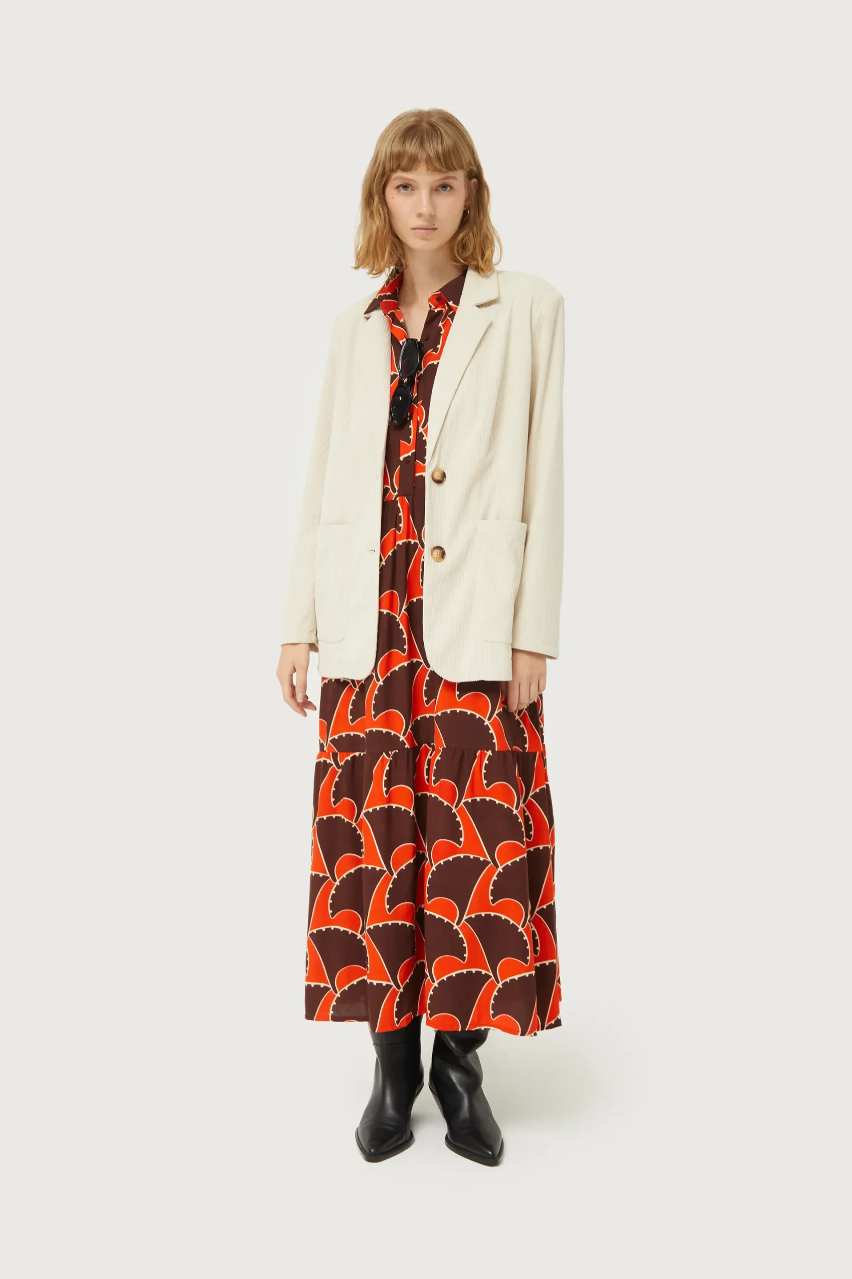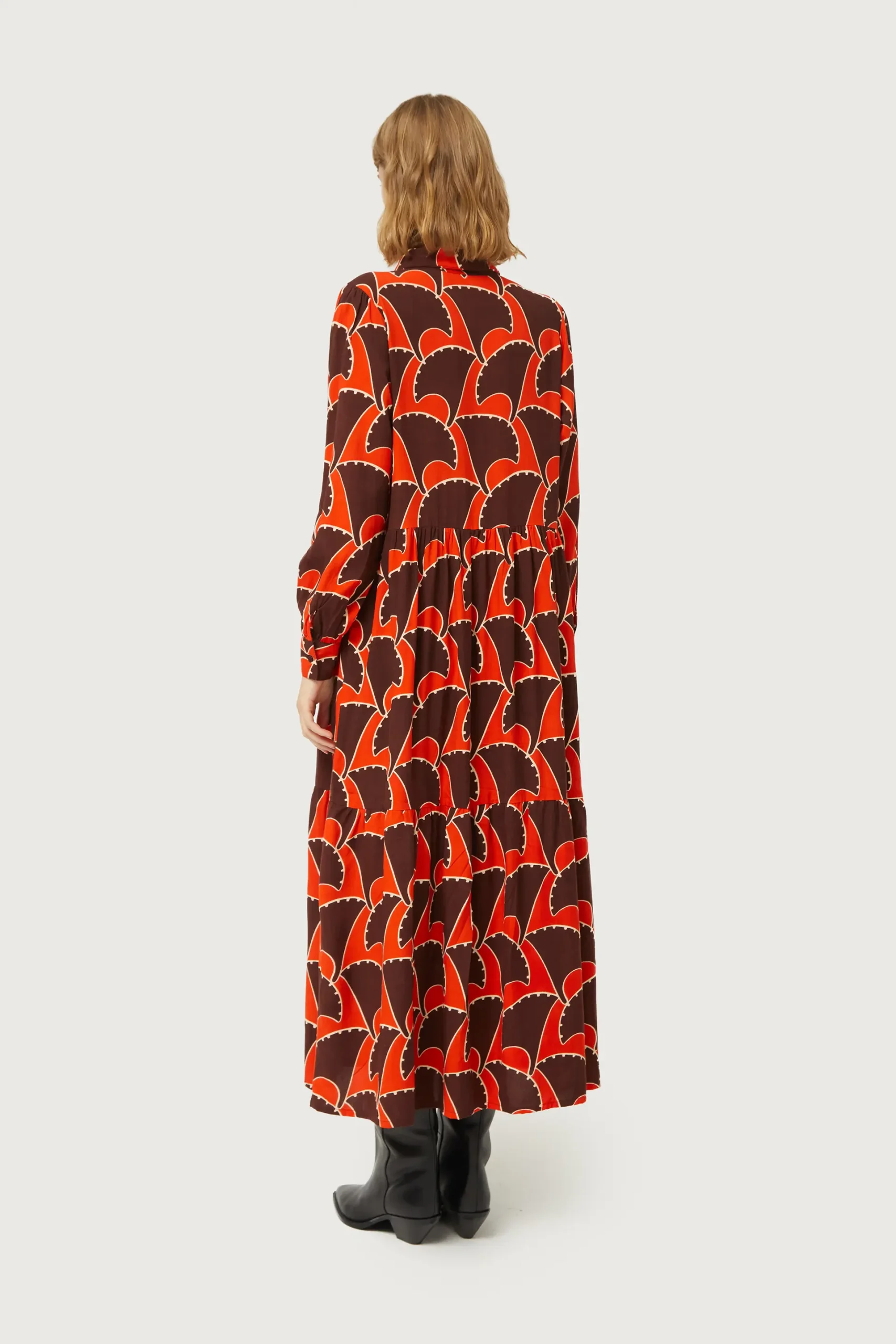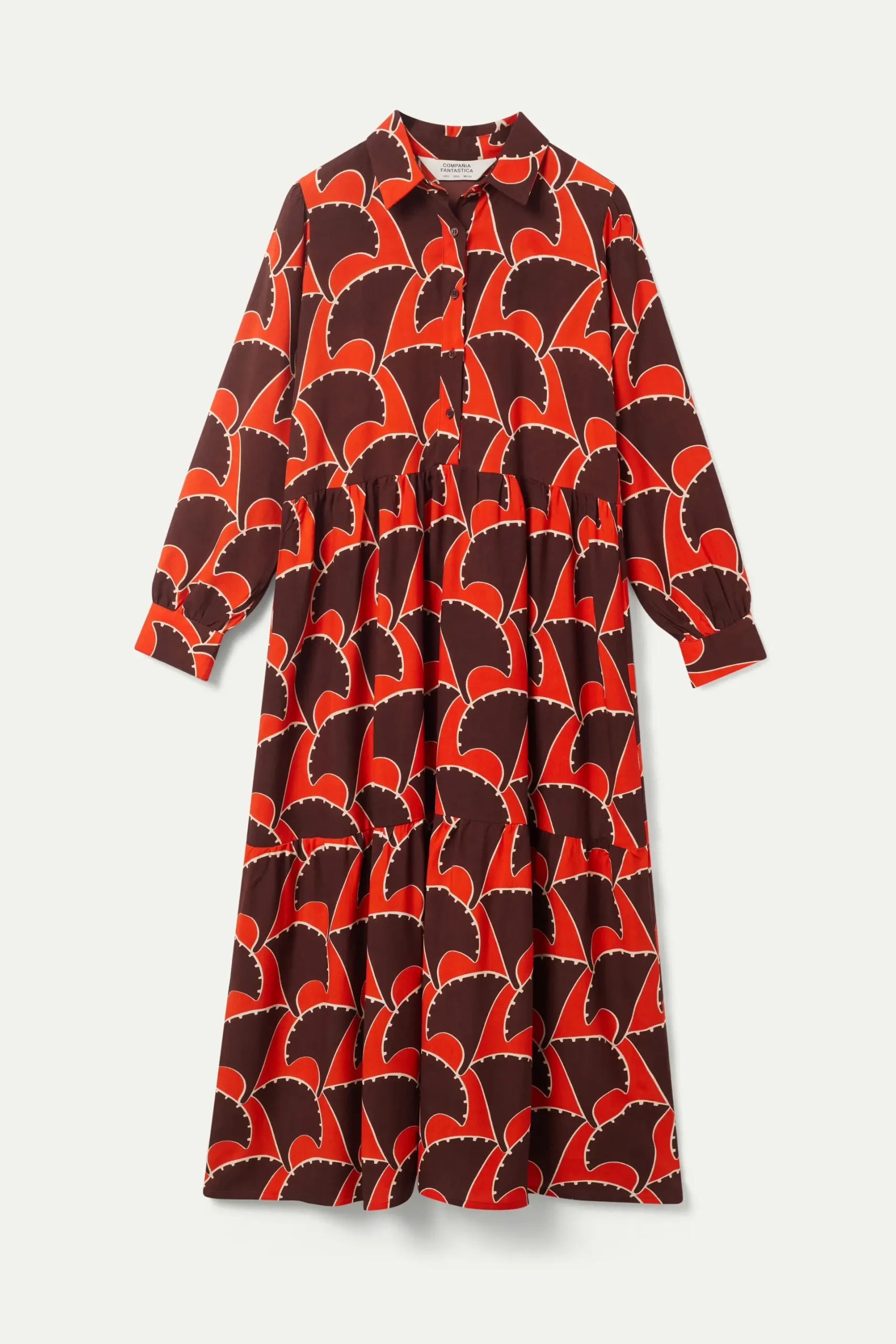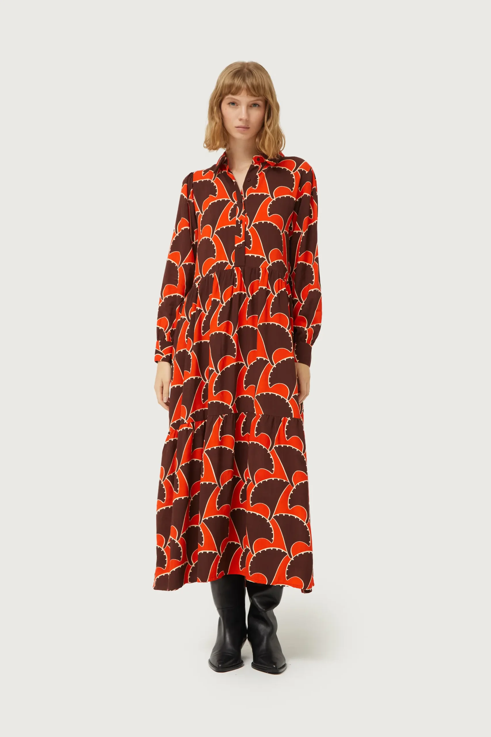 Vestido largo con estampado geométrico de color naranja y marrón. Con cuello solapa y manga larga terminada en puño. Cierre frontal con botones. Modelo con corte en la cintura. Forro interior. La modelo mide 177 cm y lleva la talla S.