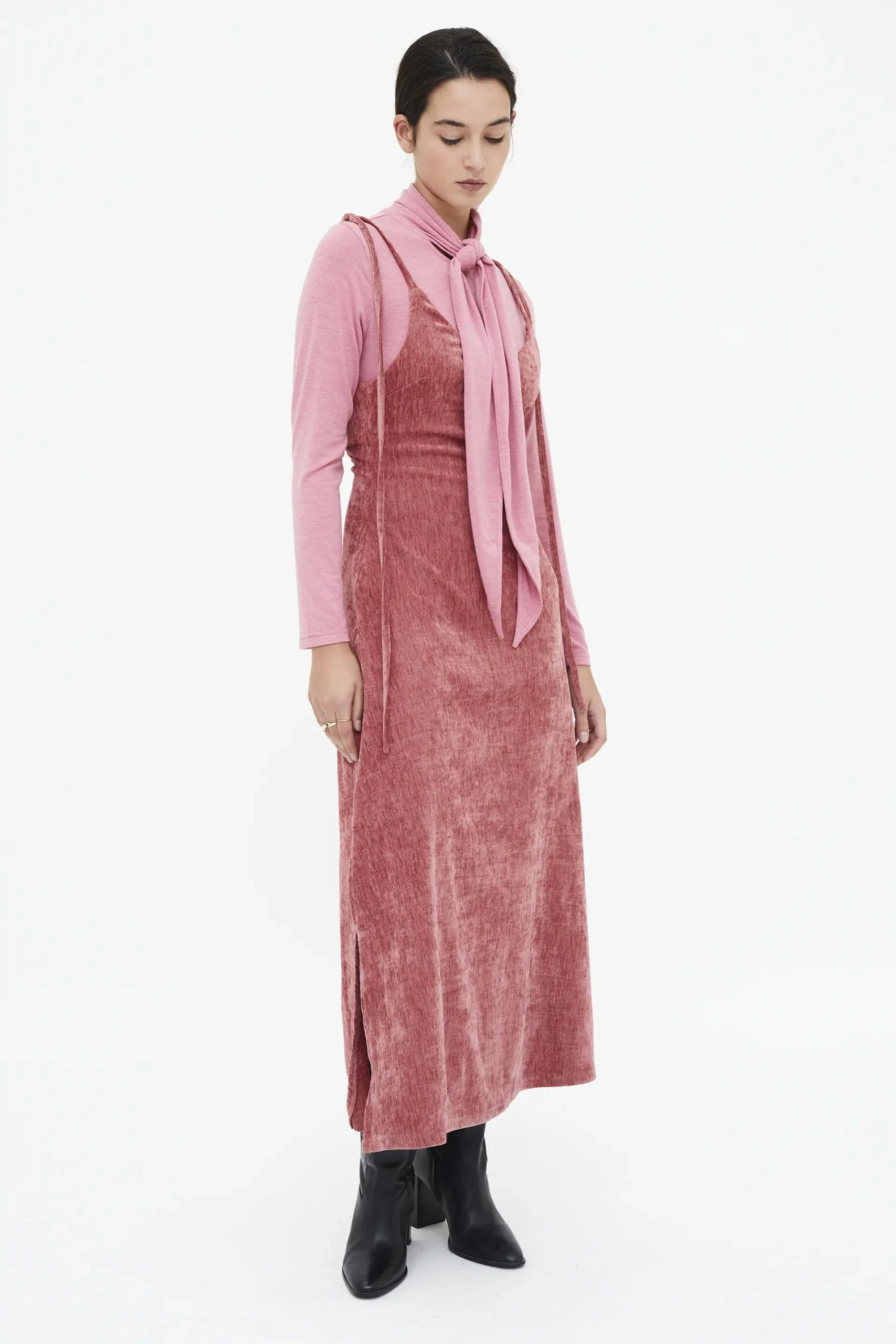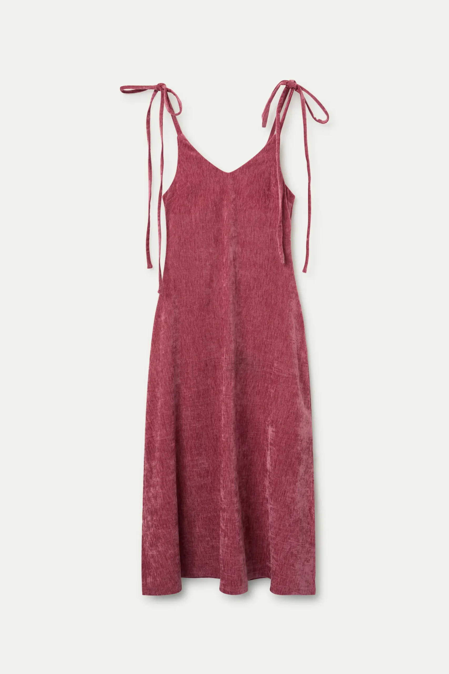 Vestido largo de tejido terciopelo color rosa. Con escote pico y tirantes lazados. Modelo con ligeros pliegues. La modelo mide 174 cm y lleva la talla S.