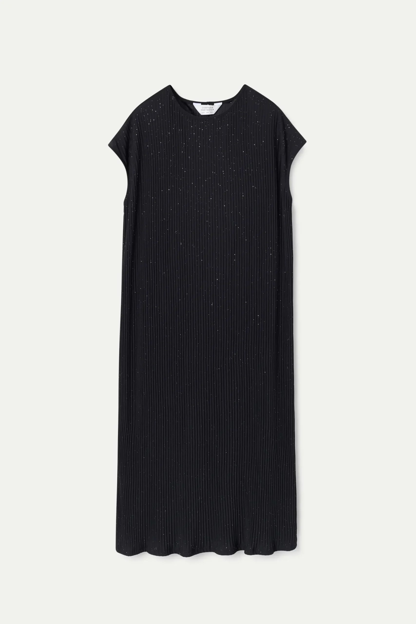 Vestido de tejido crepé y lurex de color negro. Cuello redondo y manga corta. Corte fluído.