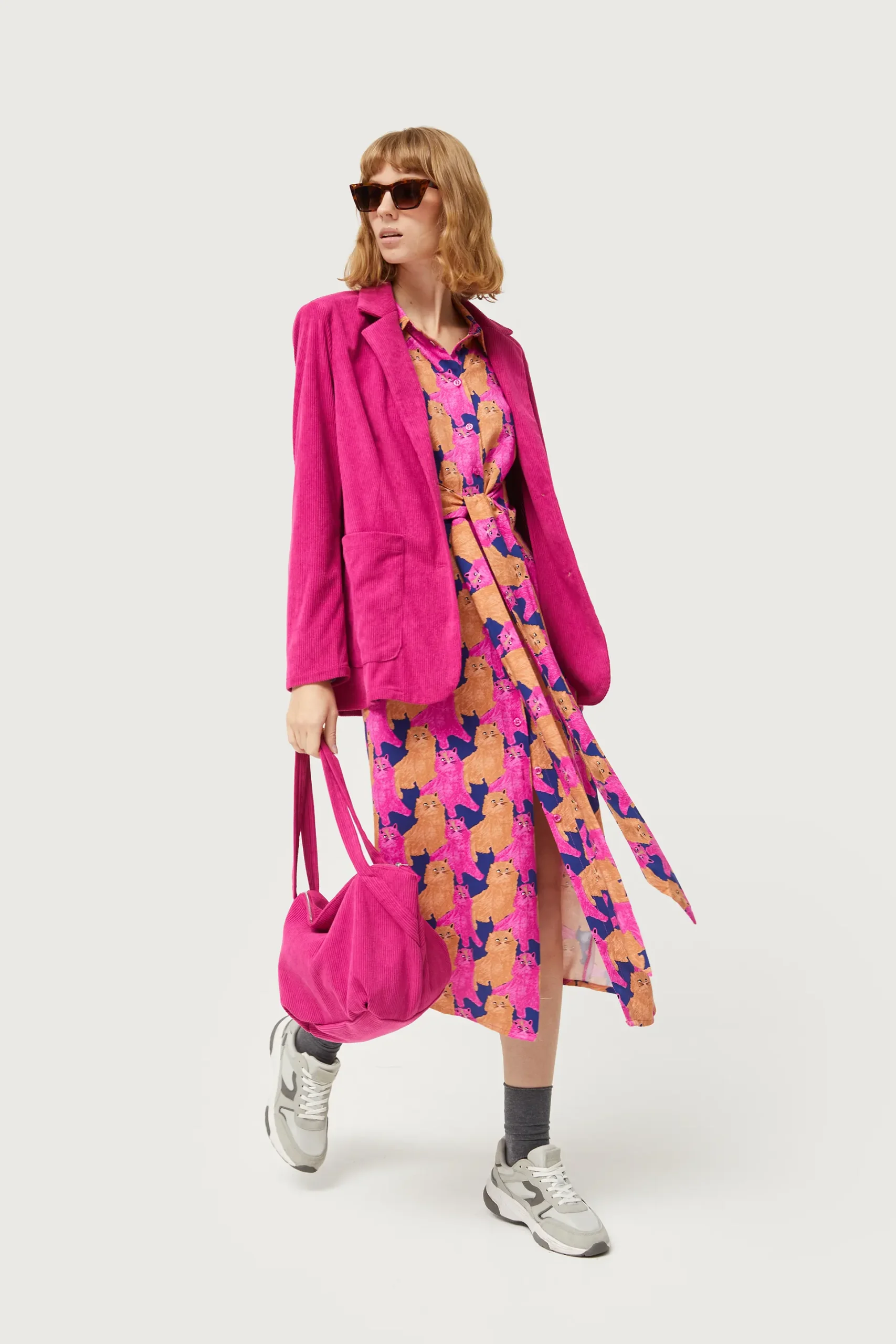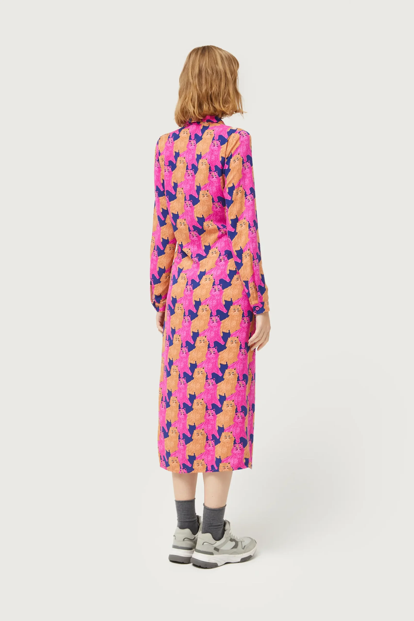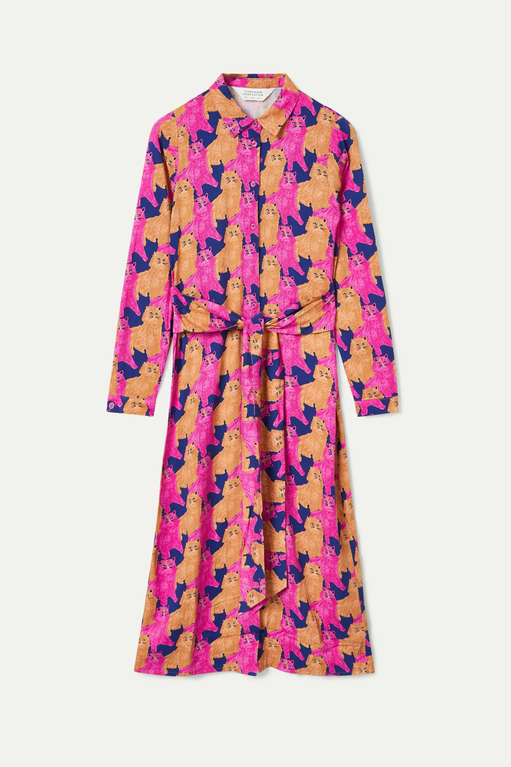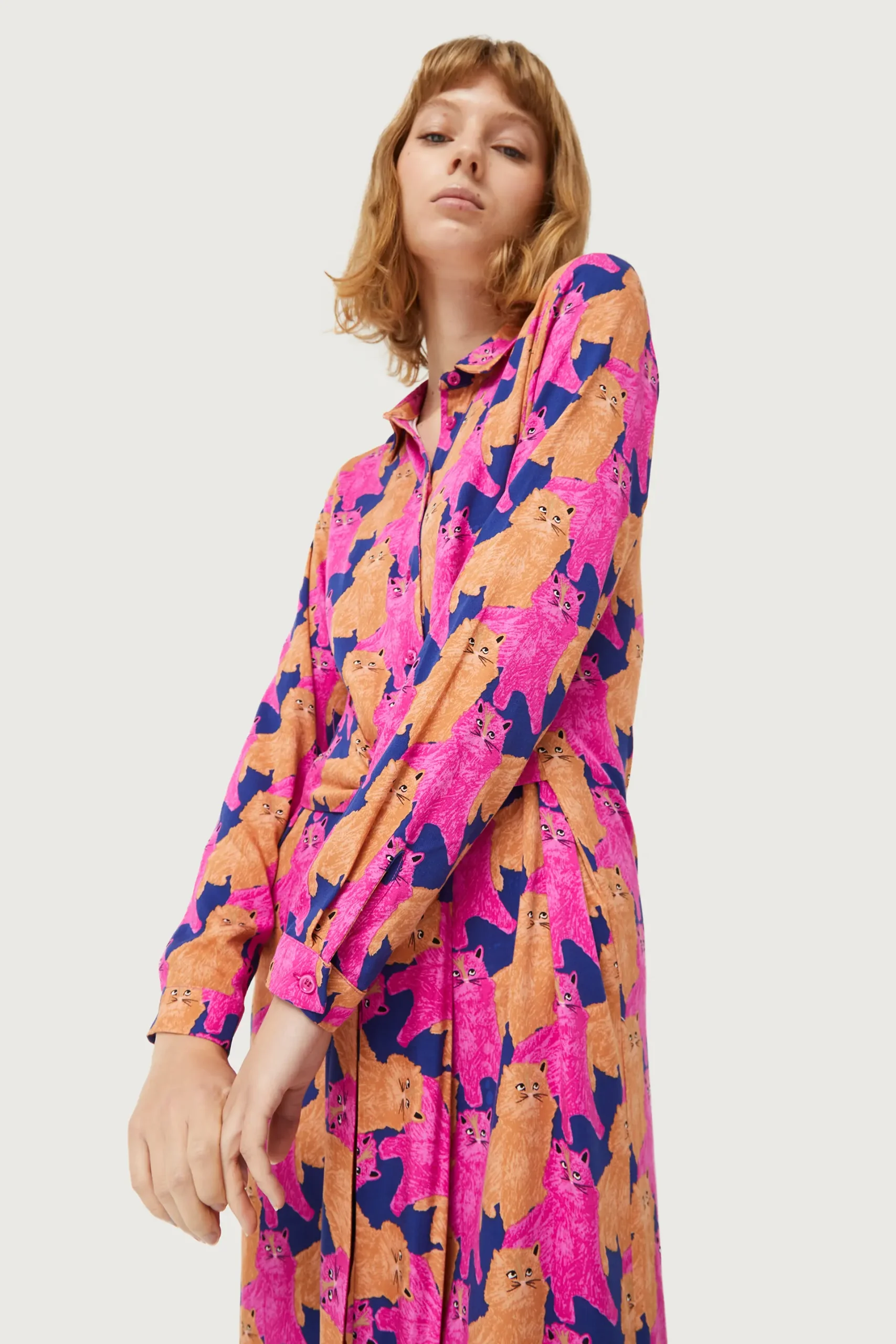 Vestido midi en twill de viscosa con estampado de gatos de color morado, beige y azul marino. Con cuello solapa y manga larga terminada en puño. Cierre frontal con botones y cinturón. La modelo mide 176 cm y lleva la talla S.