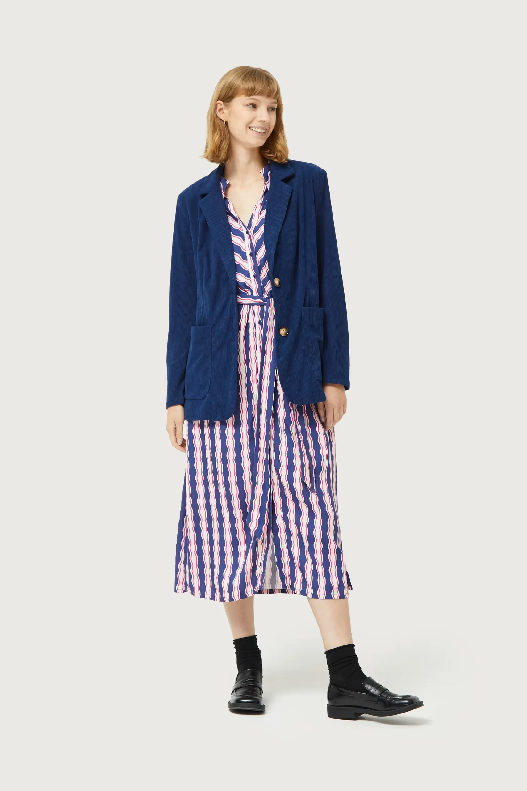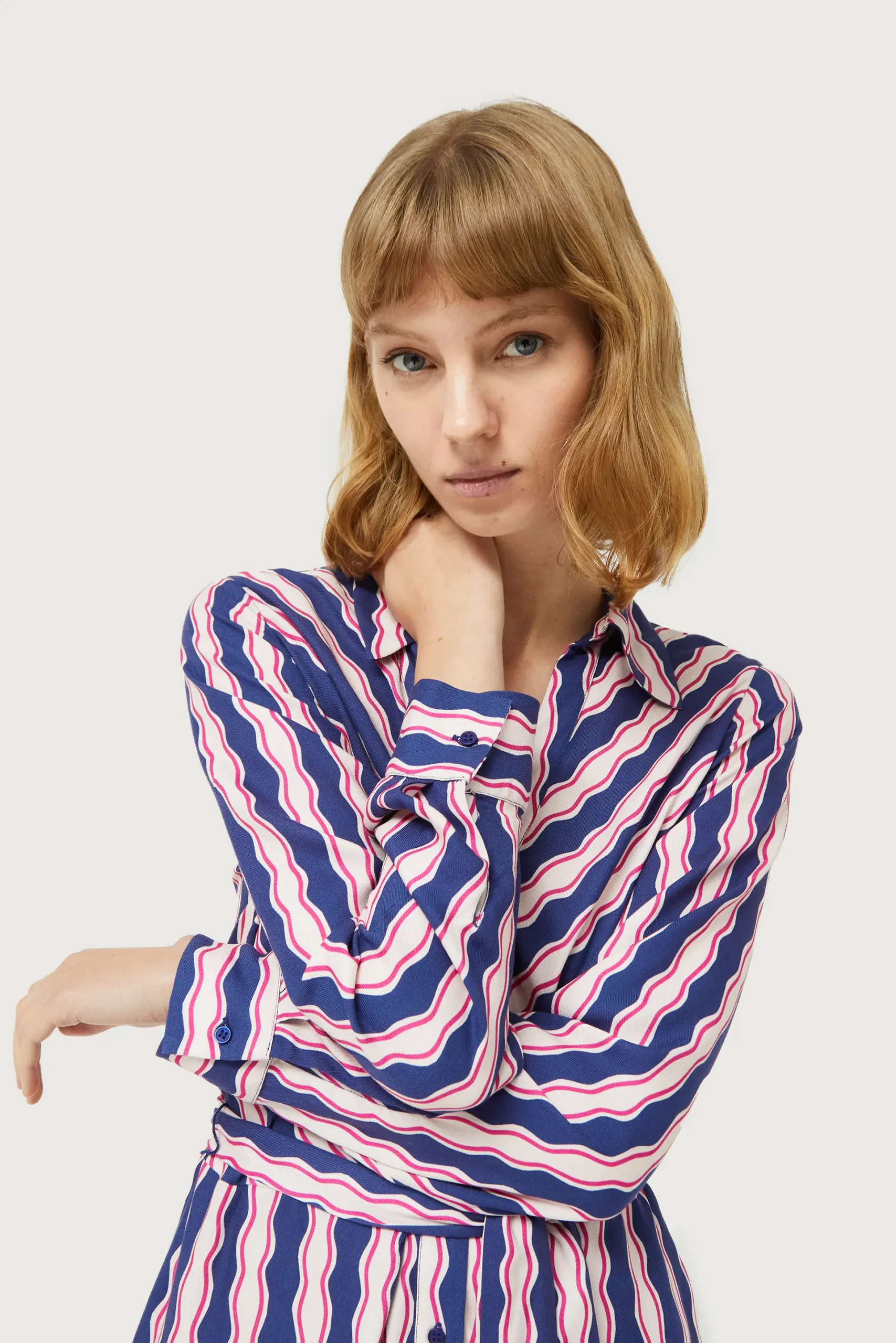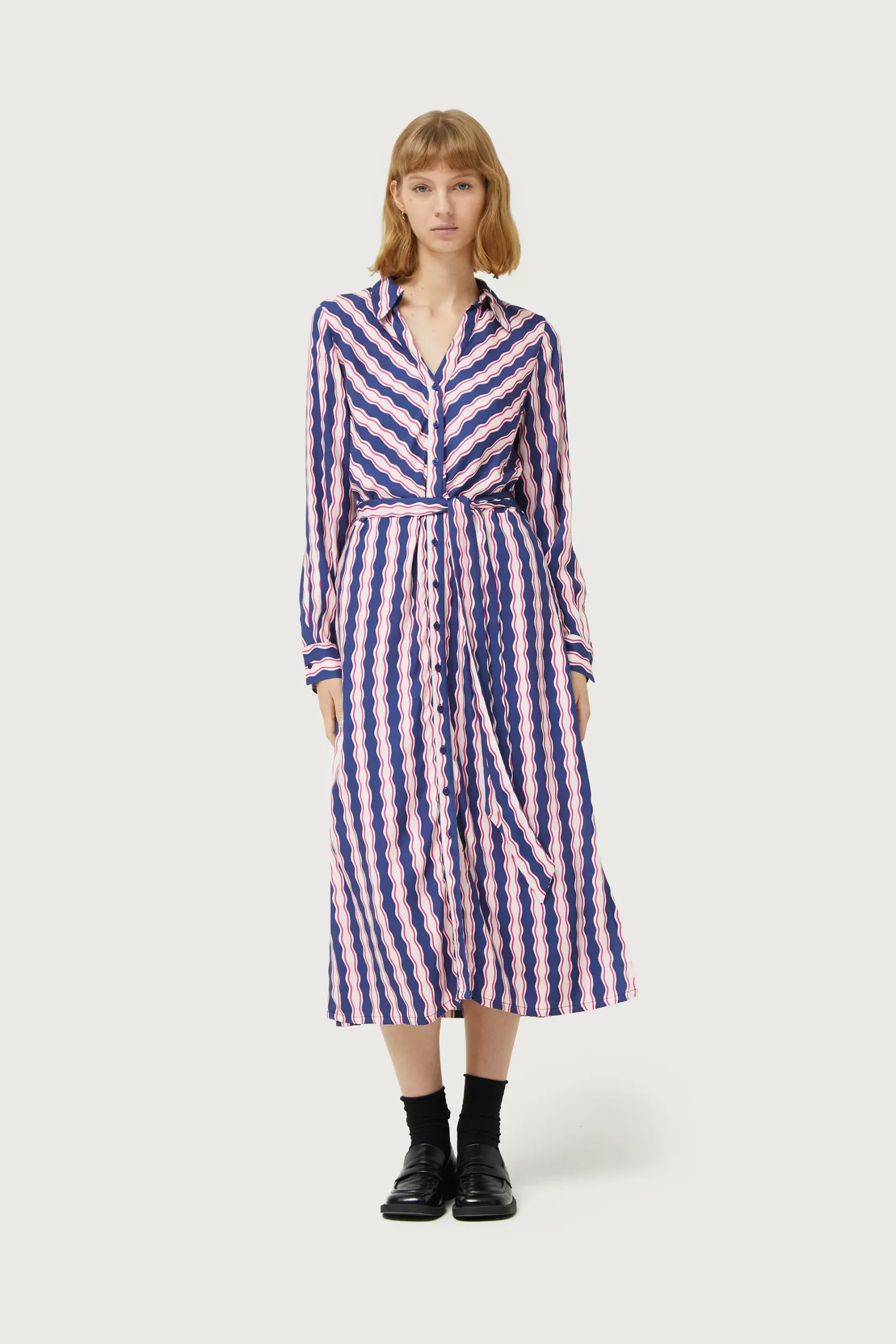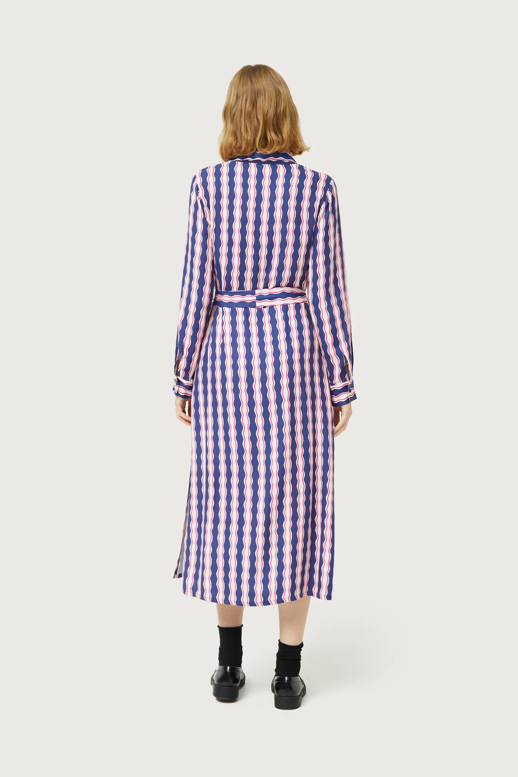 Vestido midi en twill de viscosa con estampado de rayas de color azul, blanco y rosa. Con cuello solapa y manga larga terminada en puño. Cierre frontal con botones y cinturón de tela. Detalle de aberturas laterales. La modelo mide 177 cm y lleva la talla S.
