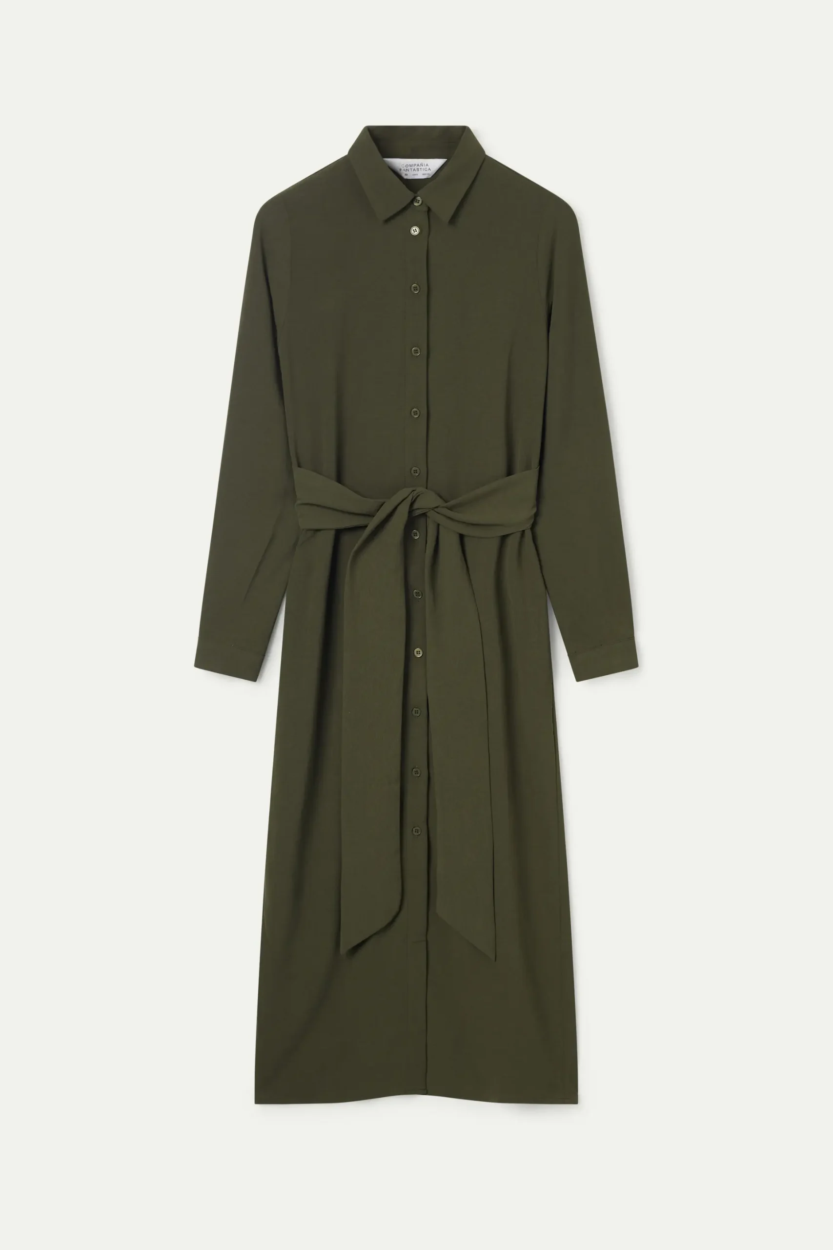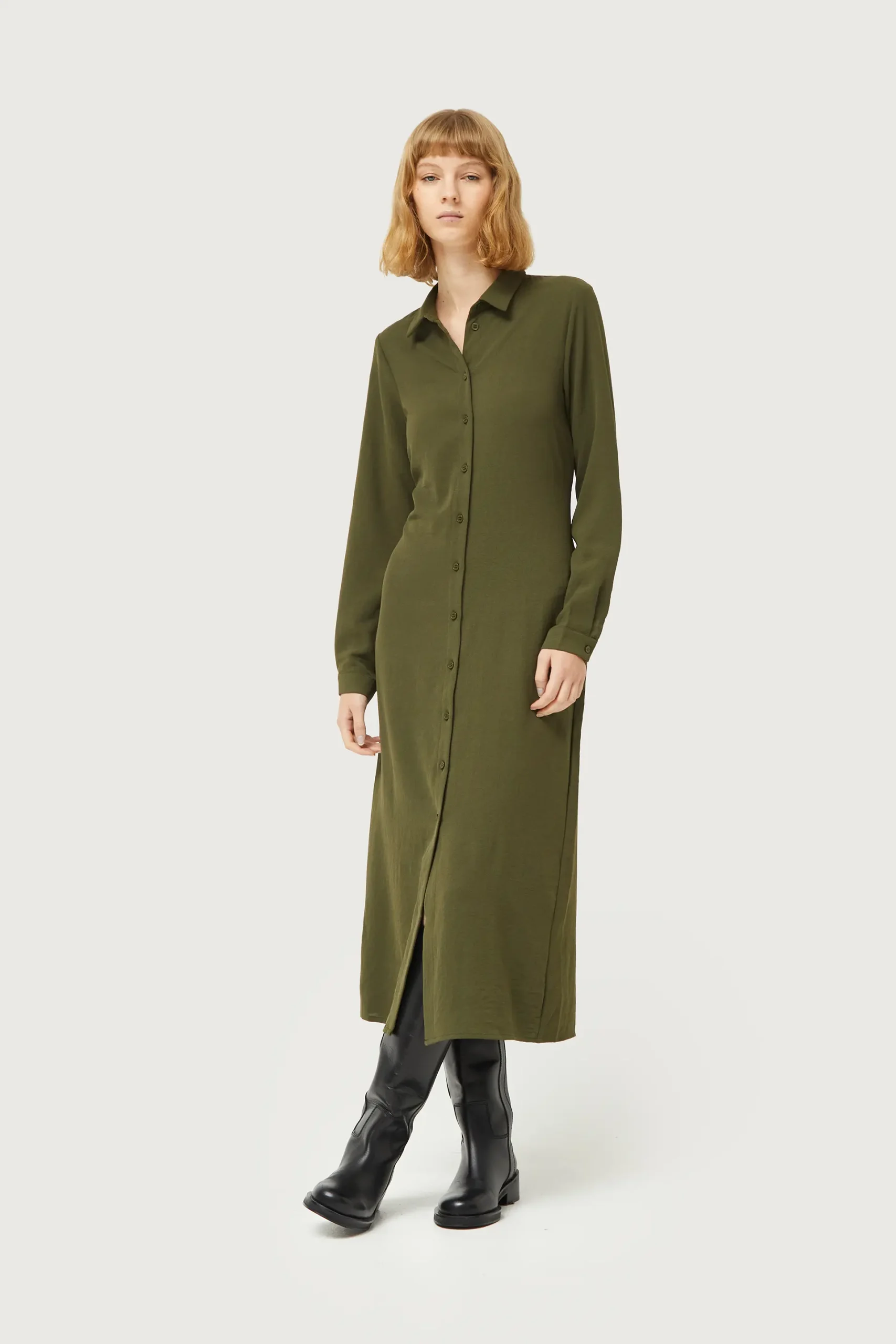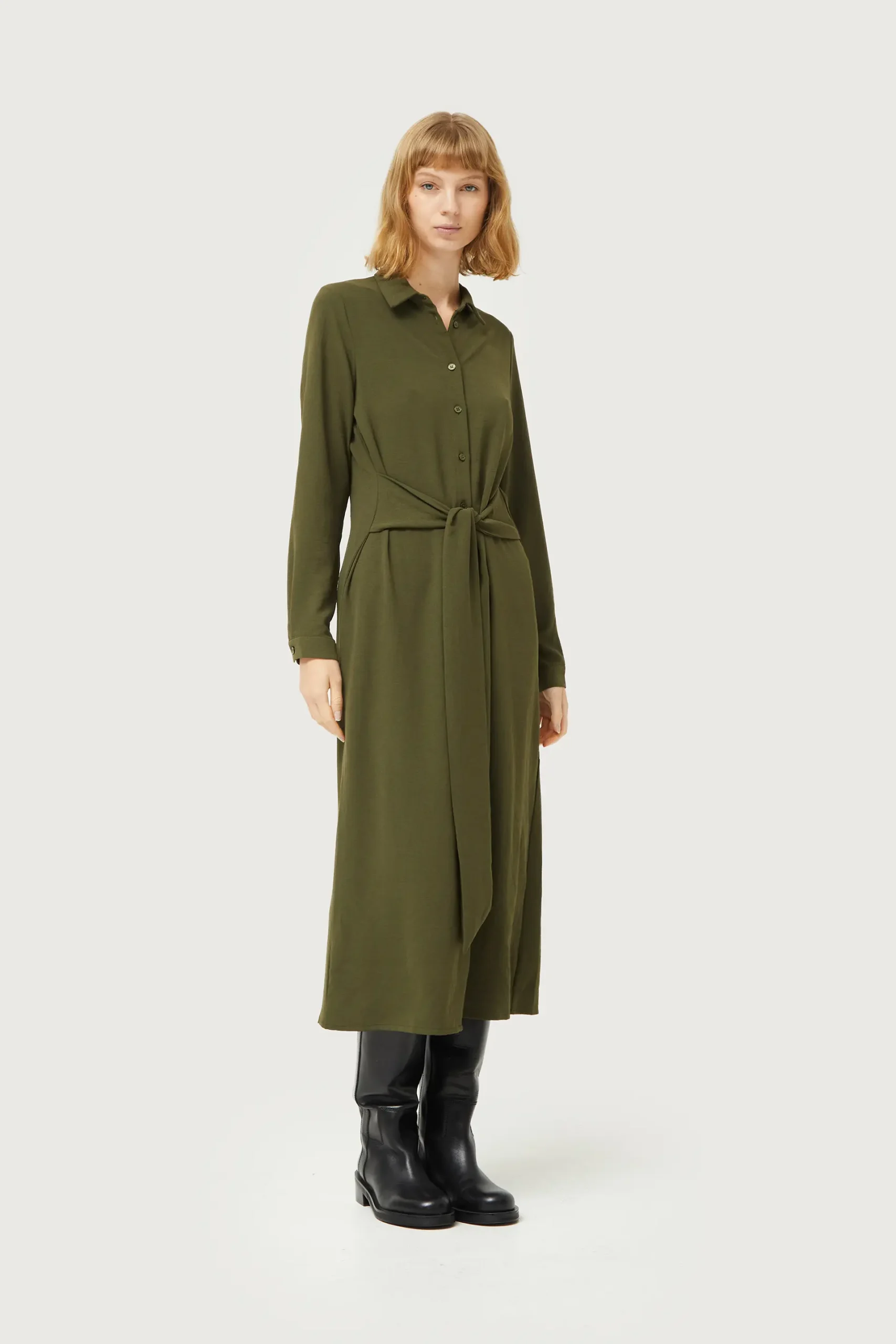 Vestido midi en crepé de color verde caqui. Con cuello solapa y manga larga terminada en puño. Cierre frontal con botones y cinturón. La modelo mide 177 cm y lleva la talla S.