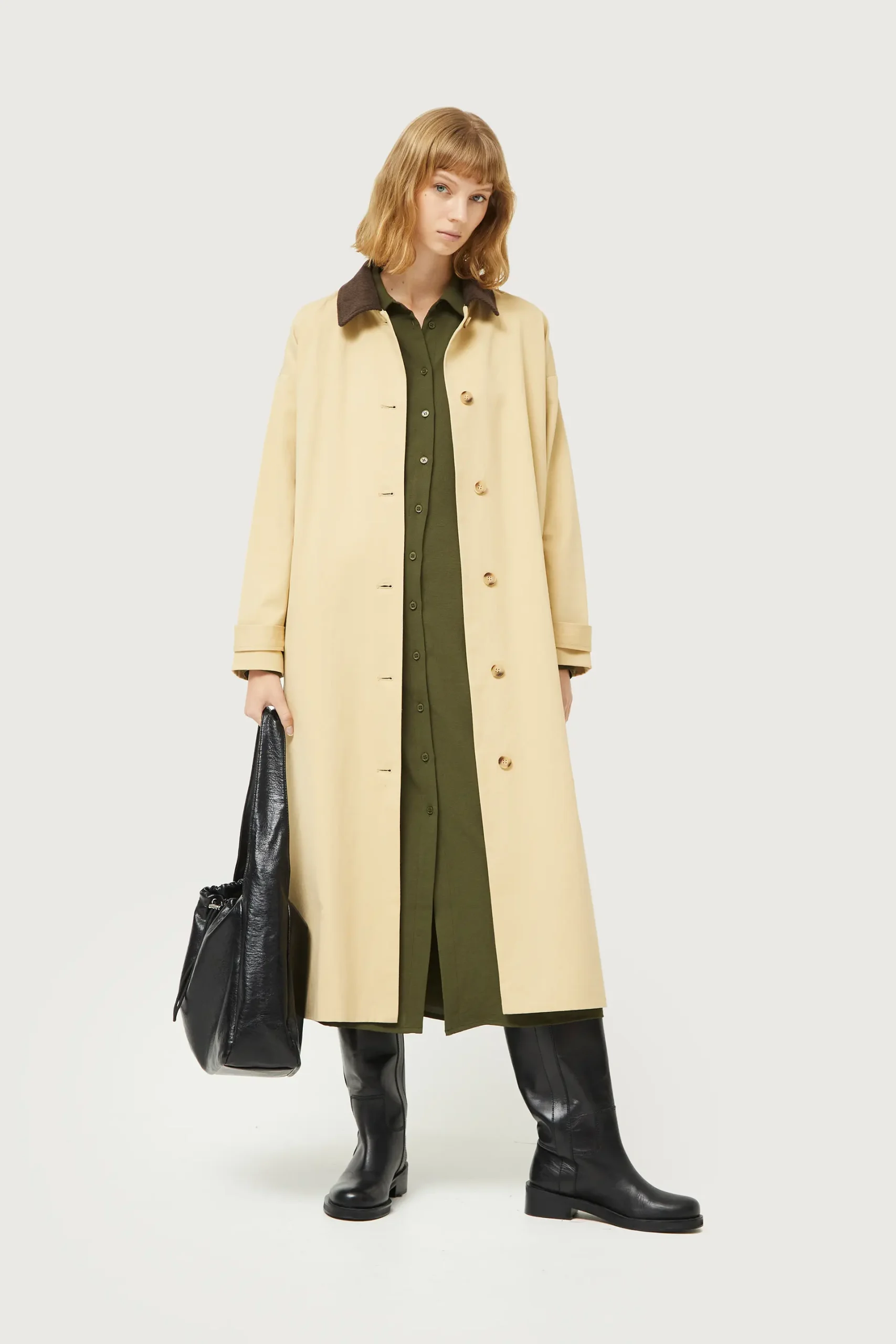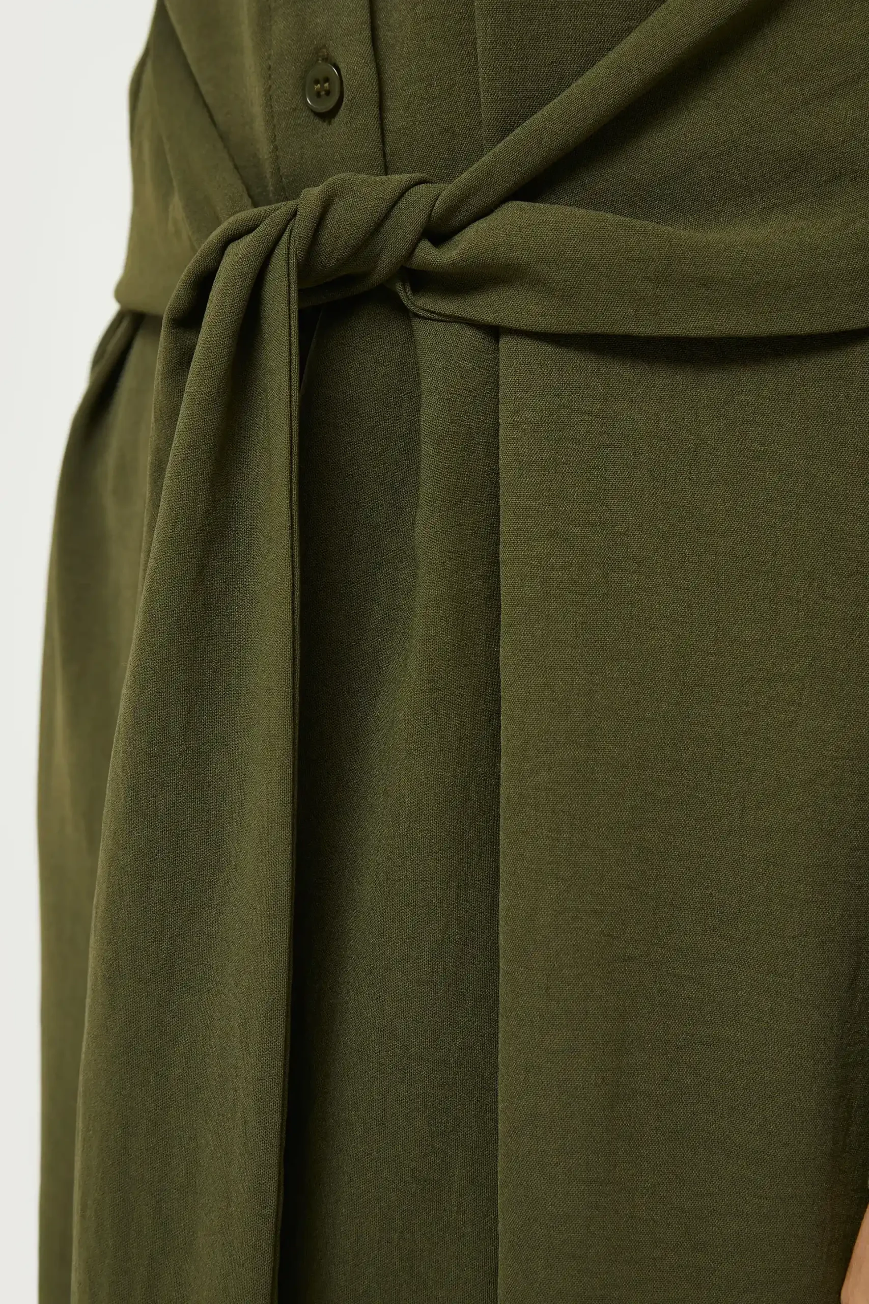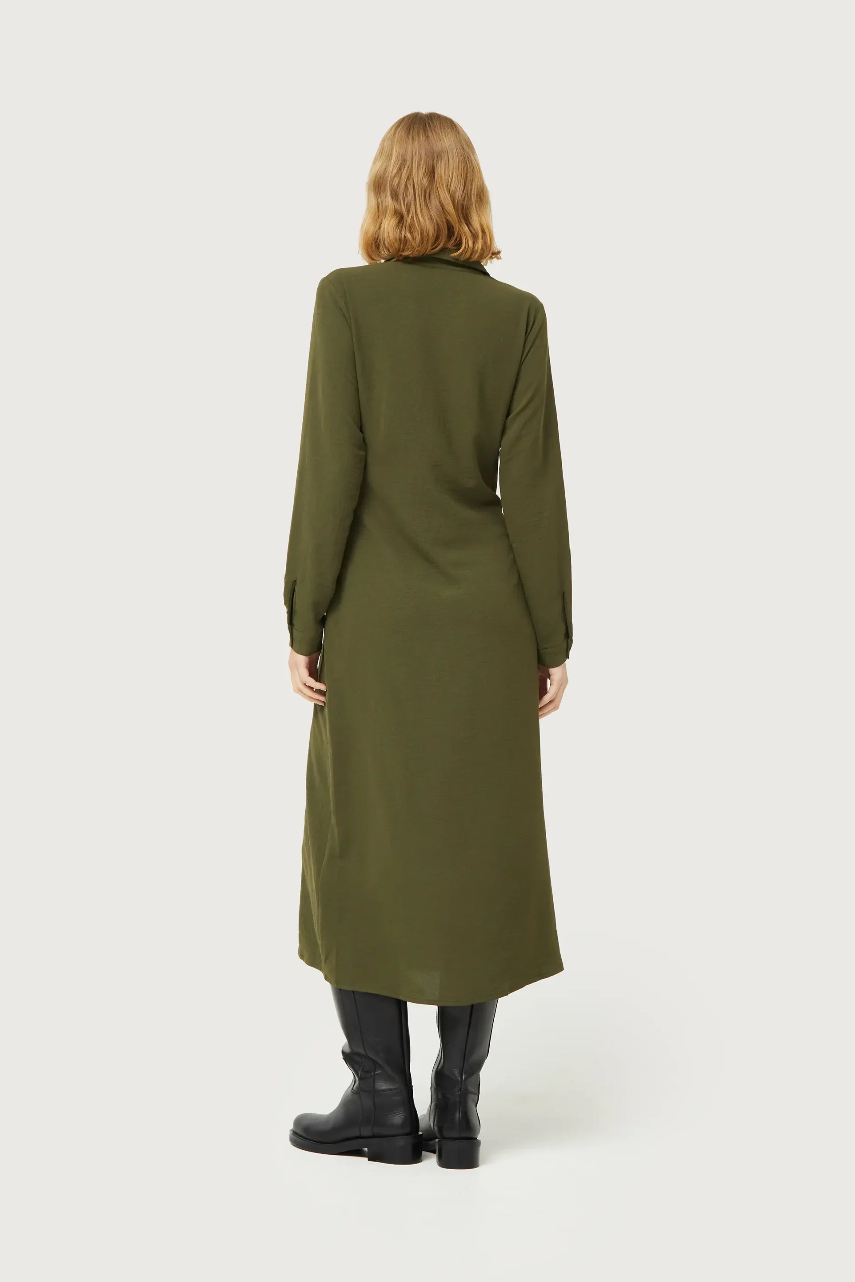 Vestido midi en crepé de color verde caqui. Con cuello solapa y manga larga terminada en puño. Cierre frontal con botones y cinturón. La modelo mide 177 cm y lleva la talla S.