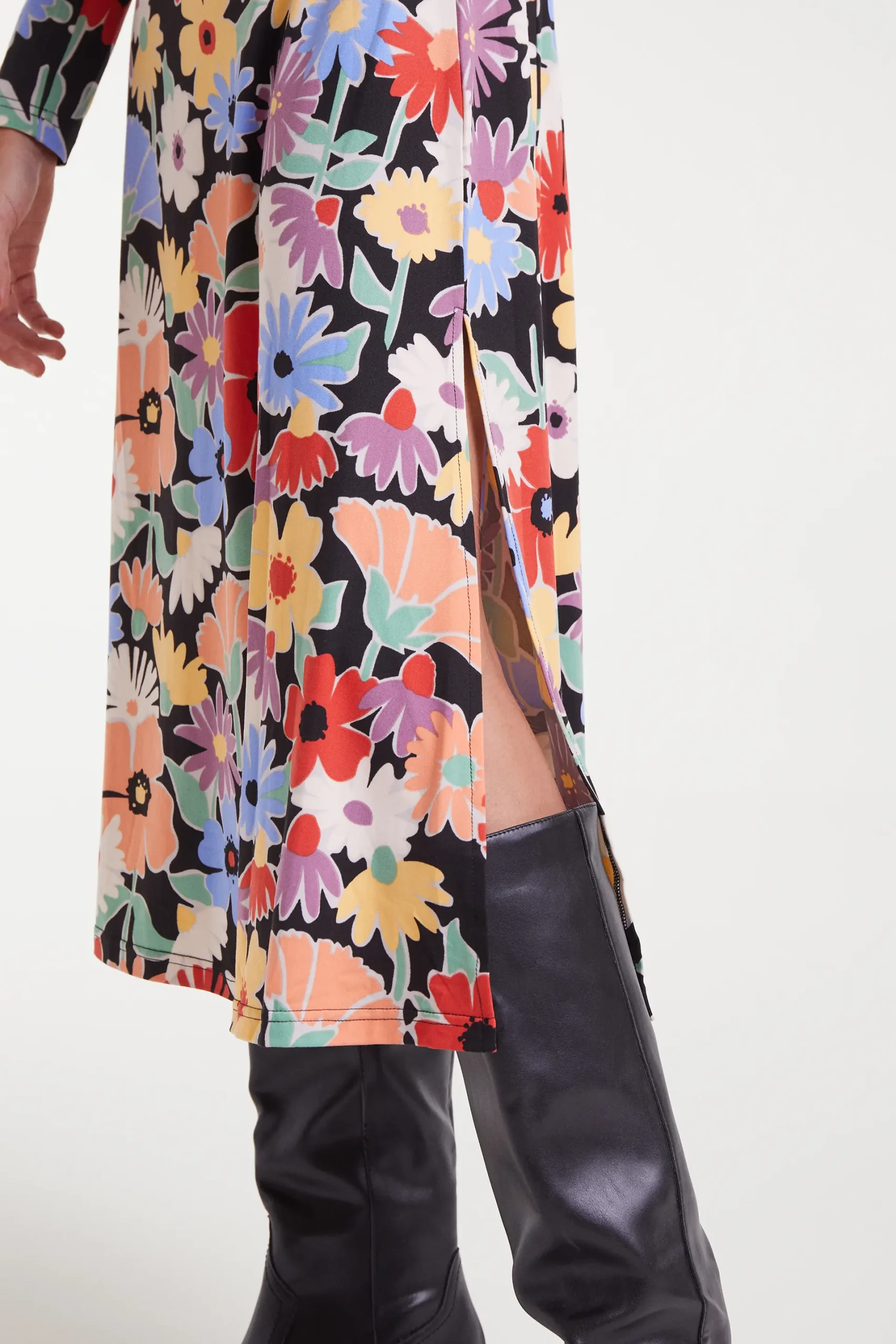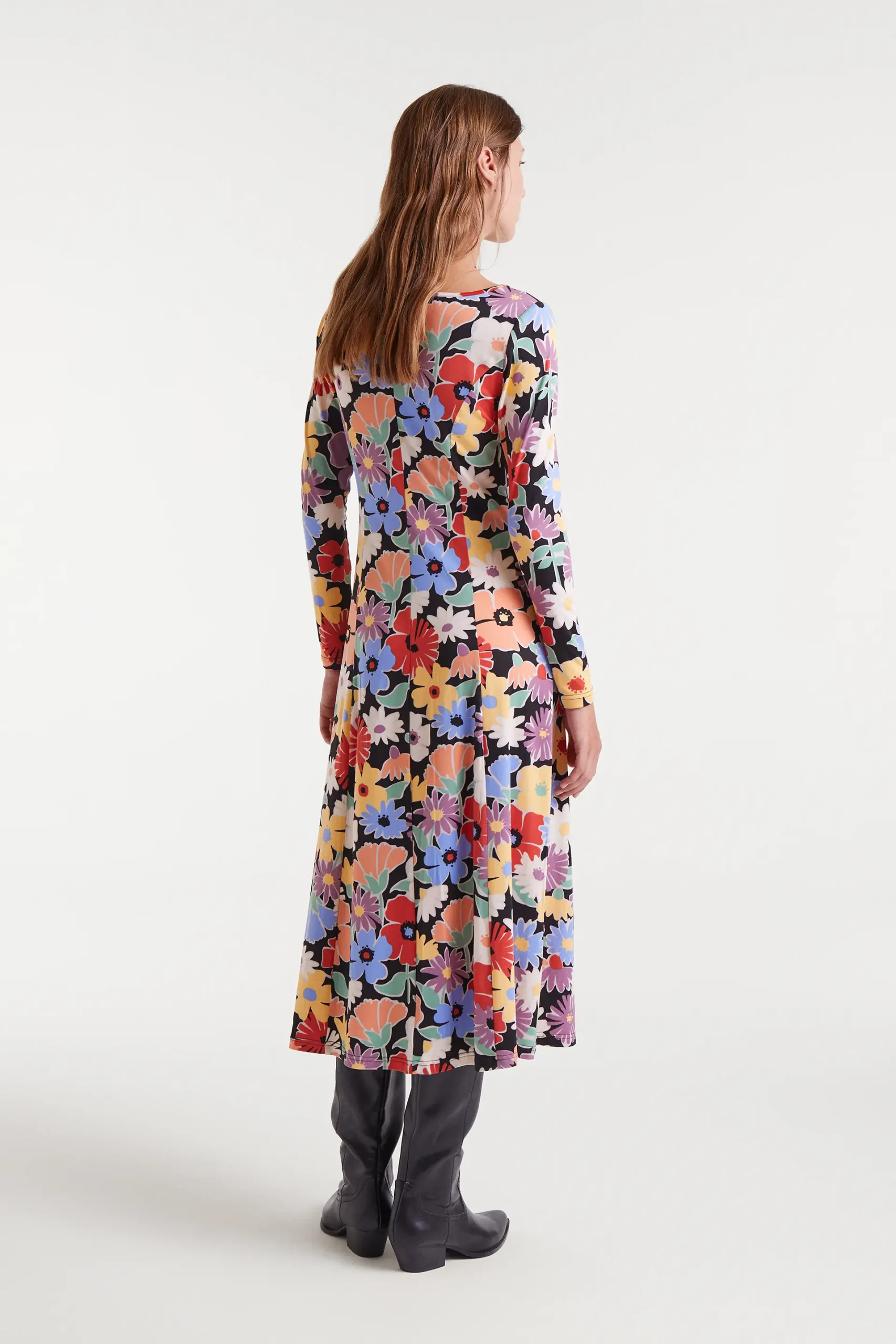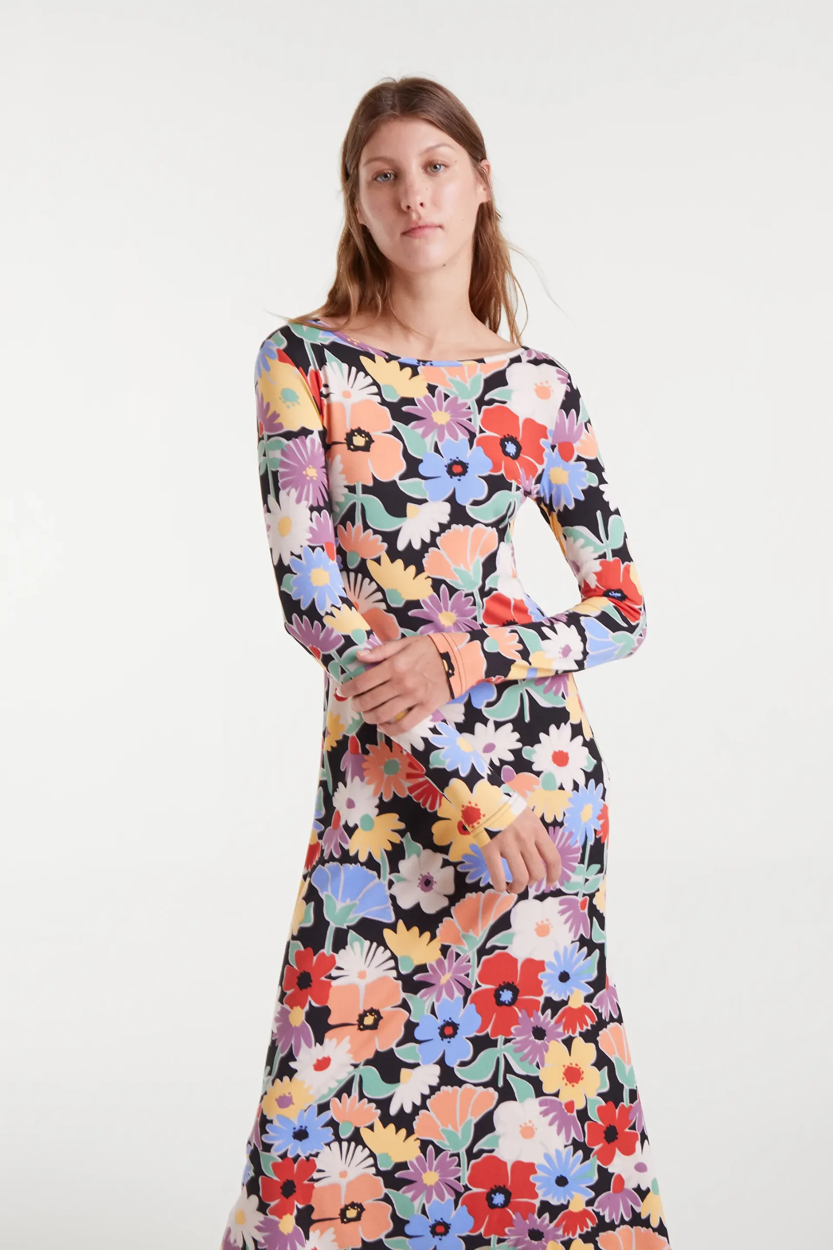 Vestido midi con estampado Hampton Big. Con escote barco y manga larga. Detalle de abertura lateral. La modelo mide 177 cm y lleva la talla S.