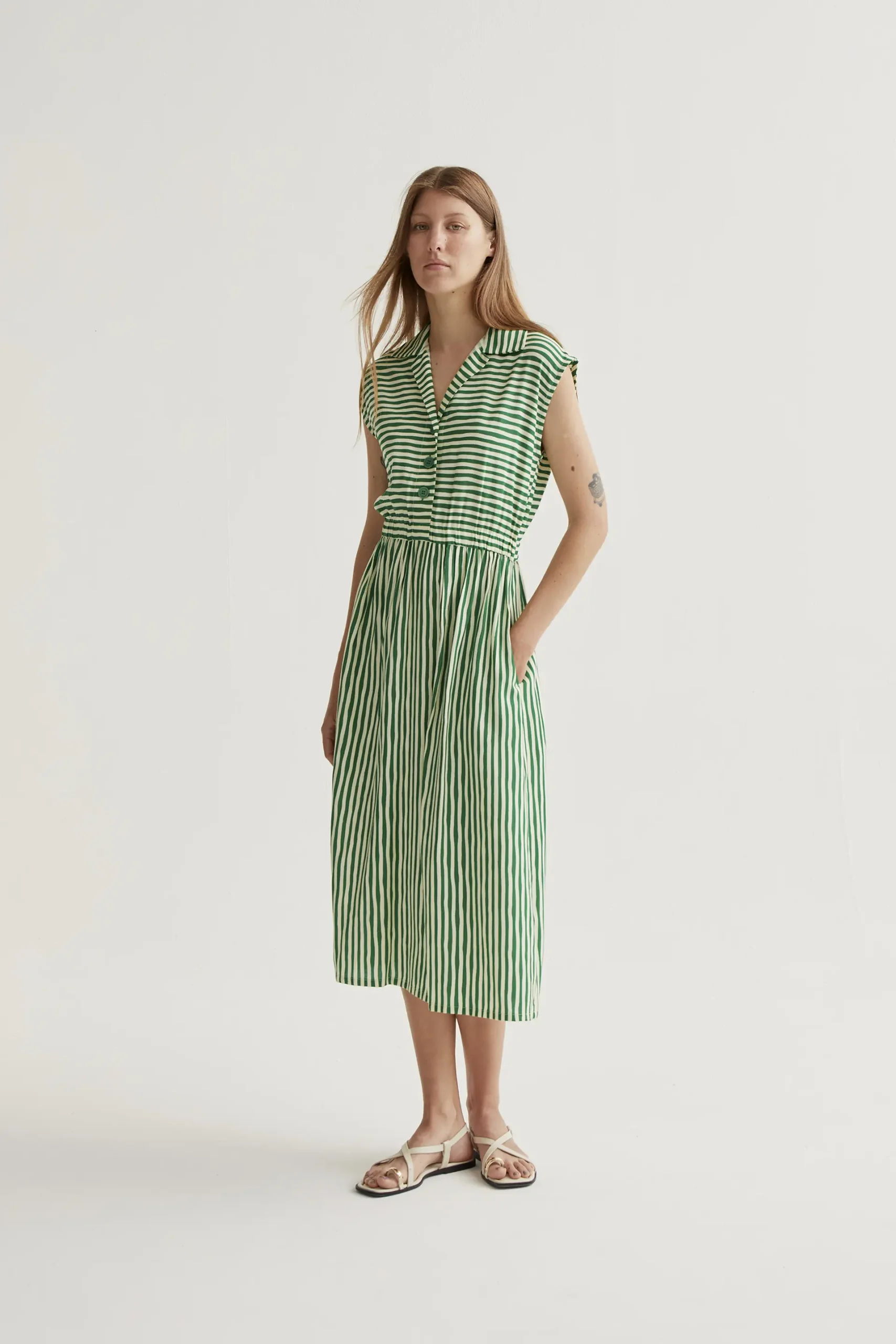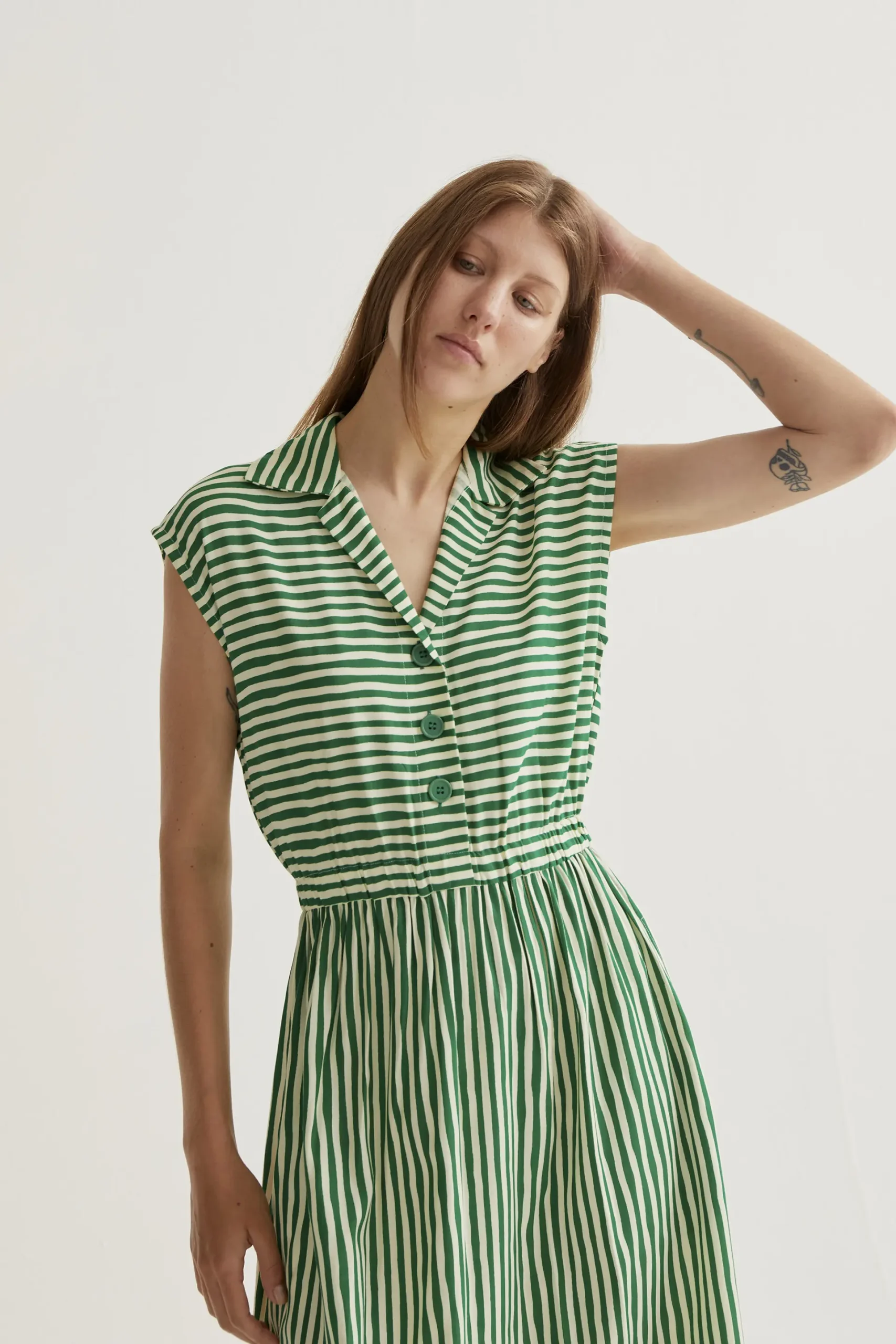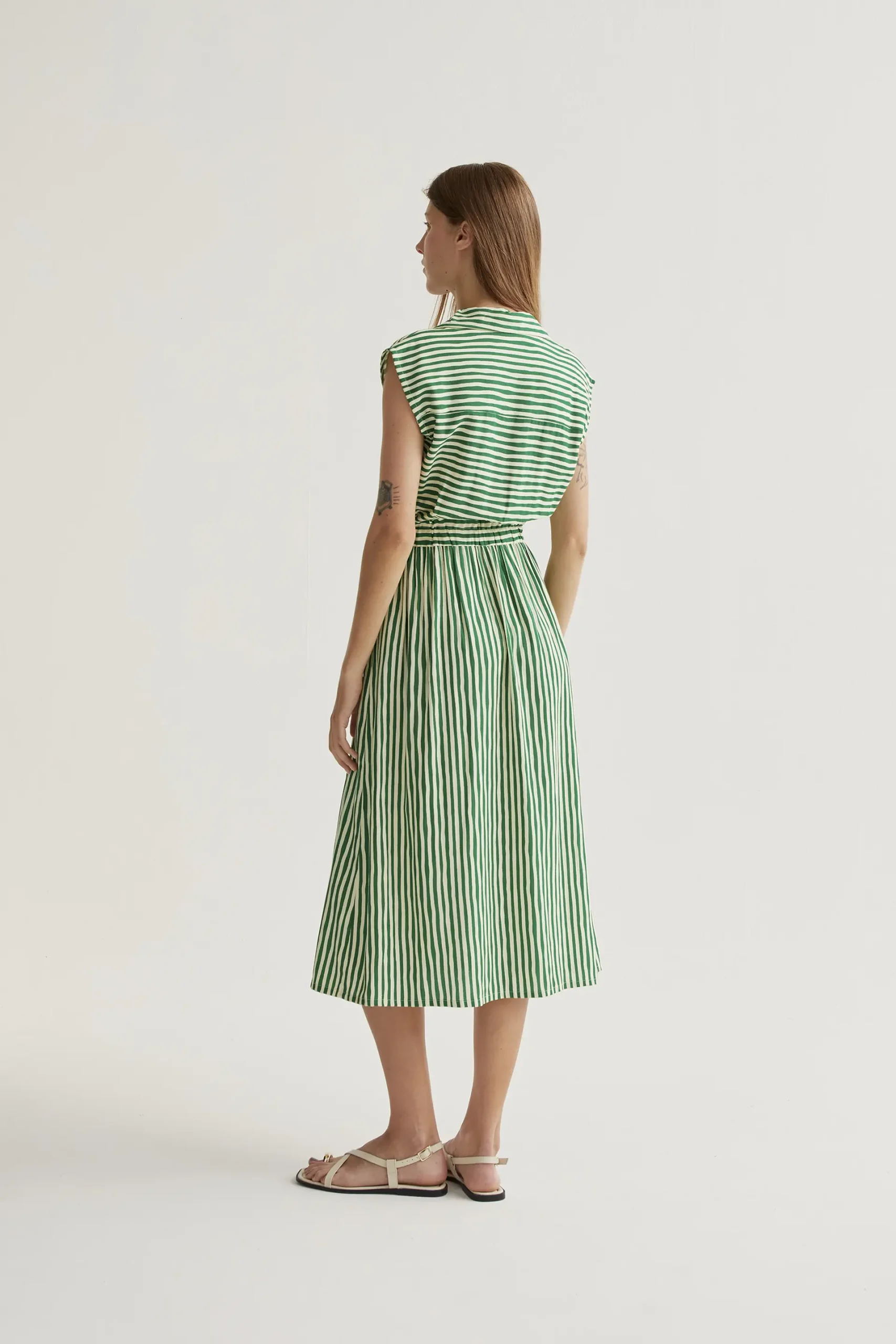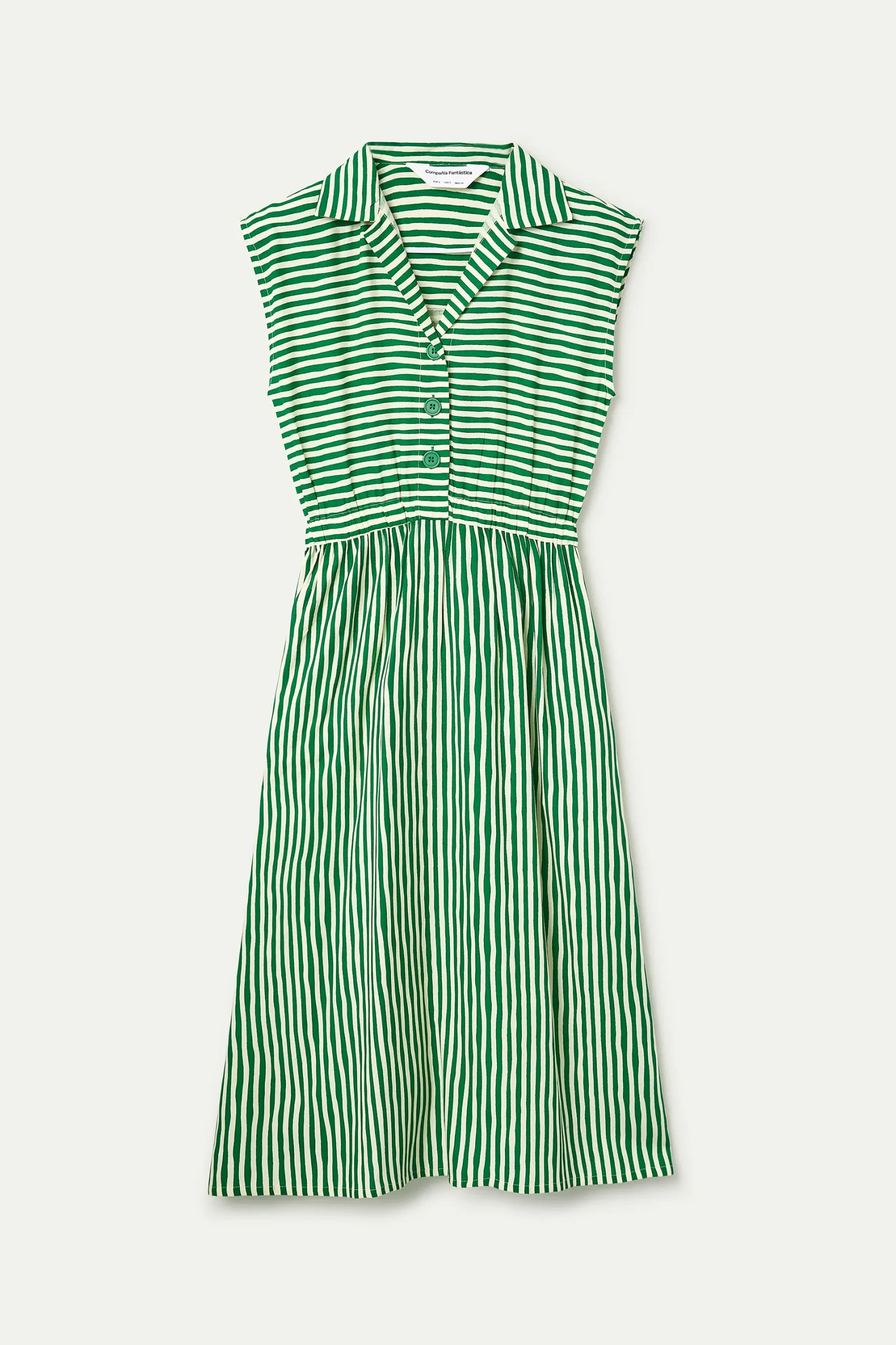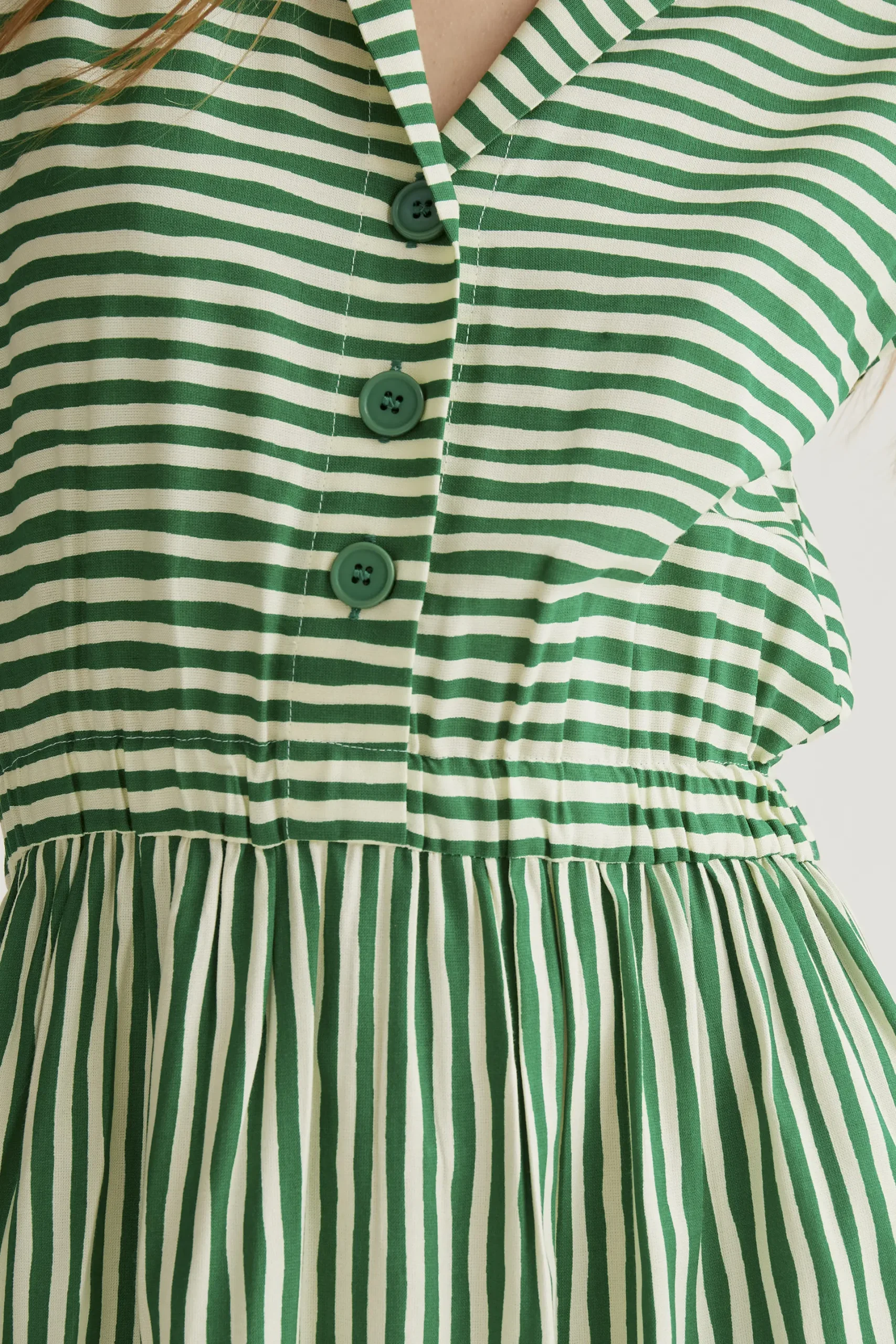 Vestido midi con estampado lavagna green. Cuello con solapa y sin mangas. Cierre frontal con botones de color verde. Cintura elástica. Bolsillos laterales. La modelo mide 177 cm y lleva la talla S.