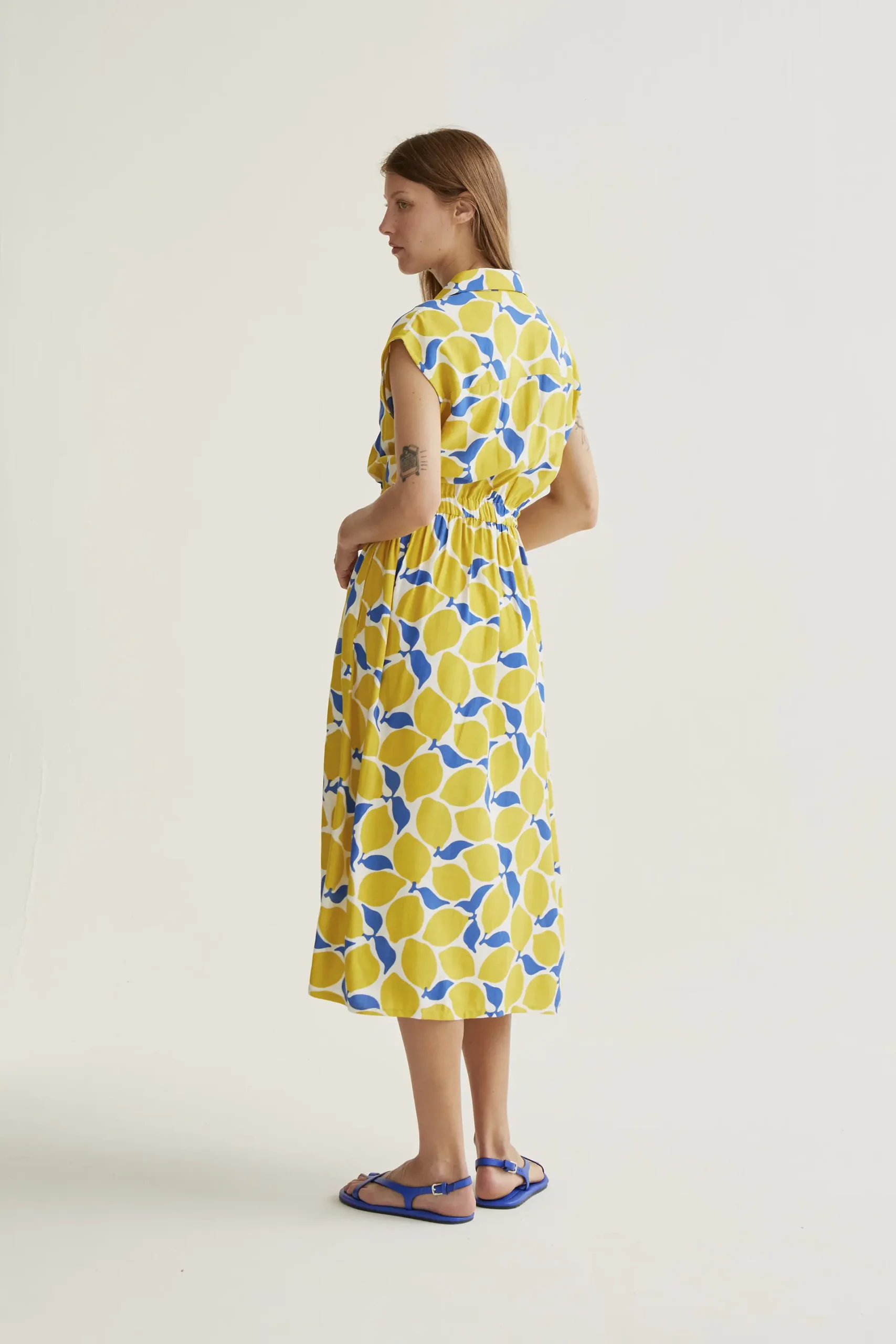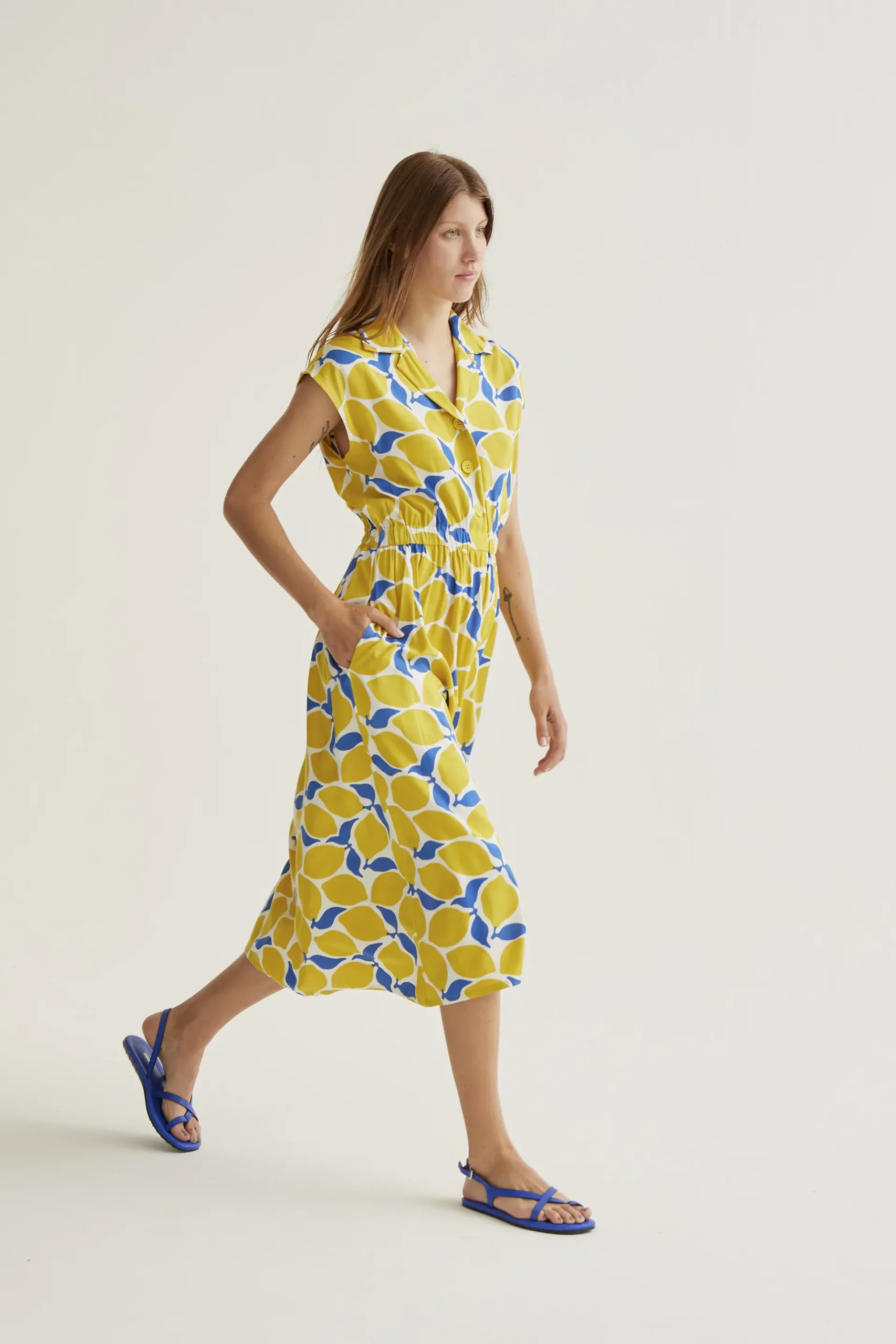 Vestido con estampado limoncello. Cuello con solapa y sin mangas. Cierre frontal con botones de color amarillo. Cintura elástica ajustable. Bolsillos laterales. La modelo mide 177 cm y lleva la talla S.