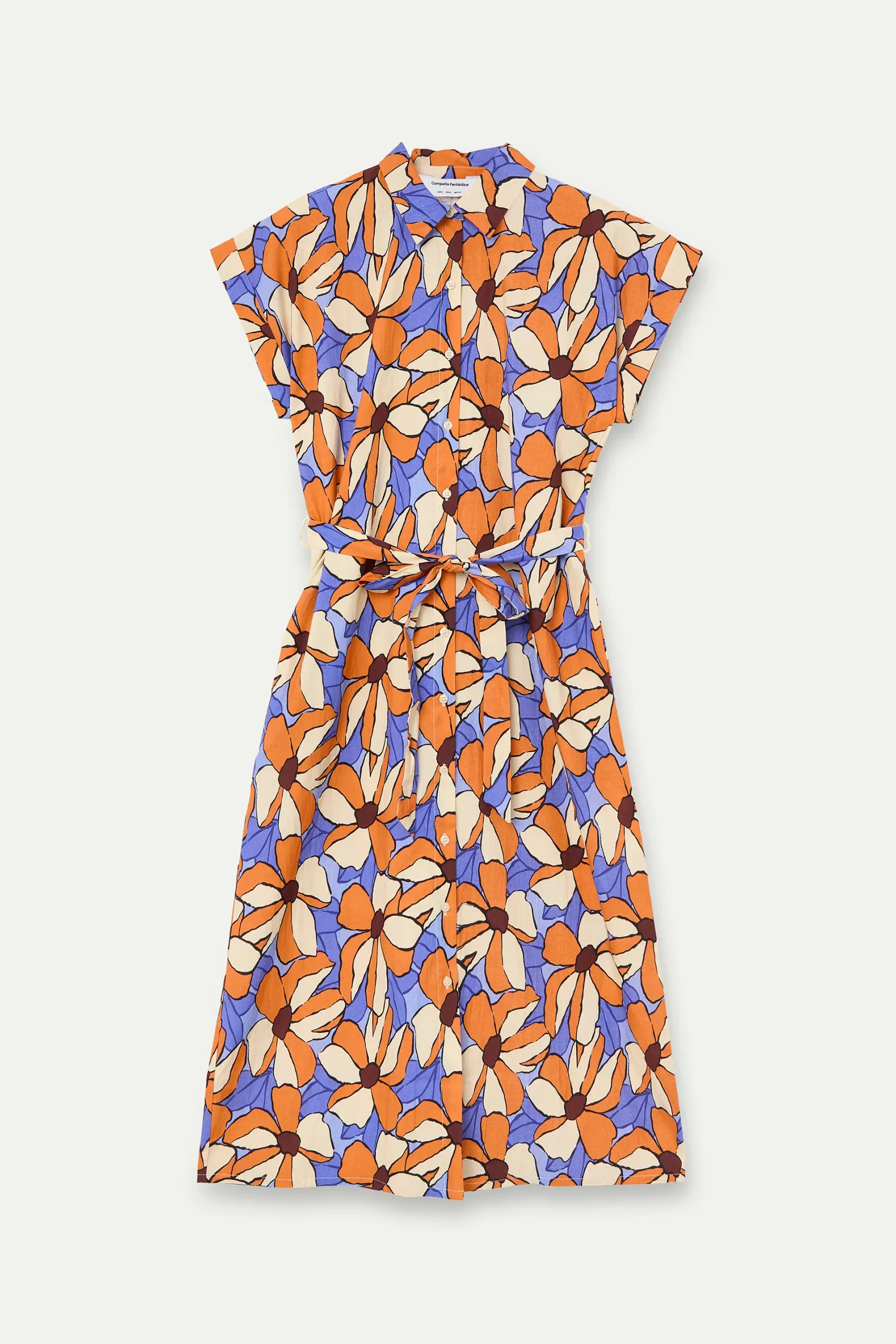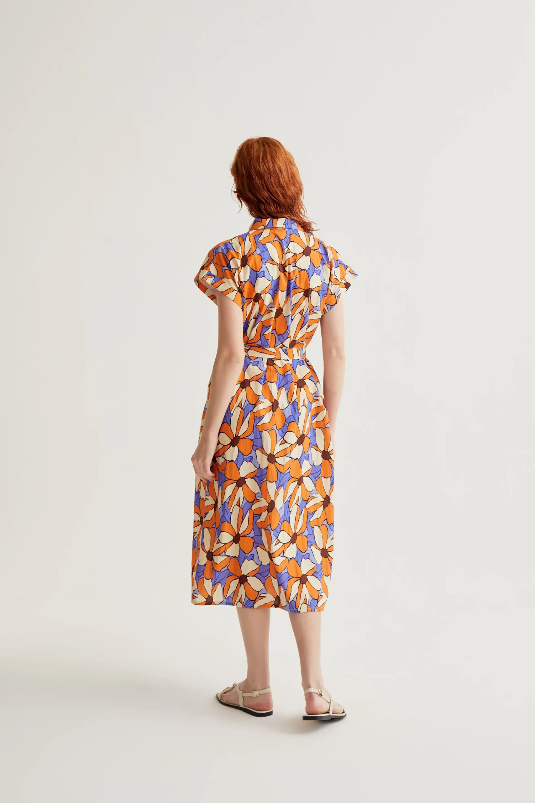 Vestido midi de tejido 100% algodón con estampado marigold. Cuello solapa y manga corta. Cierre frontal con botones. Detalle de cintura lazada. La modelo mide 175 cm y lleva la talla S.