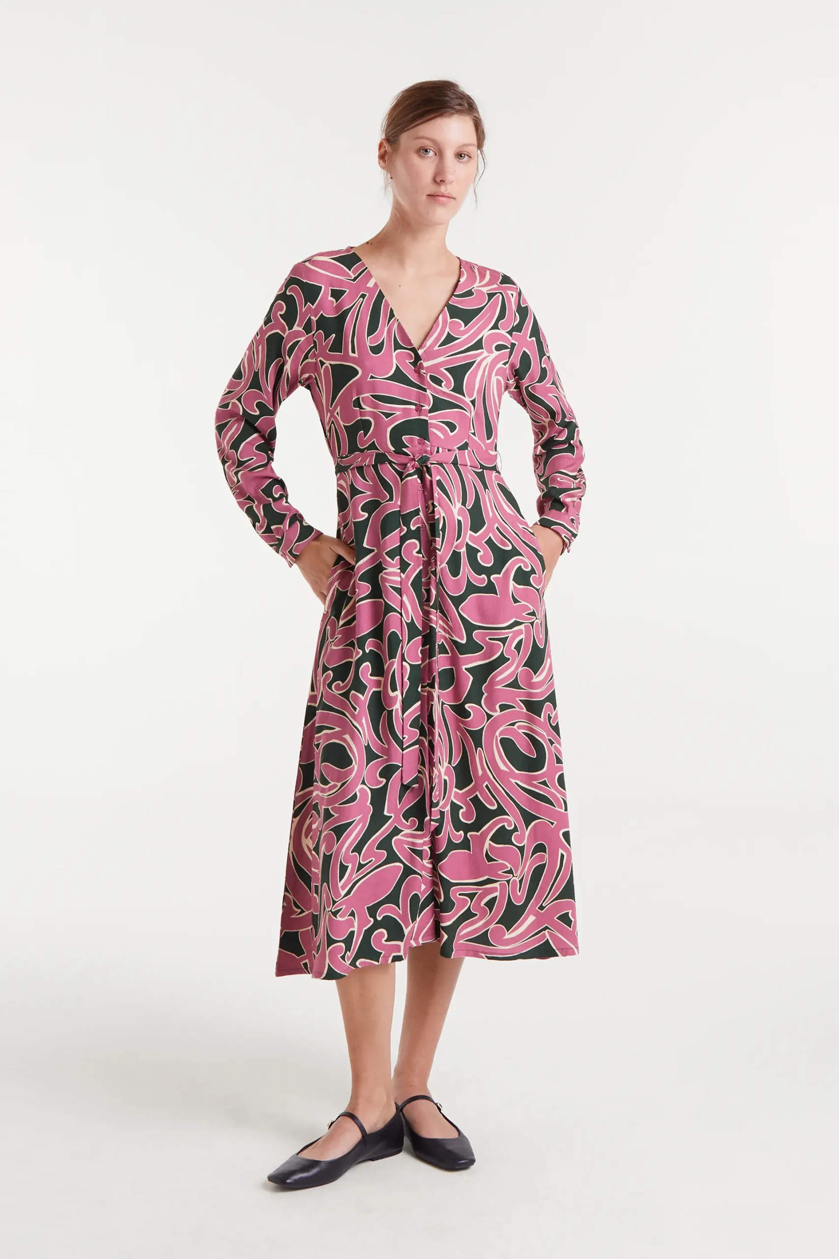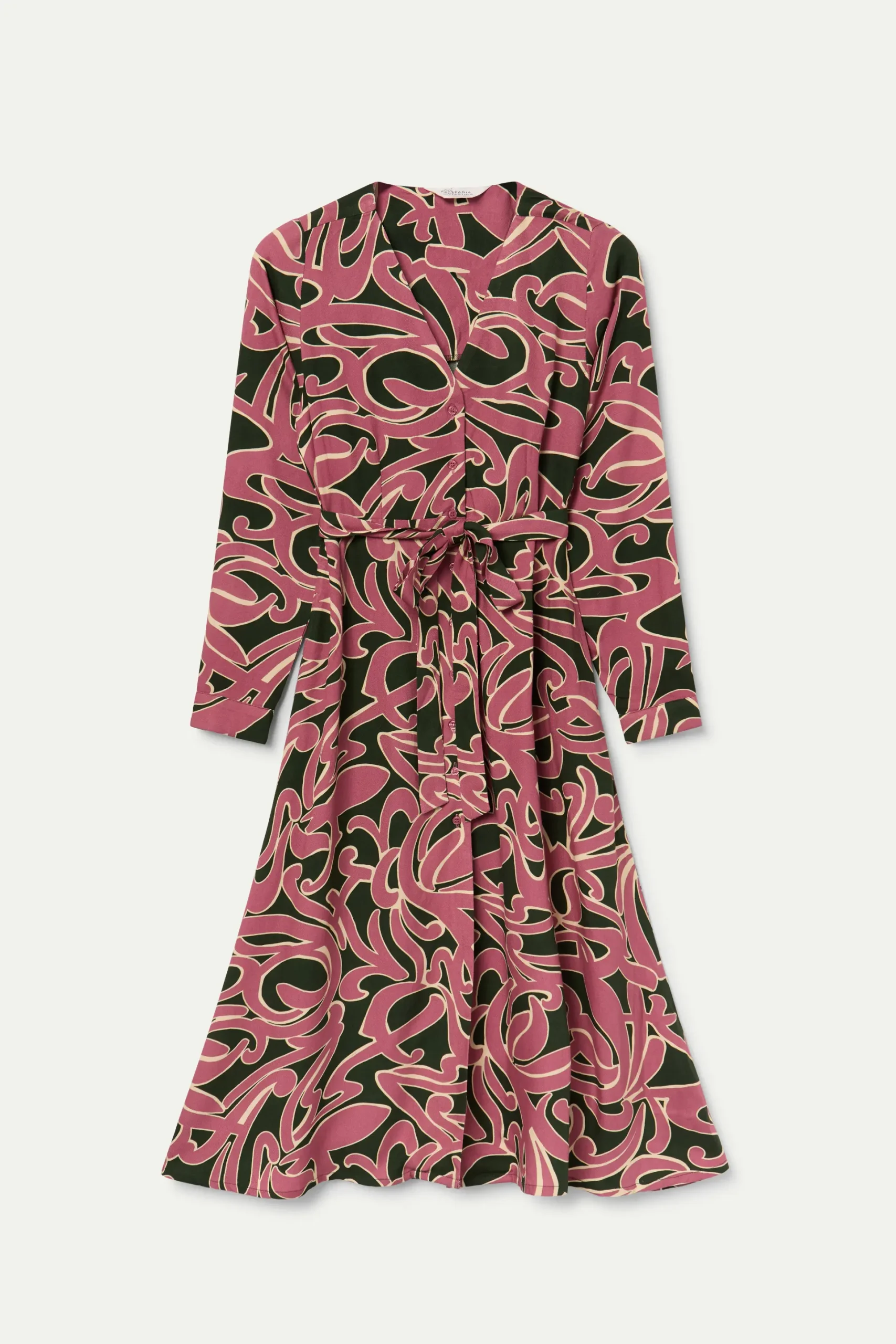 Vestido midi con estampado Pastures. Escote pico y manga larga terminada en puño con botón. Cierre frontal con botones y cintura lazada. La modelo mide 177 cm y lleva la talla S.