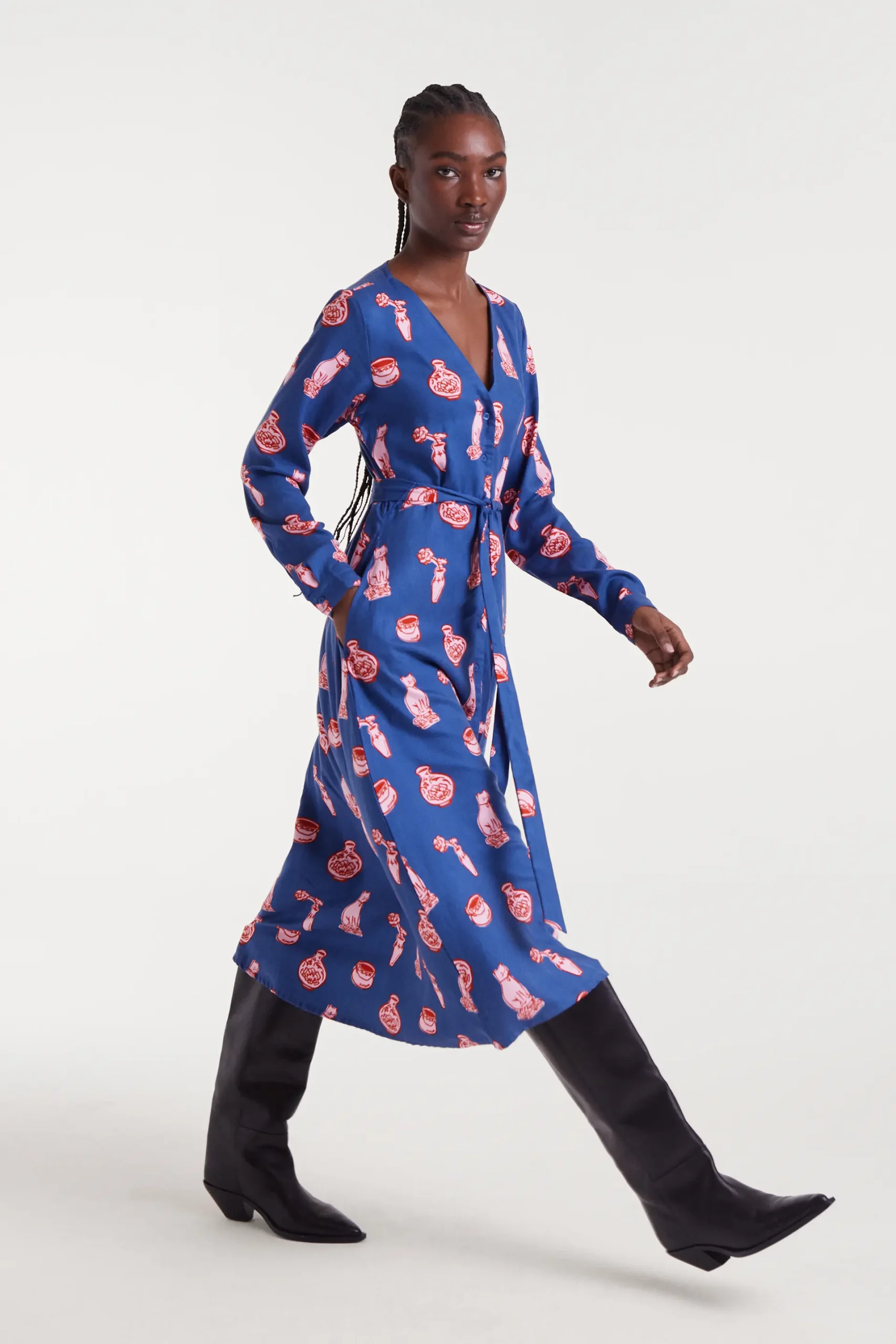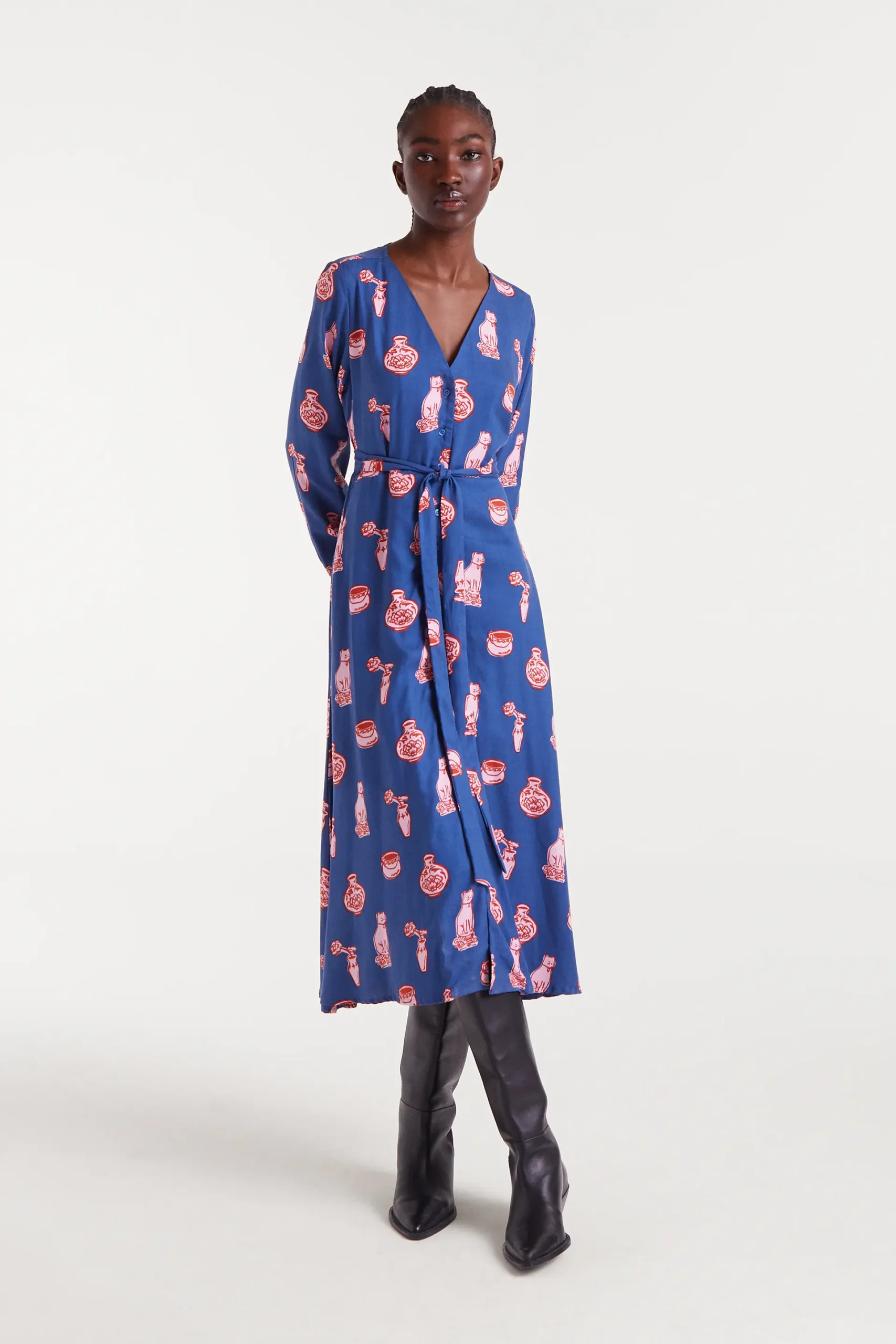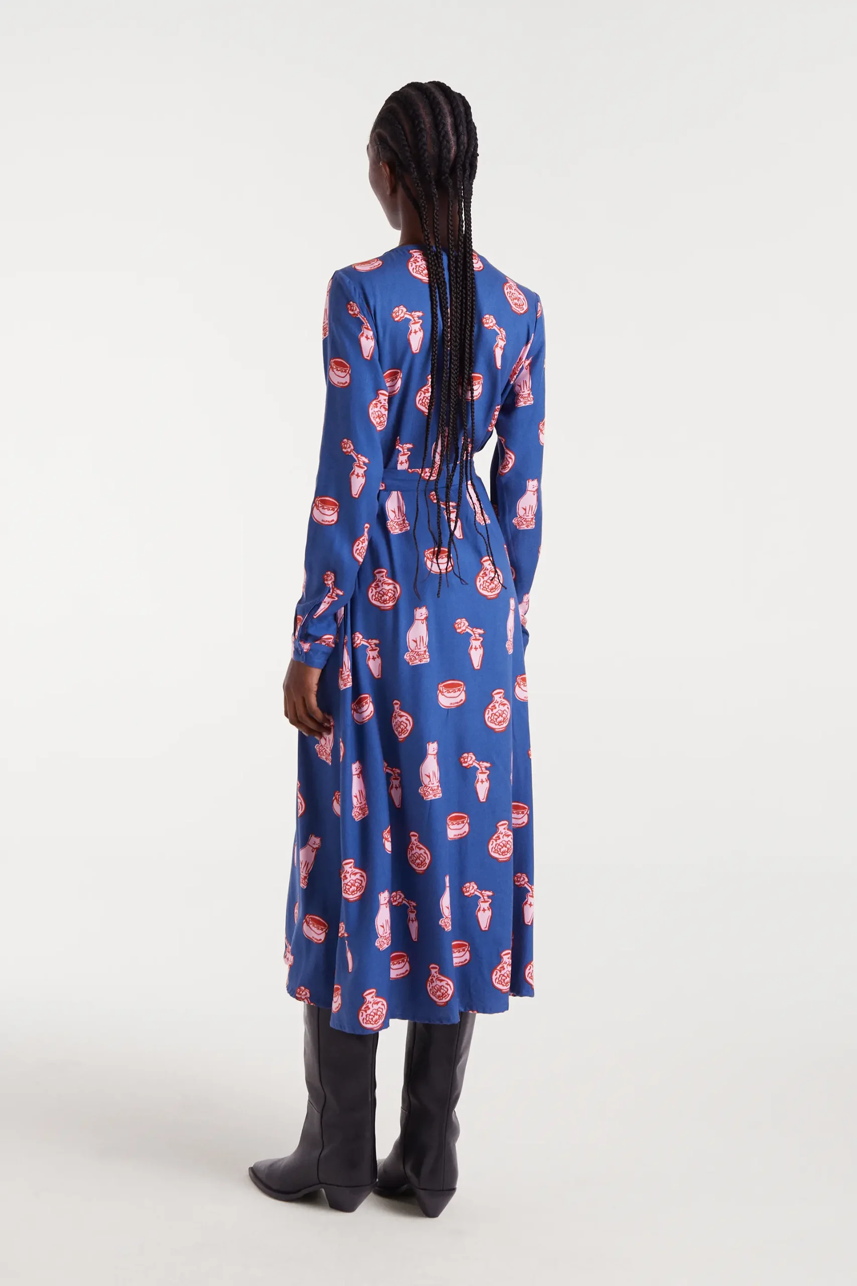 Vestido midi con tejido estampado porcelain. Escote pico y manga larga terminada en puño con botón. Cierre frontal con botones de color azul. Bolsillos laterales.