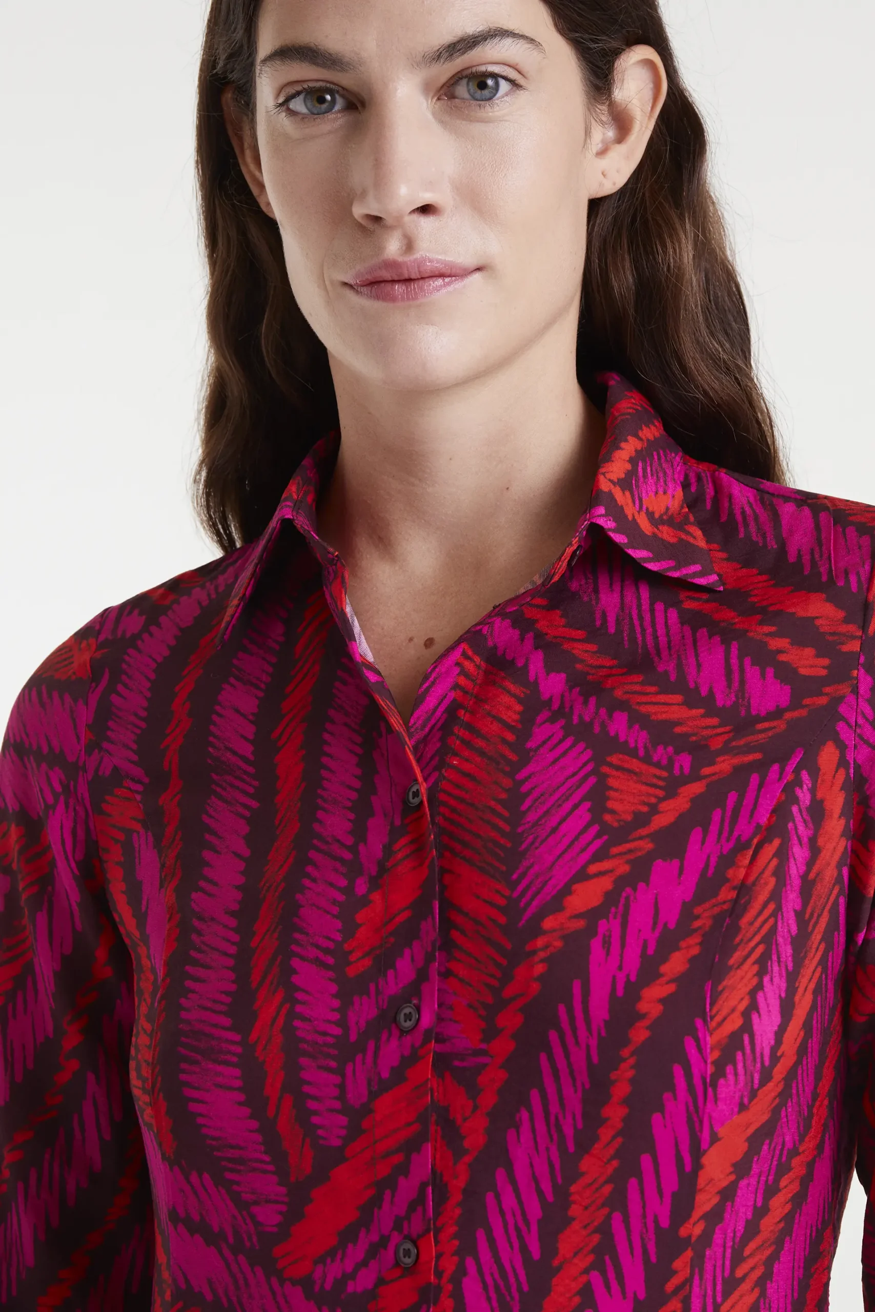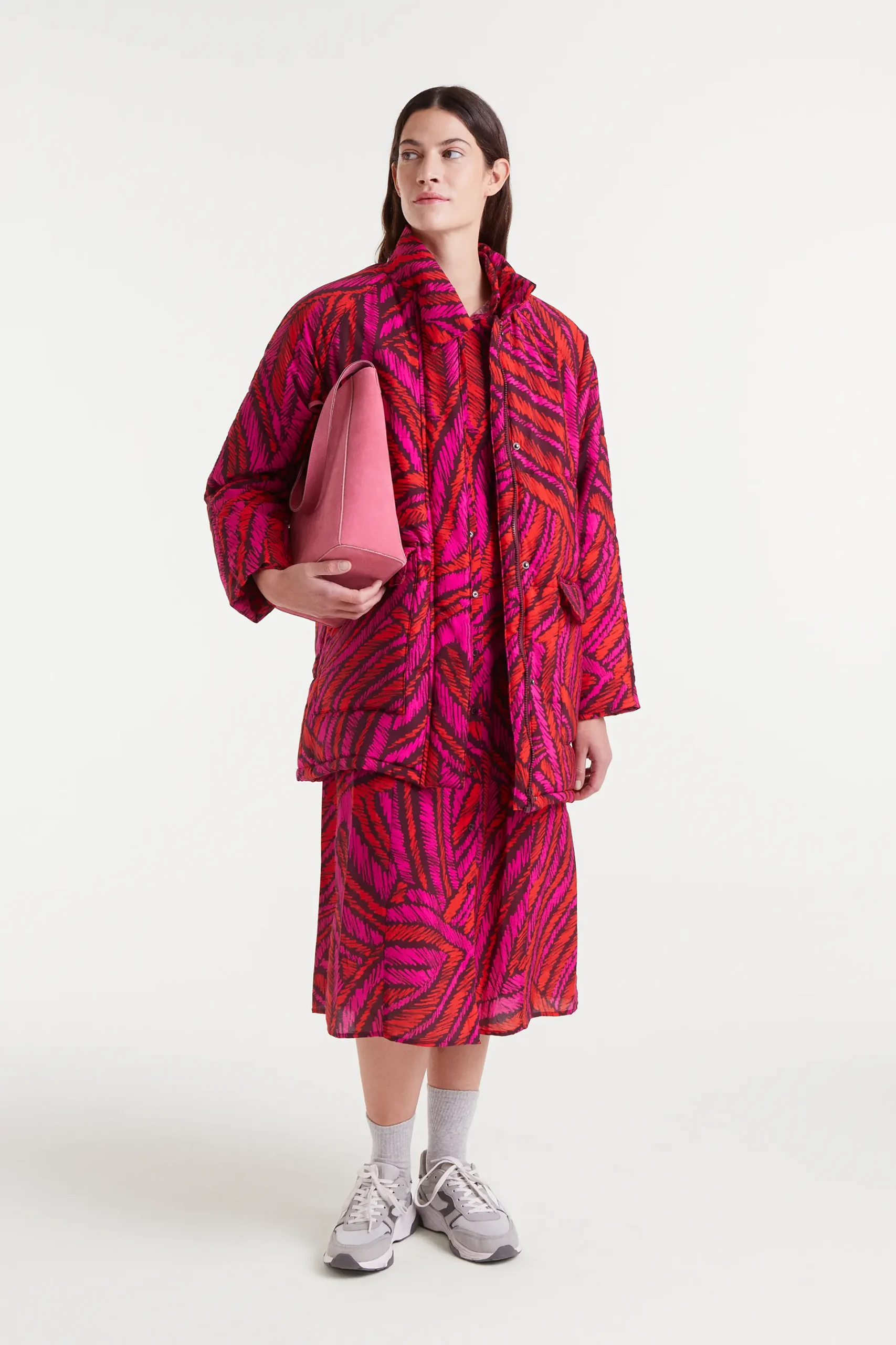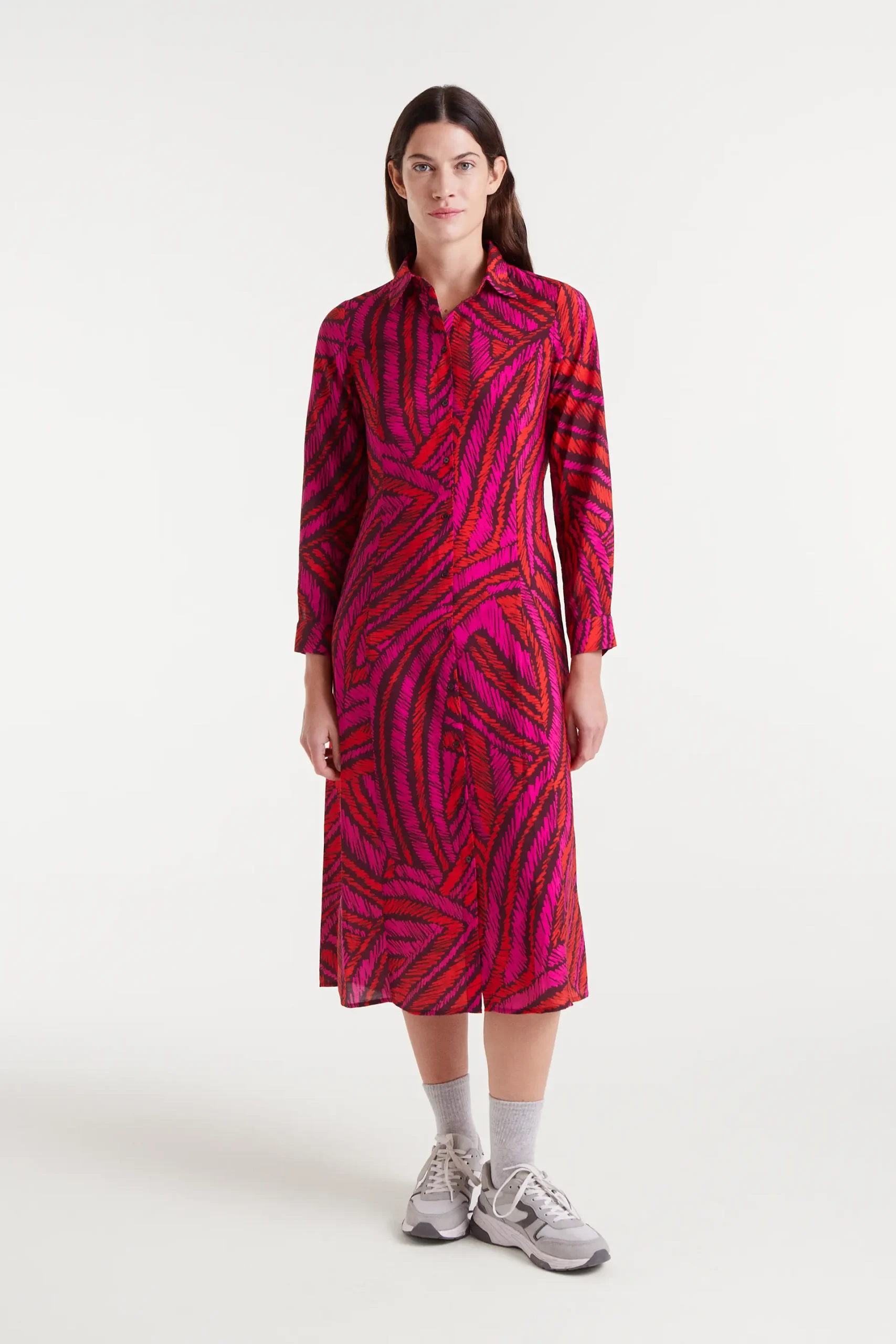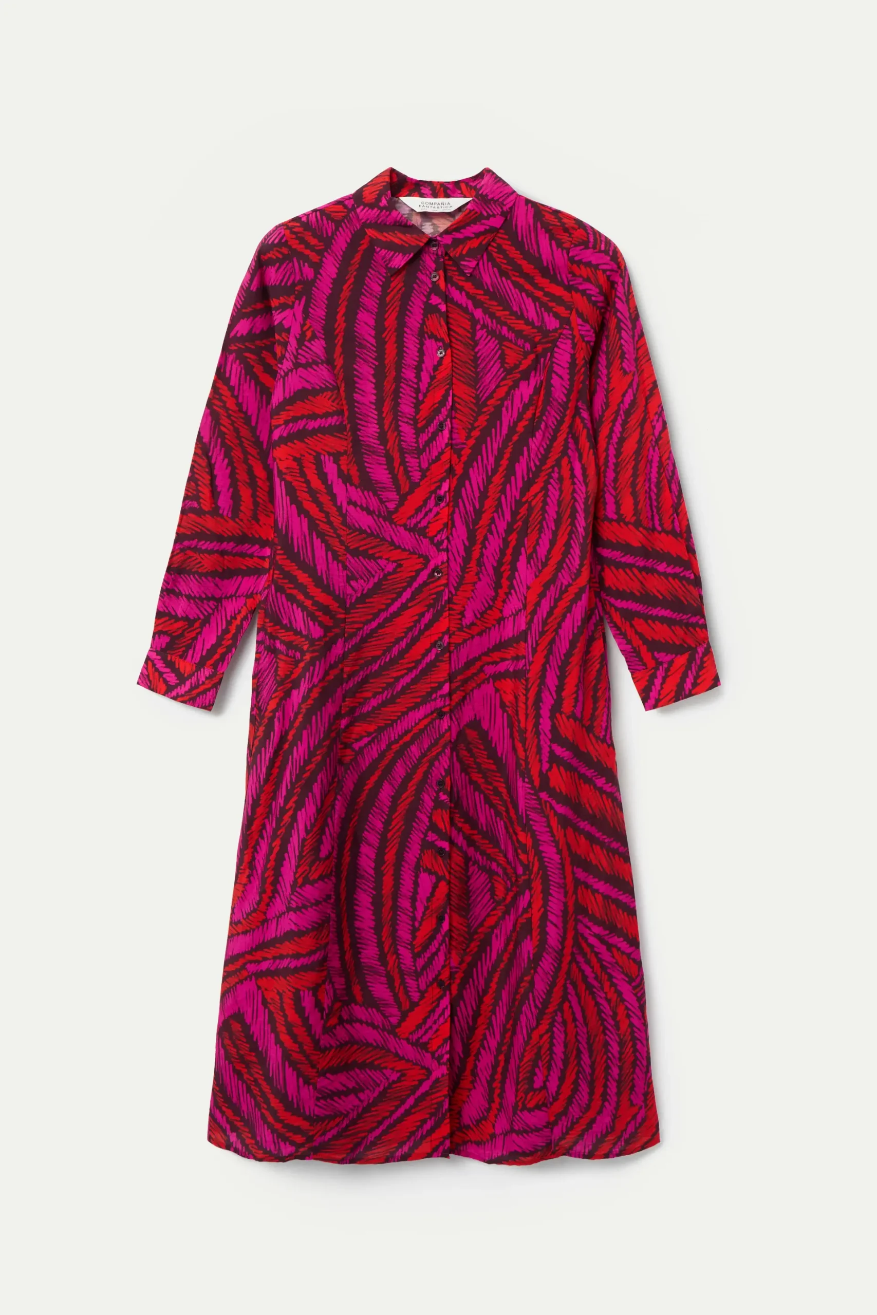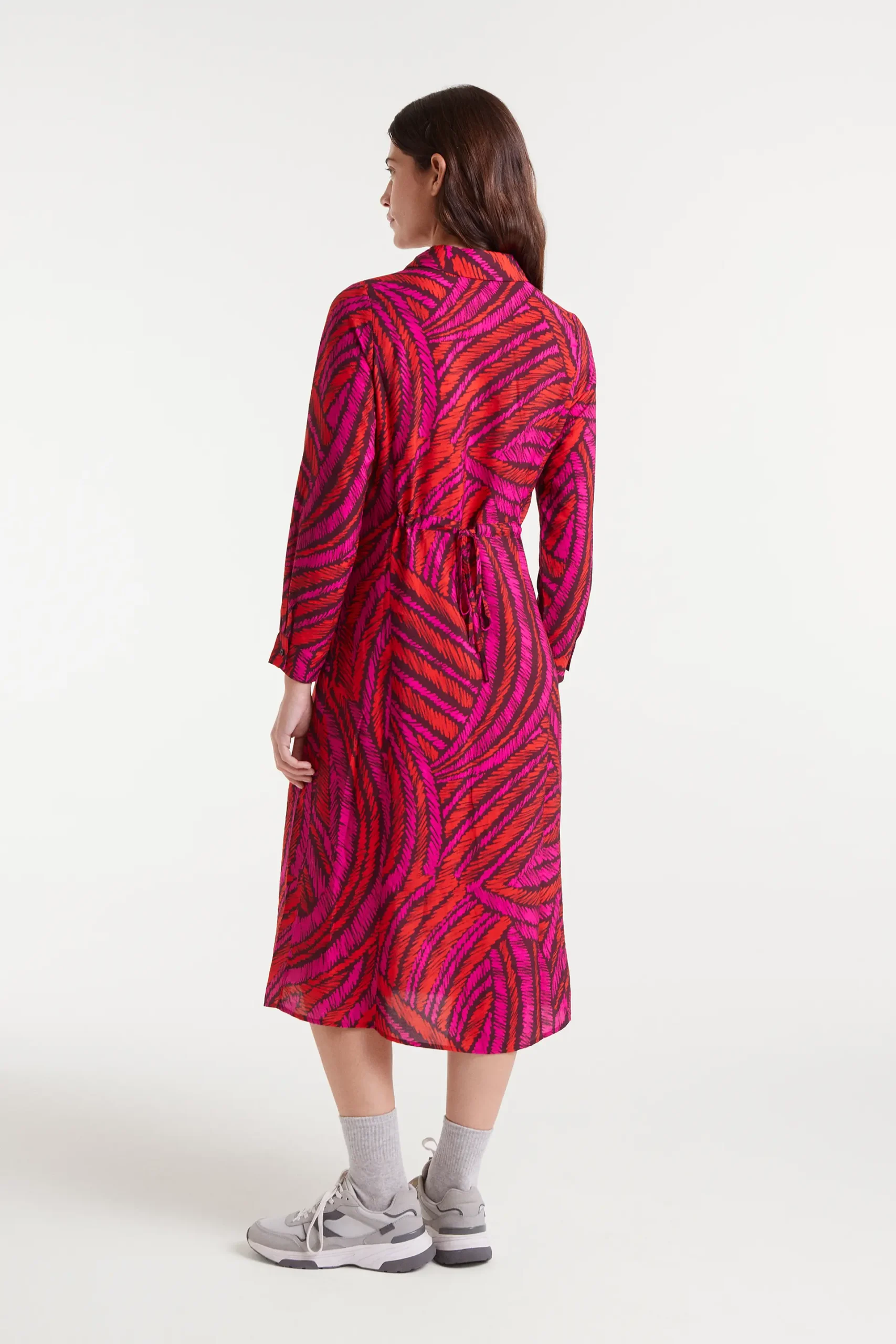 Vestido midi de tejido crepé ligero con estampado Fedora. Cuello solapa con manga larga con puño con botón. Cierre frontal con botones y cintura ajustable con cordón en la parte trasera. Bolsillos laterales. La modelo mide 177 cm y lleva talla S.