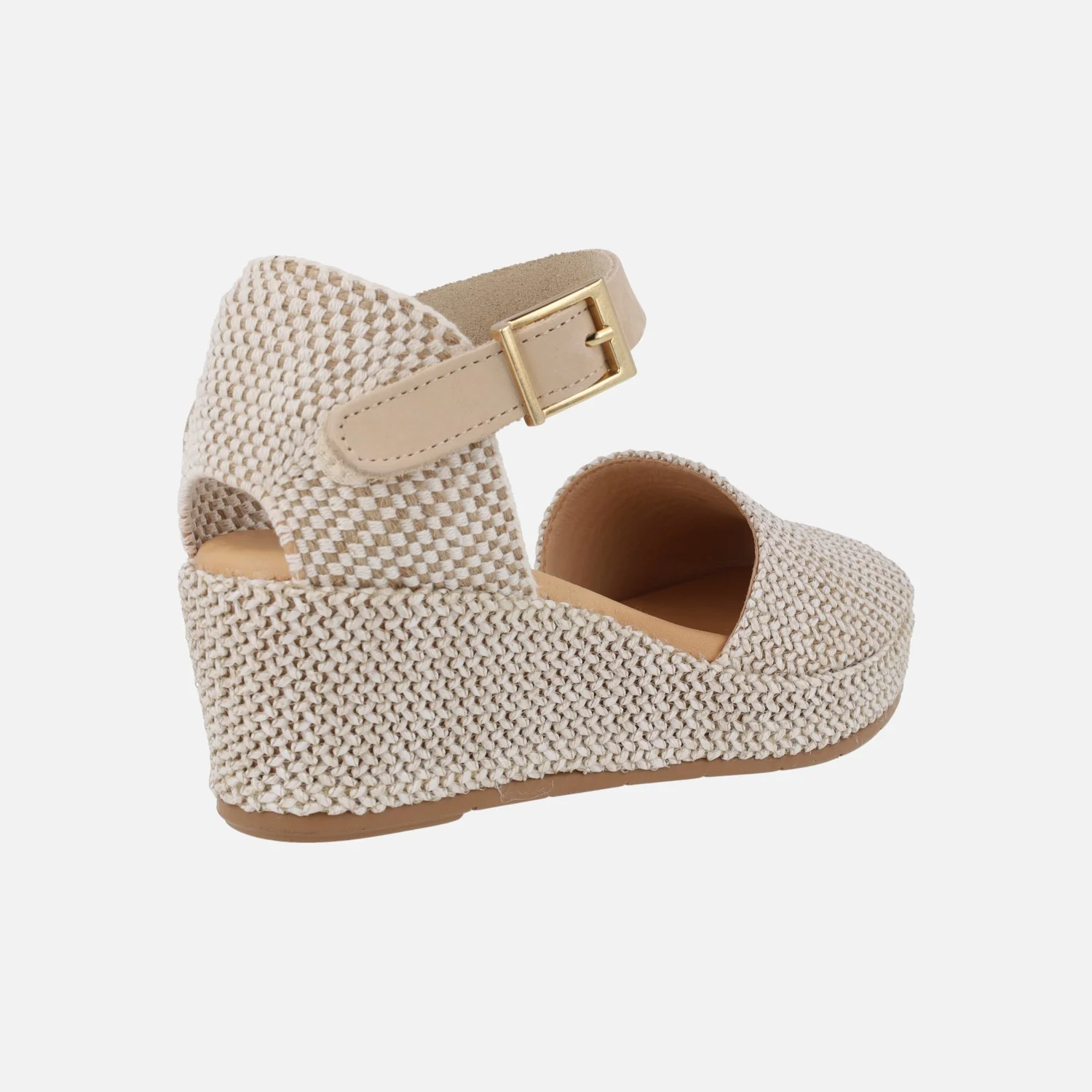 Alpargatas Pitillos modelo 11260, disponibles en natural (beige) y verde kaki. Zapatillas abiertas de puntera, con pieza textil en el talón y una pulsera de piel al tobillo con cierre ajustable de hebilla. Elaboradas en tejido rafia. Interior textil con plantillas de piel. Cuña de 5,5 cm de altura trasera (2 cm parte delantera).