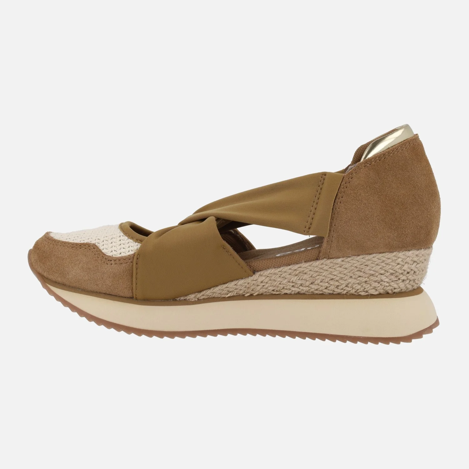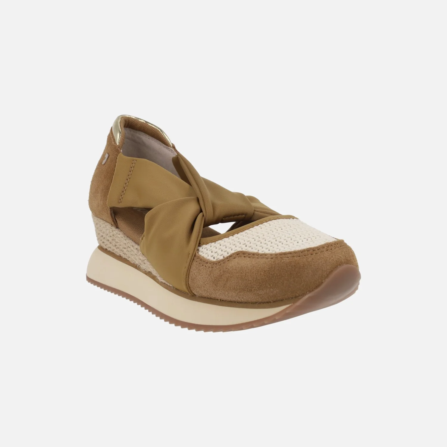 Zapatillas deportivas abiertas para mujer de la marca Gioseppo modelo VUKA 78133 Camel. Zapatillas elaboradas en piel serraje combinada con tejido crochet, en tonos camel y beige. Tiras que sujetan al empeine y lo cruzan haciendo nudo. Interior textil con planta acolchada. Suela de TPR, entresuela de EVA. Pequeña cuña forrada imitando yute. Altura trasera 6 cm (2 cm parte delantera).