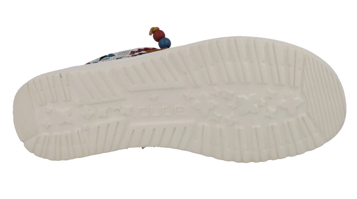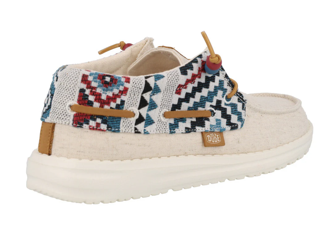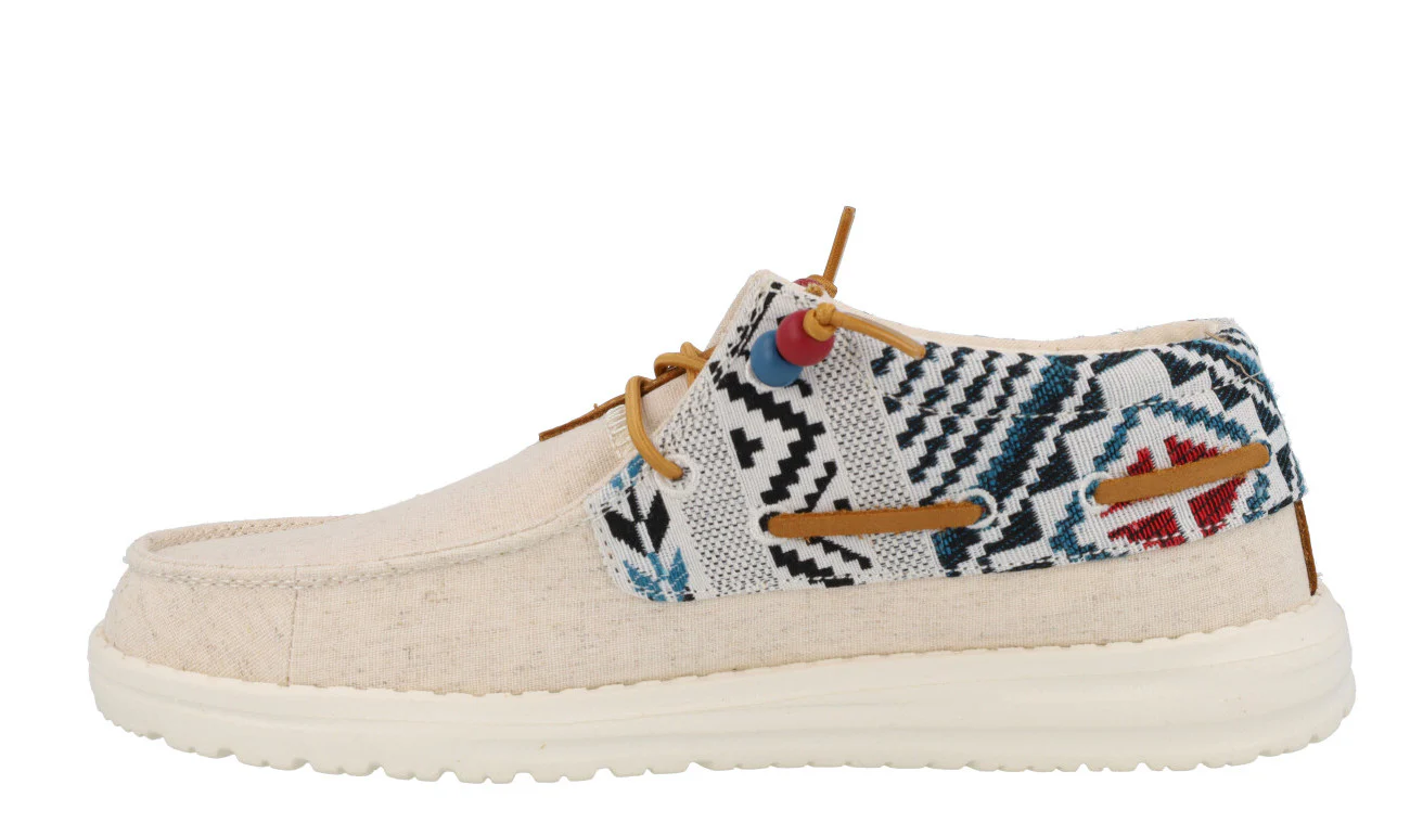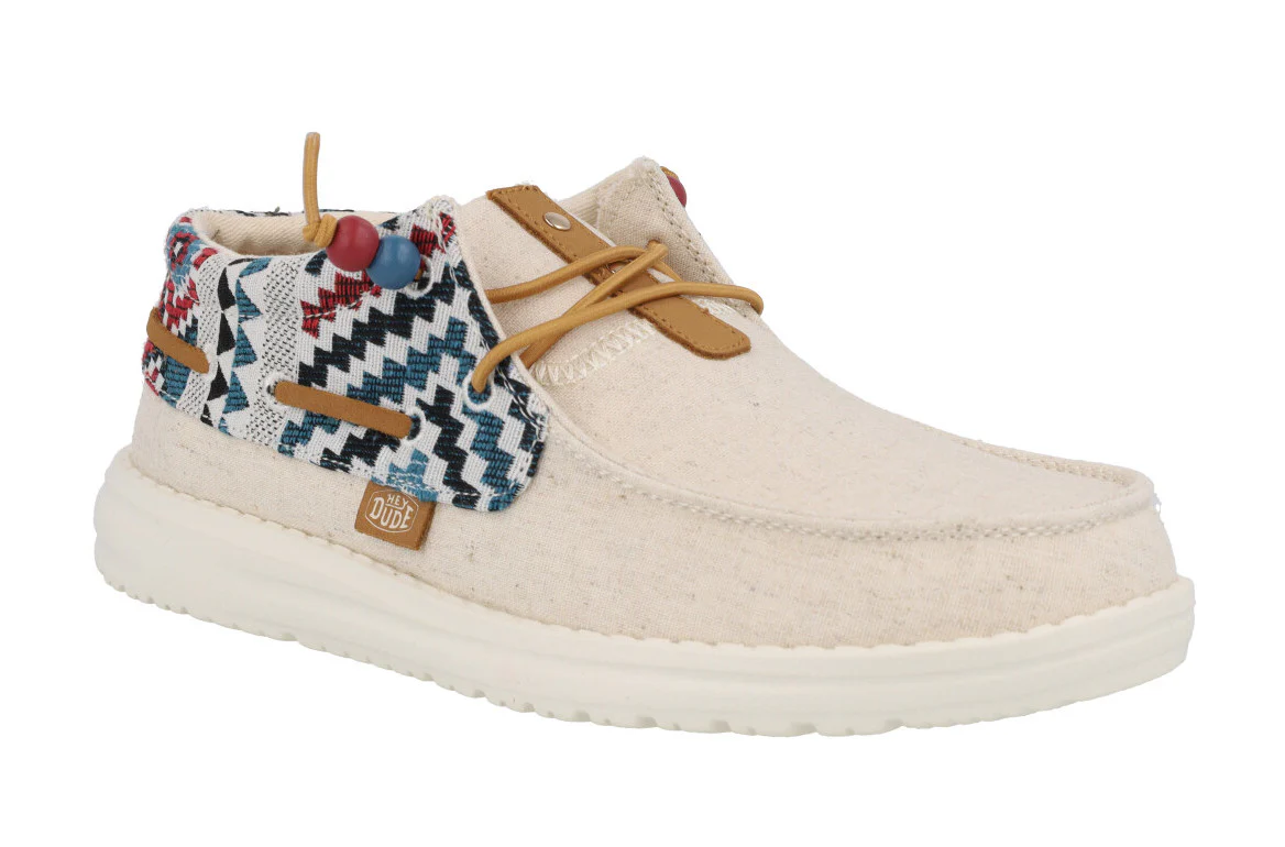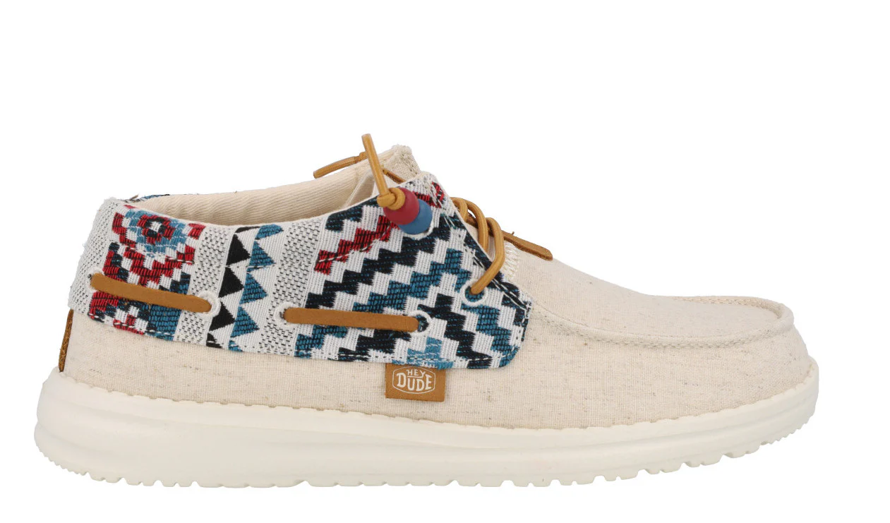 Zapatillas abotinadas para mujer de la marca Hey Dude modelo Ellie Festival Joshua Tree. Zapatillas elaboradas en tejido beige con detalle de pieza haciendo mosaico en la parte trasera. Cordones y pasados en camel. Interior textil, plantillas de piel extraíbles. Piso de goma EVA muy ligero, de 3 cms de altura.