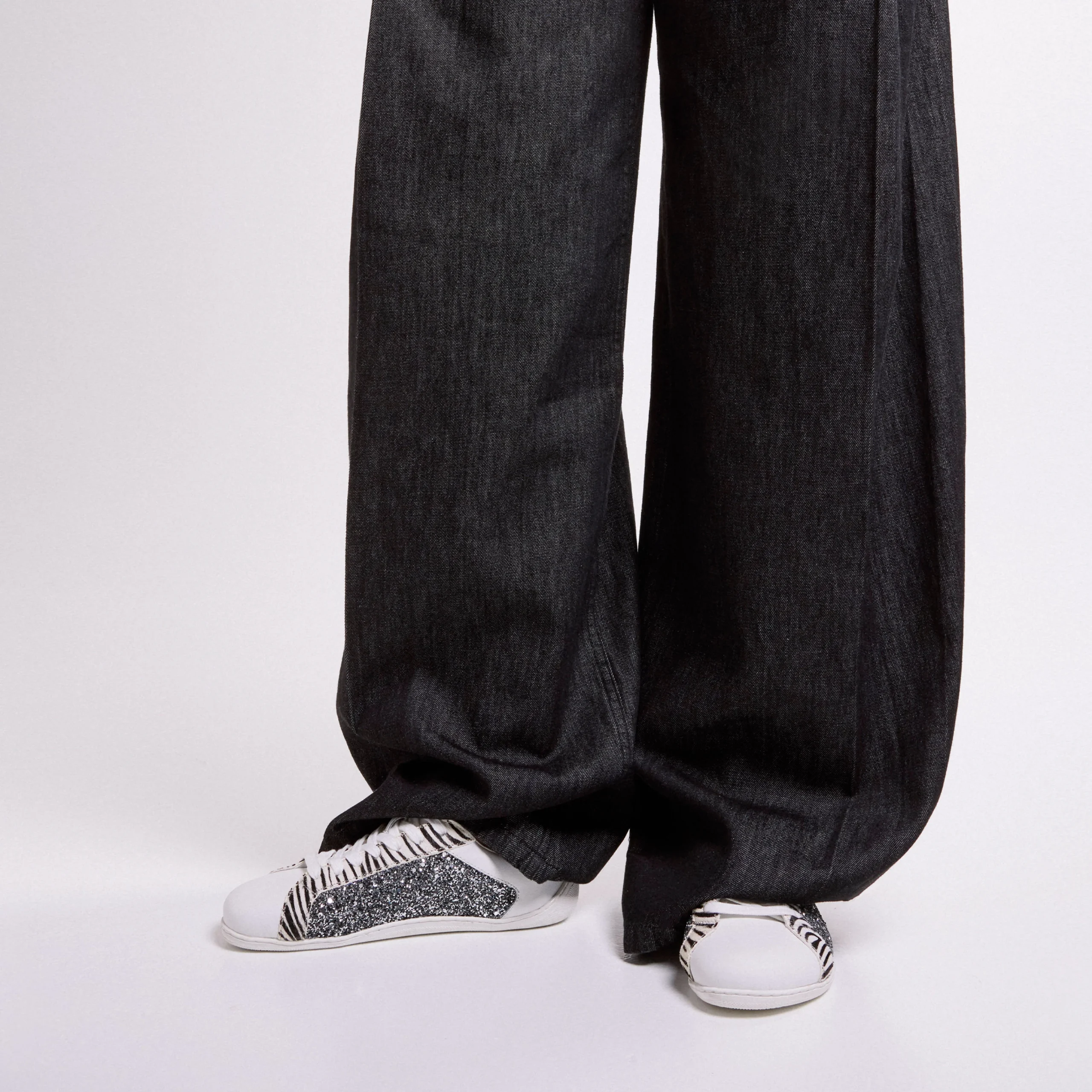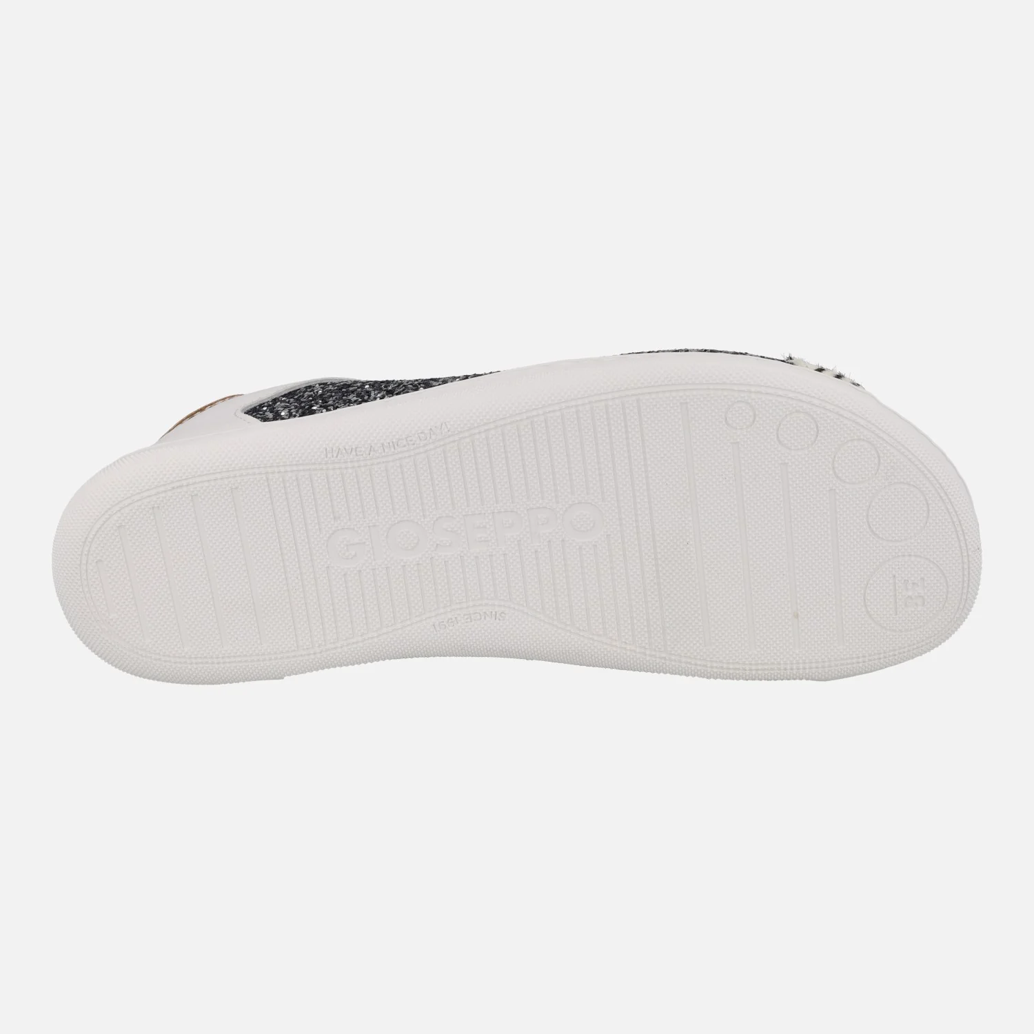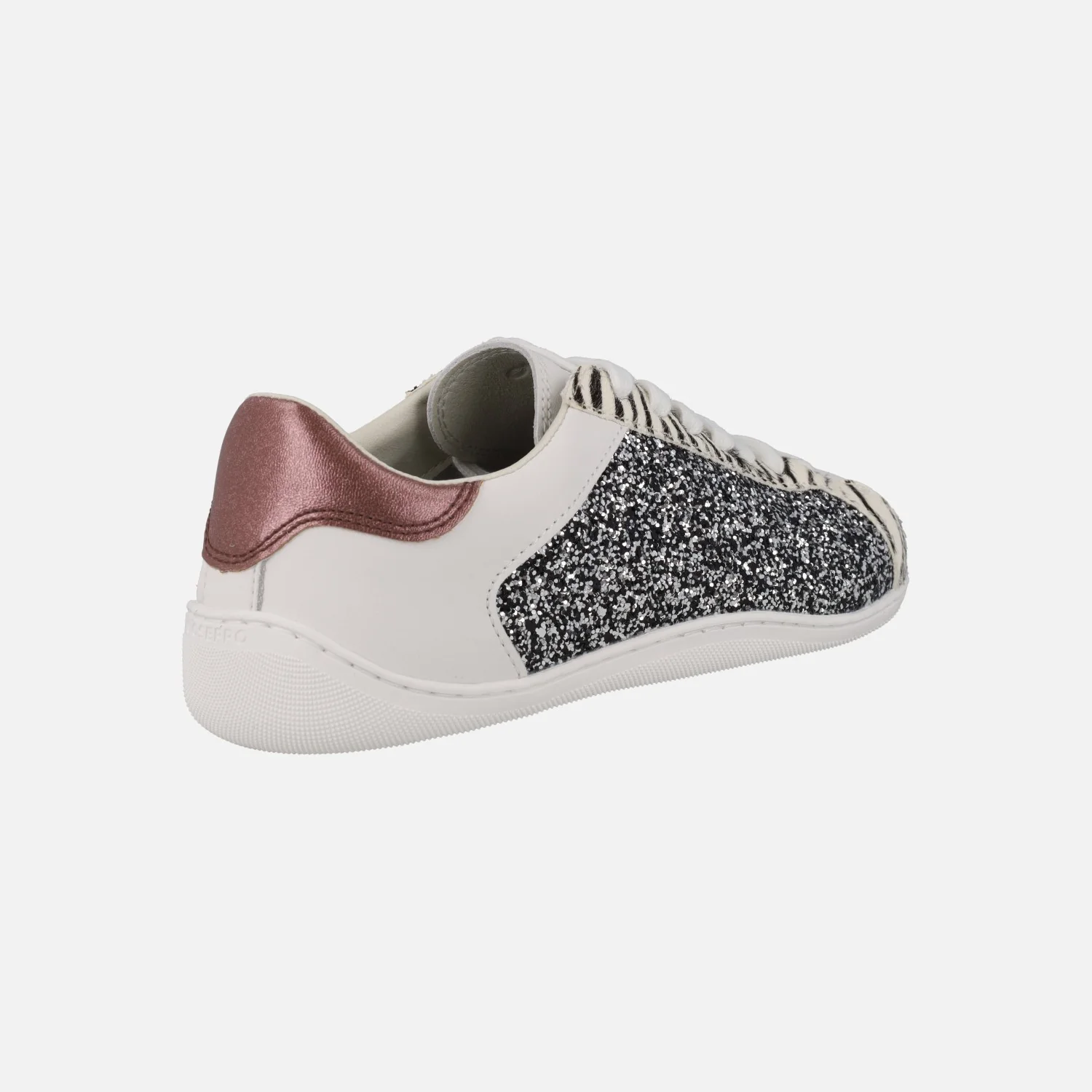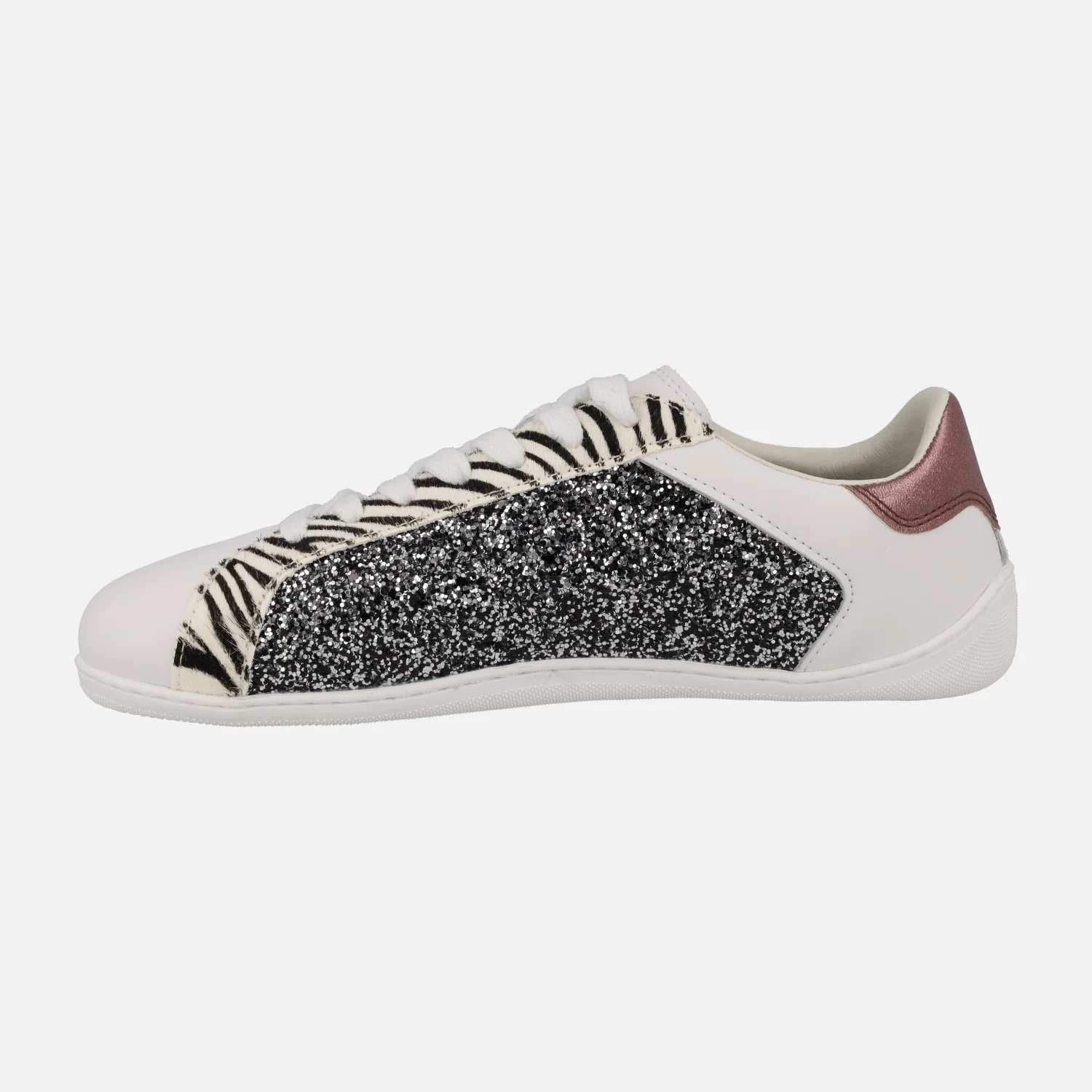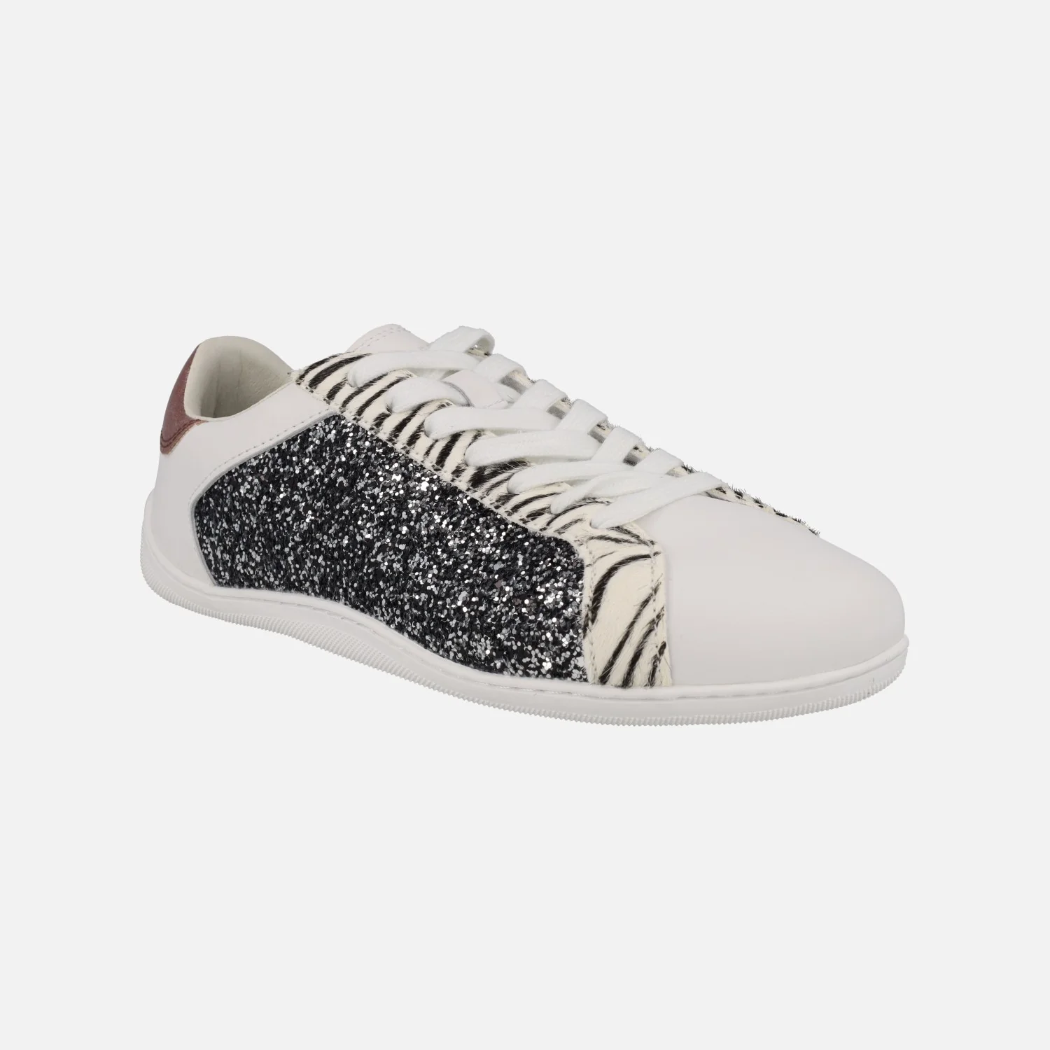 Zapatillas deportivas BAREFOOT de la marca Gioseppo modelo 764564 Leelanau Plomo. Zapatillas deportivas blancas de piel, con detalles de glitter plomo y animal print cebra. Interior textil con plantillas extraíbles. Piso flexible de TPR con una altura de 1,5 cm. Puntera amplia, Drop cero.