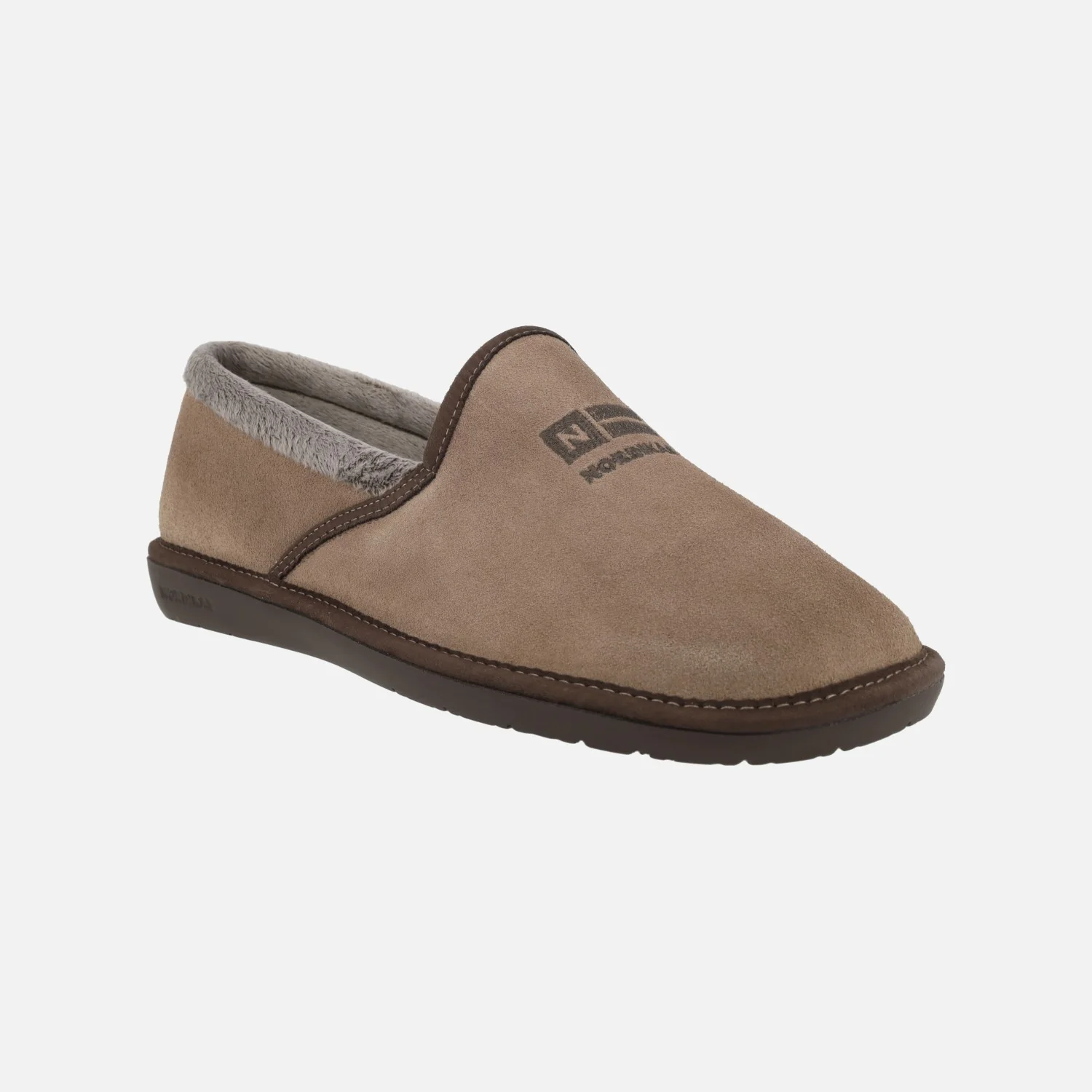 Zapatillas de casa para hombre de la marca española Nordikas, modelo Top Line 243 en Afelpado piedra. Zapatillas cerradas, elaboradas en piel serraje color taupe, con ribete de pelo en la parte trasera. Forro y planta en tejido afelpado suave. Piso ligero de goma.