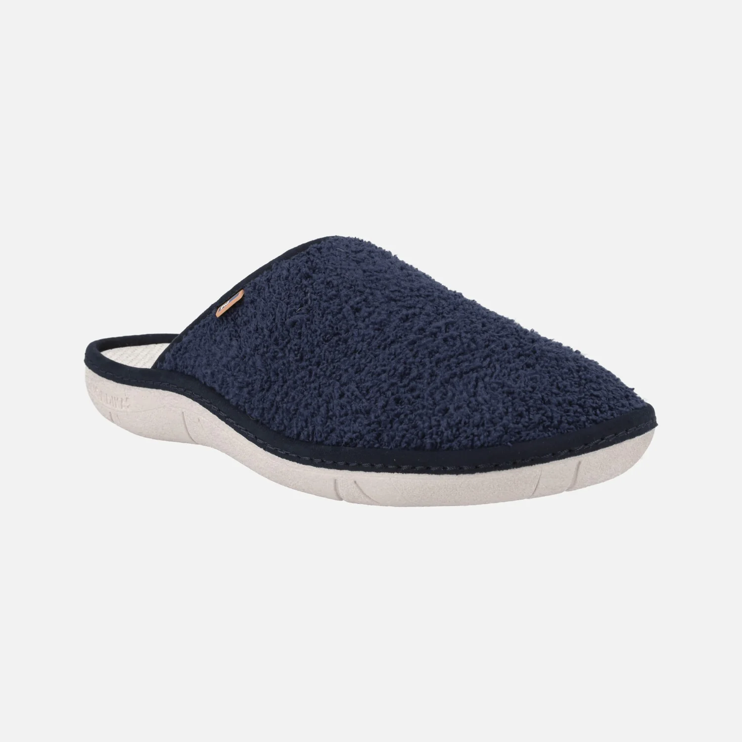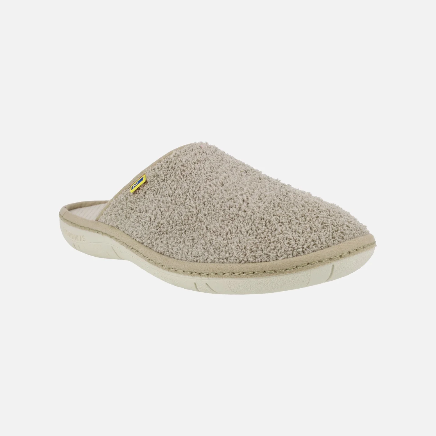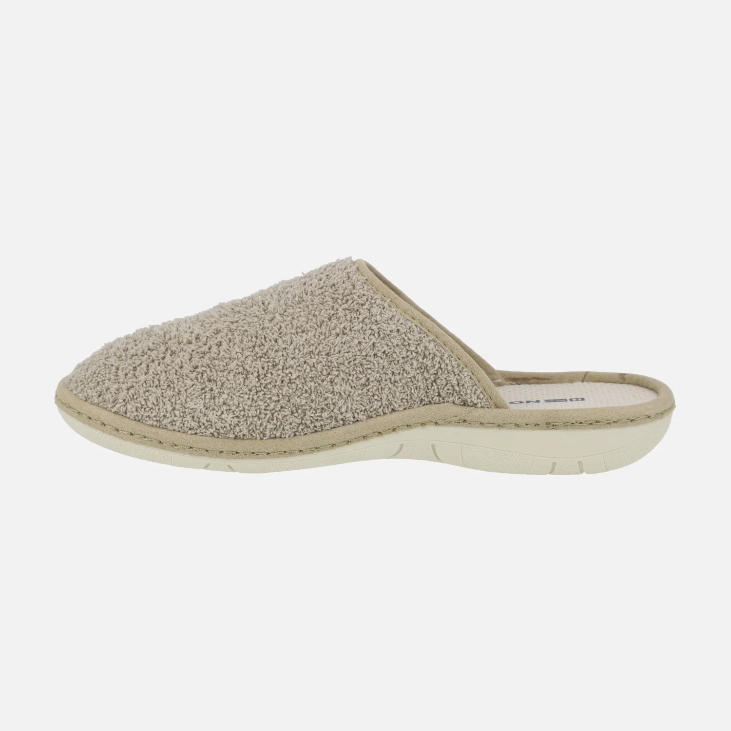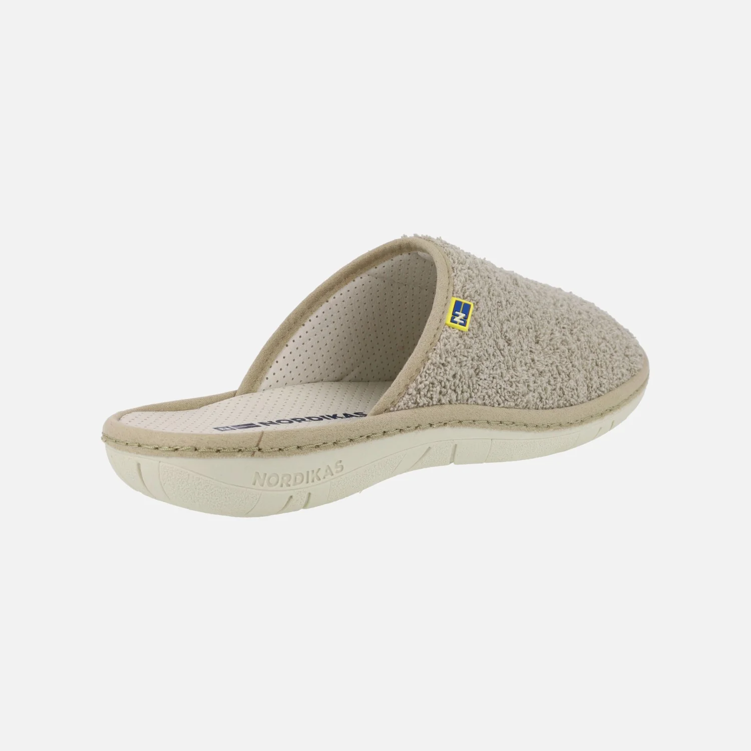 Zapatillas de casa para hombre de la marca Nordikas, modelo 2044 Rizo. Zapatillas de casa en tejido toalla color beige (arena), azul marino, verde kaki o gris. Zapatillas descalzas de talón, con interior textil (microfibra). Piso ligero de goma. Nordikas, Made in Spain.