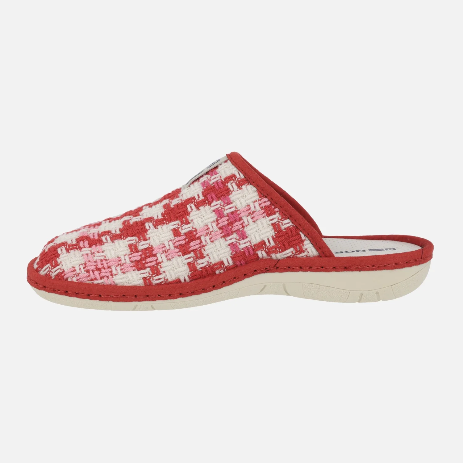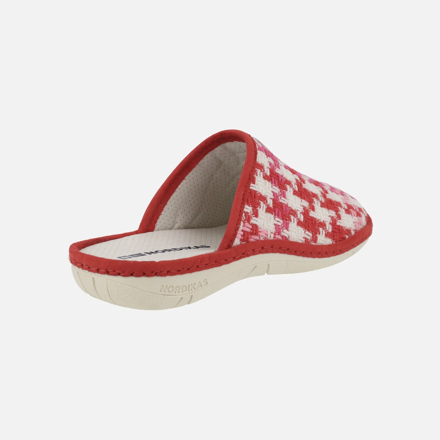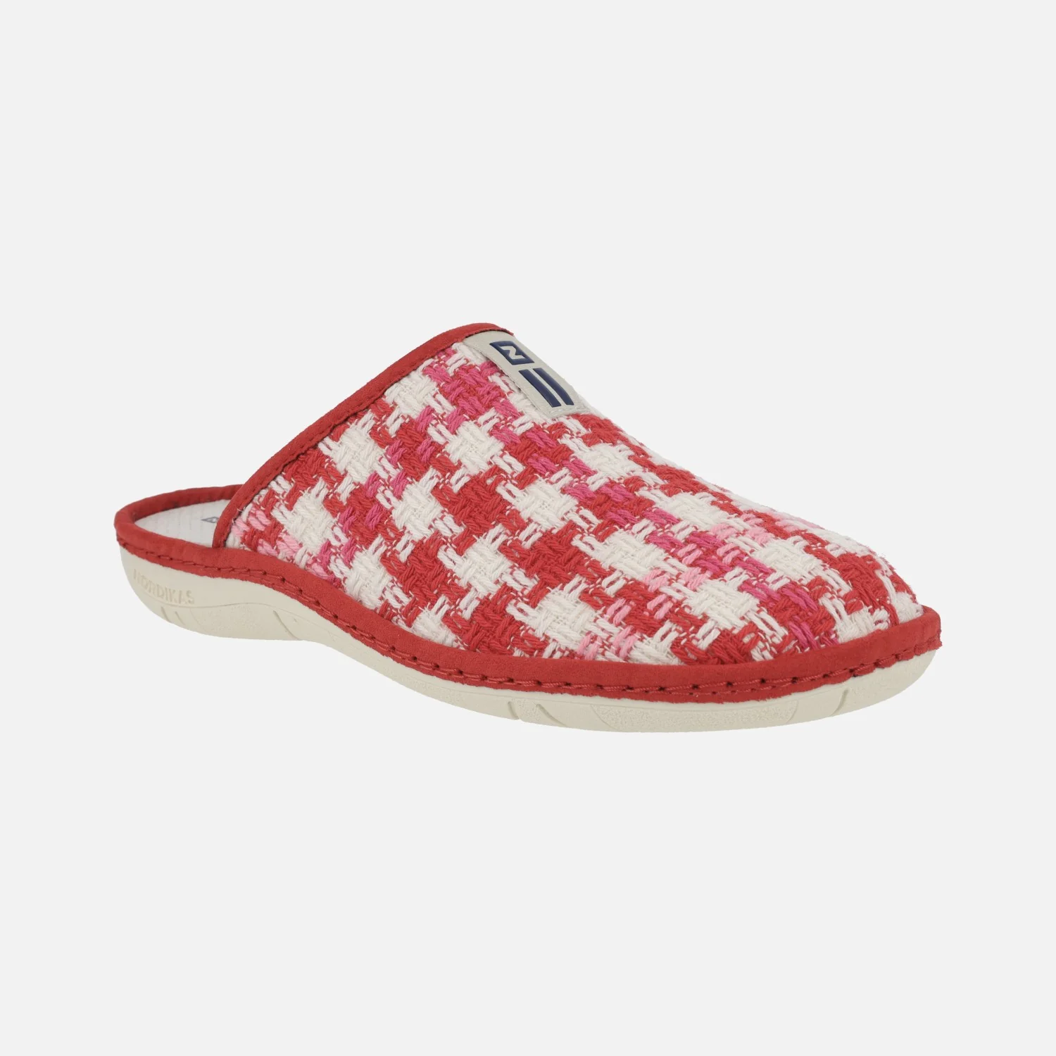 Zapatillas de casa para mujer de la marca Nordikas modelo 1836 Marsella Rojo. Zapatillas descalzas de talón, con pala en tejido trenzado combinando rojo, rosa y blanco. Interior textil con planta acolchada (microfibra). Piso de goma antideslizante, de 3 cms de altura trasera.