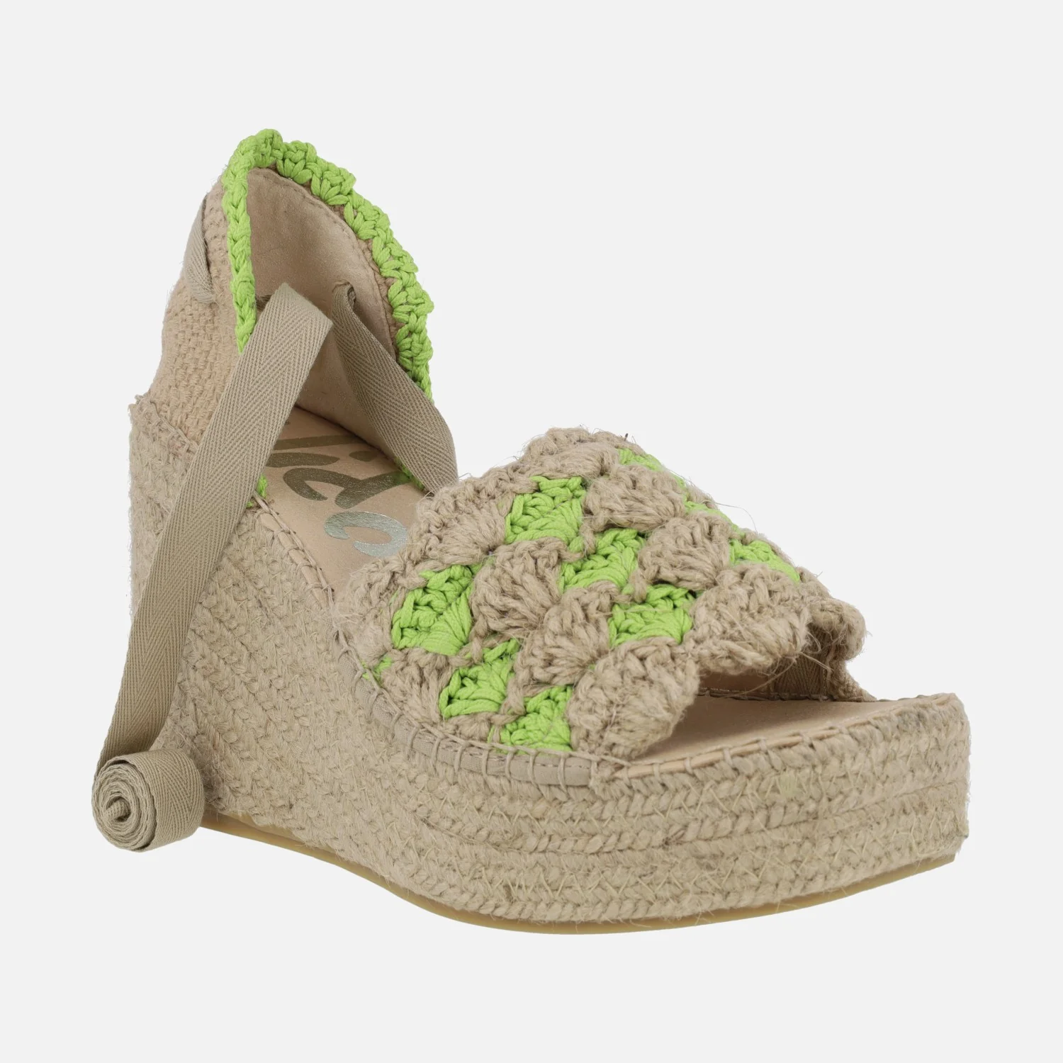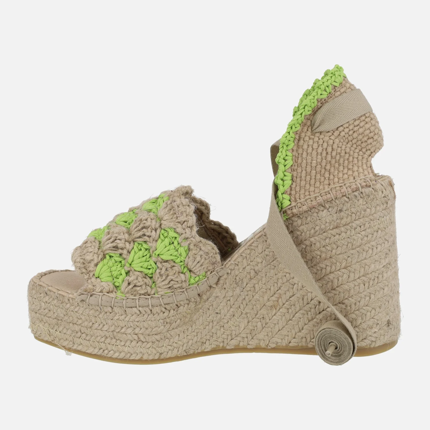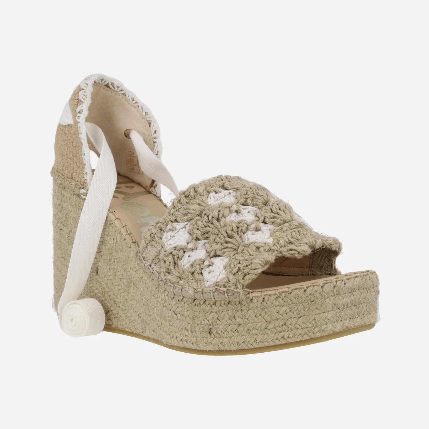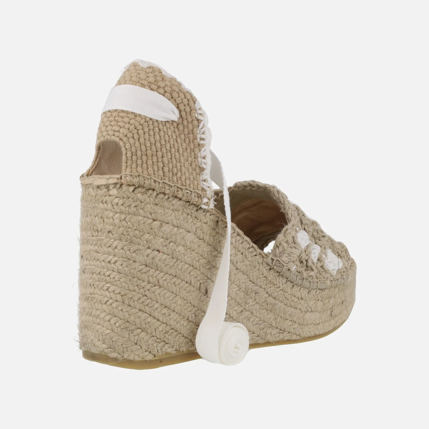 Zapatillas de esparto con cuña alta y plataforma de la marca Vidorreta modelo 79400GFMO4 en ganchillo fluor blanco. Zapatillas abiertas de puntera, con la pieza delantera en tejido ganchillado beige y blanco. Pieza textil en el talón de donde parten unas cintas blancas para atar a la pierna o tobillo. Interior textil. Cuñas altas de esparto, de 10 cms de altura (4 cms plataforma delantera). Made in Spain.