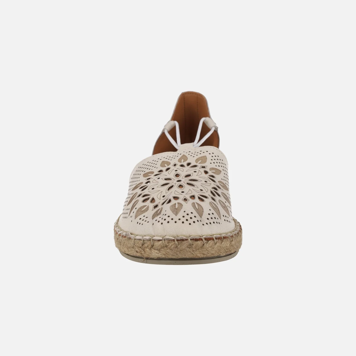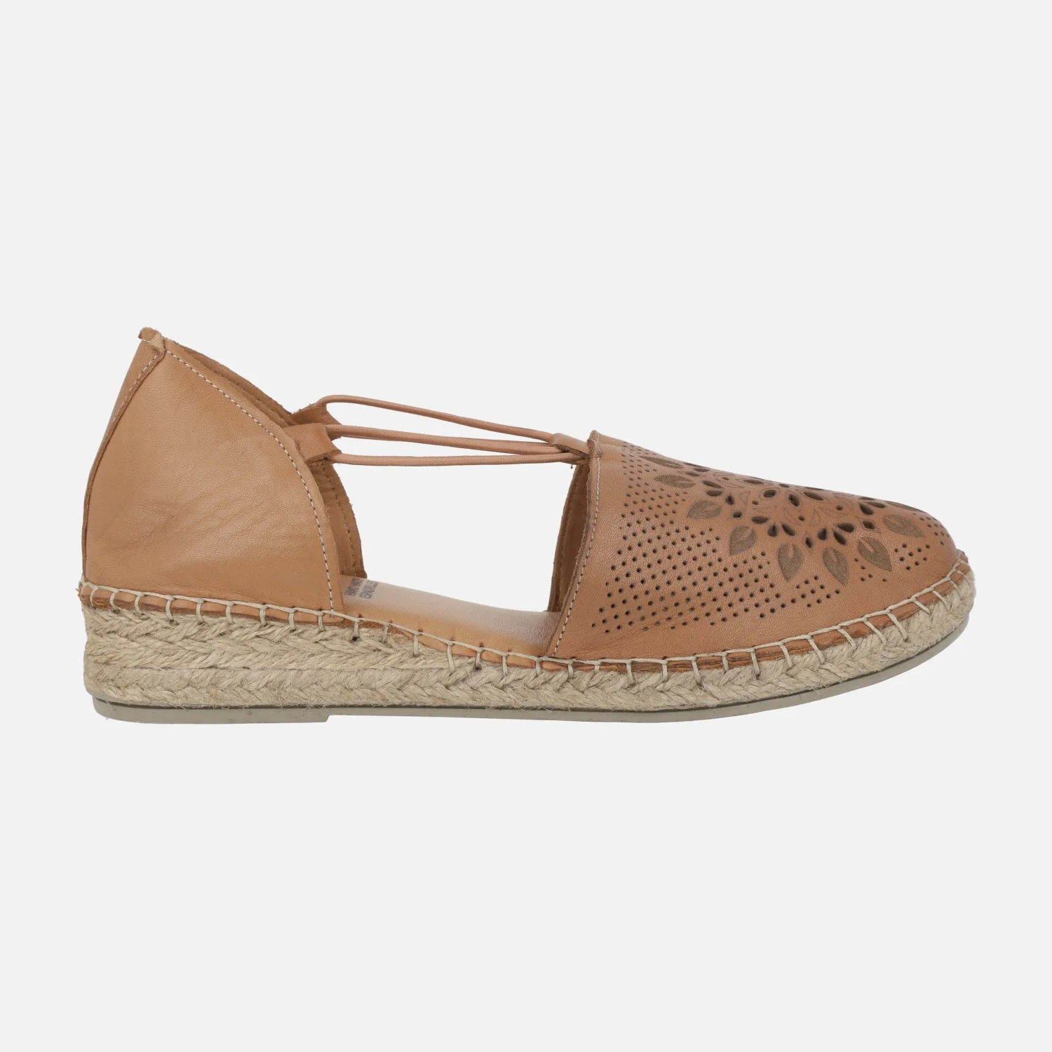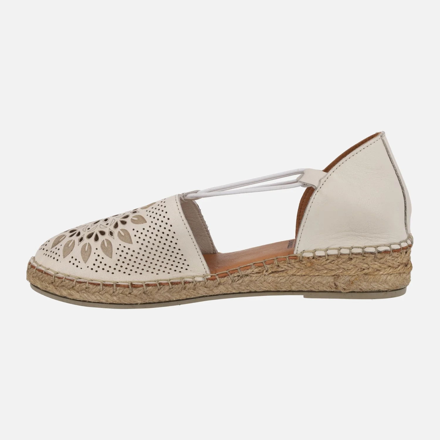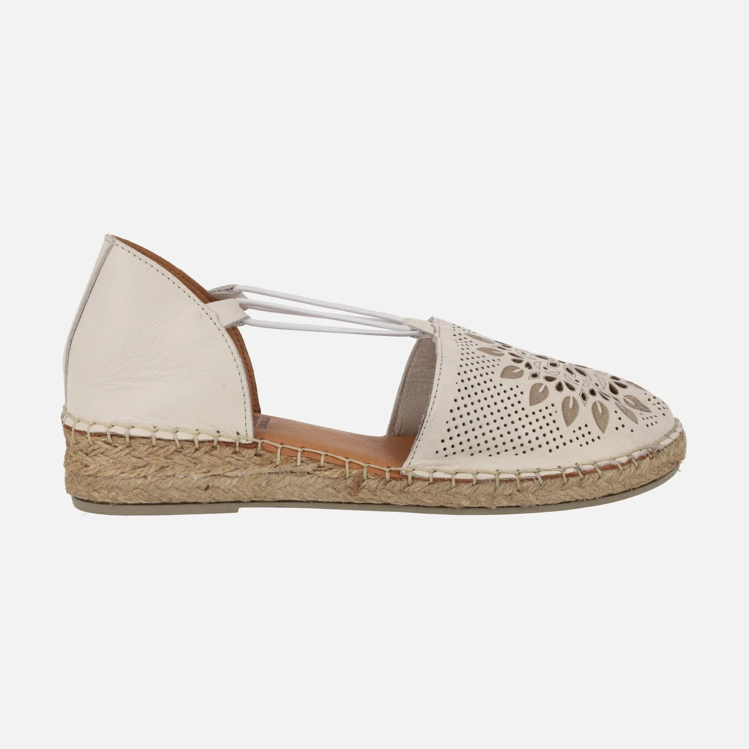 Zapatillas de esparto de la marca Top3 modelo SR25498, disponibles en piel hielo (blanco roto) o cuero. Zapatillas de piel, con la parte delantera haciendo dibujos troquelados. Elásticos laterales para mejor sujeción. Interiores en piel. Piso de goma y esparto, con una altura trasera de 3,5 cms y delantera de 2 cms.