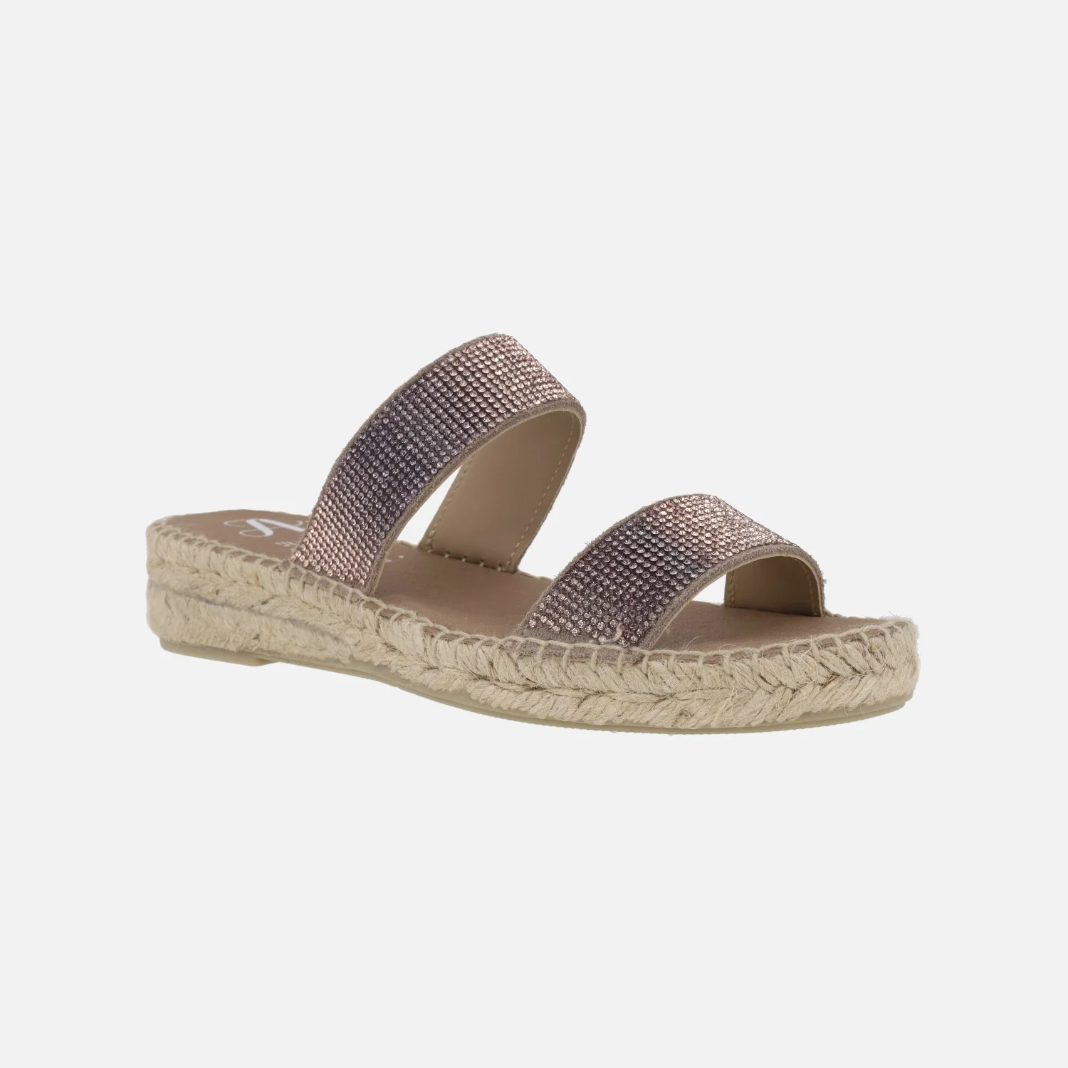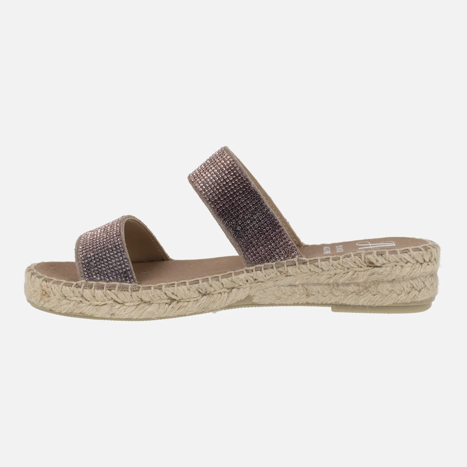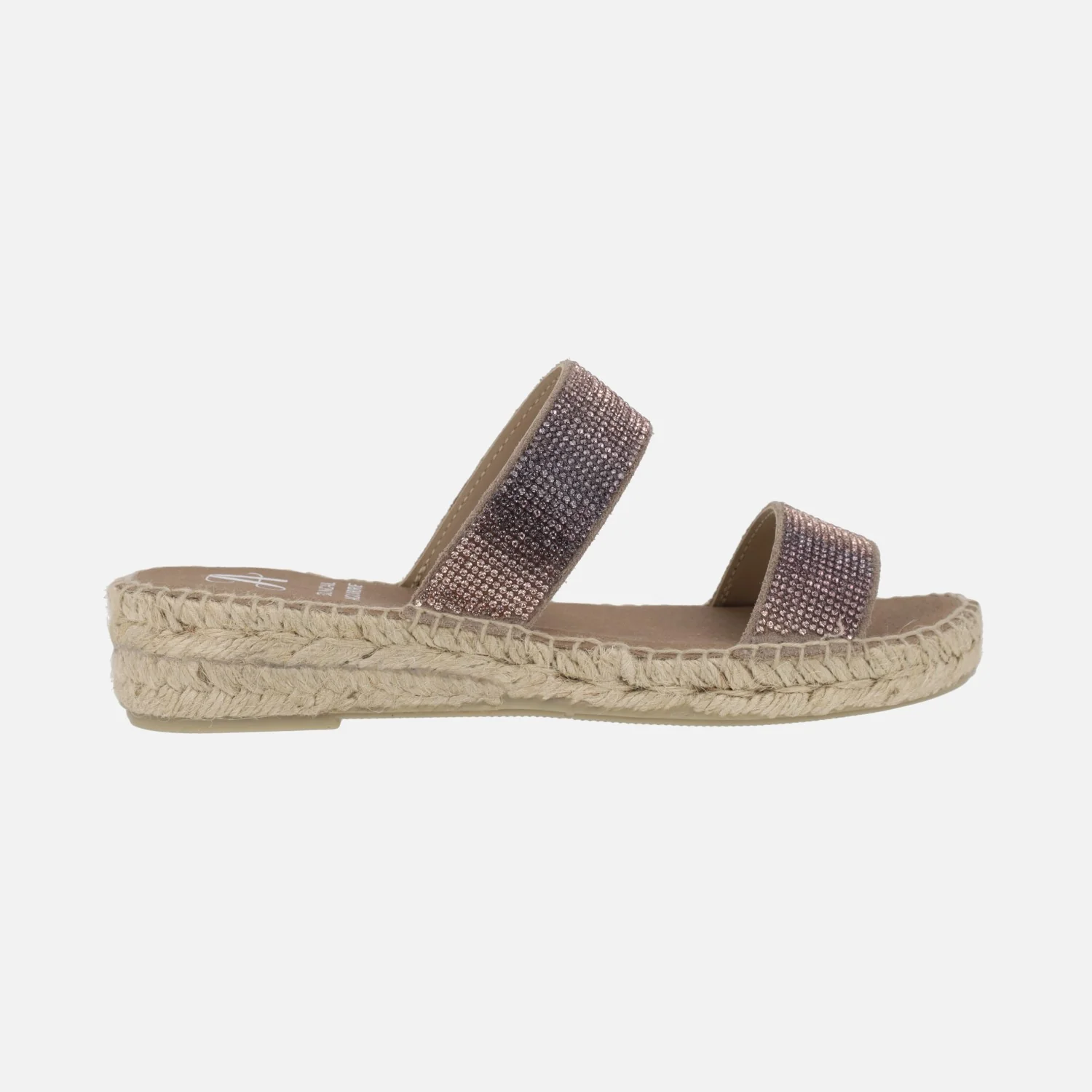 Alpargatas Juncal Aguirre modelo 2736 Humo. Zapatillas de esparto formadas por dos tiras en tejido y otros materiales, en fantasía tornasolada rosa, haciendo brillos. Interior mixto de piel y tejido. Piso de esparto, suela de goma. Altura trasera 4 cms (2 cms parte delantera). Made in Spain.
