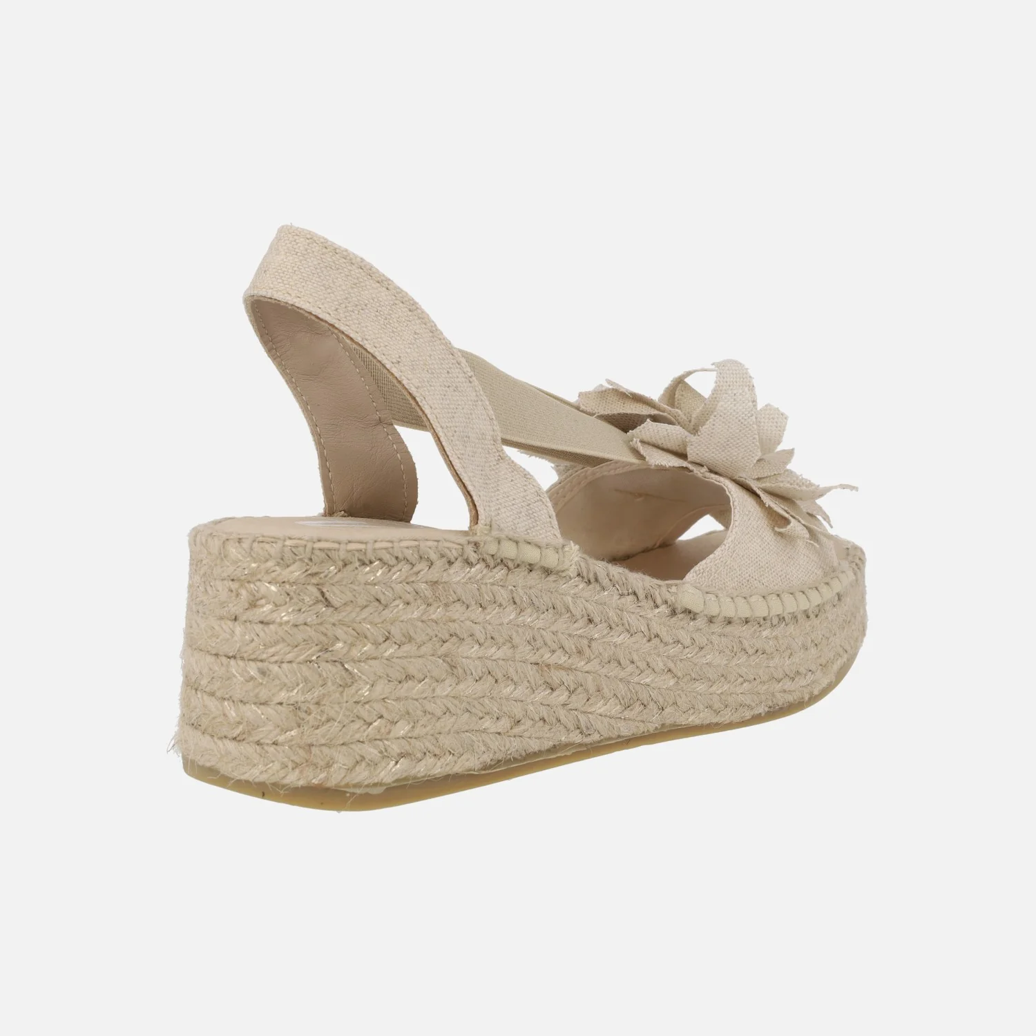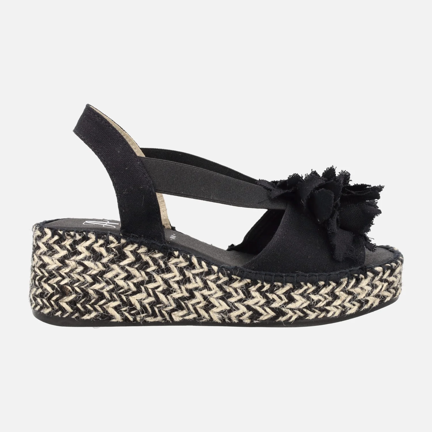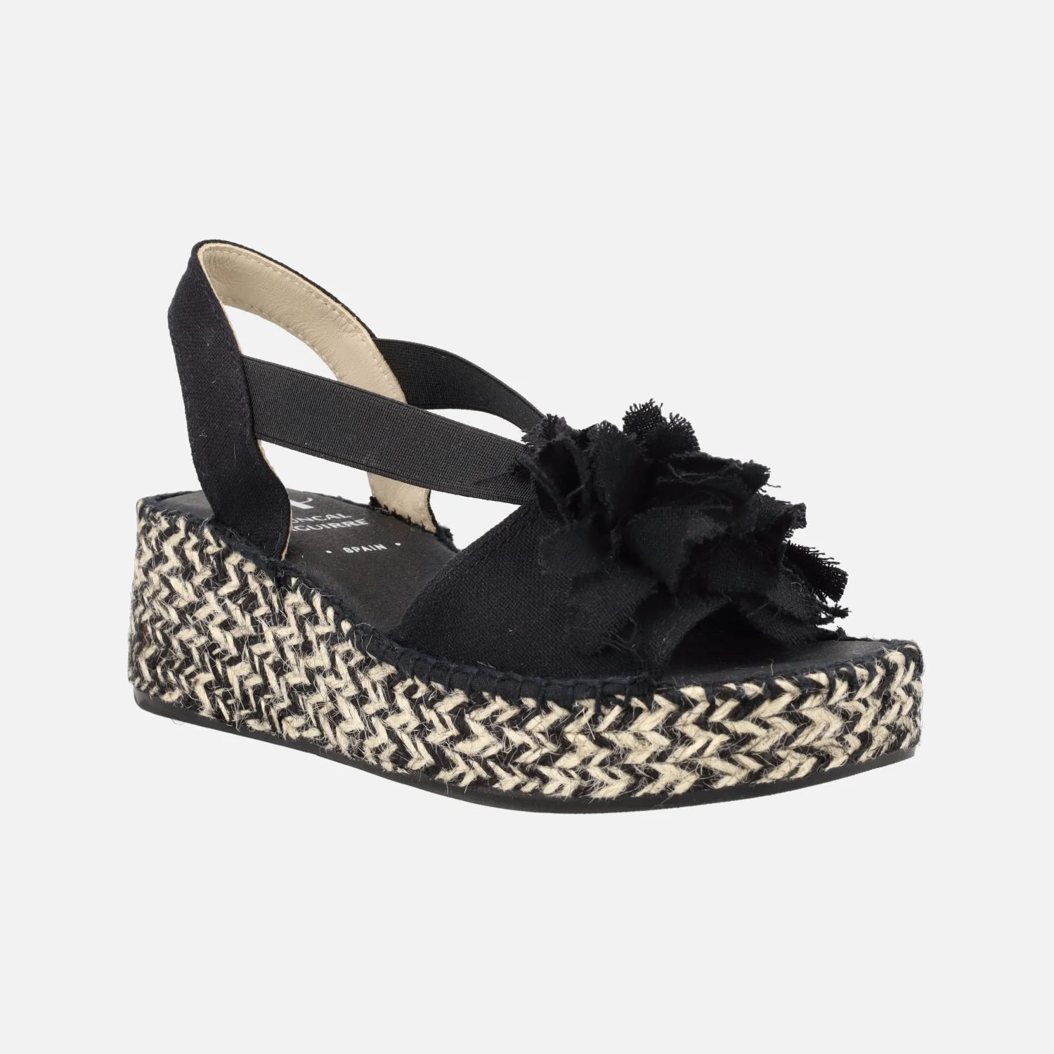 Zapatillas de esparto Juncal Aguirre modelo 2710, disponibles en beige y negro. Alpargatas elaboradas en tejido, con elásticos cruzando el empeine y adorno de flor en la parte delantera. Disponibles en platino (beige con destellos oro) y en negro. Interior mixto en piel y tejido. Plataforma de esparto natural, de 6 cms de altura trasera (3 cms en la parte delantera). Suela de goma. made in Spain.