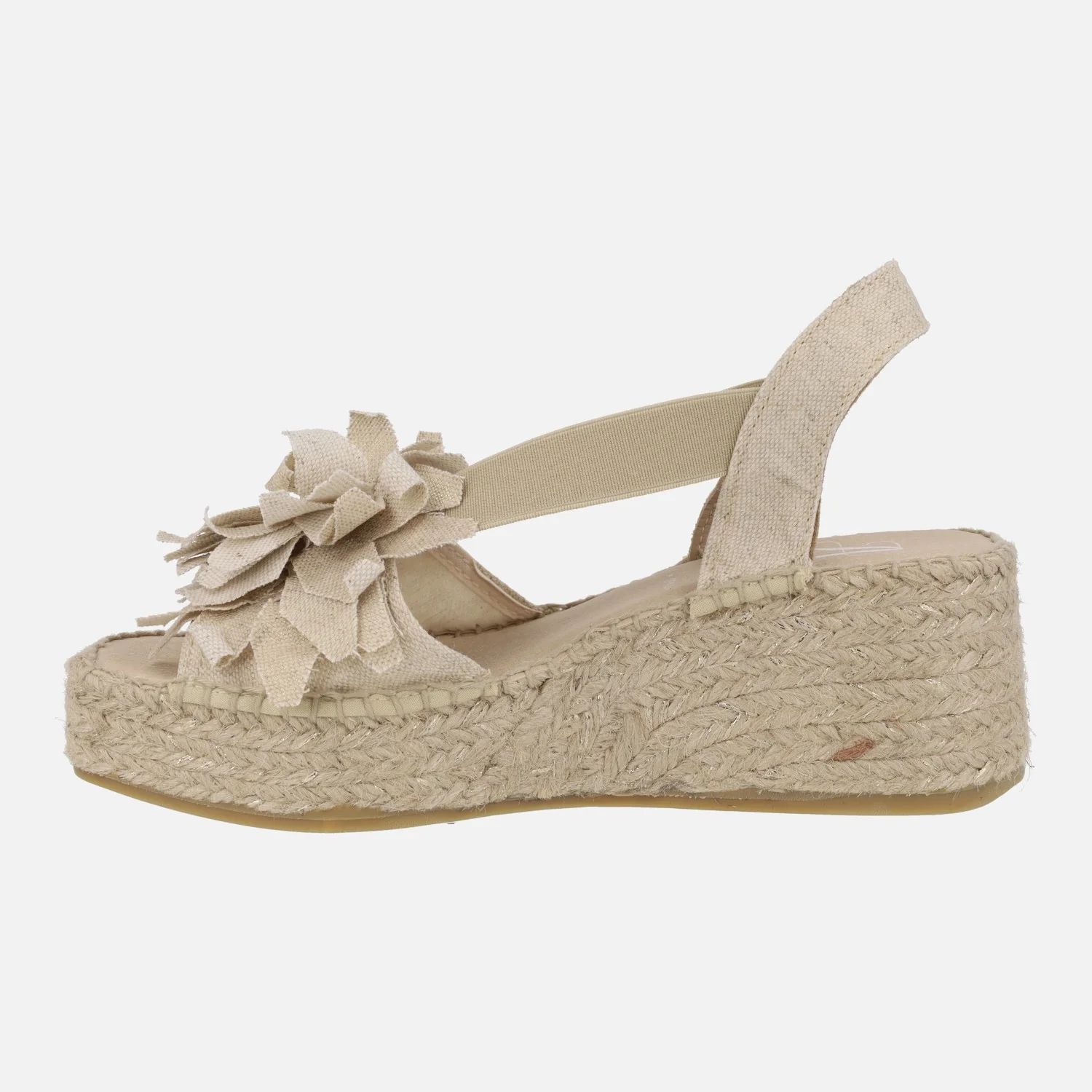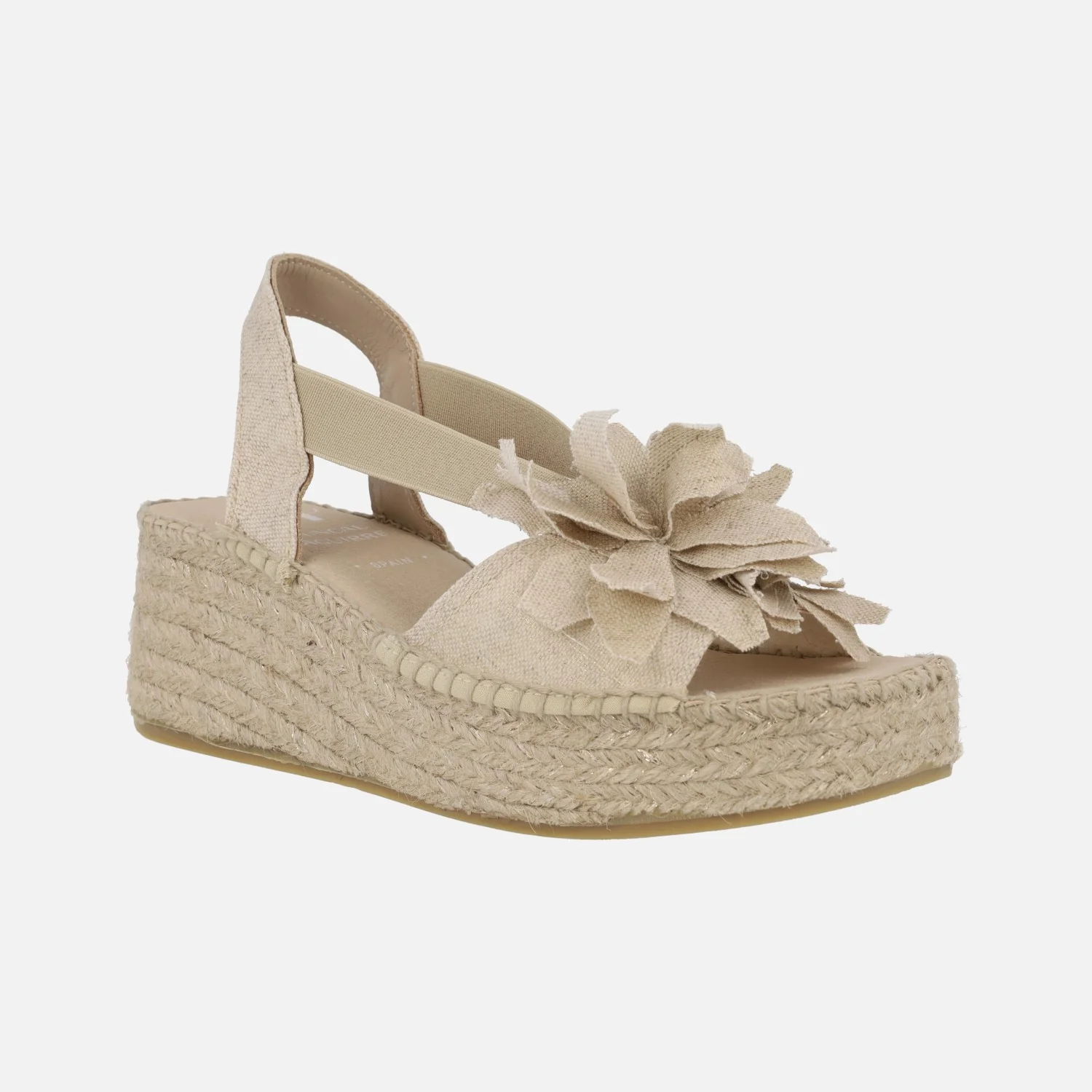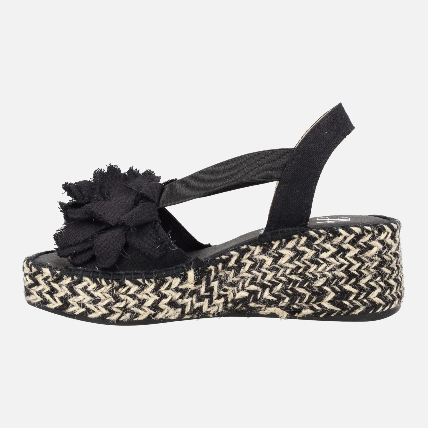 Zapatillas de esparto Juncal Aguirre modelo 2710, disponibles en beige y negro. Alpargatas elaboradas en tejido, con elásticos cruzando el empeine y adorno de flor en la parte delantera. Disponibles en platino (beige con destellos oro) y en negro. Interior mixto en piel y tejido. Plataforma de esparto natural, de 6 cms de altura trasera (3 cms en la parte delantera). Suela de goma. made in Spain.