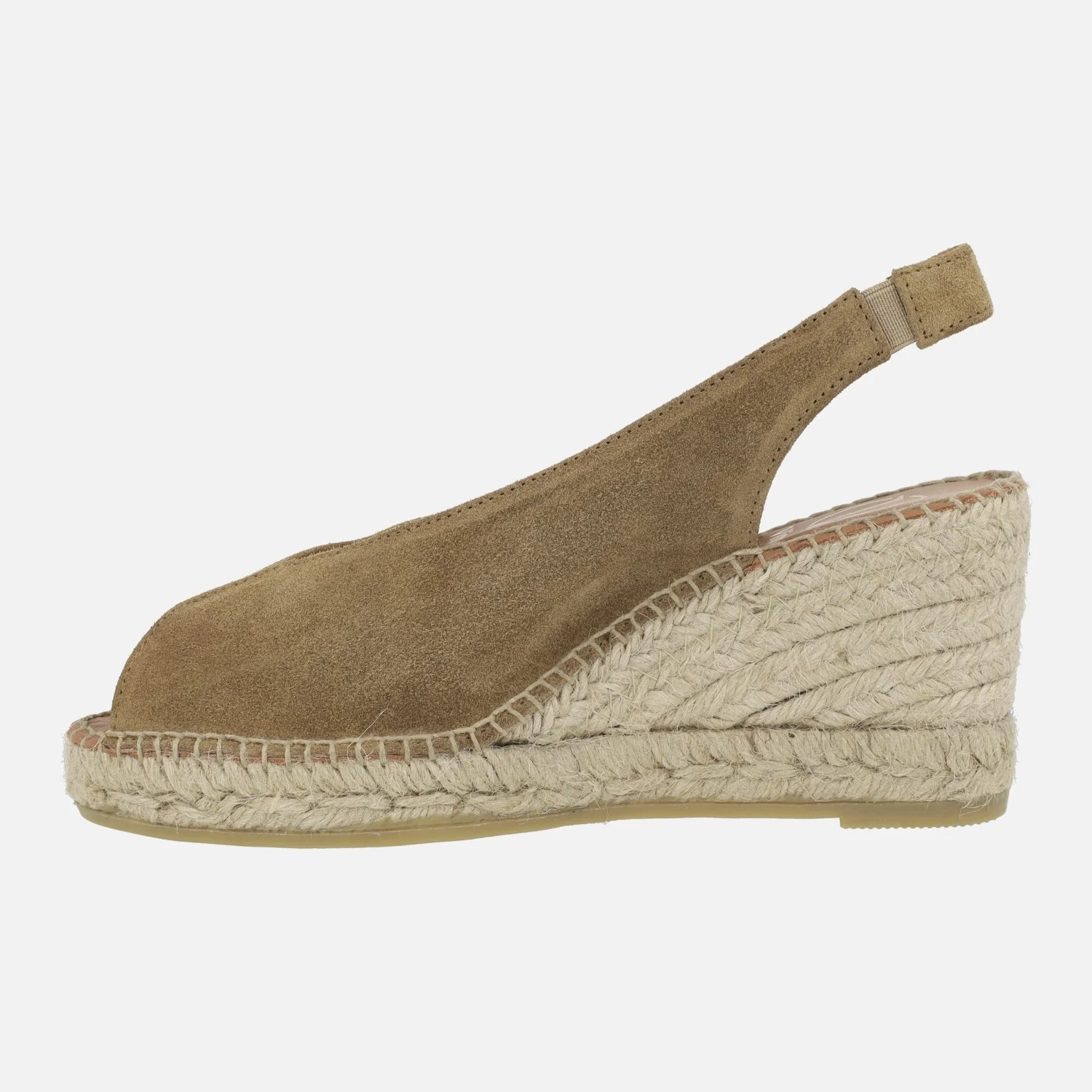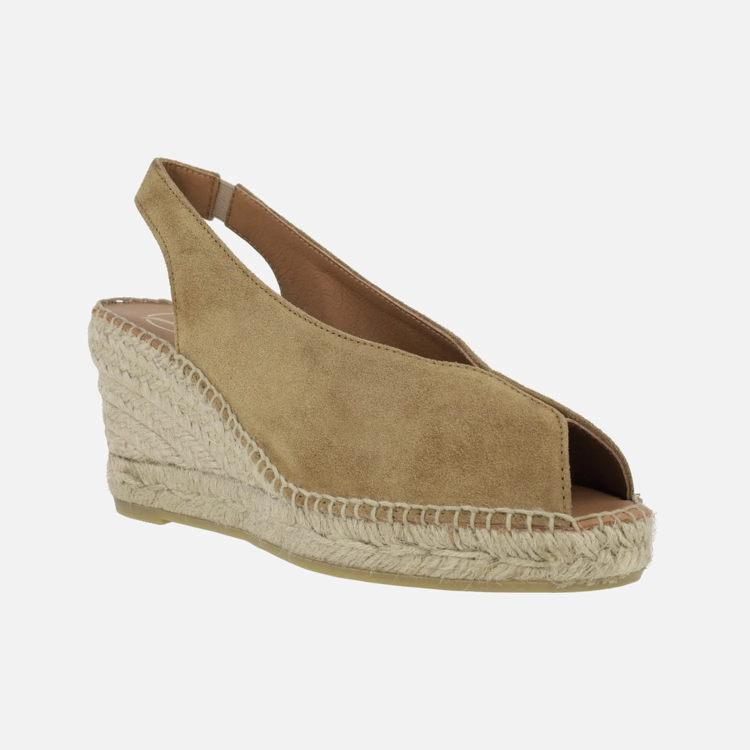 Zapatillas de esparto para mujer de la marca española Viguera modelo 2127 disponible en serraje camel (vitelo whisky). Zapatillas de piel destalonadas, con una tira al talón que lleva una pieza elástica para mayor sujeción. Abiertas de puntera. Interior mixto de piel y tejido. Cuñas de esparto, de 7 cms de altura trasera (2 cms en la parte delantera). Made in Spain.